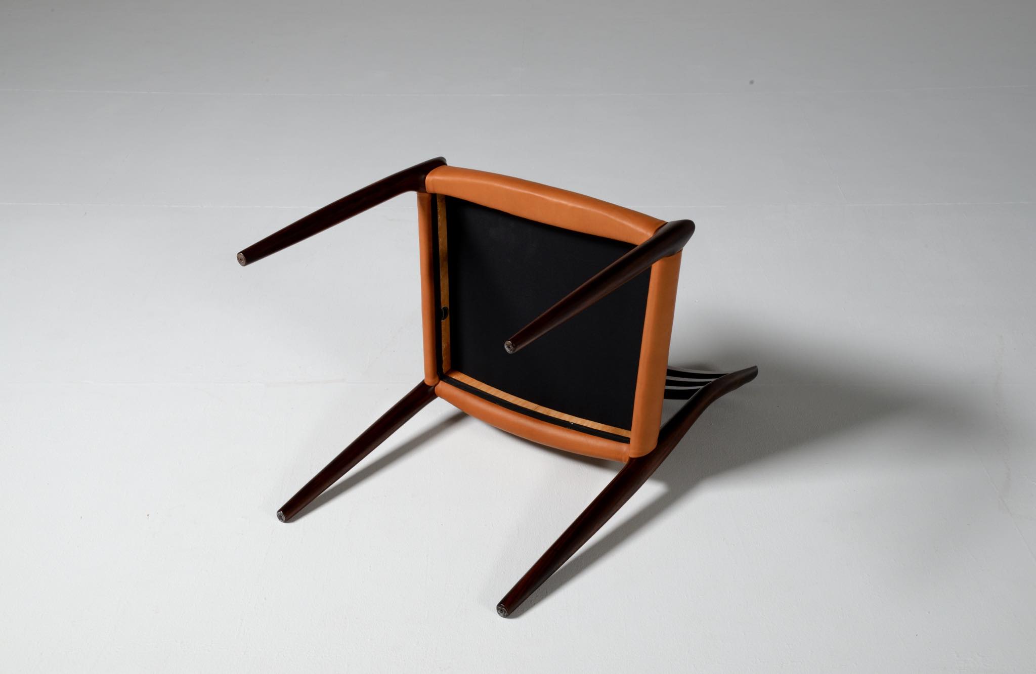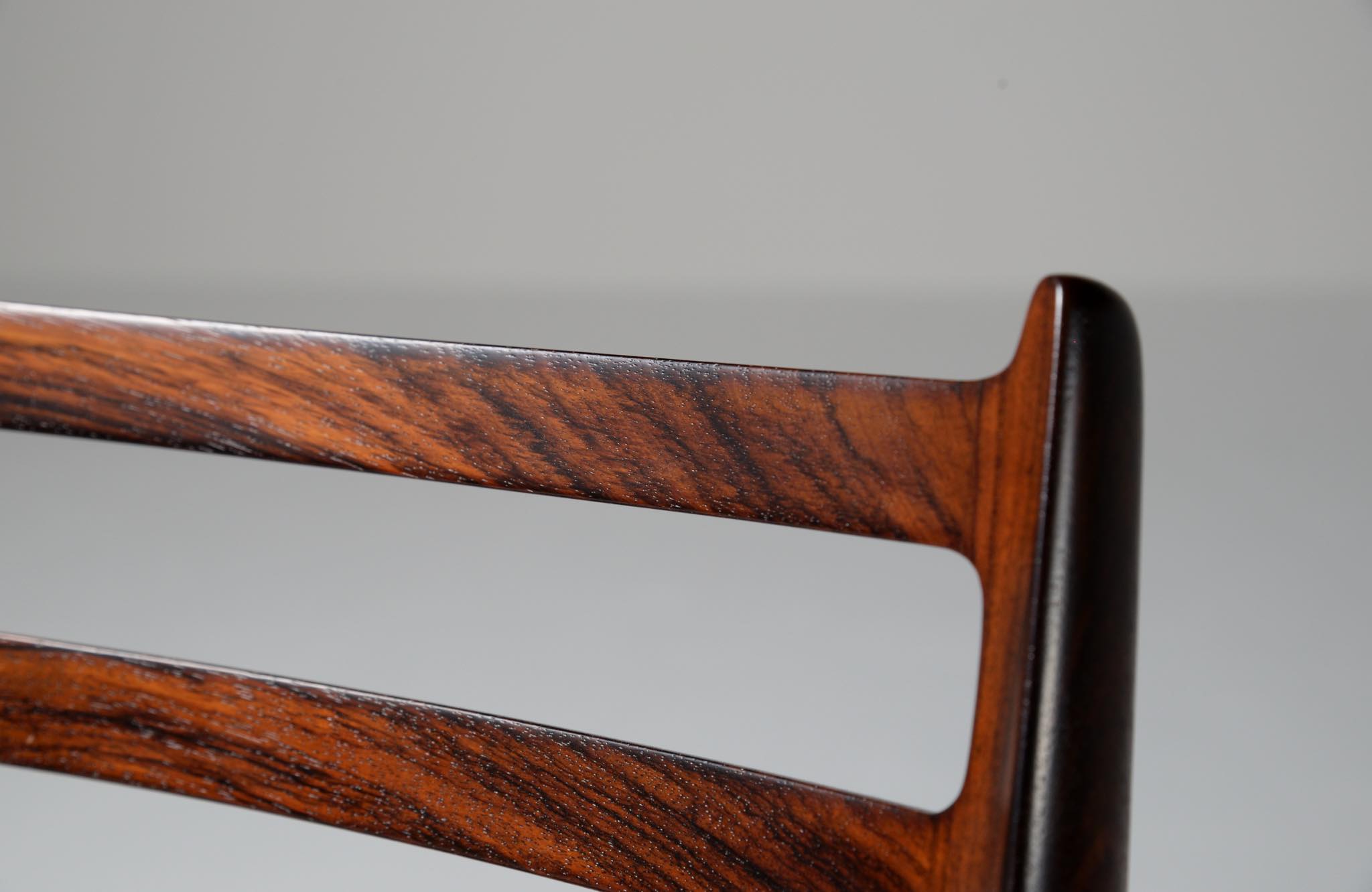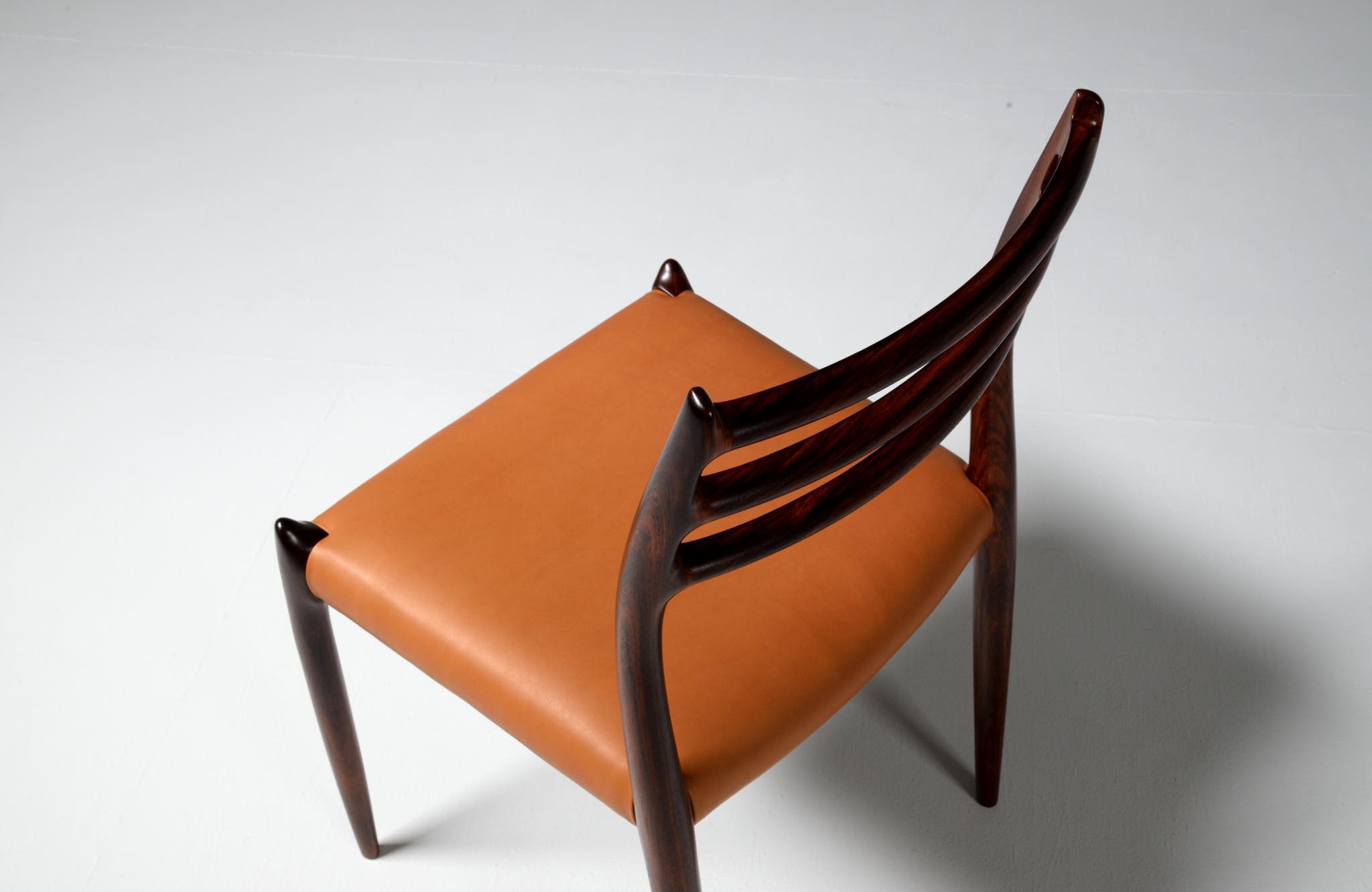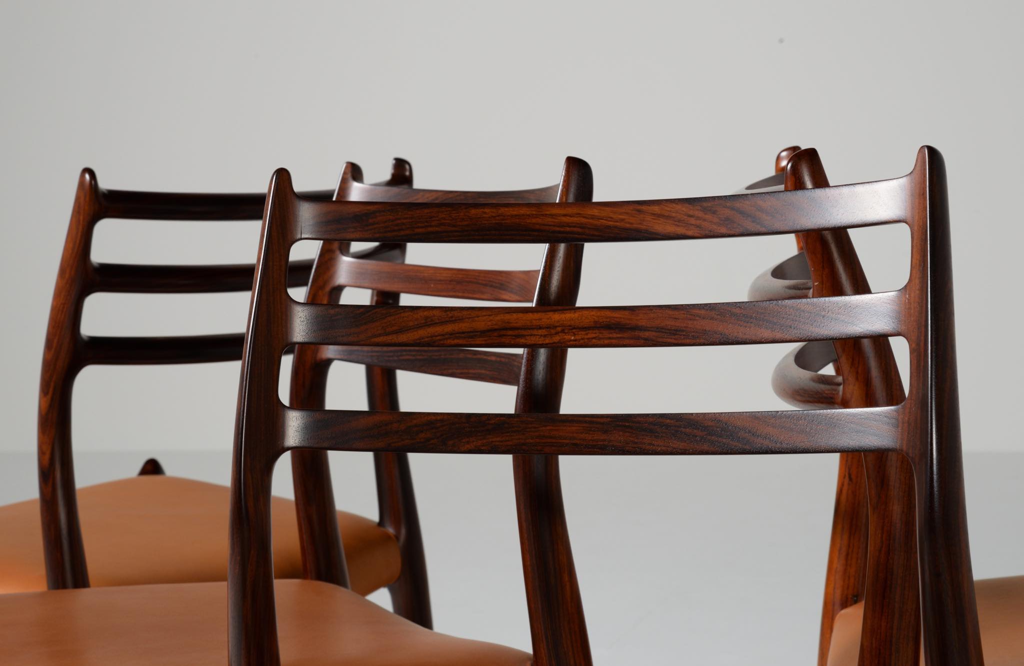 デンマークの家具工房、J.L.Møller/J.L.モラーによるダイニングチェア "model 78" です。創業者のN.O. Moller/ニルス・オット・モラーによってデザインされたモデルで、こちらは1960年代頃に作られたヴィンテージ品です。良質なローズウッドが用いられており、綺麗な木目文様が現れています。少なくてもこの4脚セットとして同じロットで作られたもので、それぞれが同一の材から木取りされています。座面はデンマークのCAMO leather社による良質な茶色皮革にて張り替えを行いました。フレームの塗膜に劣化が見られたため再塗装しており、コンディションは良好です。こちらは4脚セットでの販売となります。