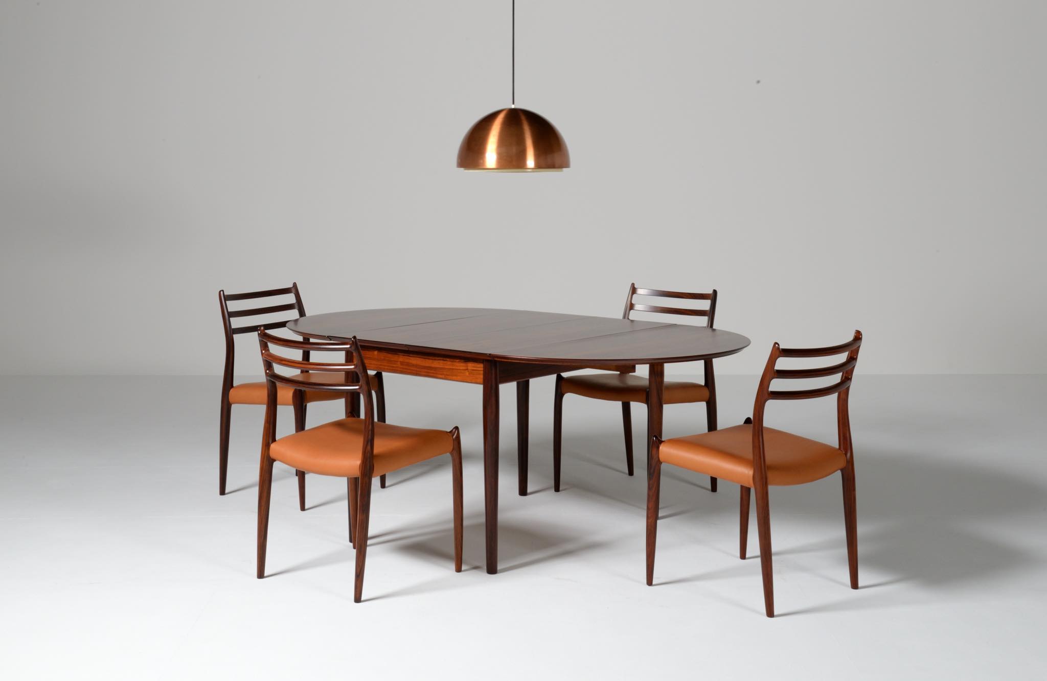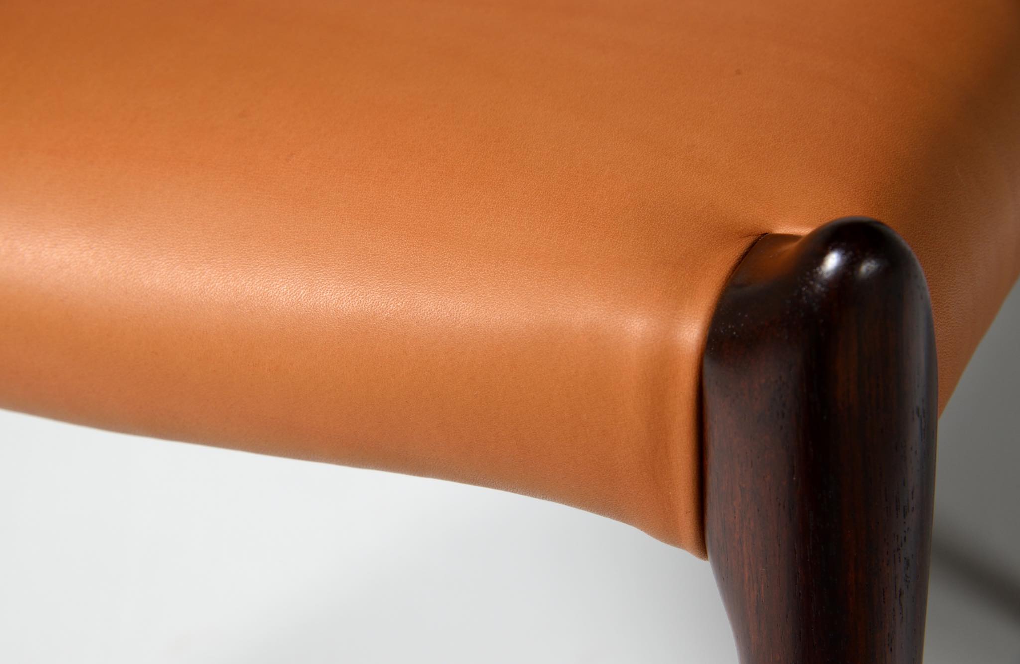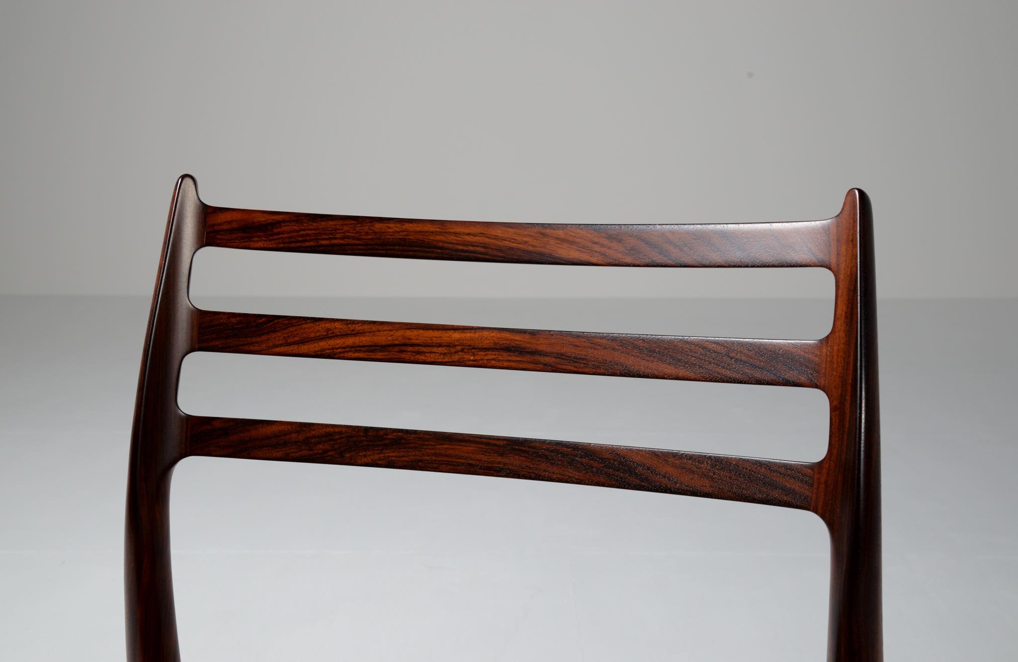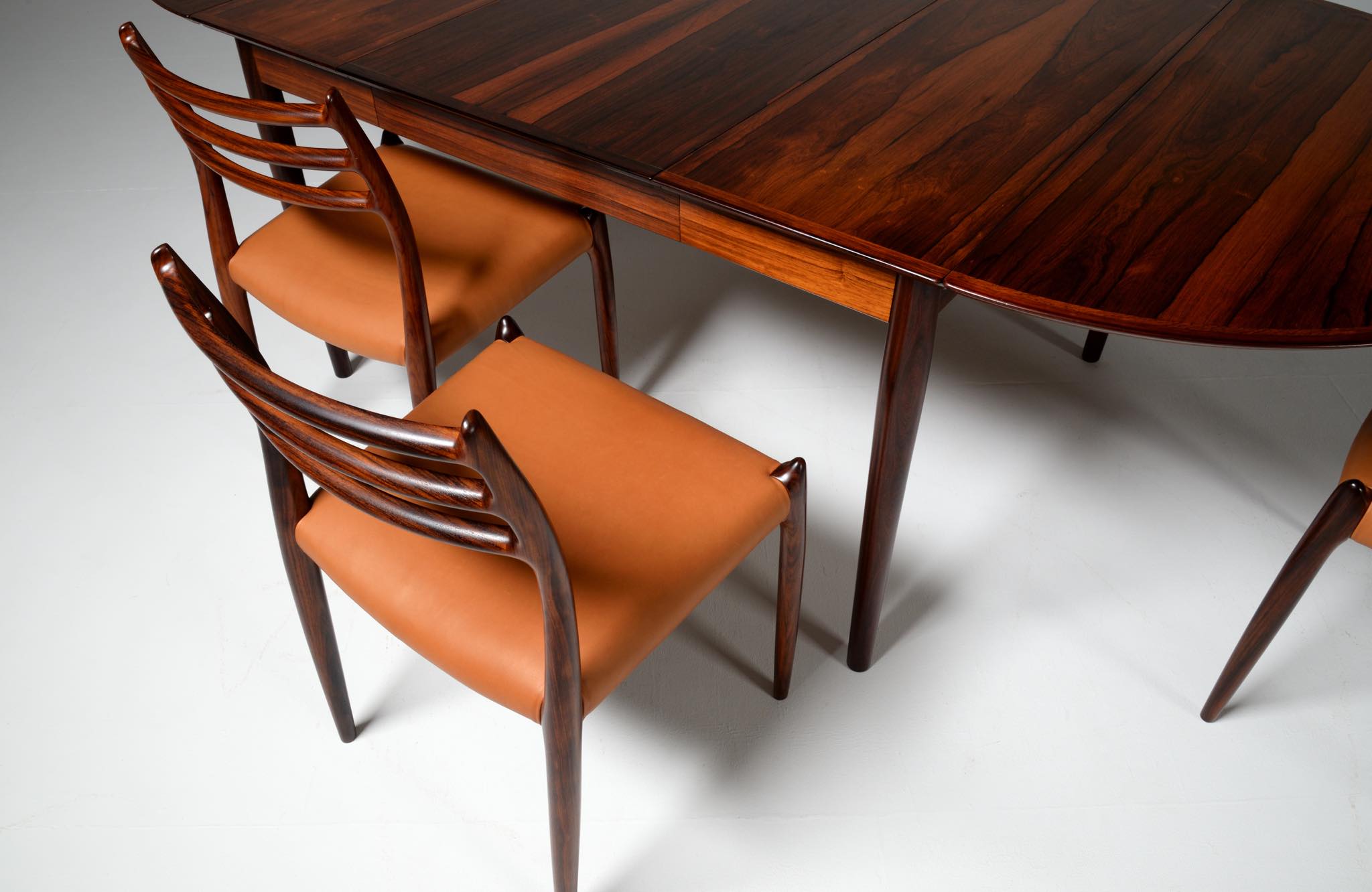 デンマークの家具工房、J.L.Møller/J.L.モラーによるダイニングチェア "model 78" です。創業者のN.O. Moller/ニルス・オット・モラーによってデザインされたモデルで、こちらは1960年代頃に作られたヴィンテージ品です。良質なローズウッドが用いられており、綺麗な木目文様が現れています。少なくてもこの4脚セットとして同じロットで作られたもので、それぞれが同一の材から木取りされています。座面はデンマークのCAMO leather社による良質な茶色皮革にて張り替えを行いました。フレームの塗膜に劣化が見られたため再塗装しており、コンディションは良好です。こちらは4脚セットでの販売となります。