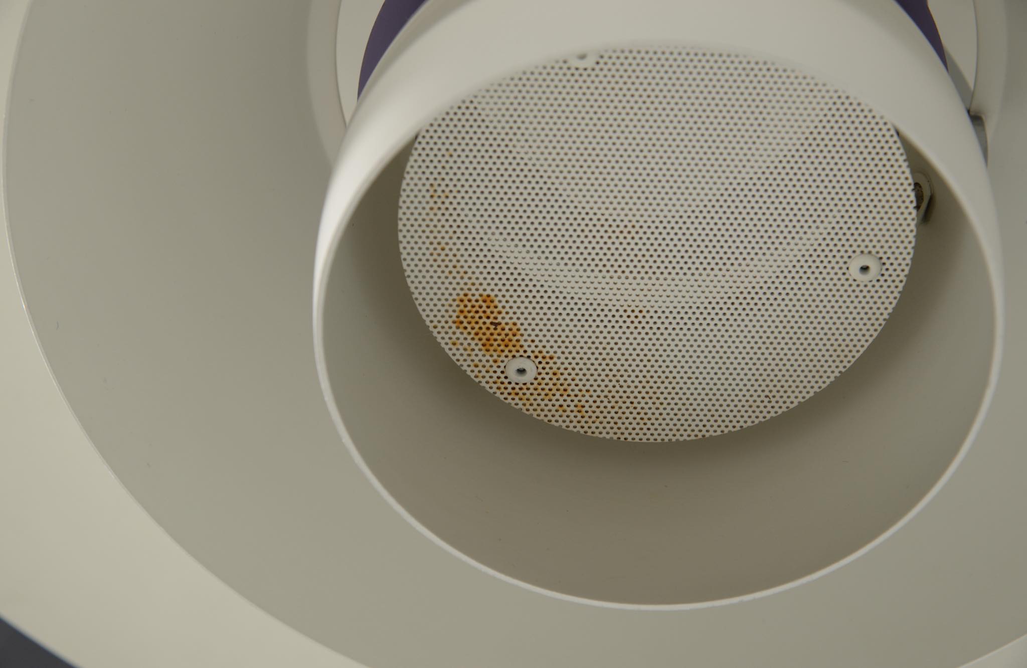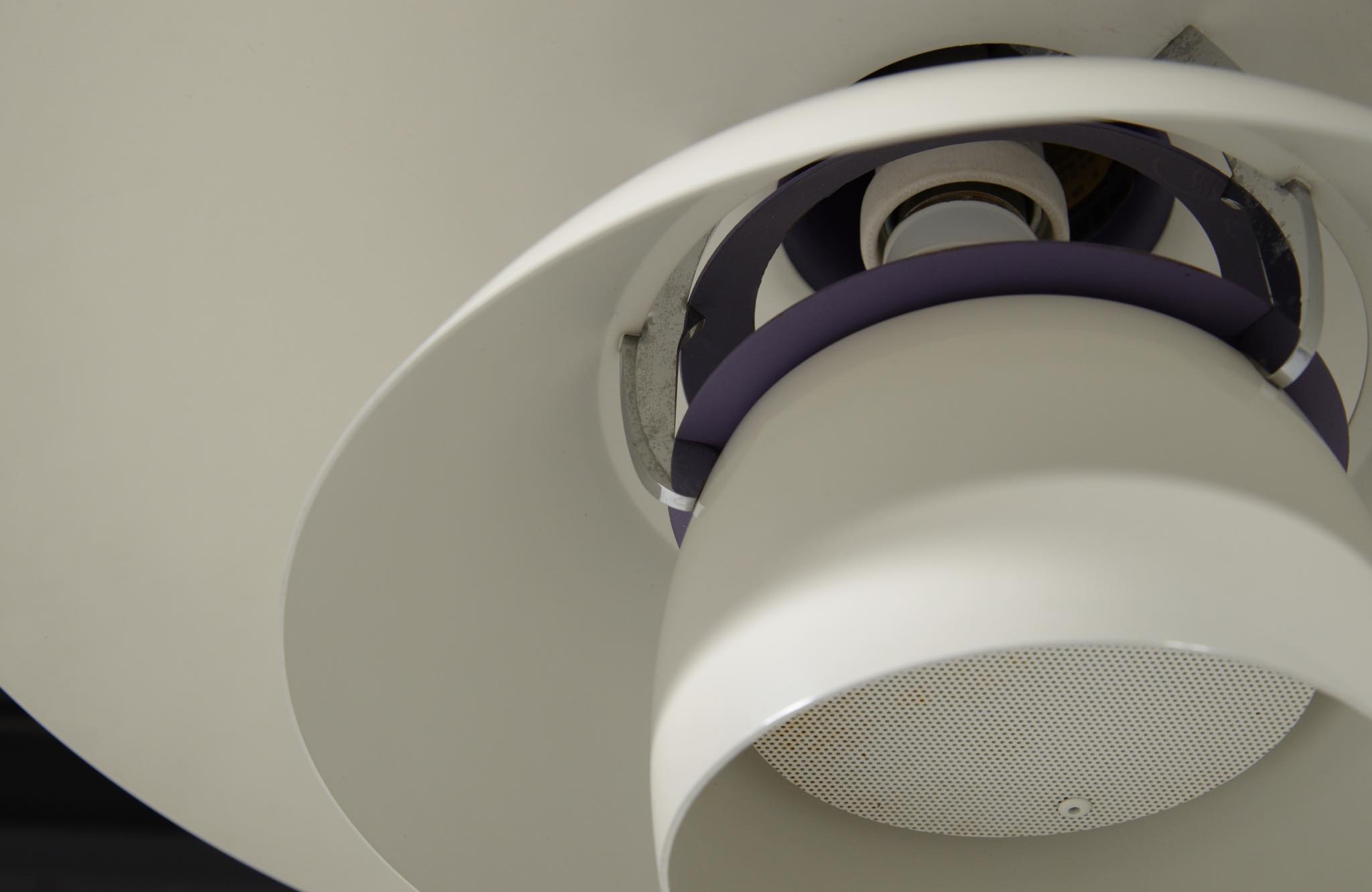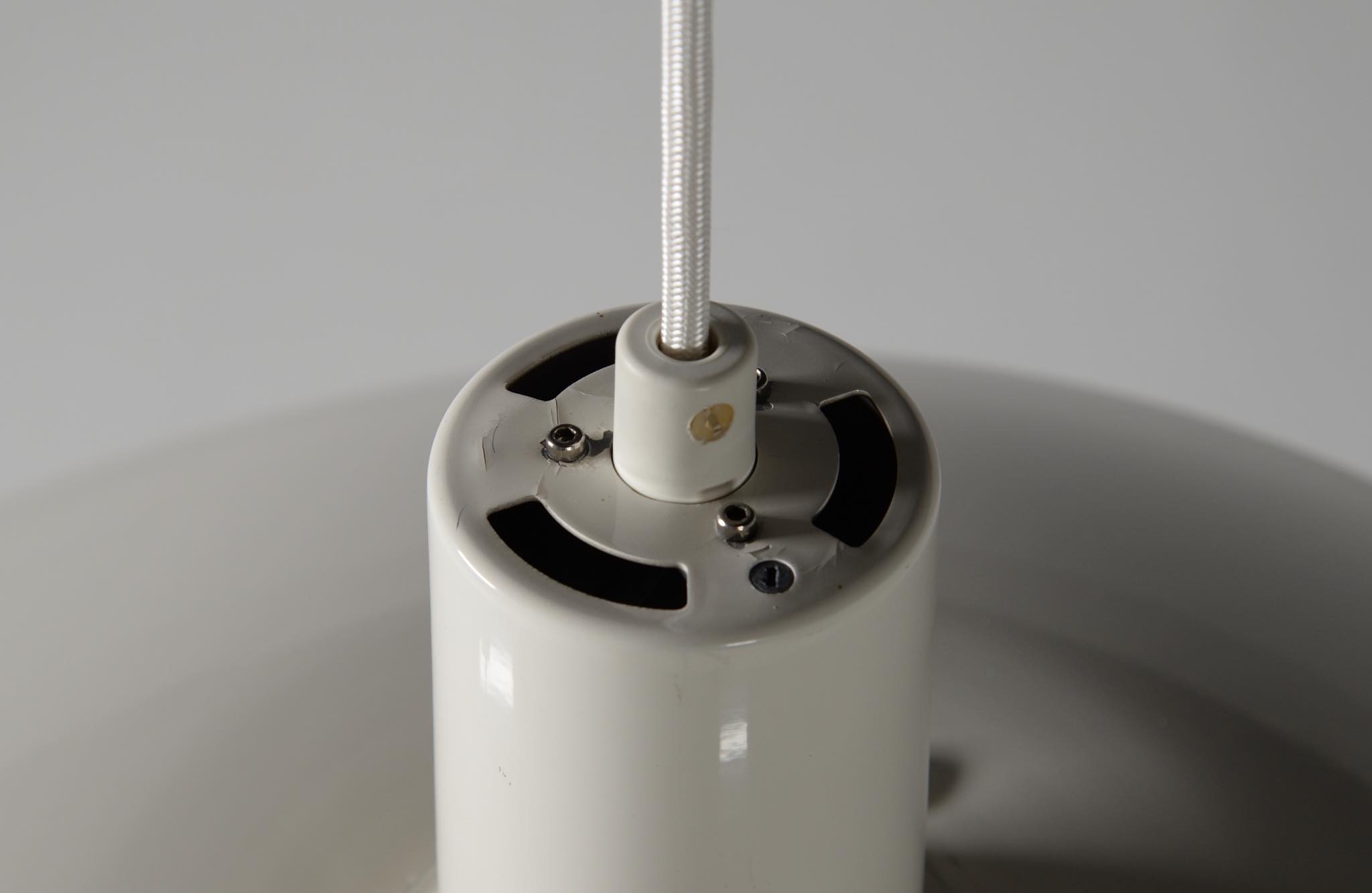 ルイス・ポールセン社によって1984年に発表されたアルミ製のペンダントランプ、1987年の製作品です。当時の販売台数が少なかったのか希少なモデルで、4.5のトップシェードに、4のボトムを組み合わせた比較的大振りなサイズ感です。こちらは白色アルミのタイプですが、その他にヘアラインアルミ、コーティングコッパー、ロウコッパーの4種類で展開されたようです。ソケット部トップのマイネスネジを回すことにより光源の高さ調整が可能です。トップシェードに若干の歪みがあり、光源を隠すボトムのメッシュプレートに錆が見られます。詳しくはお問い合わせください。