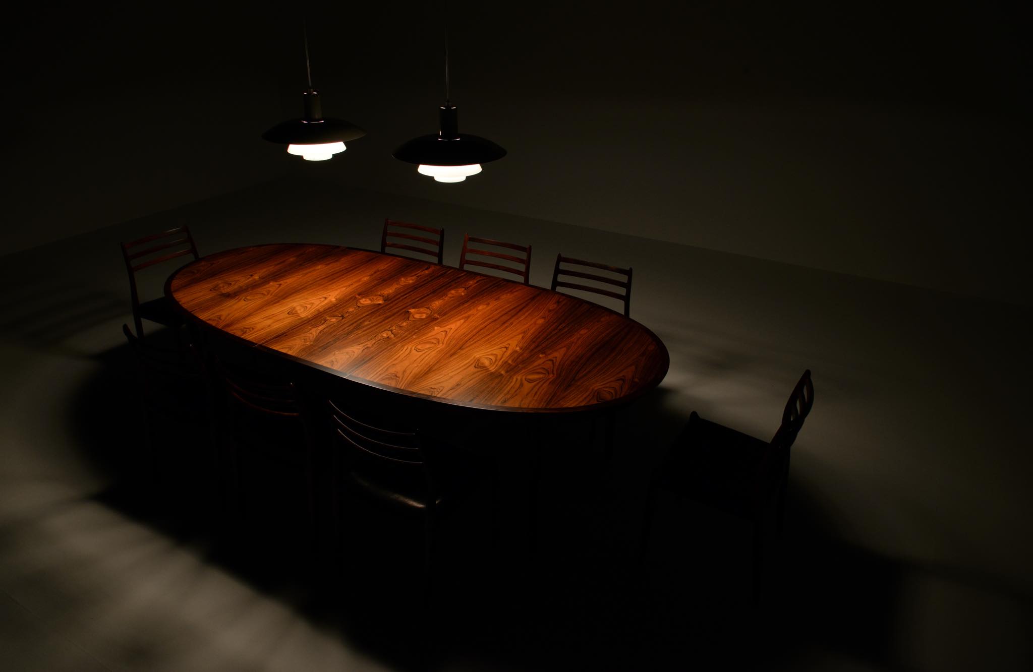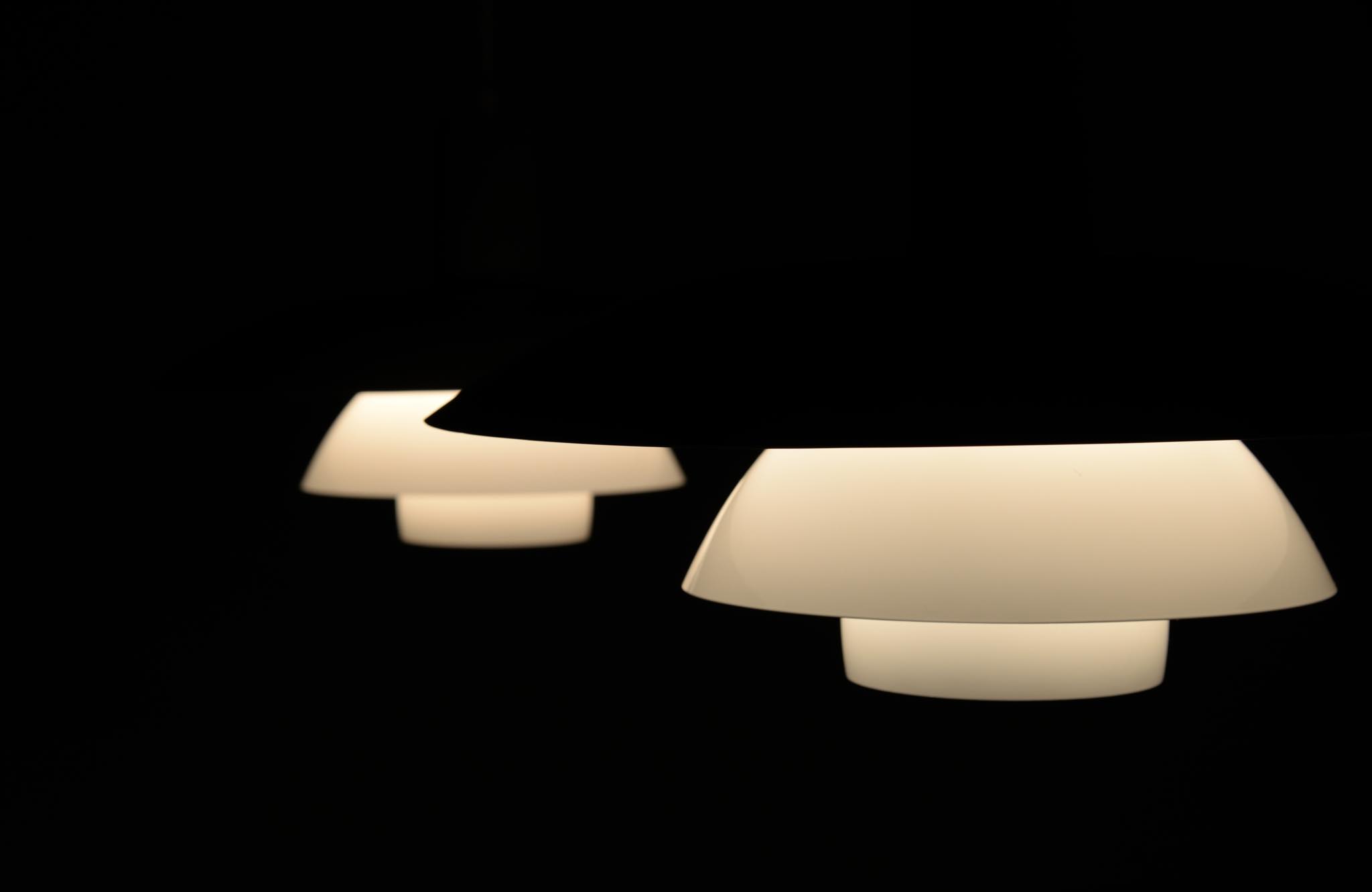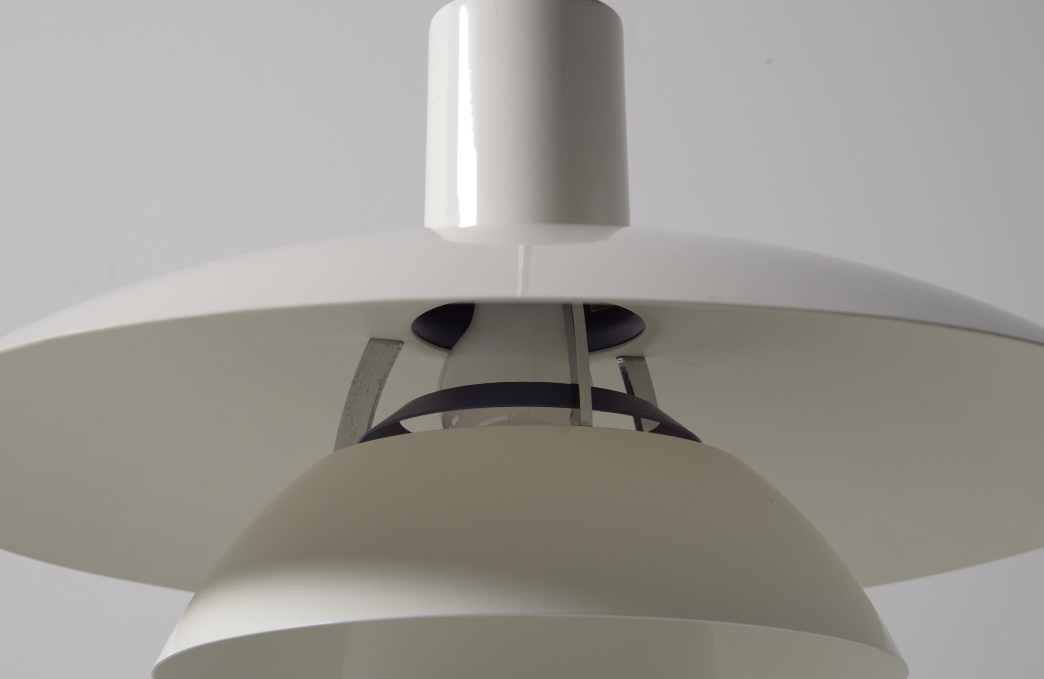 ルイス・ポールセン社によって1984年に発表されたアルミ製のペンダントランプ、1987年の製作品です。当時の販売台数が少なかったのか希少なモデルで、4.5のトップシェードに、4のボトムを組み合わせた比較的大振りなサイズ感です。こちらは白色アルミのタイプですが、その他にヘアラインアルミ、コーティングコッパー、ロウコッパーの4種類で展開されたようです。ソケット部トップのマイネスネジを回すことにより光源の高さ調整が可能です。トップシェードに若干の歪みがあり、光源を隠すボトムのメッシュプレートに錆が見られます。詳しくはお問い合わせください。