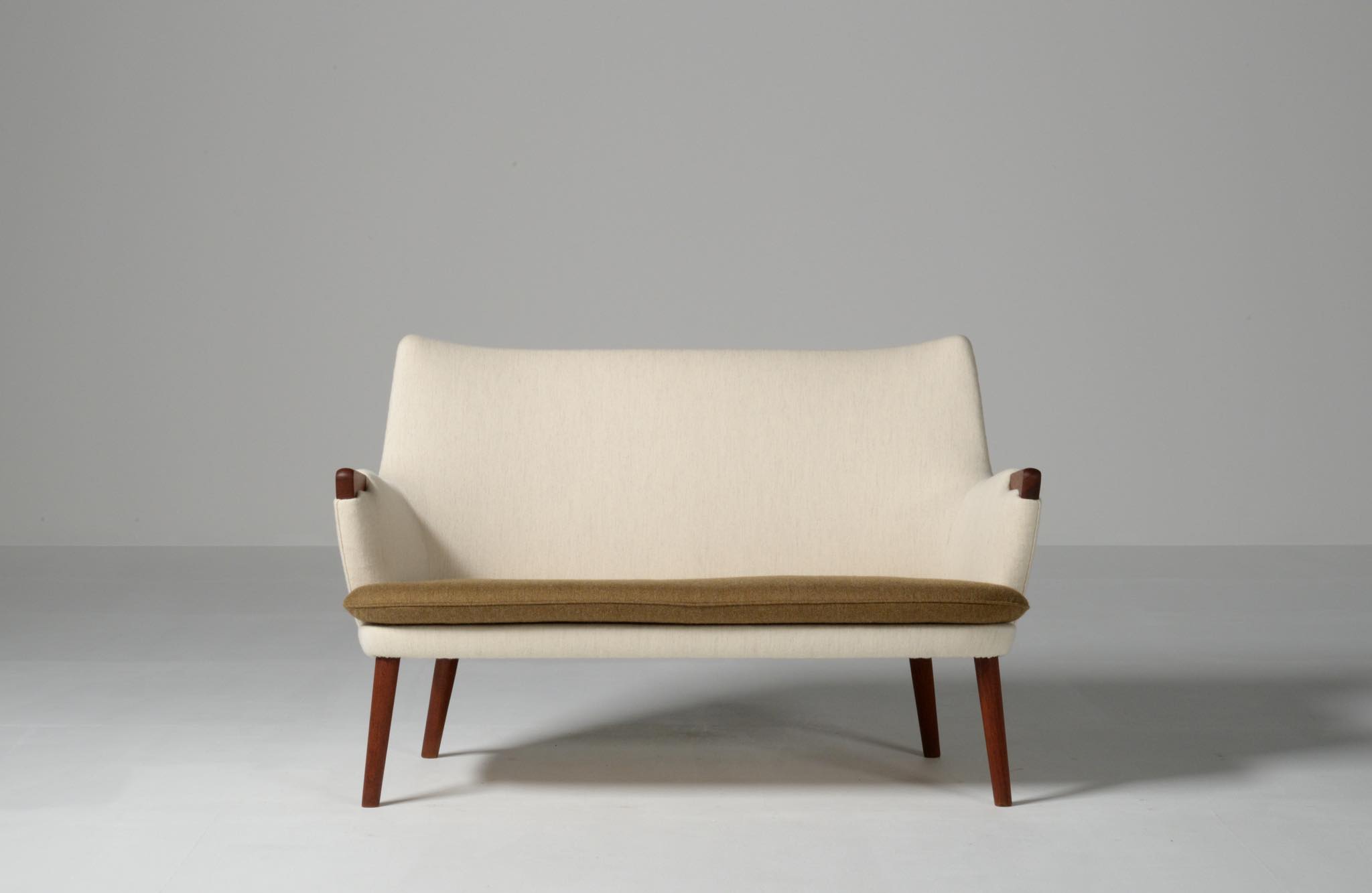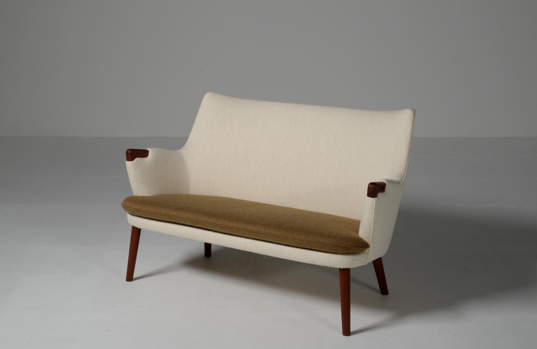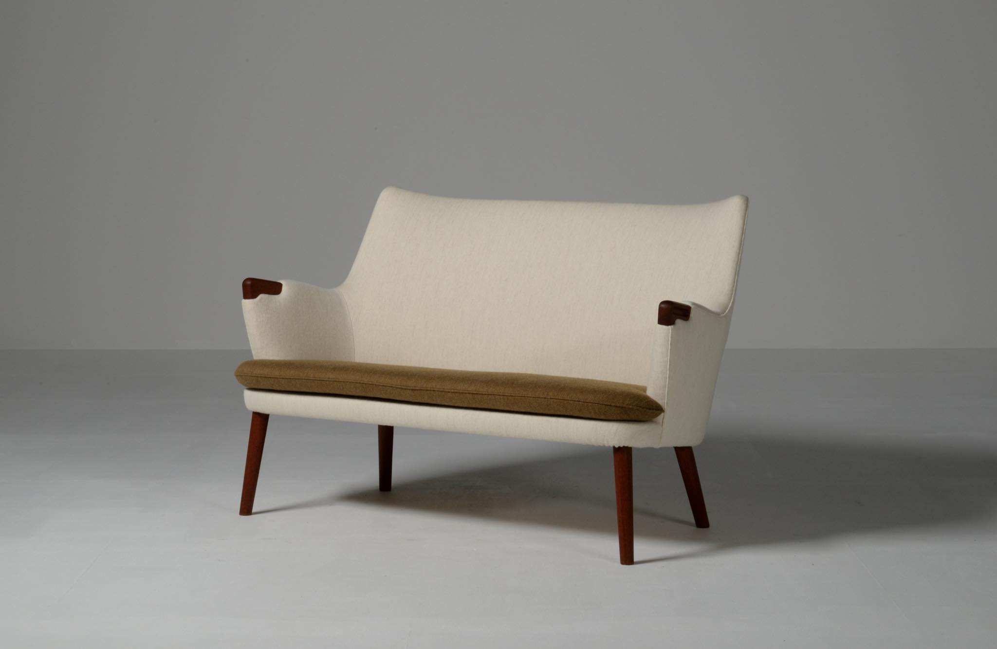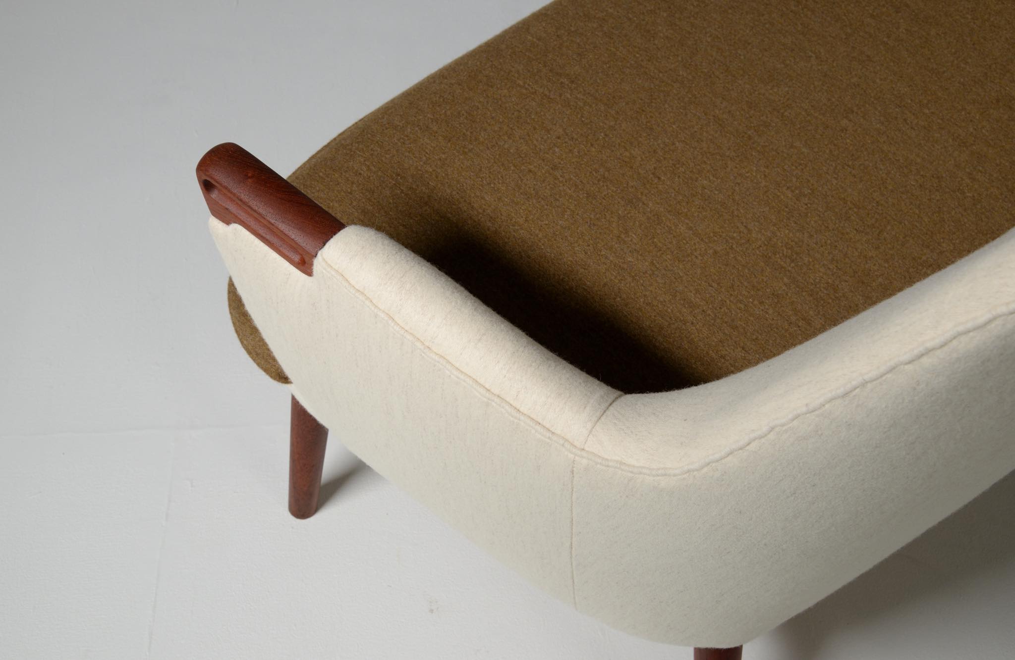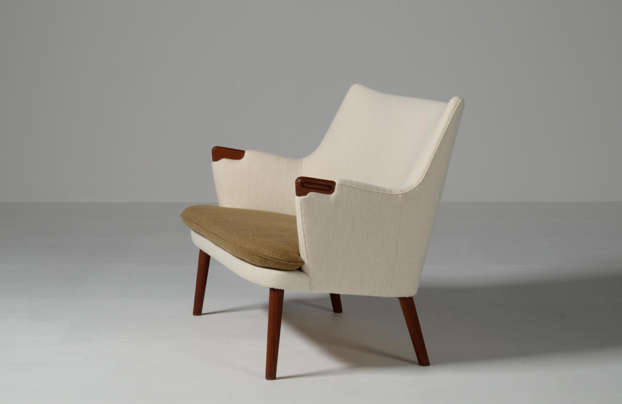 デンマークを代表する家具デザイナー、Hans J. Wegner/ハンス・ウェグナーによる”ミニベア”セッティです。こちらは1950~60年代頃に作られたものです。バランスのとれたフォルムと肘先の爪が特徴的なモデルで、ウェグナー の代表作のひとつとして知られています。爪と脚はチーク材で、タイ国原産と思しき綺麗な木目の現れた材が使われています。ファブリックはデンマークのテキスタイルブランド、Gabriel/ガブリエルの SAVAK/サヴァクにて張り替えました。SAVAKはデザイナーのTove Kindt-Larsen/トーべ・キンド・ラーセンによって1960年代初頭に生み出されたカブリエル社の名作ファブリックで、羊毛を絡めたようなきめ細やかな織りが特徴です。