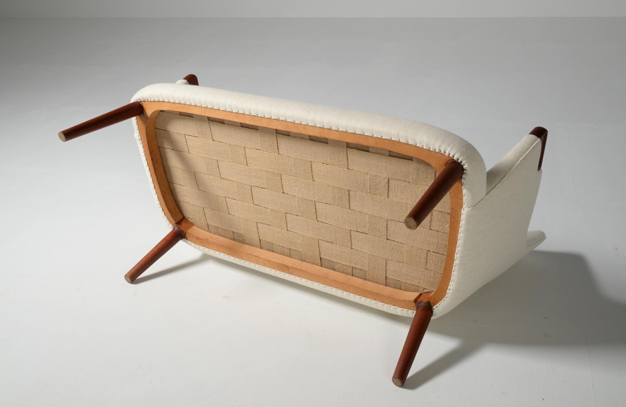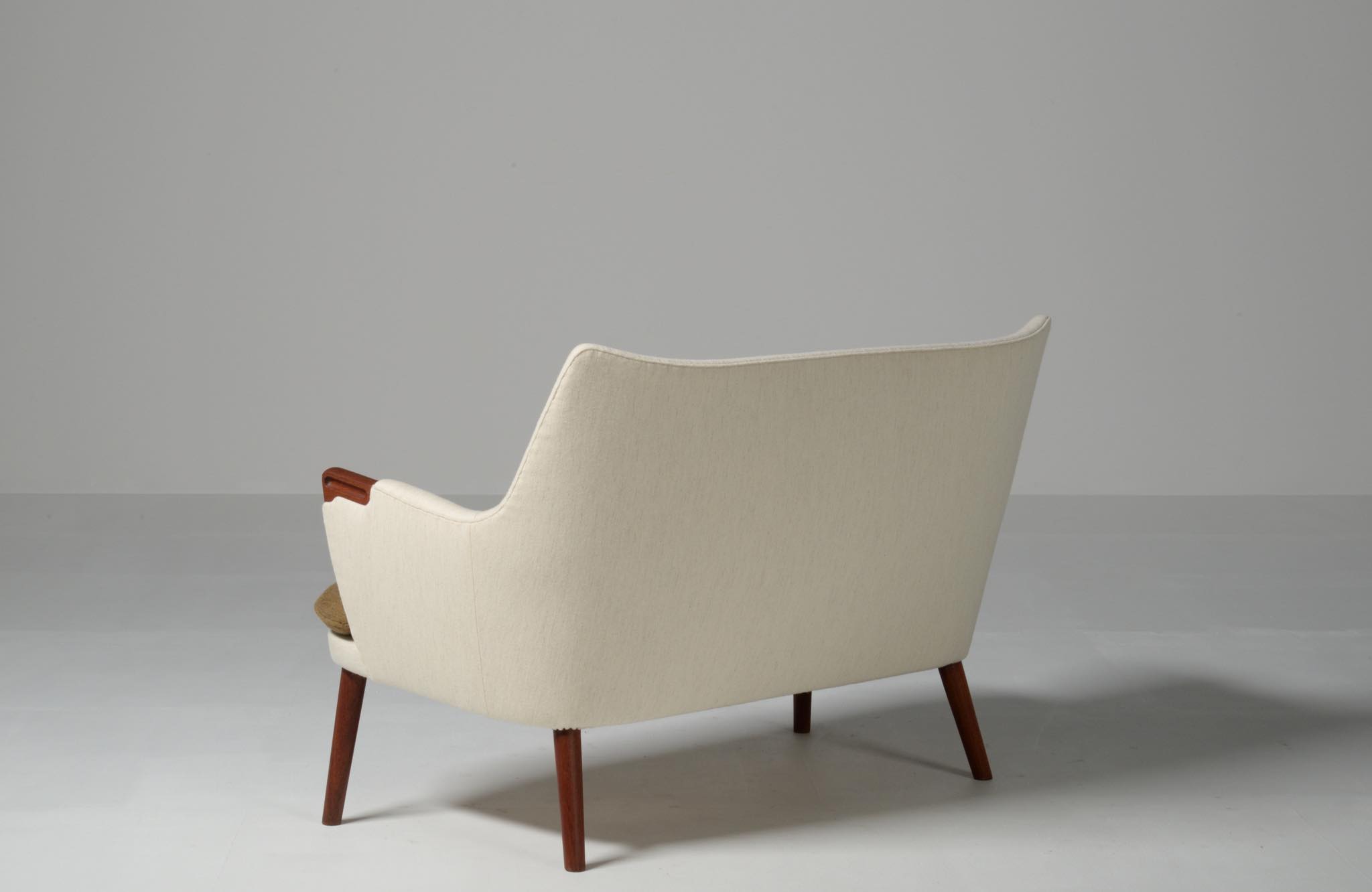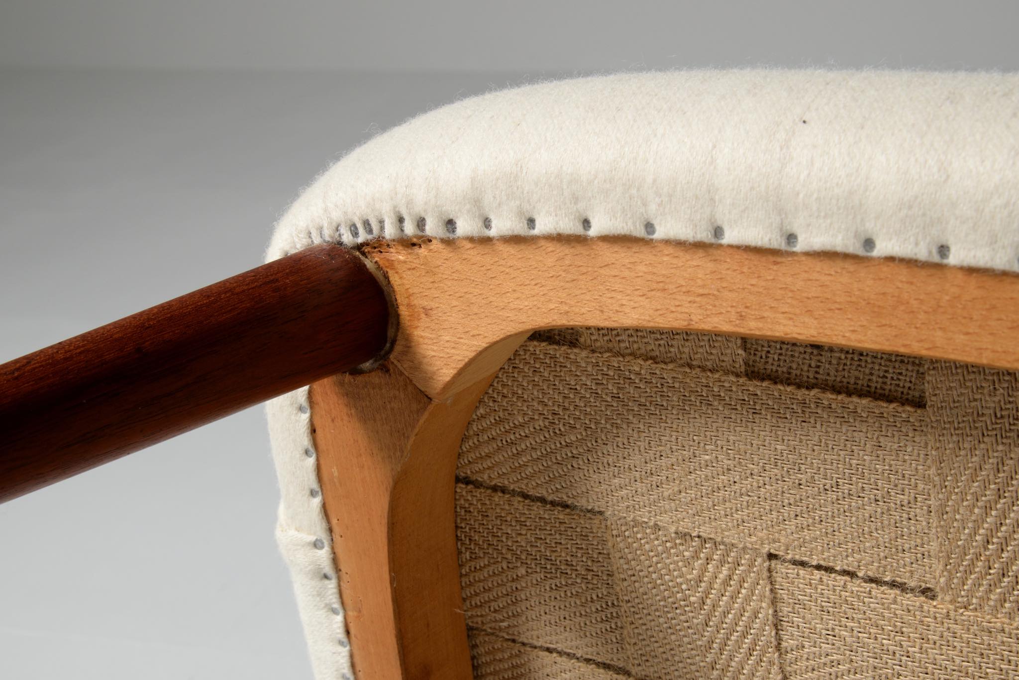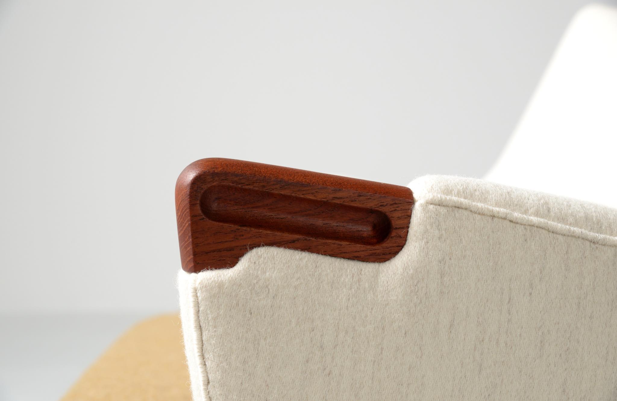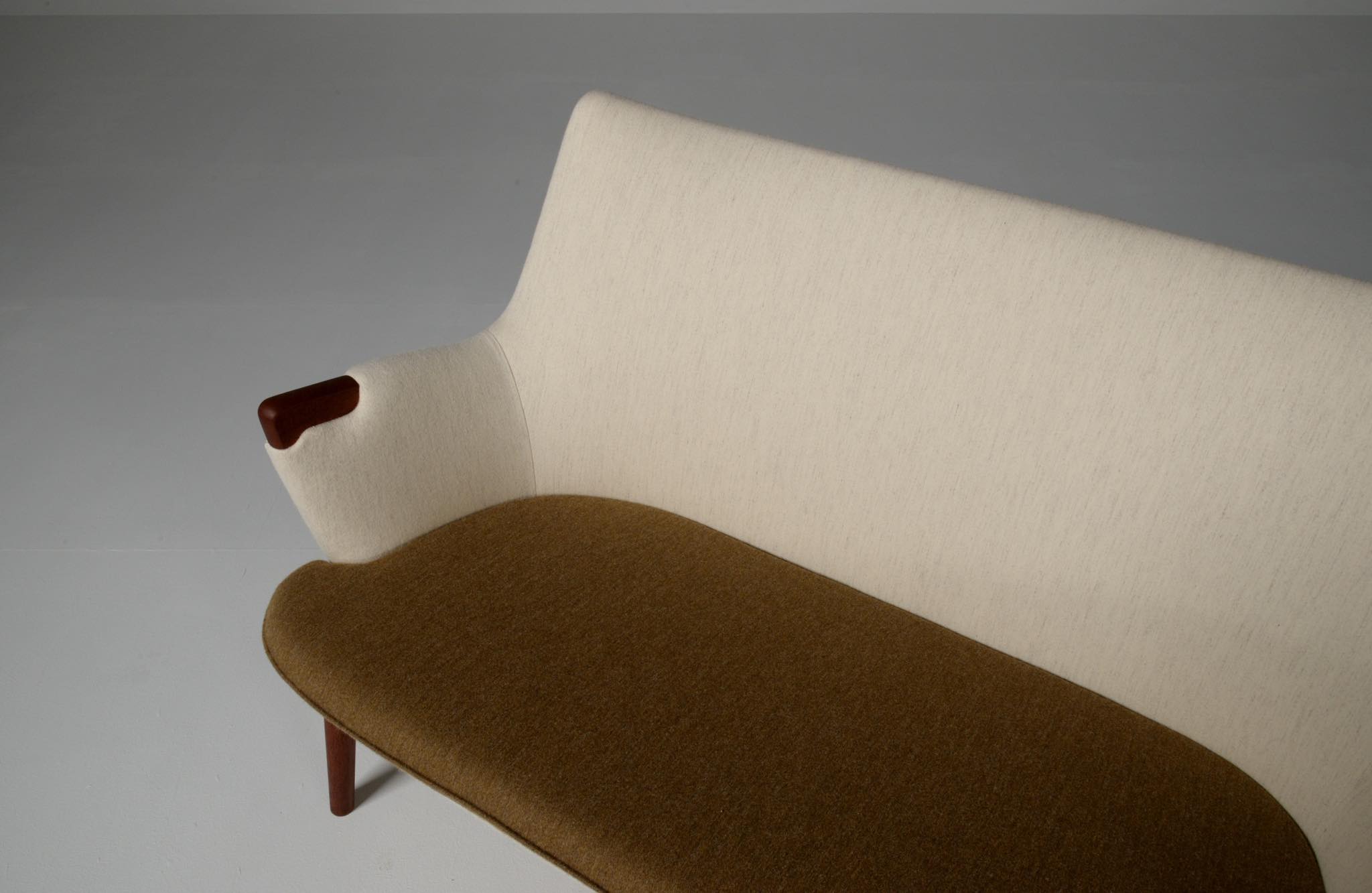 デンマークを代表する家具デザイナー、Hans J. Wegner/ハンス・ウェグナーによる”ミニベア”セッティです。こちらは1950~60年代頃に作られたものです。バランスのとれたフォルムと肘先の爪が特徴的なモデルで、ウェグナー の代表作のひとつとして知られています。爪と脚はチーク材で、タイ国原産と思しき綺麗な木目の現れた材が使われています。ファブリックはデンマークのテキスタイルブランド、Gabriel/ガブリエルの SAVAK/サヴァクにて張り替えました。SAVAKはデザイナーのTove Kindt-Larsen/トーべ・キンド・ラーセンによって1960年代初頭に生み出されたカブリエル社の名作ファブリックで、羊毛を絡めたようなきめ細やかな織りが特徴です。