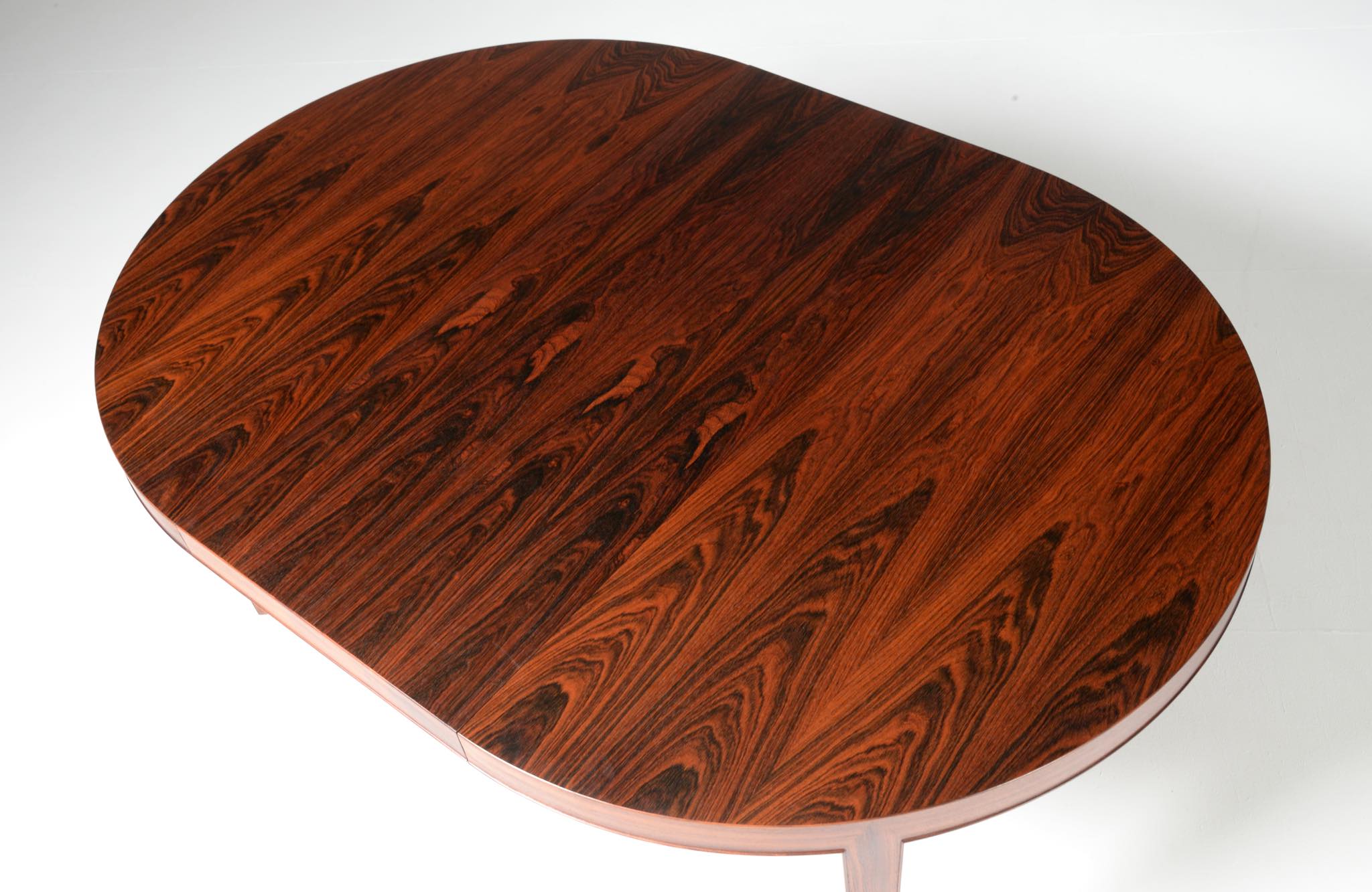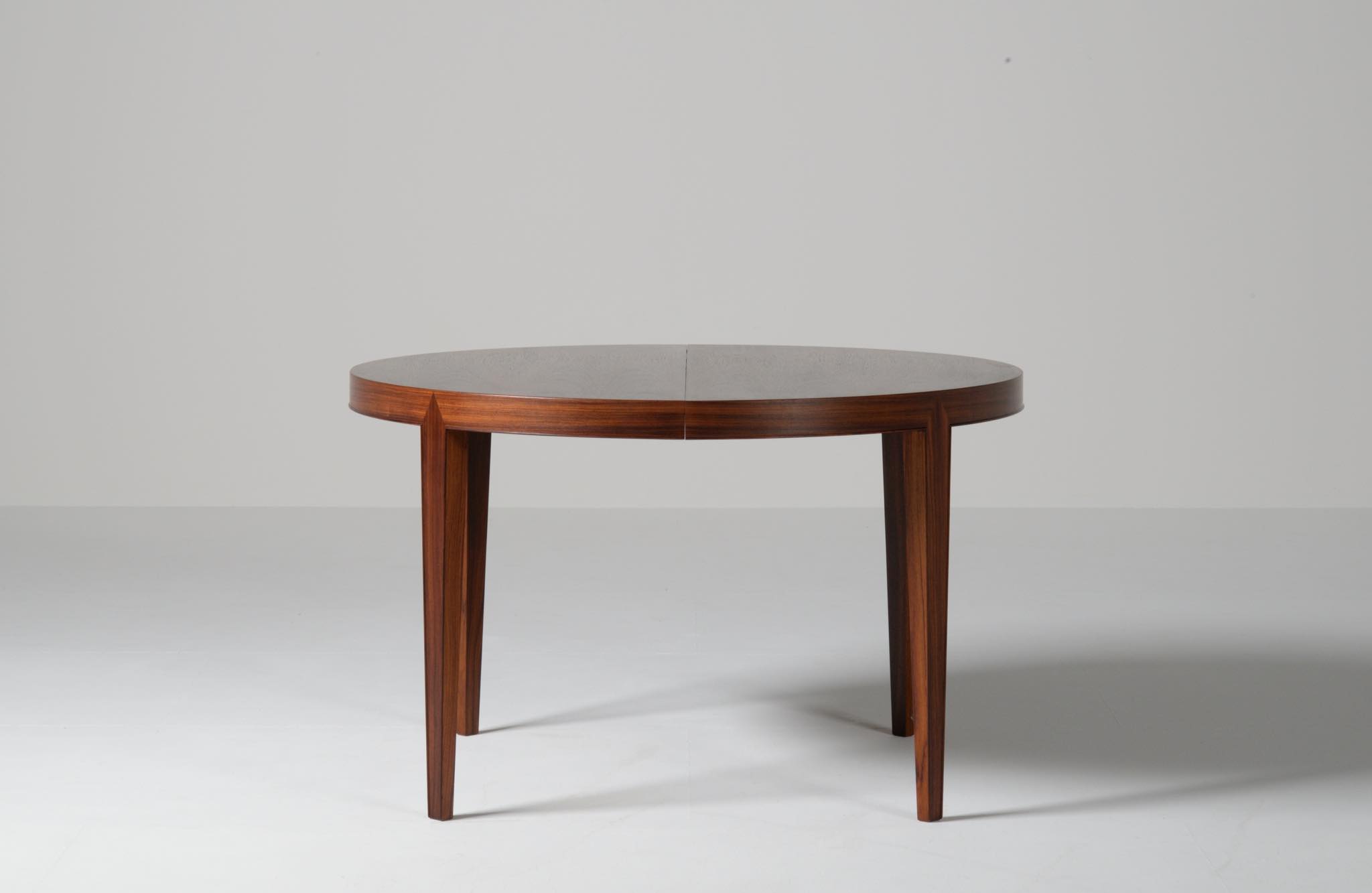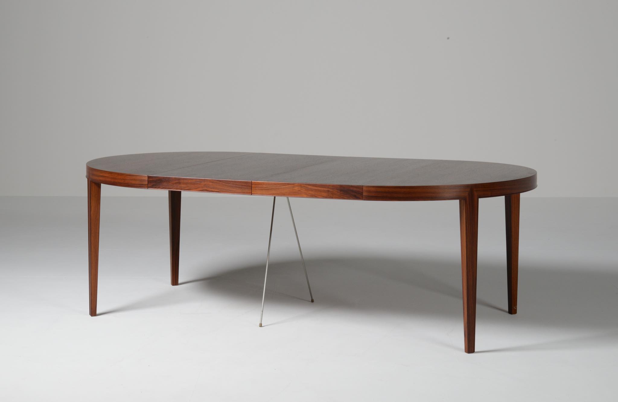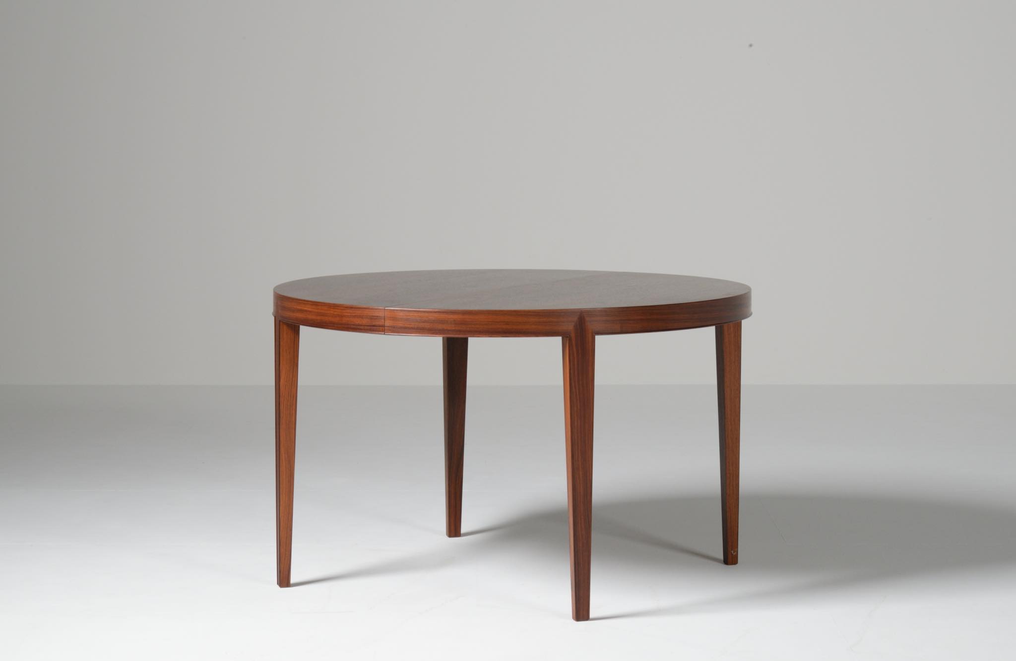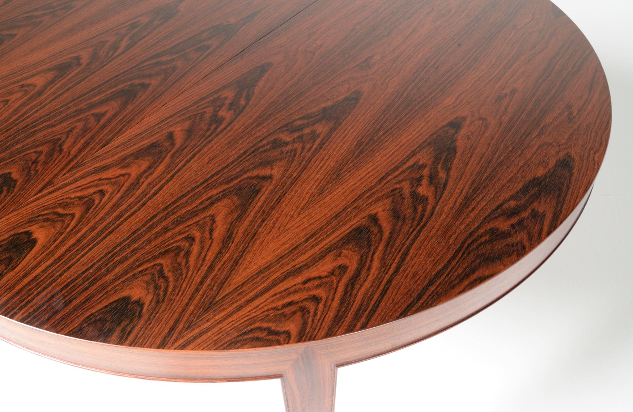 ロイヤルコペンハーゲンのタイルを象嵌したテーブルで知られるデンマークの家具デザイナー、Severin Hansen Jr./セヴェリン・ハンセン Jr.によるダイニングテーブルです。1960年代頃に作られたものでしょう。板目文様に見応えのあるローズウッドが木取りされており、脚の接合に特徴のあるモデルです。天板にはエクステンションリーフが2枚付属し、天板の拡張が行えます。表面の塗膜に劣化が見られたため再塗装を施しました。コンディションは良好です。尚、こちらのテーブルは天板と脚部を取り外すことができませんので、搬入路の確認が必要です。