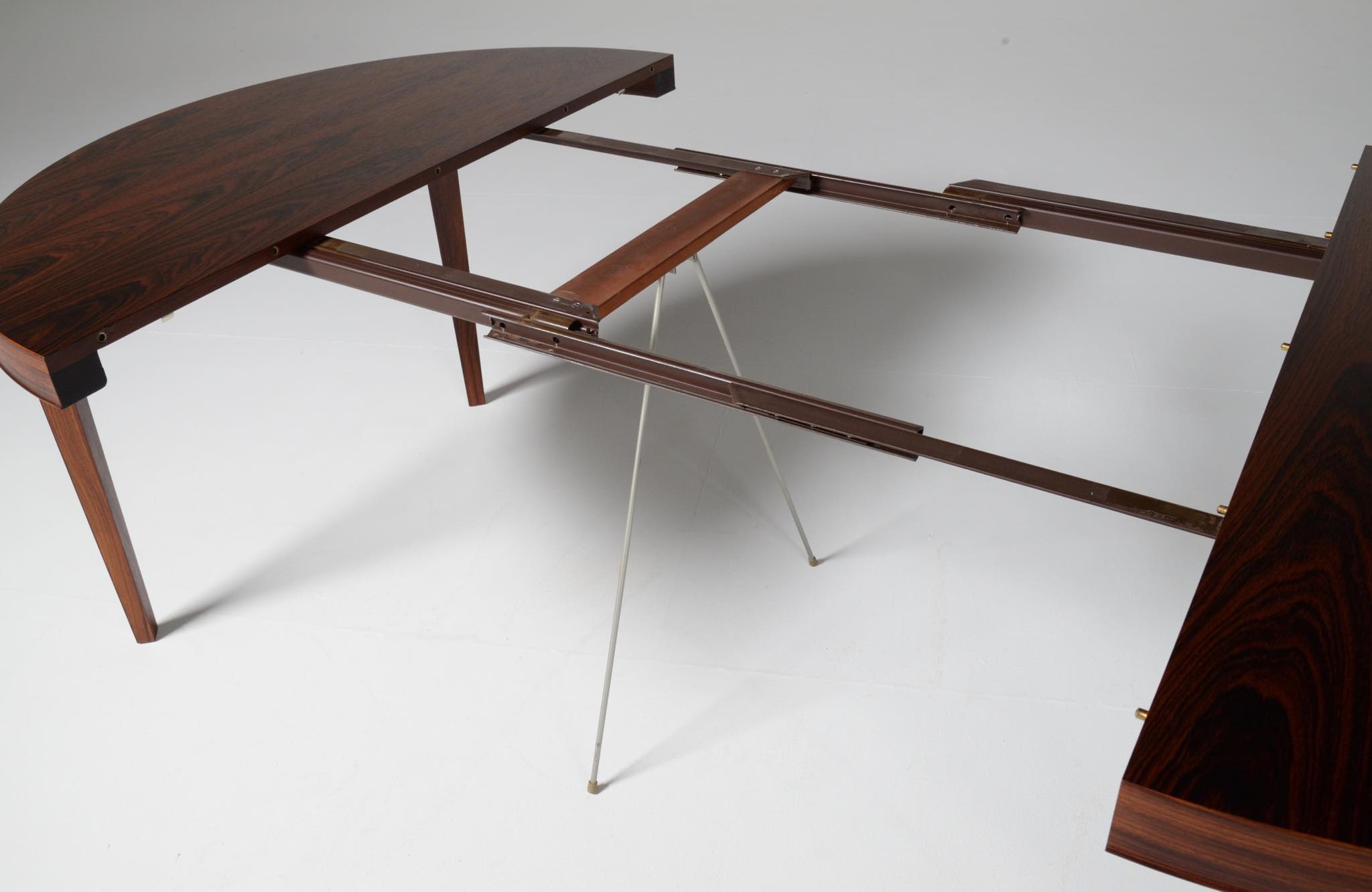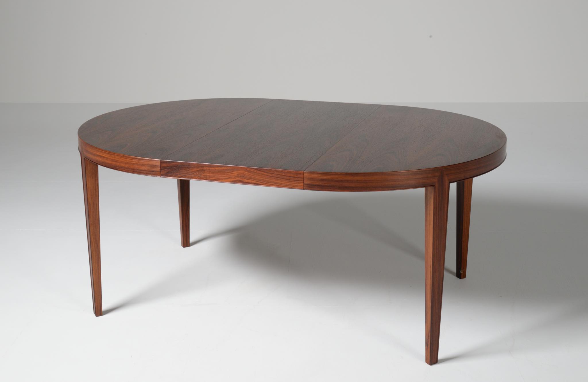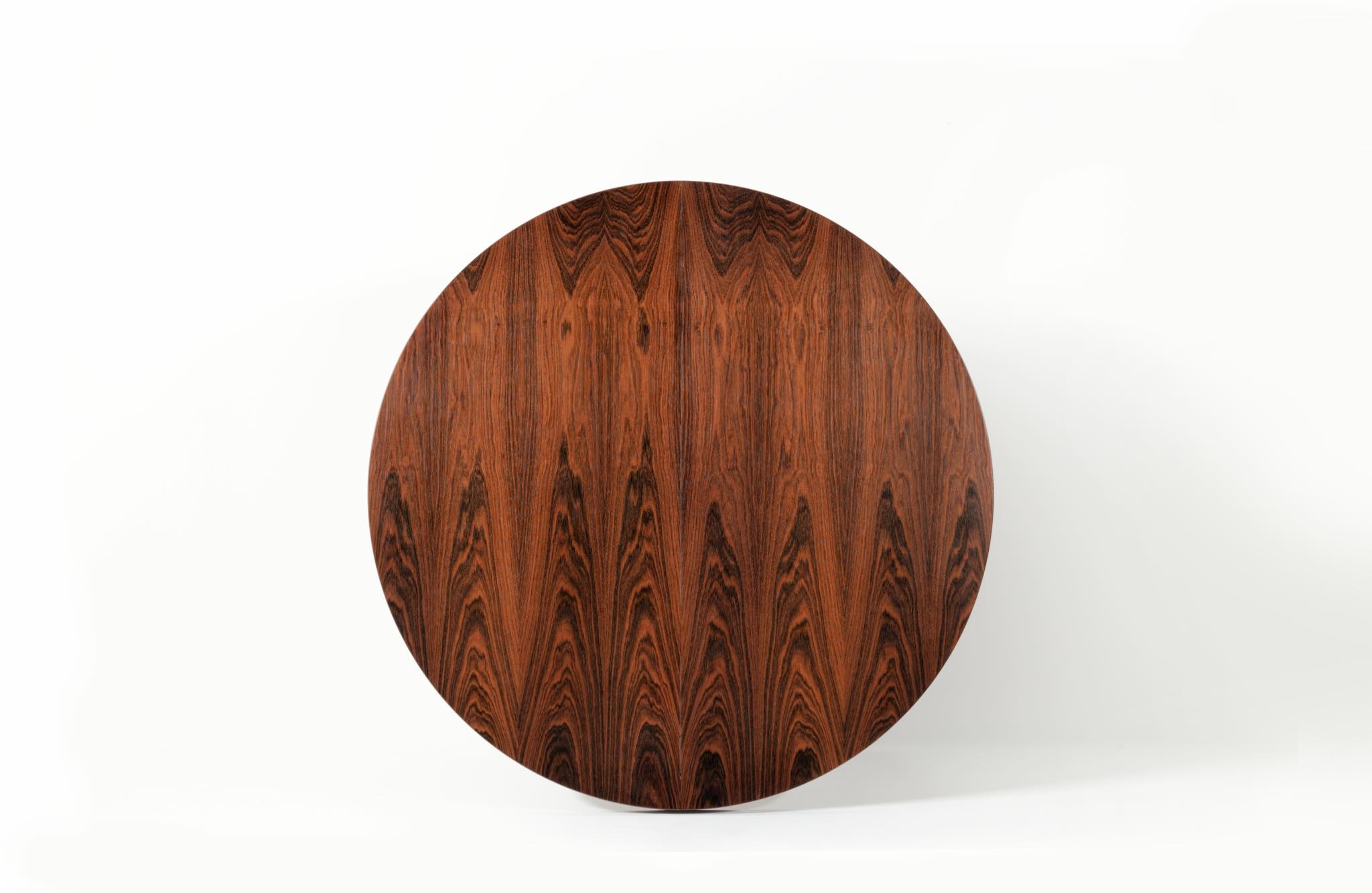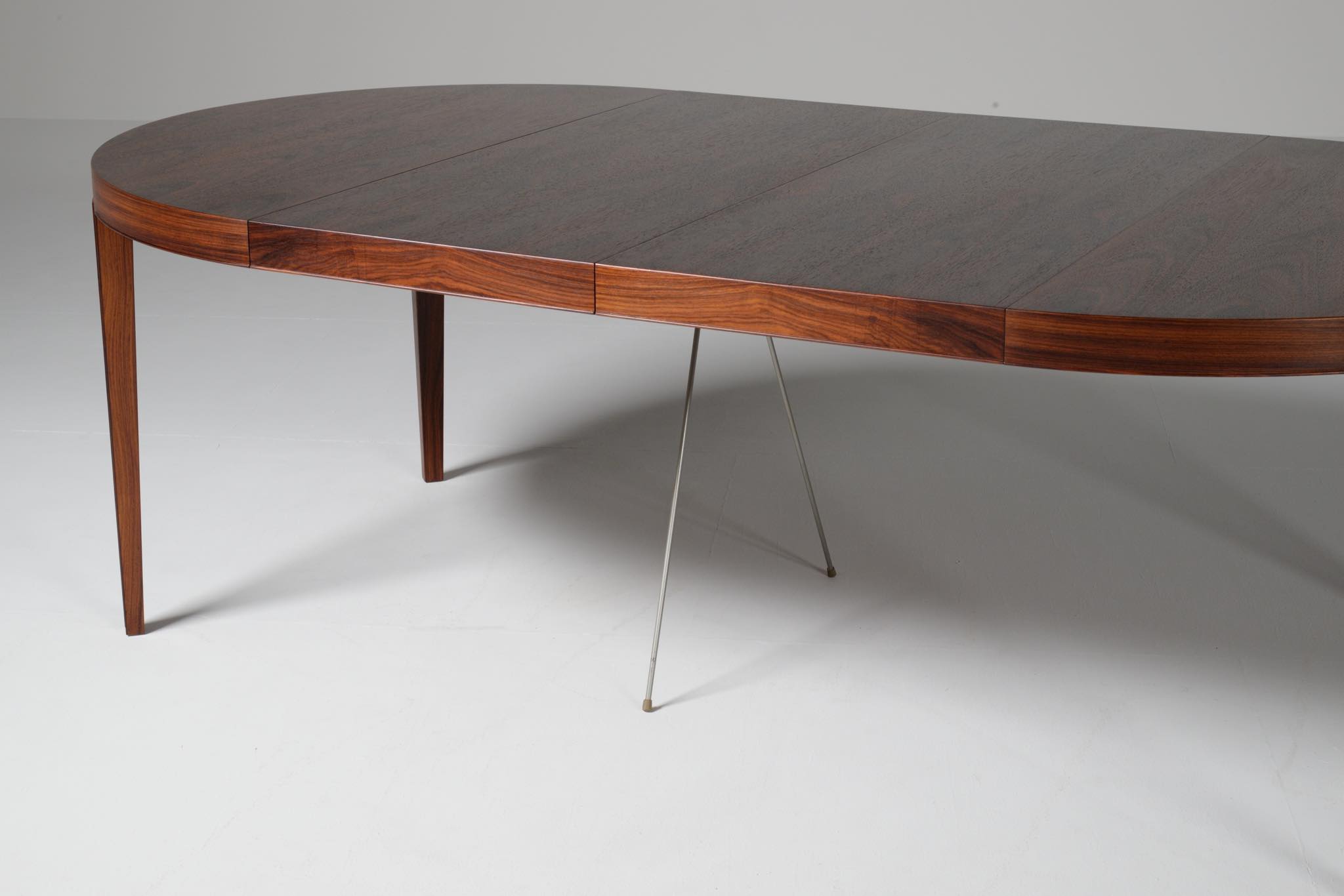ロイヤルコペンハーゲンのタイルを象嵌したテーブルで知られるデンマークの家具デザイナー、Severin Hansen Jr./セヴェリン・ハンセン Jr.によるダイニングテーブルです。1960年代頃に作られたものでしょう。板目文様に見応えのあるローズウッドが木取りされており、脚の接合に特徴のあるモデルです。天板にはエクステンションリーフが2枚付属し、天板の拡張が行えます。表面の塗膜に劣化が見られたため再塗装を施しました。コンディションは良好です。尚、こちらのテーブルは天板と脚部を取り外すことができませんので、搬入路の確認が必要です。