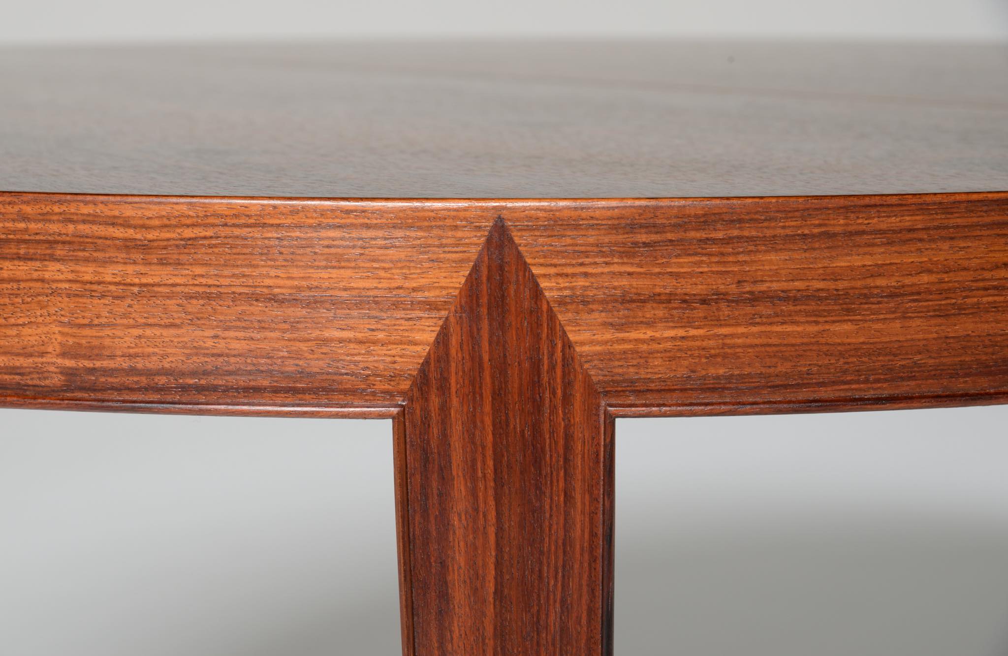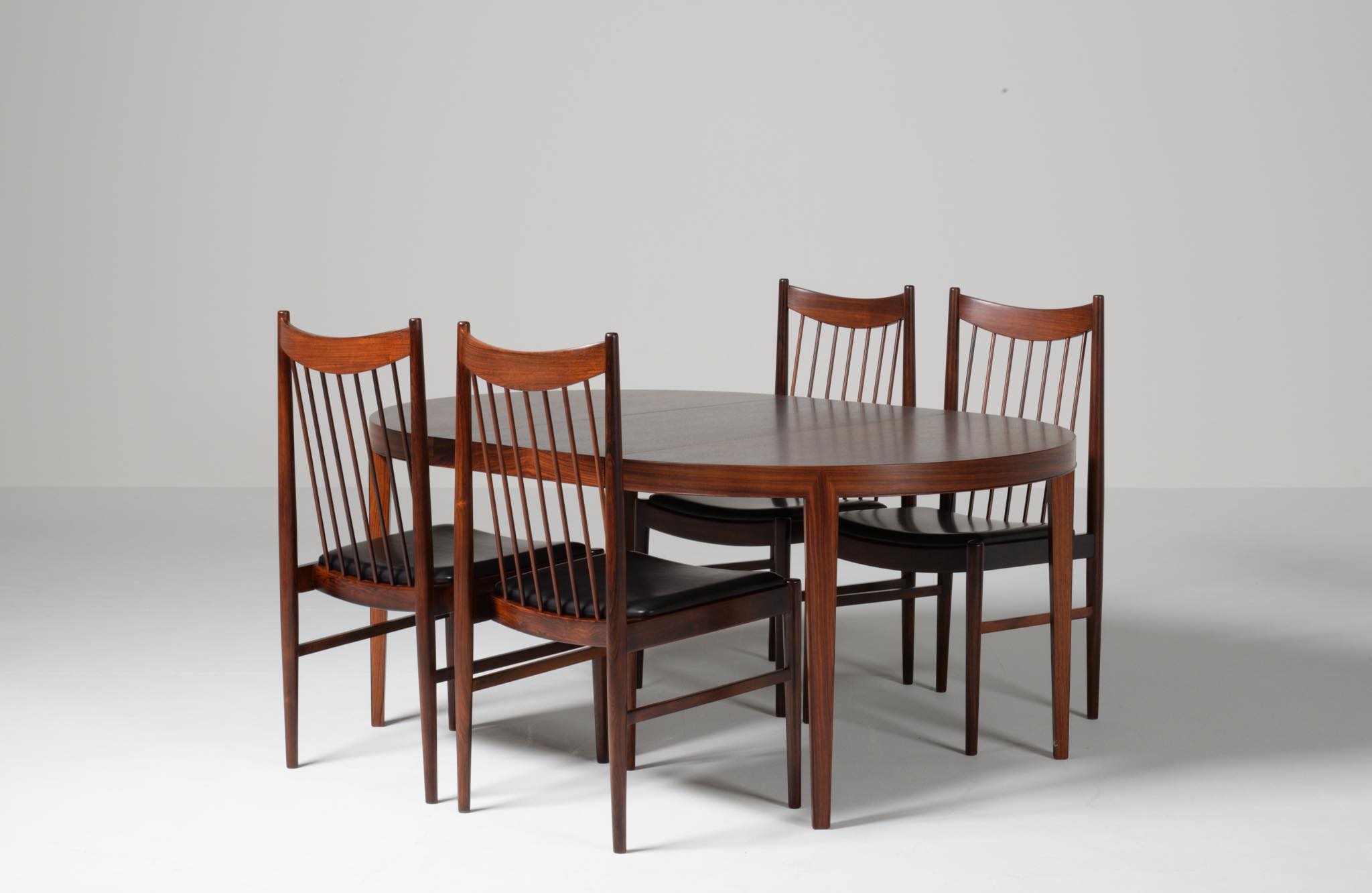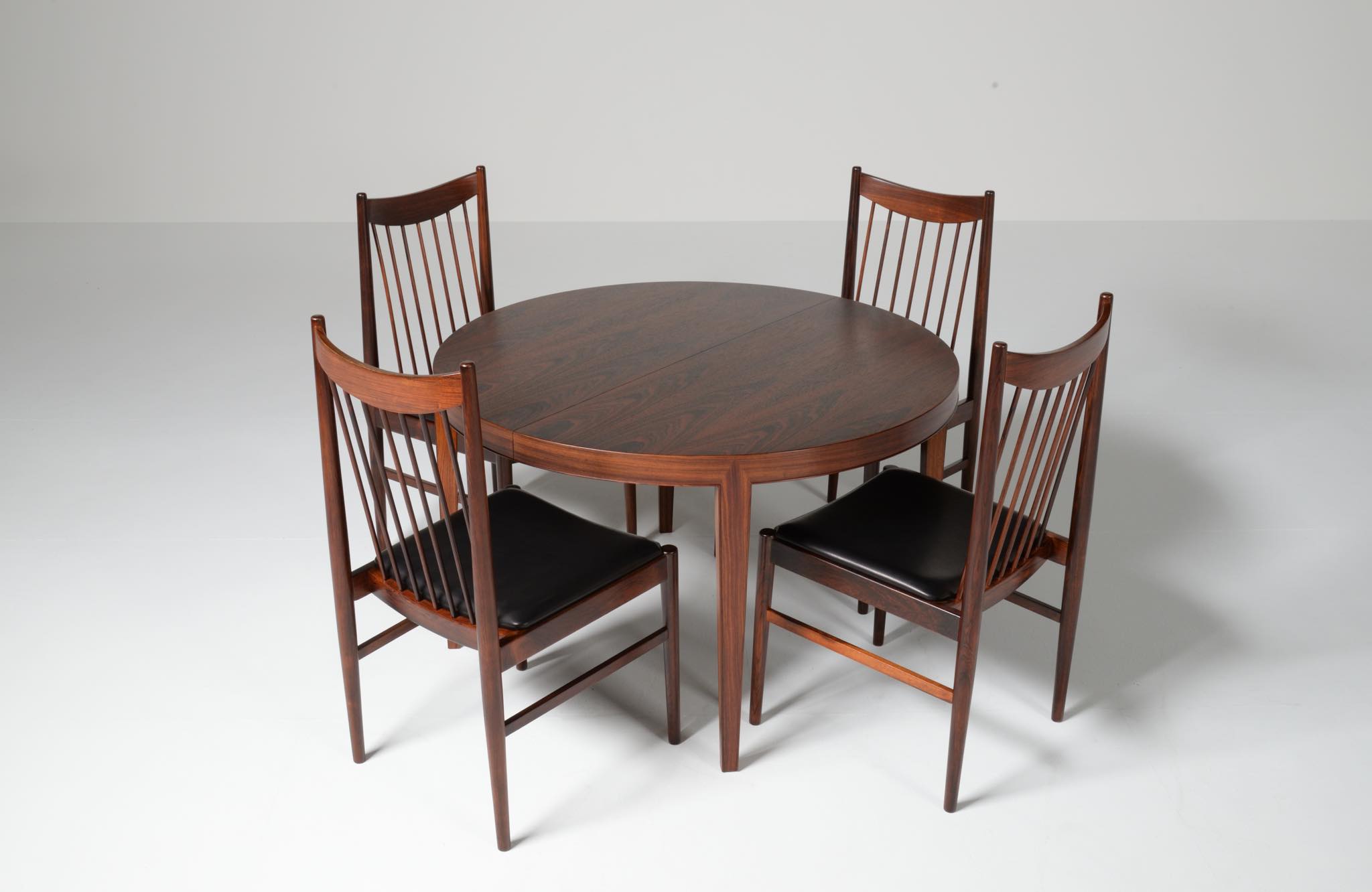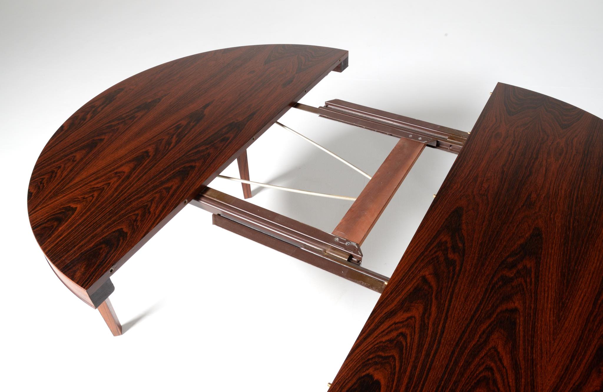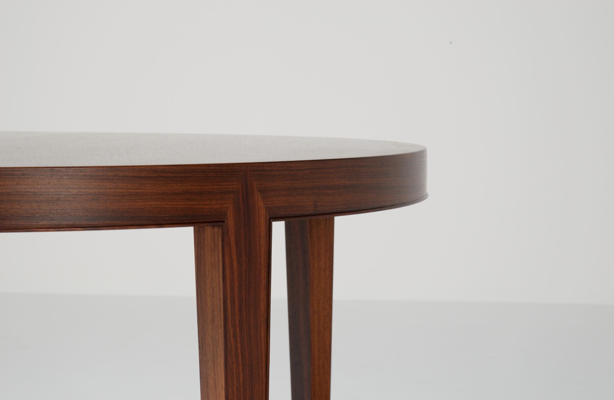 ロイヤルコペンハーゲンのタイルを象嵌したテーブルで知られるデンマークの家具デザイナー、Severin Hansen Jr./セヴェリン・ハンセン Jr.によるダイニングテーブルです。1960年代頃に作られたものでしょう。板目文様に見応えのあるローズウッドが木取りされており、脚の接合に特徴のあるモデルです。天板にはエクステンションリーフが2枚付属し、天板の拡張が行えます。表面の塗膜に劣化が見られたため再塗装を施しました。コンディションは良好です。尚、こちらのテーブルは天板と脚部を取り外すことができませんので、搬入路の確認が必要です。