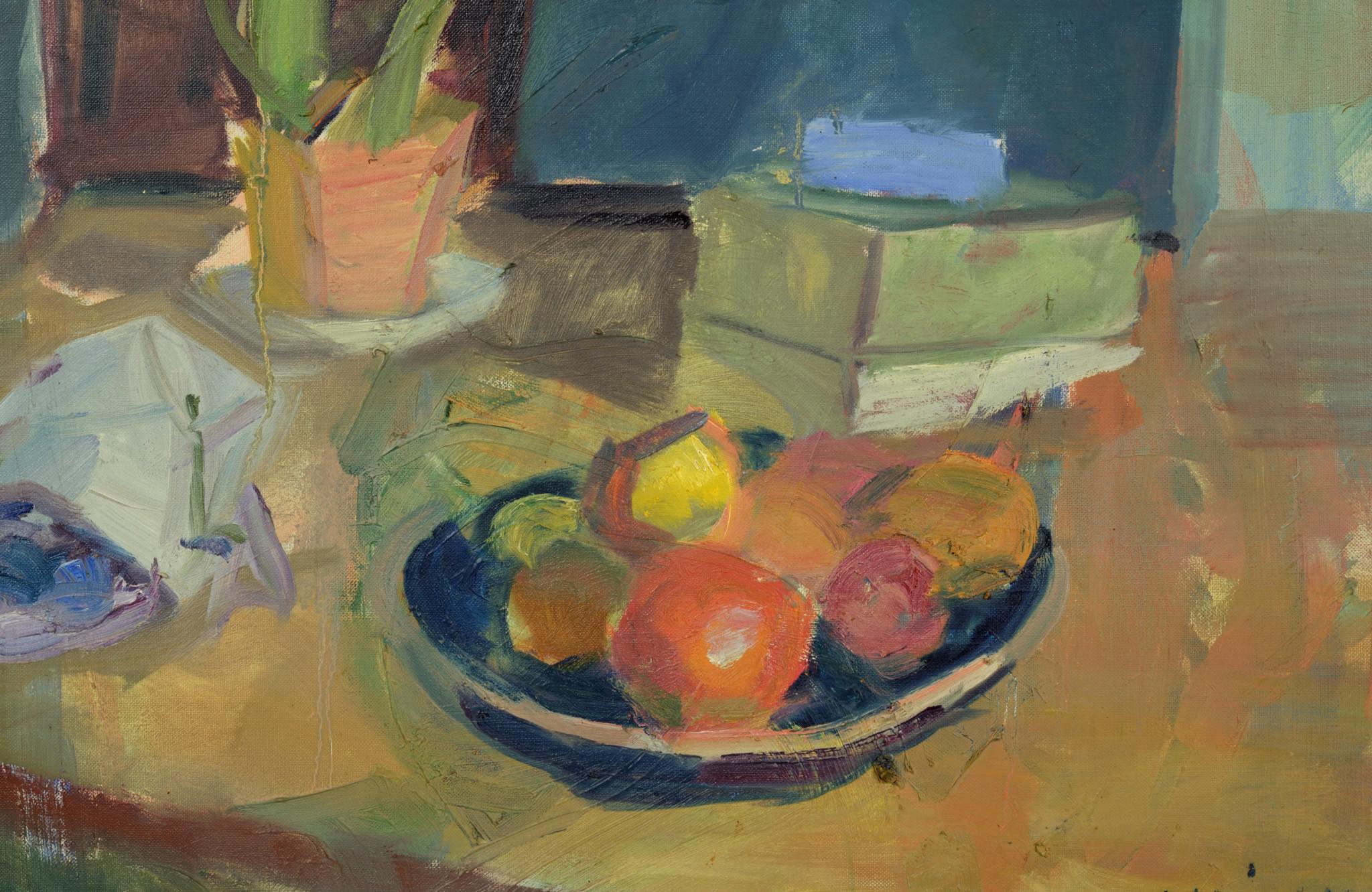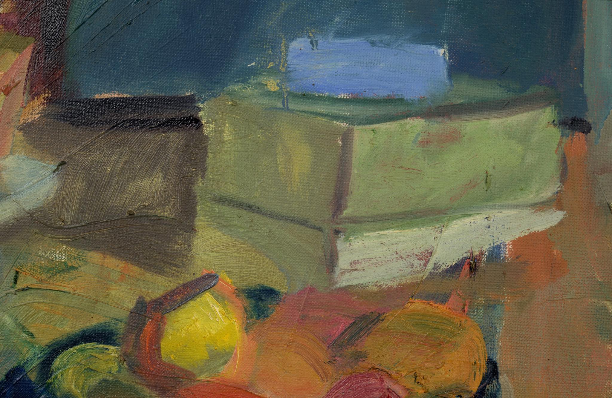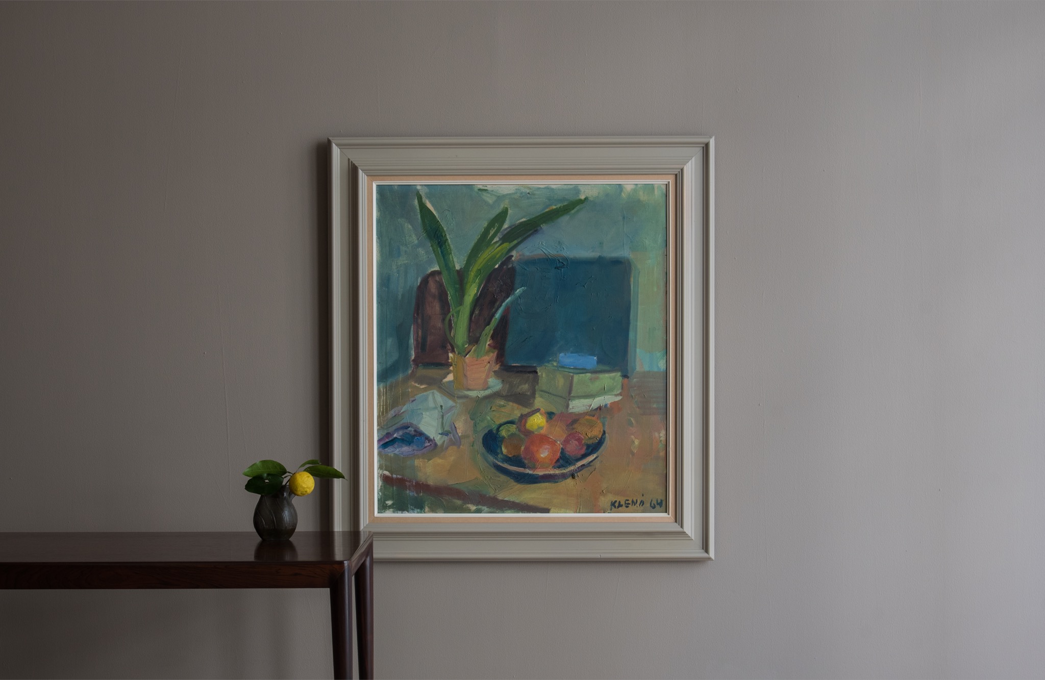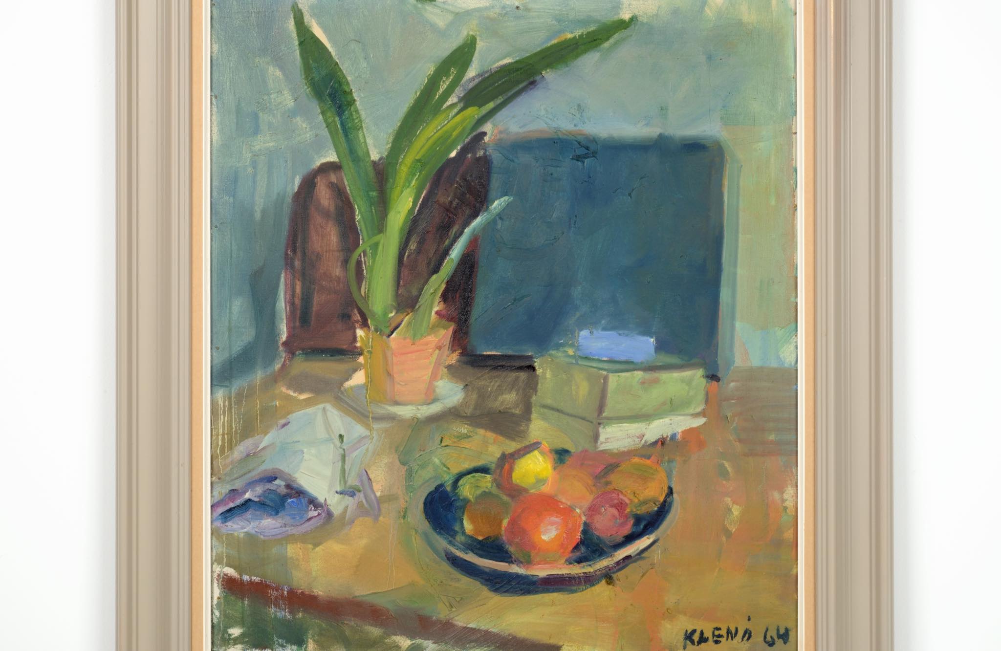 デンマークの画家、Evgenij Klenø/エヴゲニー・クレノによる油彩静物画作品です。1964年に制作されたもので、卓上の静物が独特の筆致で描かれています。クレノの作品としては丁寧に描かれています。フレームには傷みが見られたので塗装にて整えました。コンディションは良好です。