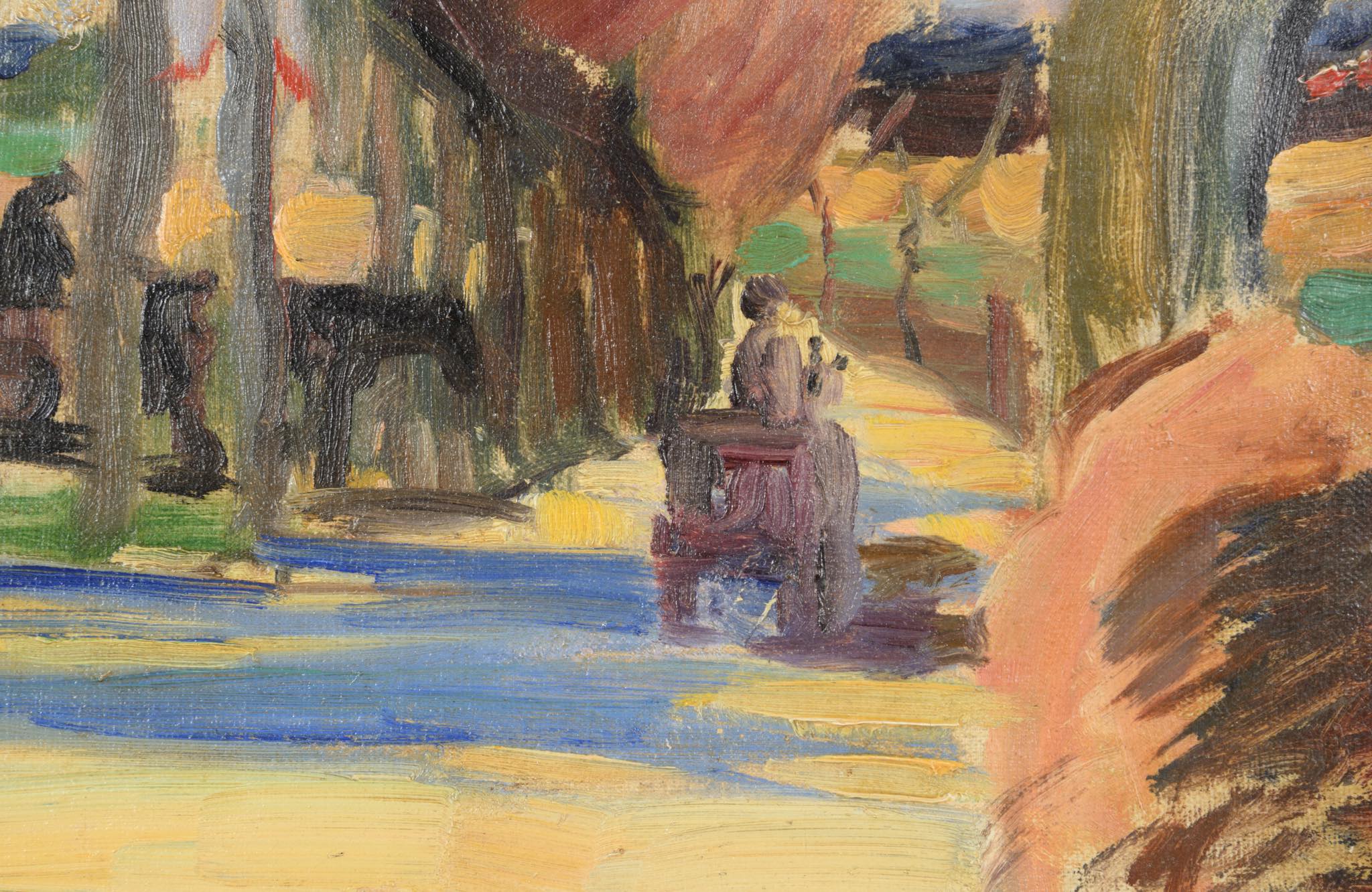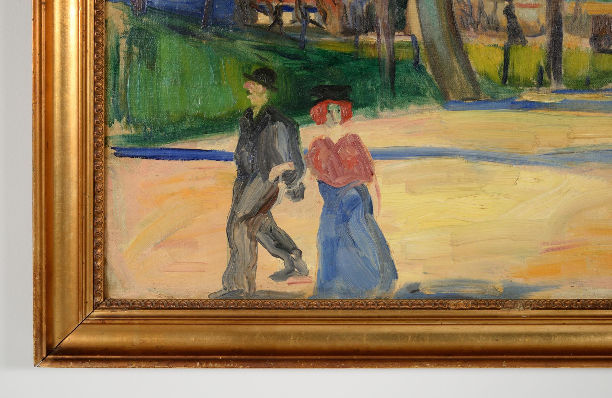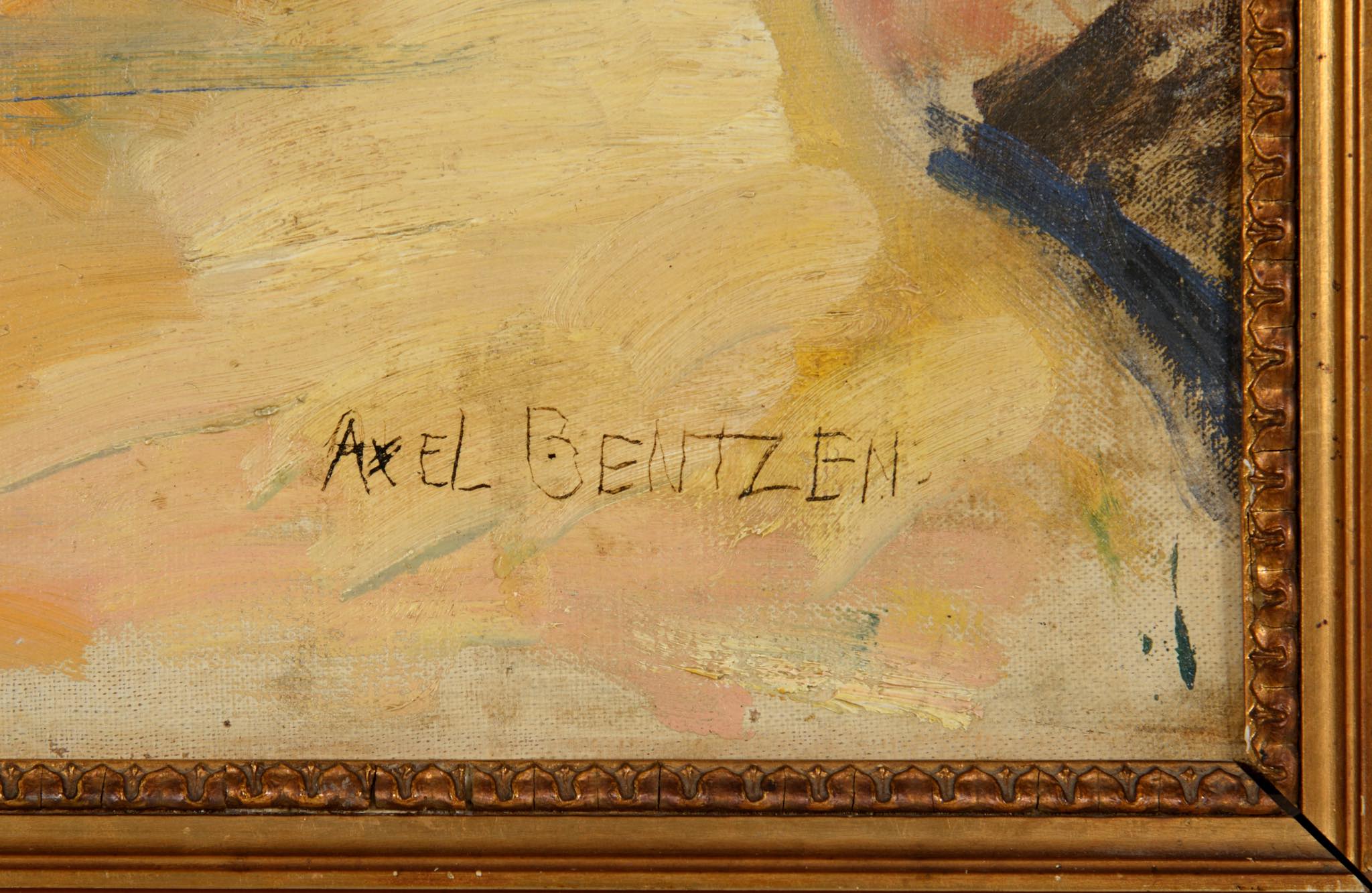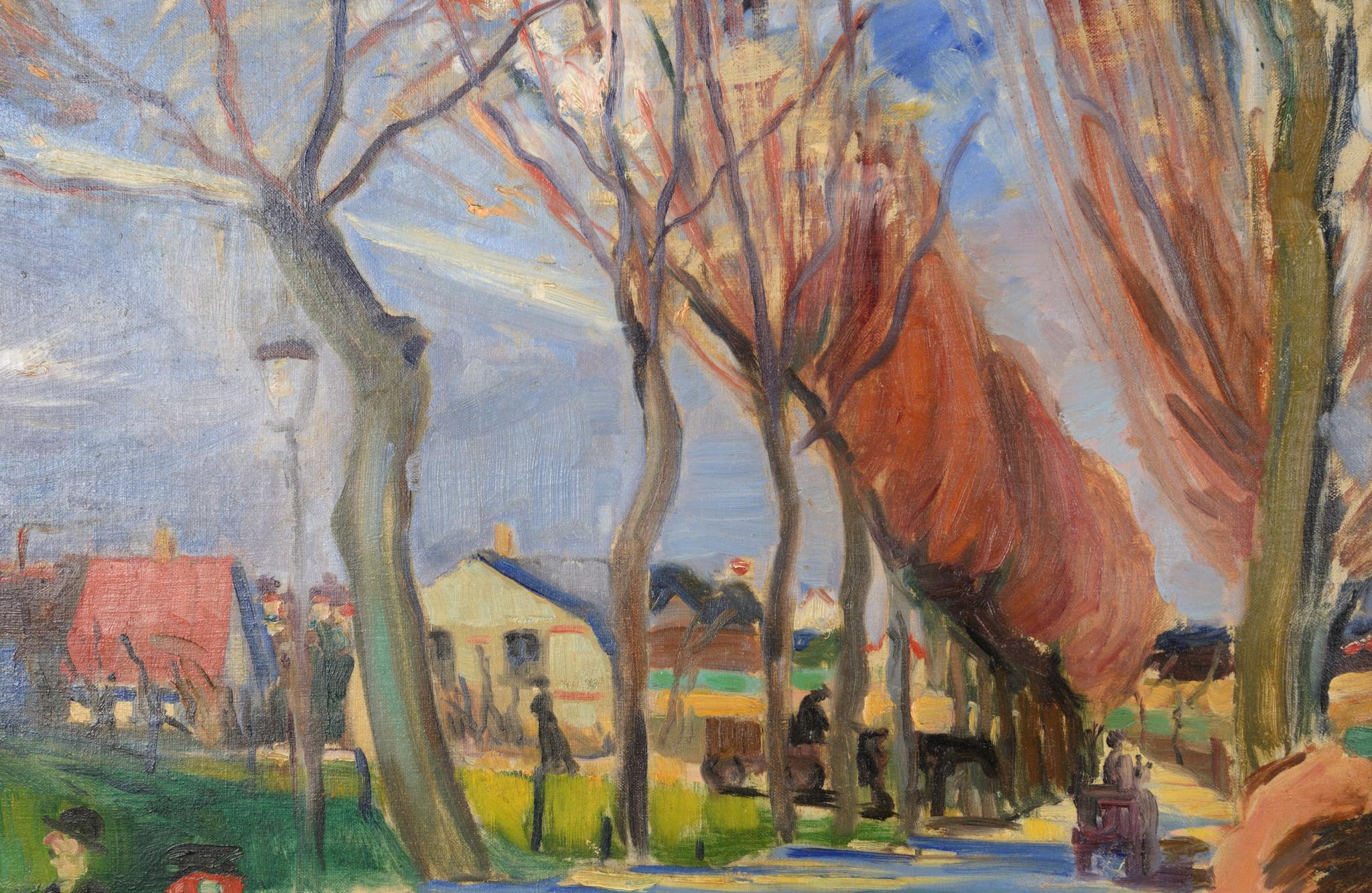 20世紀前葉に活躍したデンマークの画家、Axel Bentzen/アクセル・ベンツェンによる風景画油彩作品です。秋の街道を歩く男女の姿が描かれています。制作年は古く初期の作品のようで、1910年代頃に描かれたものと思われ、キャンバスの質感から見ても100年ほど経過しているようです。金箔のフレームもオリジナルのようで、小傷や経年感が見られますが、作品と馴染んでいます。サインの上部と、男性の脚の辺りにキャンバスの直しがありますが、表からは判別できない程度です。タイトルは便宜上当店にて付けさせて頂きました。