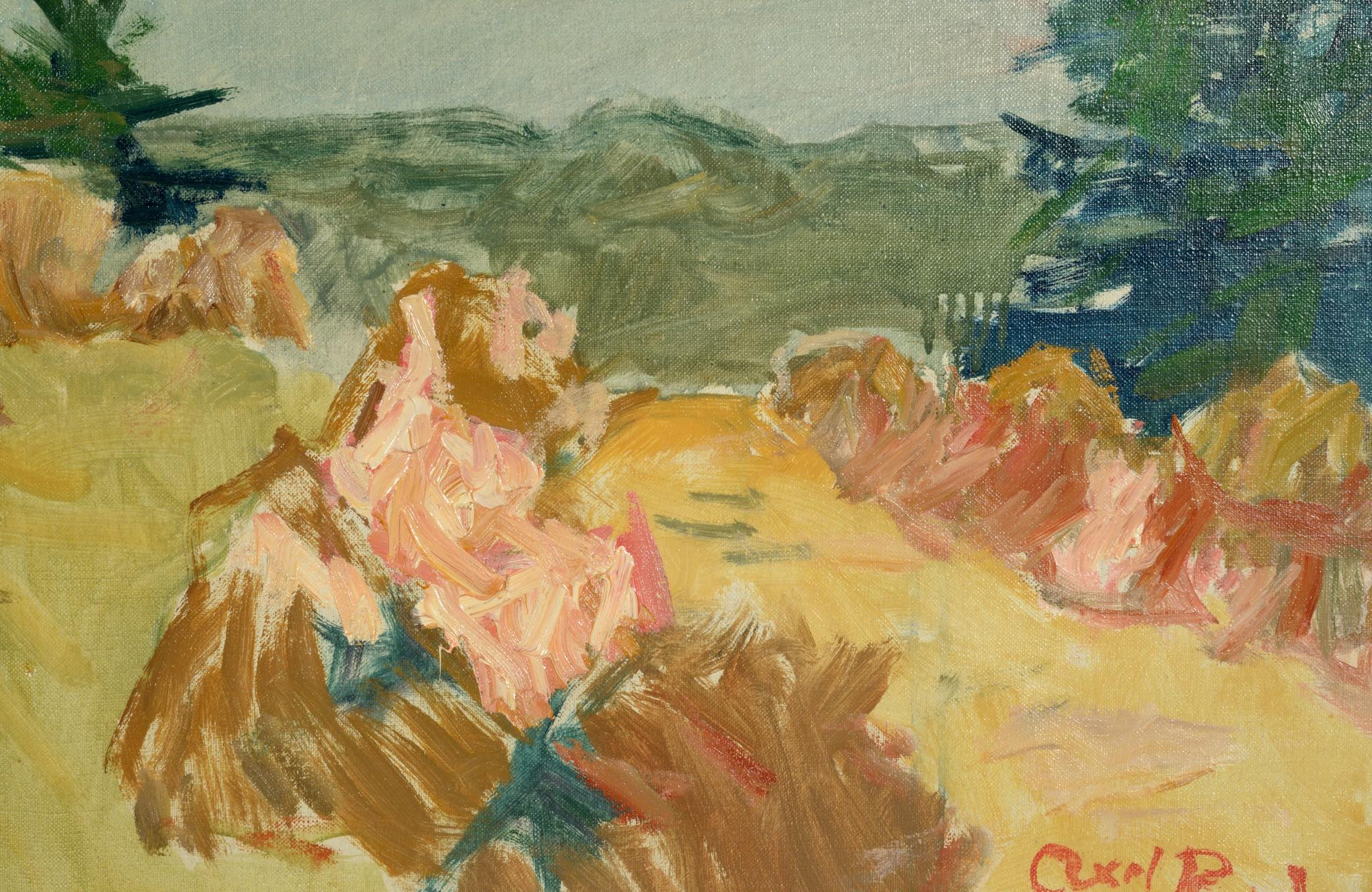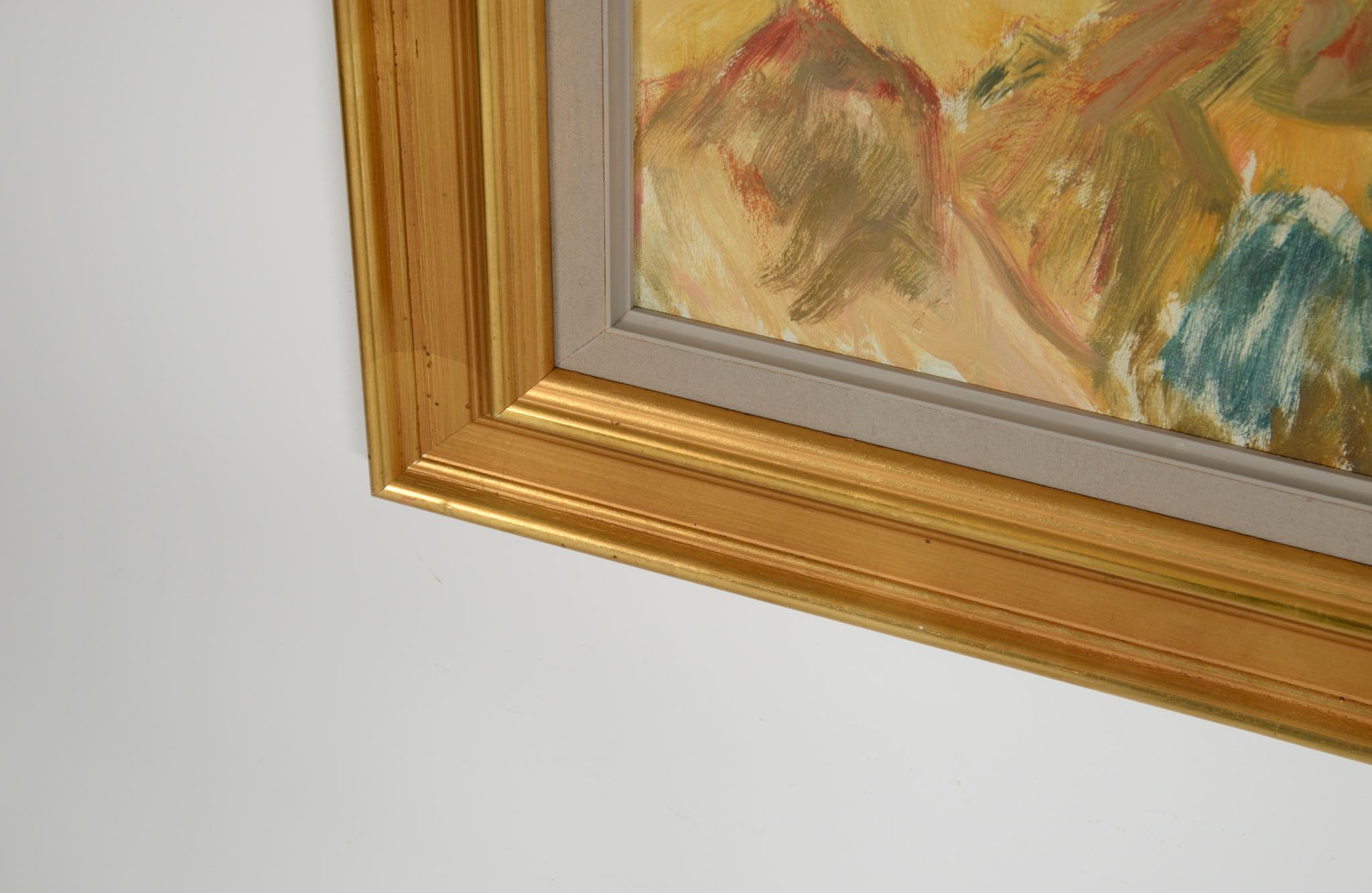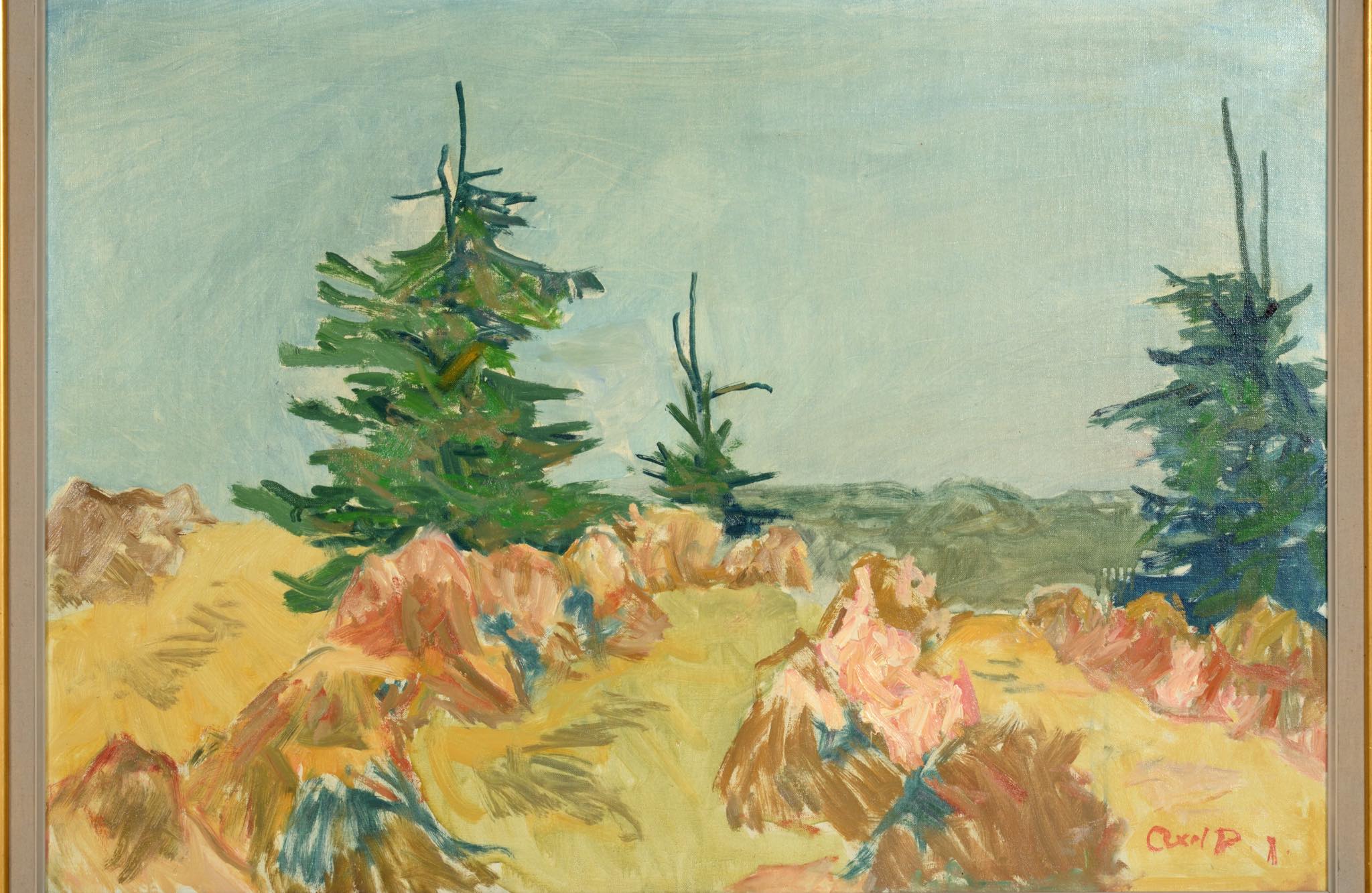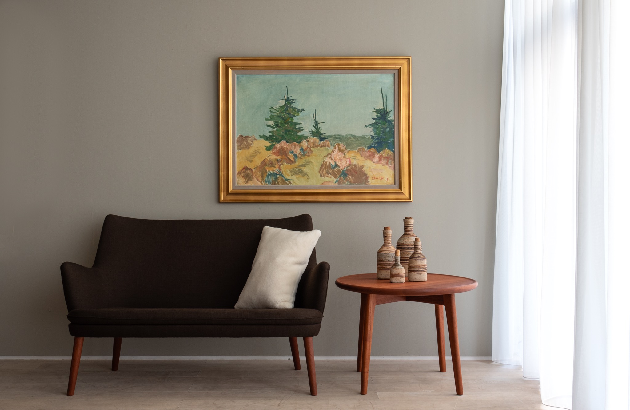 20世紀前中葉に活躍したデンマークの画家、Axel Peder Jensen/アクセル・ペダー・イェンセンによる風景画油彩作品、1935年頃に描かれたもののようです。樅木(トウヒ)が自生するユトランド半島北西部、ヴェンディッセル砂丘の風景を描いた作品で、同類の作品がヴェンディッセル美術館に収蔵されています。金箔のフレームはオリジナルで、目立ったダメージはなくコンディションは良好です。タイトルは便宜上当店で付けさせて頂きました。