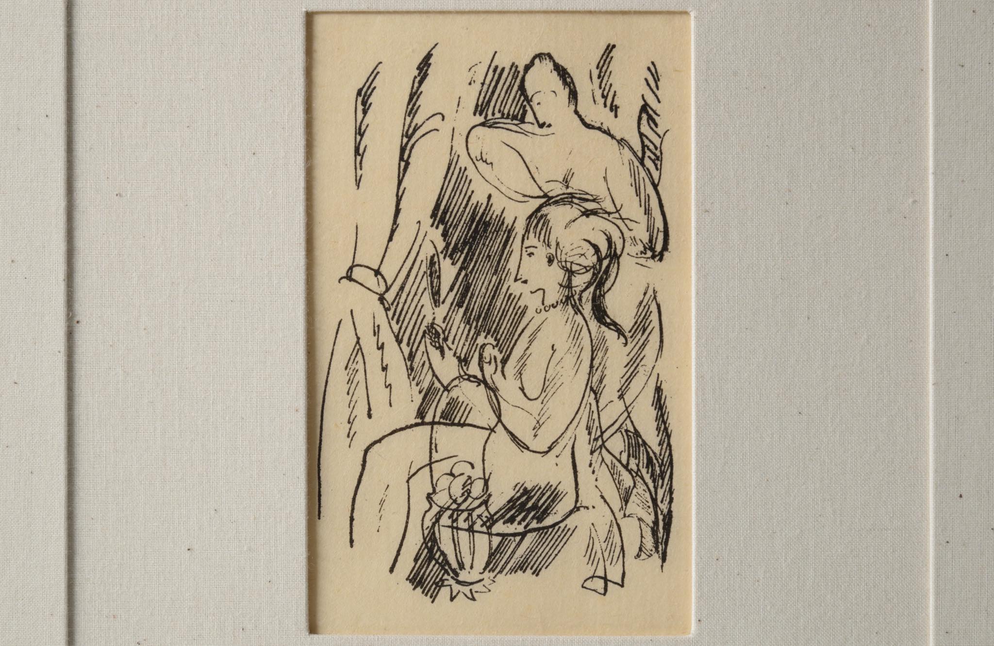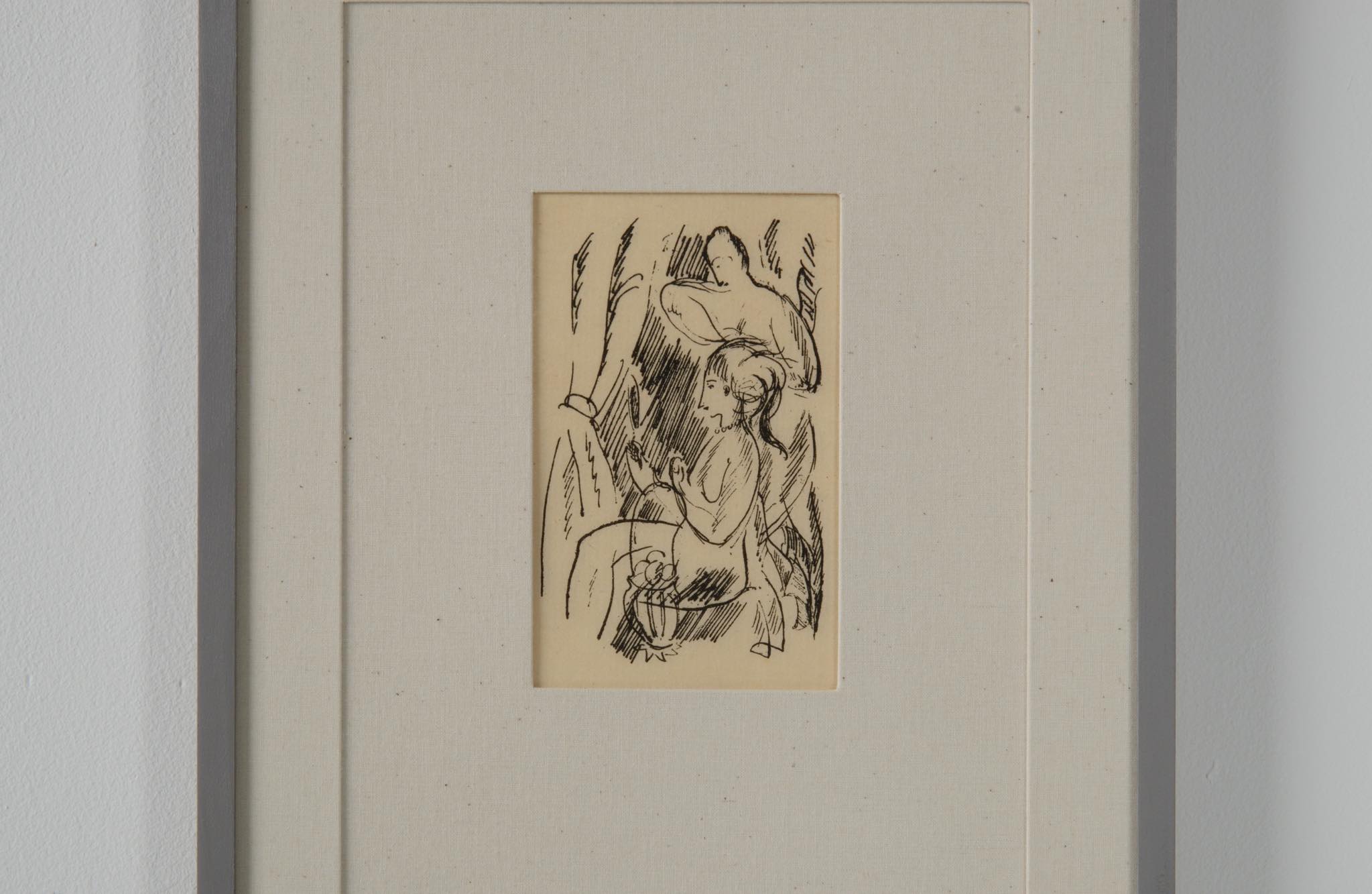 デンマークを代表する芸術家、Axel Salto/アクセル・サルトによるリトグラフ作品です。紀元前の帝政ローマ時代初期に活躍した詩人オウィディウスによる作品『Elskovskunsten/愛の詩』を、1917年にデンマークの俳優で作家のWalt Rosenberg/ウォルト・ローゼンバーグによって翻訳され、アクセル・サルトが挿絵を担当し発刊された詩集『OVID Elskovskunsten』から抽出されたリトグラフです。詩のシーン事に挿絵されたもののようで、サルトによる独特の筆致が見所です。詩集のエディションは13/350冊、リトグラフのサインとエディションスタンプは本扉に集約されているため作品には備わりませんが、背面にコピーをお付けします。木製のフレームと布被せのマットにて新たに額装しました。