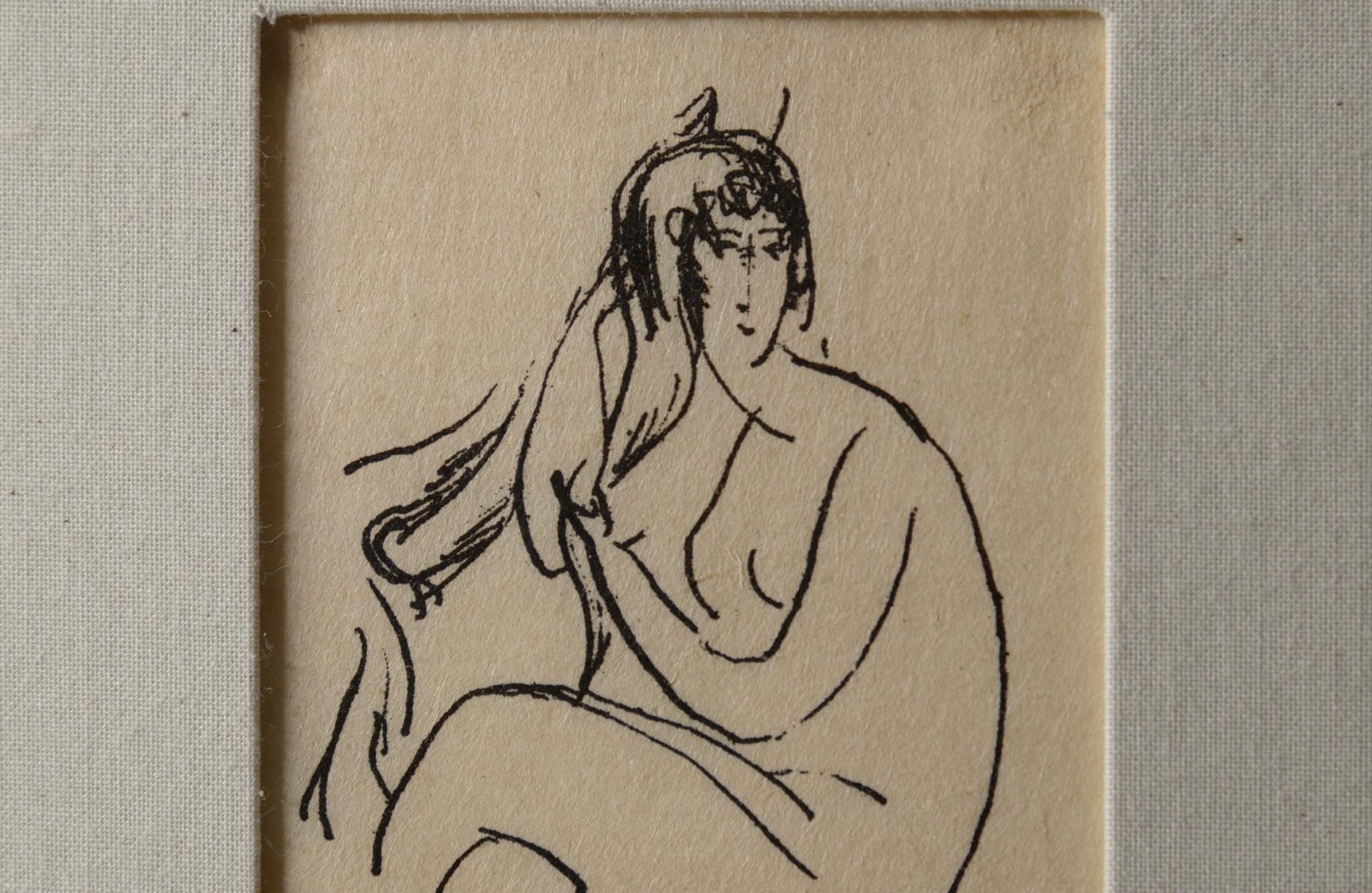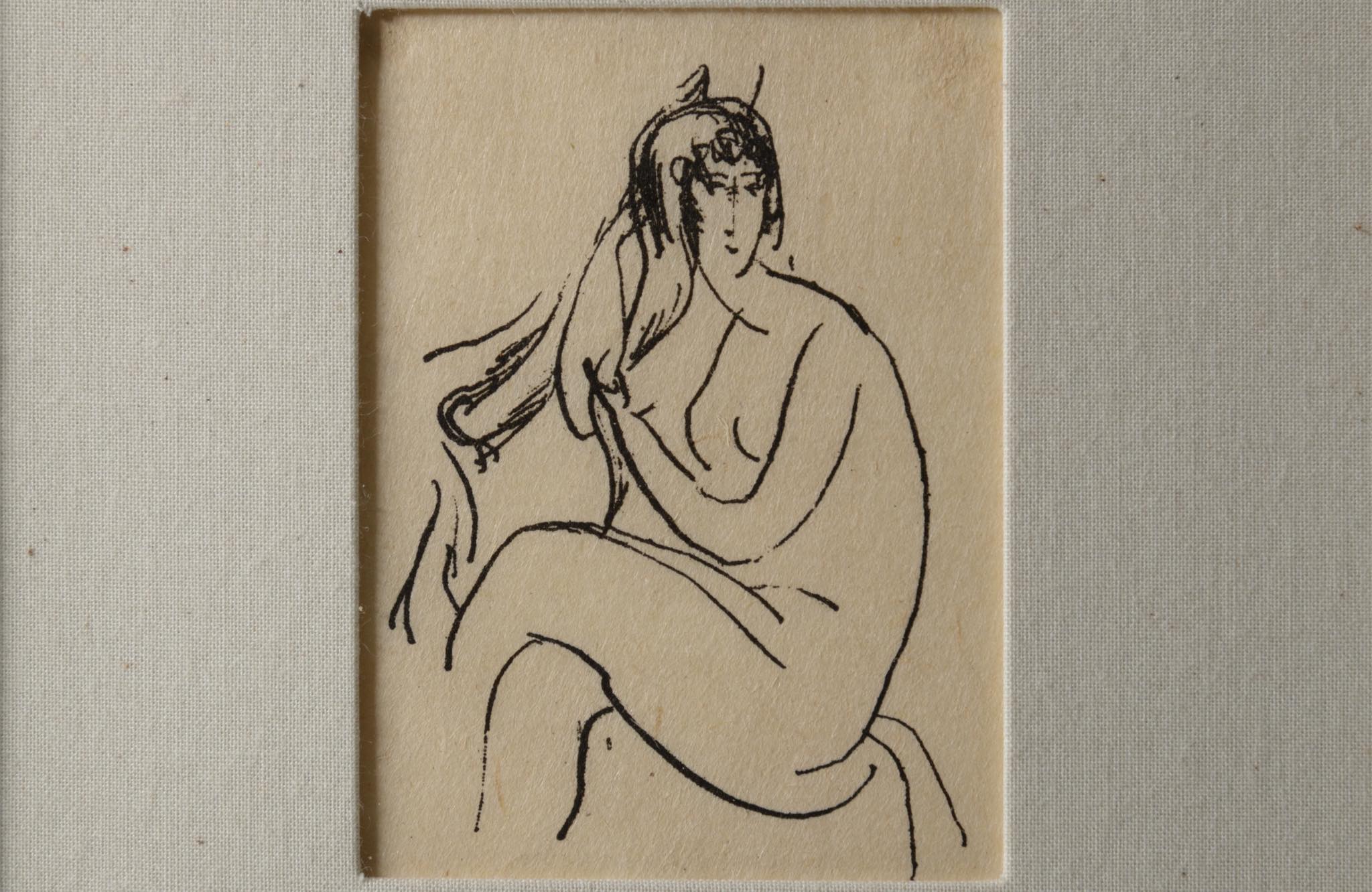 デンマークを代表する芸術家、Axel Salto/アクセル・サルトによるリトグラフ作品です。紀元前の帝政ローマ時代初期に活躍した詩人オウィディウスによる作品『Elskovskunsten/愛の詩』を、1917年にデンマークの俳優で作家のWalt Rosenberg/ウォルト・ローゼンバーグによって翻訳され、アクセル・サルトが挿絵を担当し発刊された詩集『OVID Elskovskunsten』から抽出されたリトグラフです。詩のシーン事に挿絵されたもののようで、サルトによる独特の筆致が見所です。詩集のエディションは13/350冊、リトグラフのサインとエディションスタンプは本扉に集約されているため作品には備わりませんが、背面にコピーをお付けします。木製のフレームと布被せのマットにて新たに額装しました。