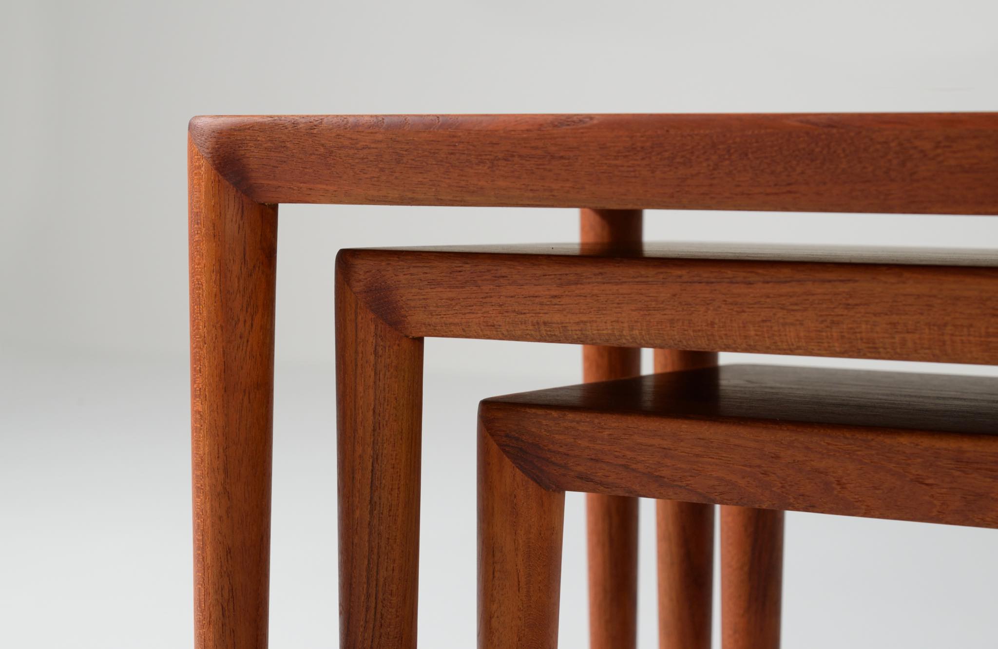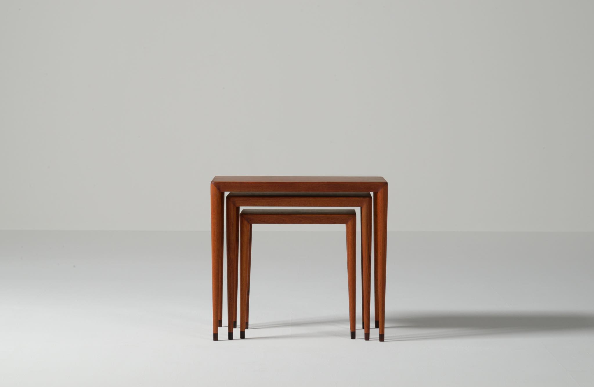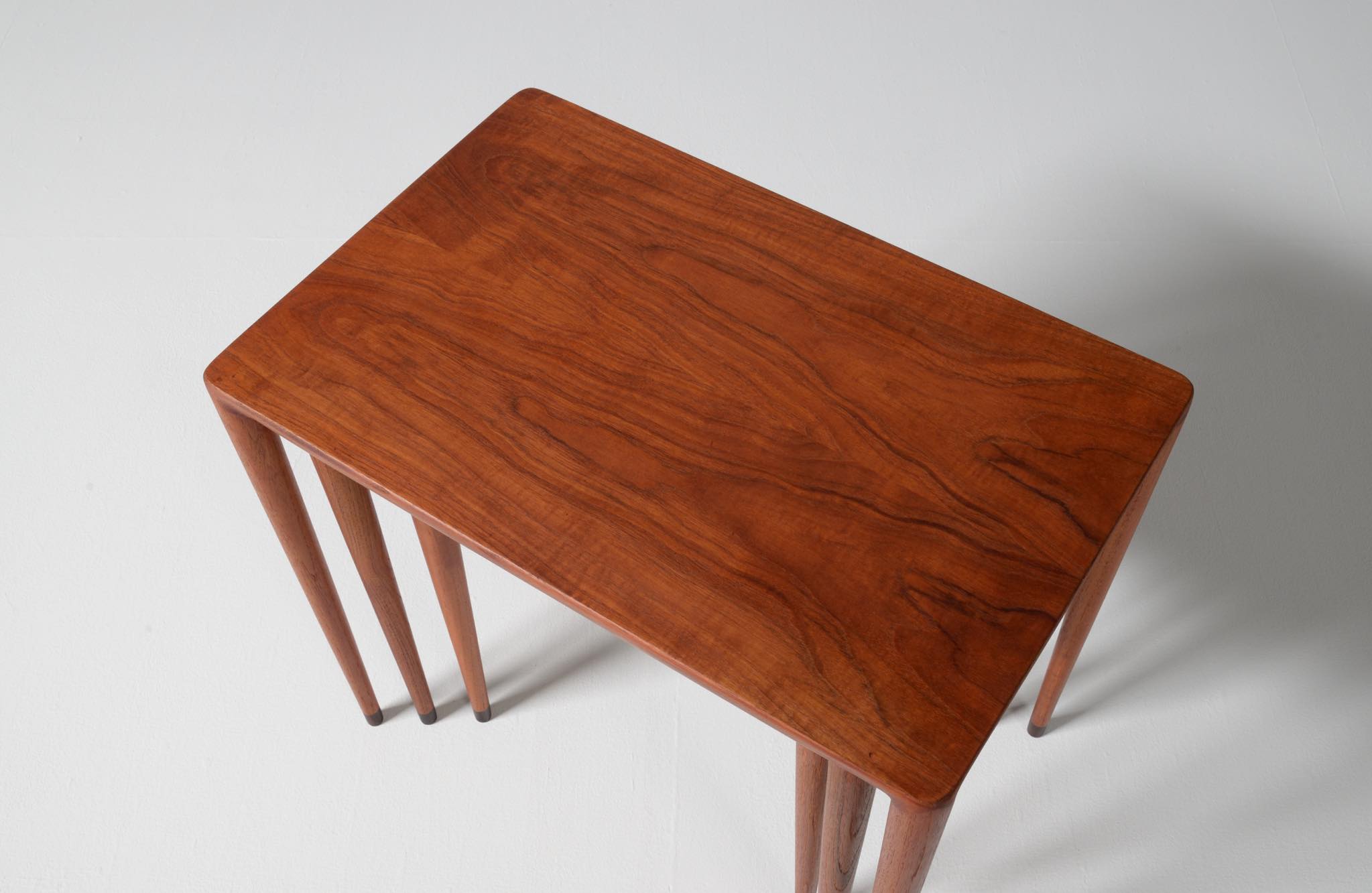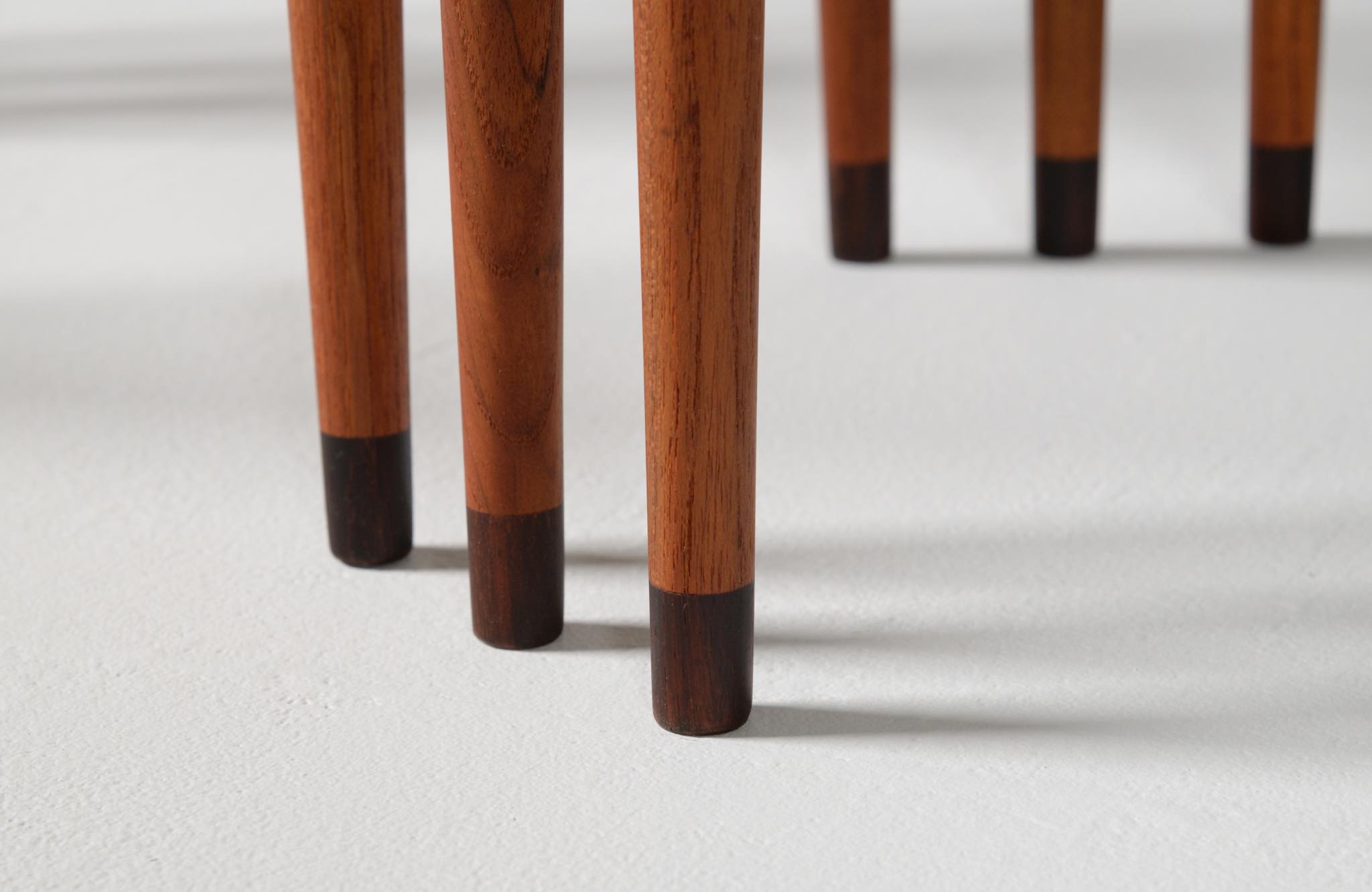 デンマークのデザイナー、Erik Riisager Hansen/エリック・リサガー・ハンセンによるネストテーブルです。ネストテーブルとは、入れ子になるサイドテーブルの総称で、19世紀初頭には主に女性用の家具として英国のリビングルームで用いられていたようです。必要に応じてテーブルを引き出し、ソファやイージーチェアの側に置いて使用します。こちらのネストテーブルはチーク材で作られており、脚先にはローズウッドのシューズを履いています。コンディションは良好です。