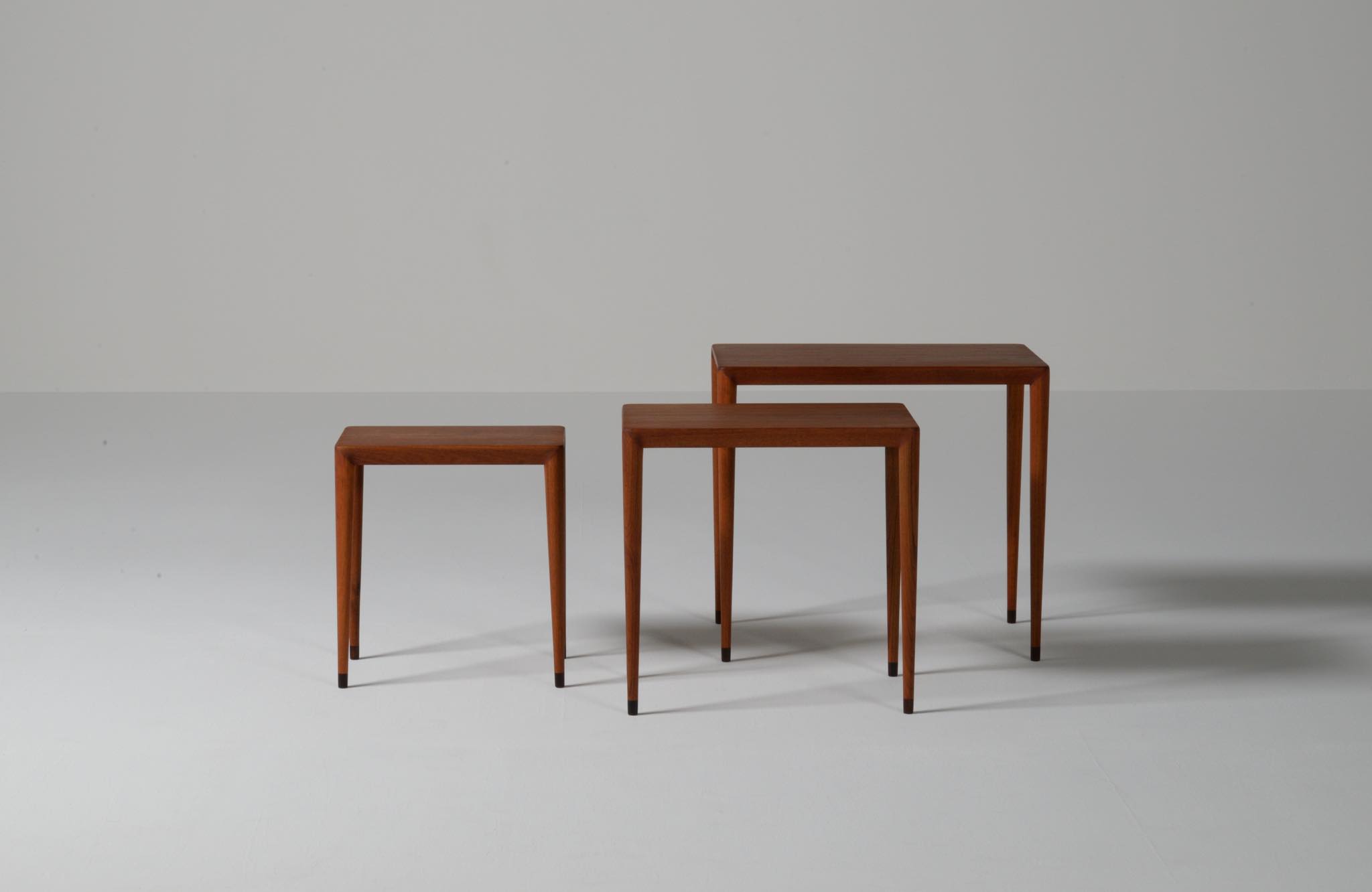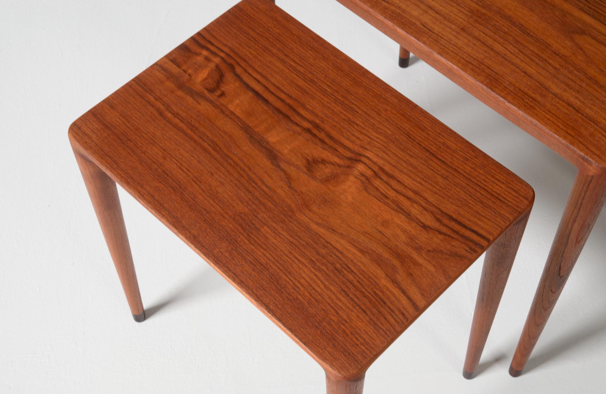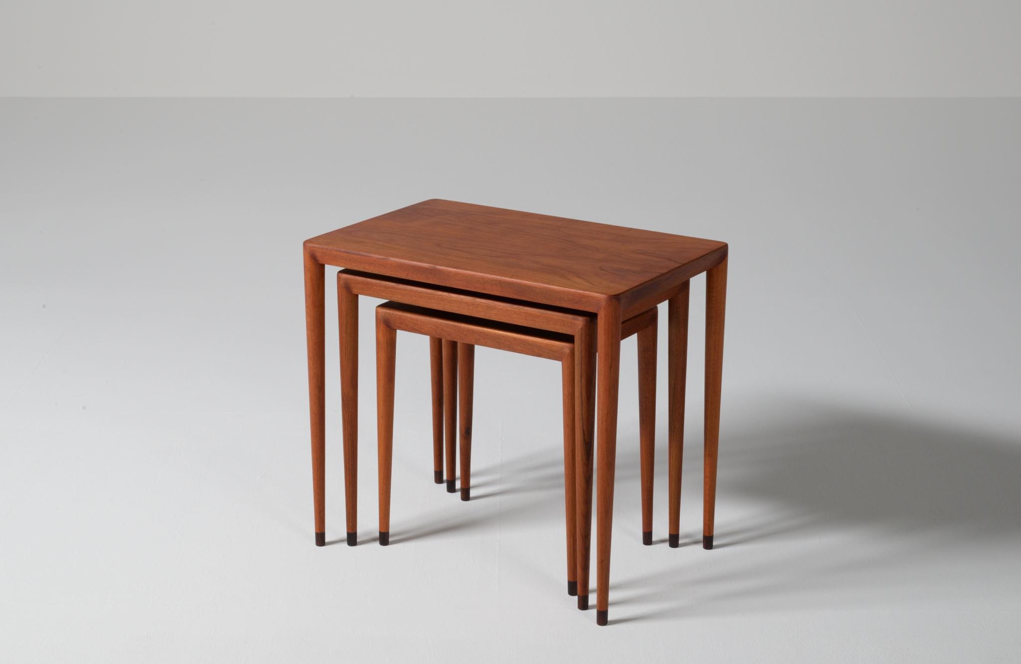 デンマークのデザイナー、Erik Riisager Hansen/エリック・リサガー・ハンセンによるネストテーブルです。ネストテーブルとは、入れ子になるサイドテーブルの総称で、19世紀初頭には主に女性用の家具として英国のリビングルームで用いられていたようです。必要に応じてテーブルを引き出し、ソファやイージーチェアの側に置いて使用します。こちらのネストテーブルはチーク材で作られており、脚先にはローズウッドのシューズを履いています。コンディションは良好です。