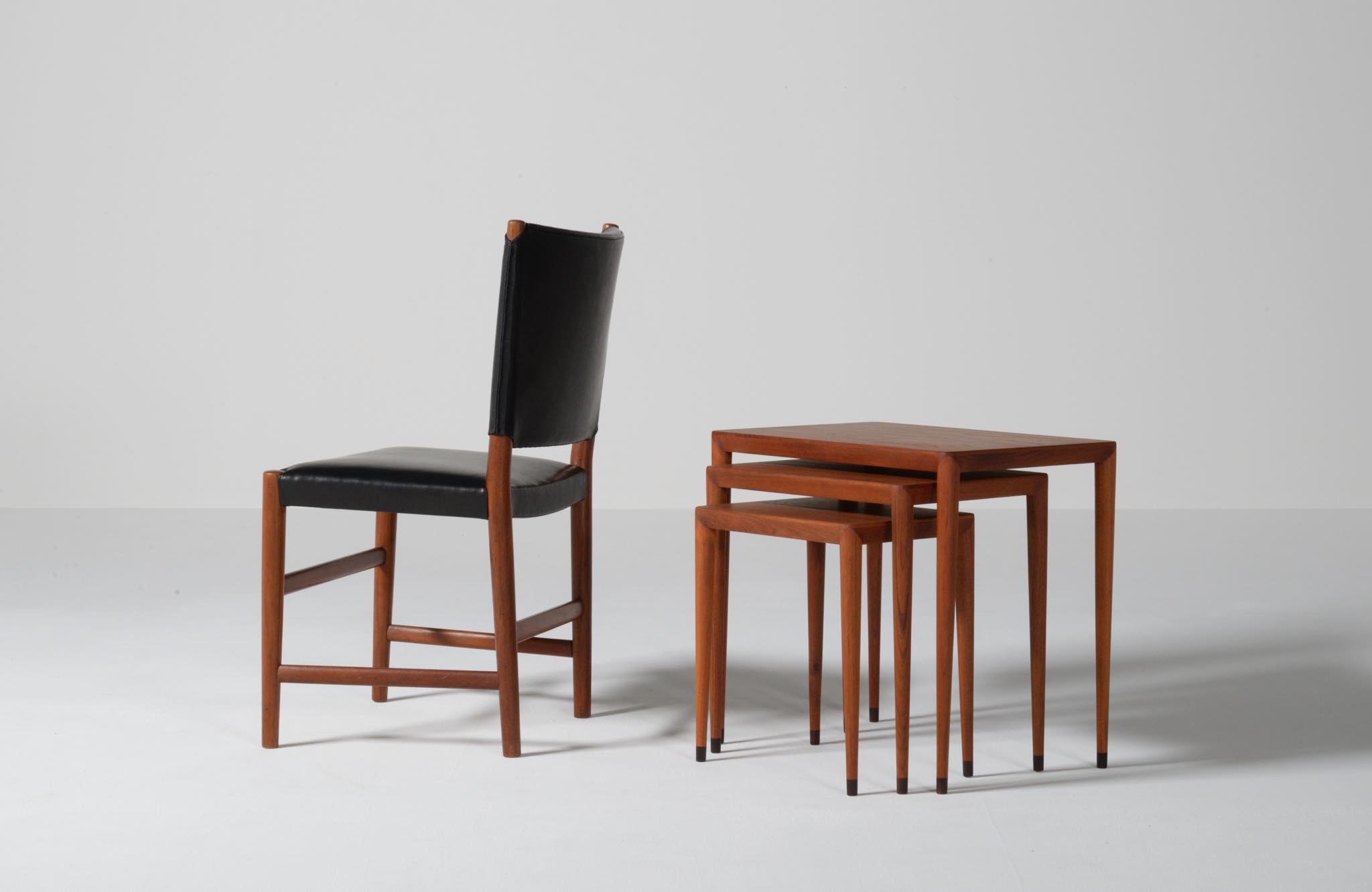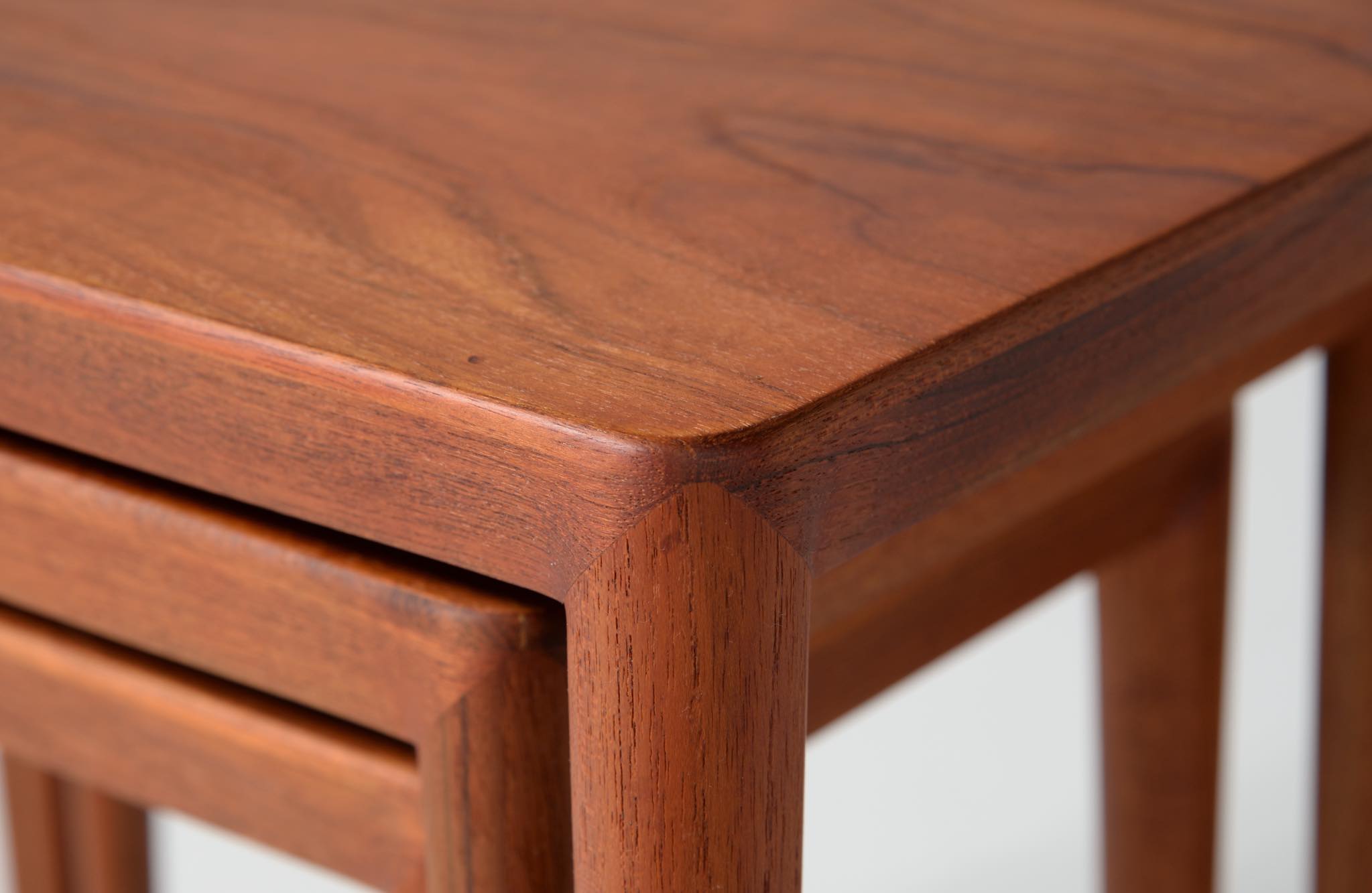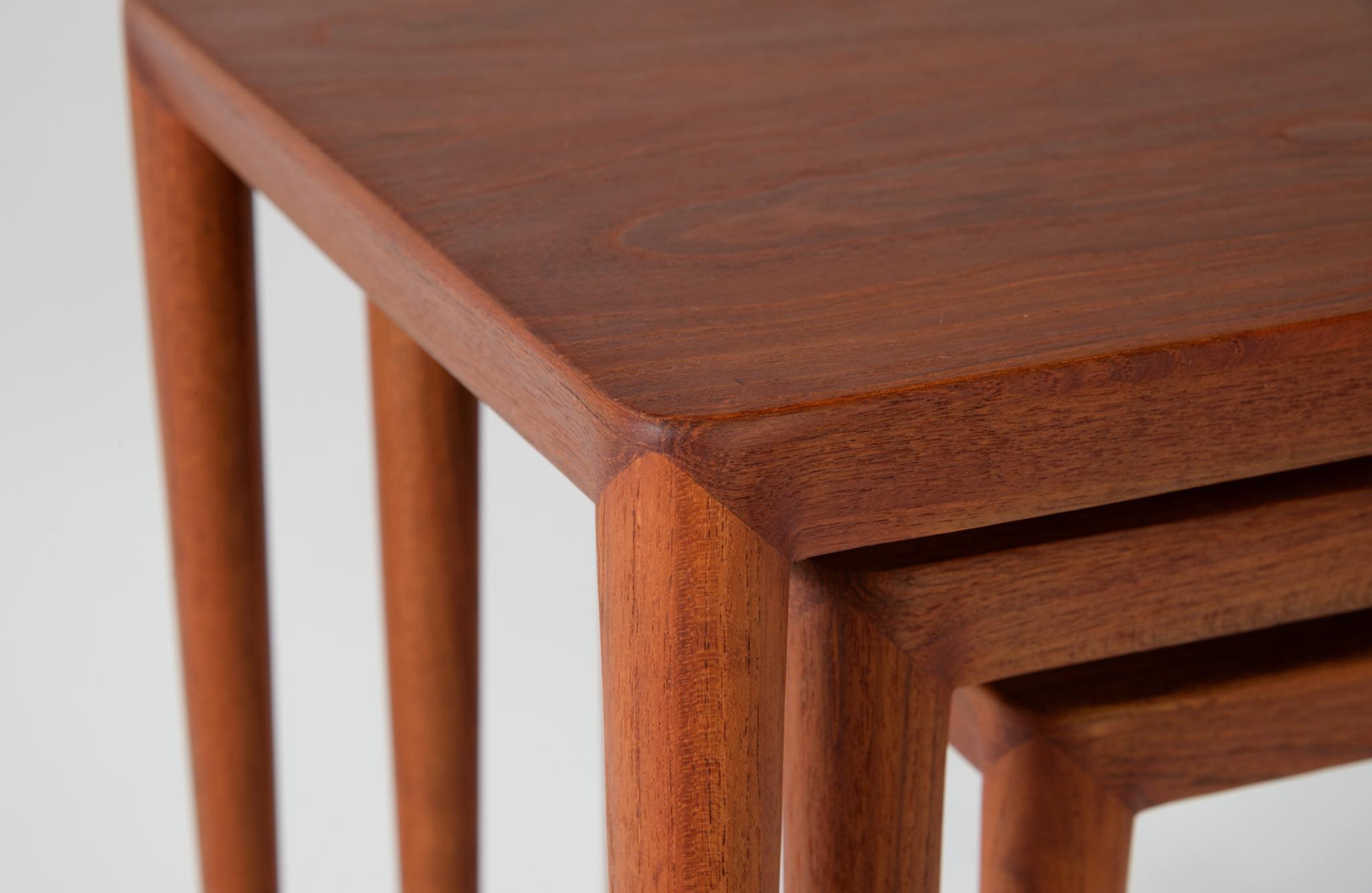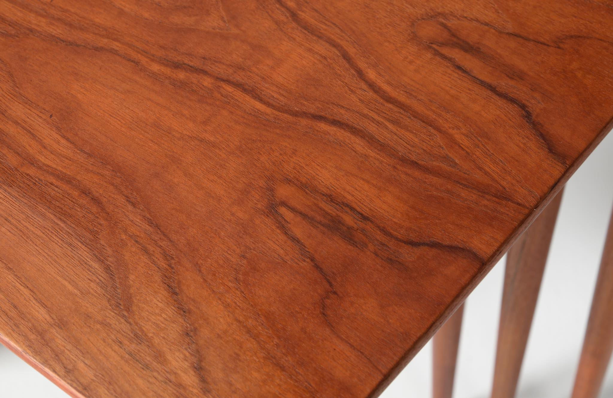 デンマークのデザイナー、Erik Riisager Hansen/エリック・リサガー・ハンセンによるネストテーブルです。ネストテーブルとは、入れ子になるサイドテーブルの総称で、19世紀初頭には主に女性用の家具として英国のリビングルームで用いられていたようです。必要に応じてテーブルを引き出し、ソファやイージーチェアの側に置いて使用します。こちらのネストテーブルはチーク材で作られており、脚先にはローズウッドのシューズを履いています。コンディションは良好です。