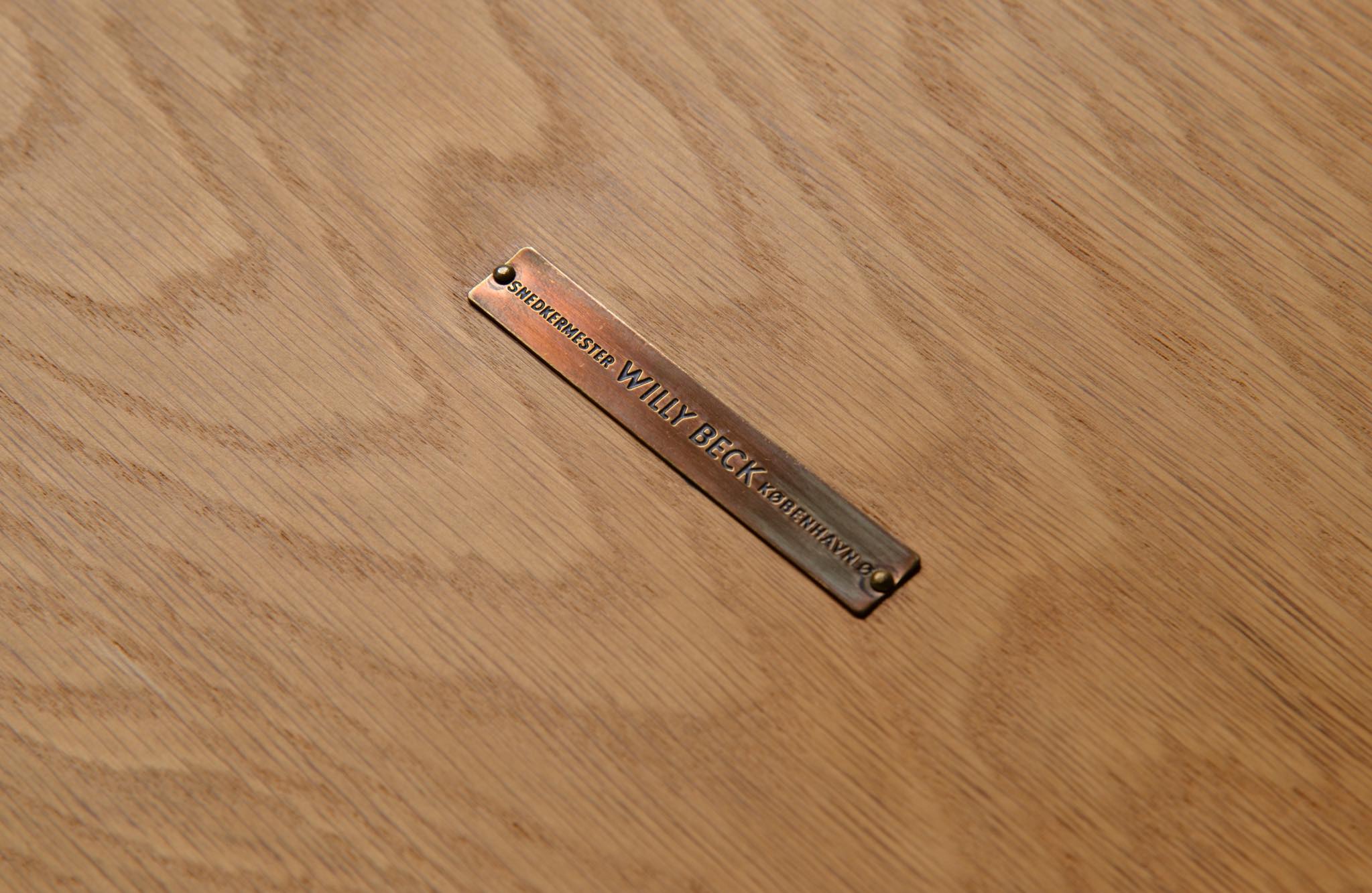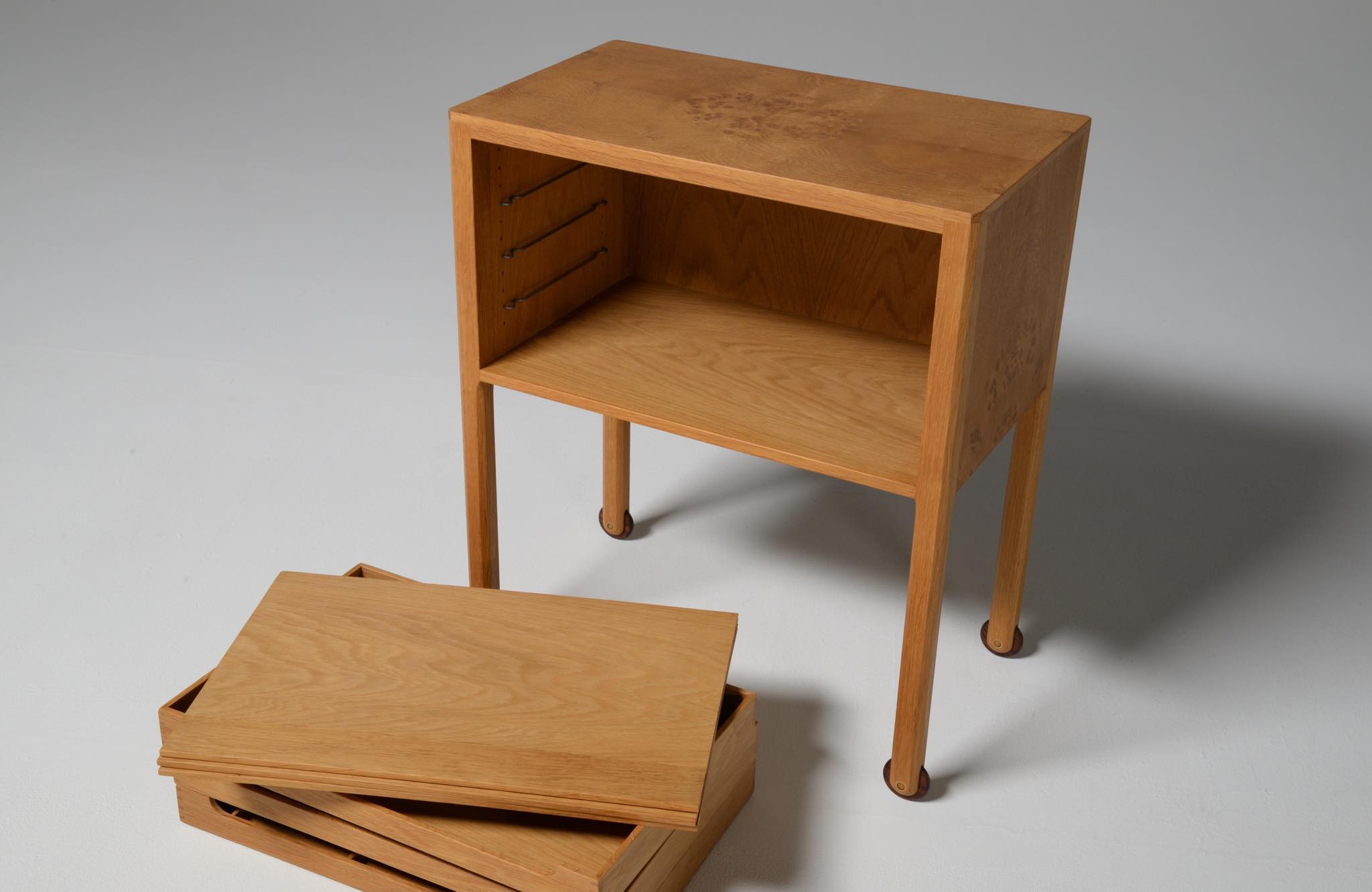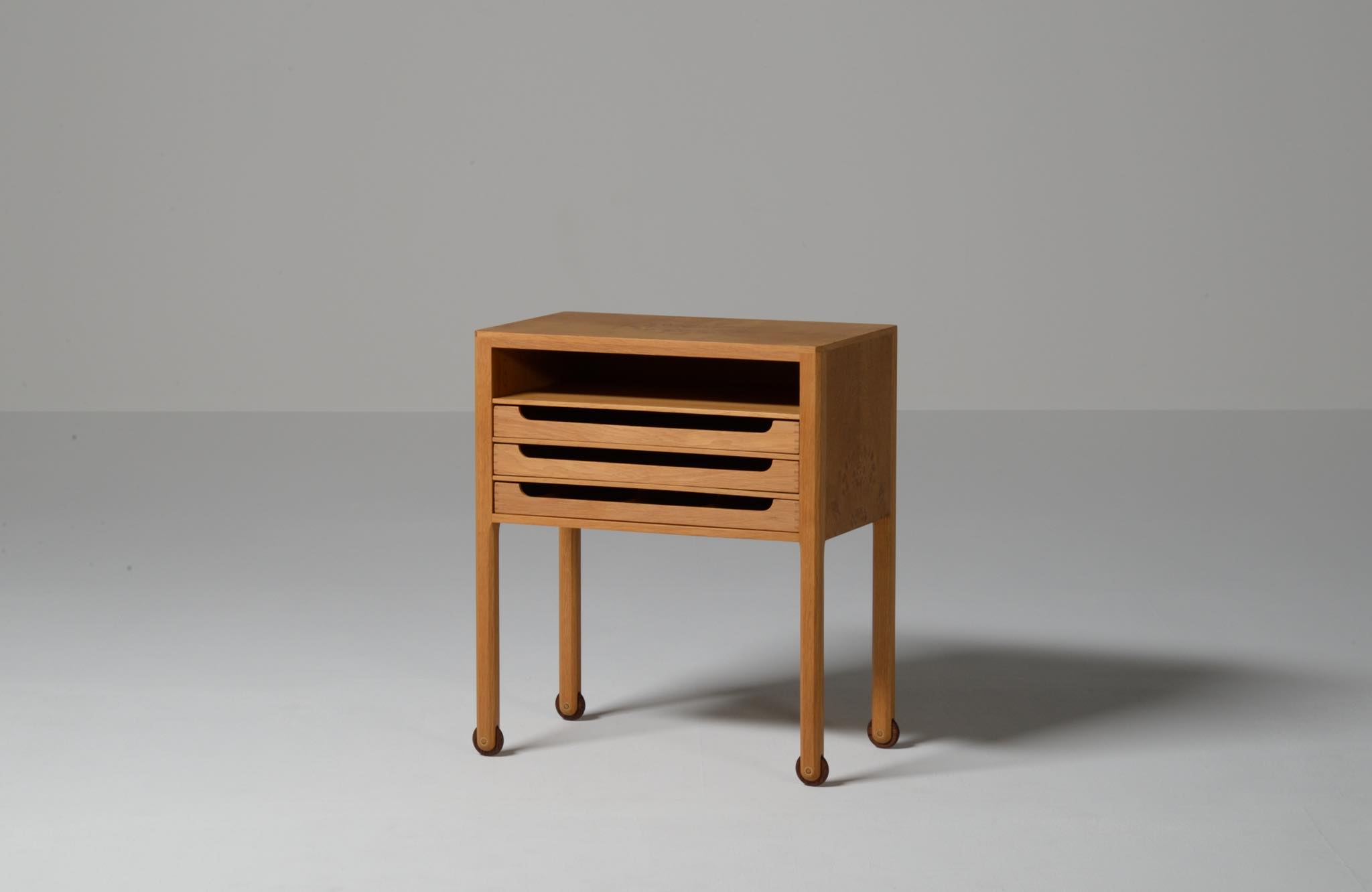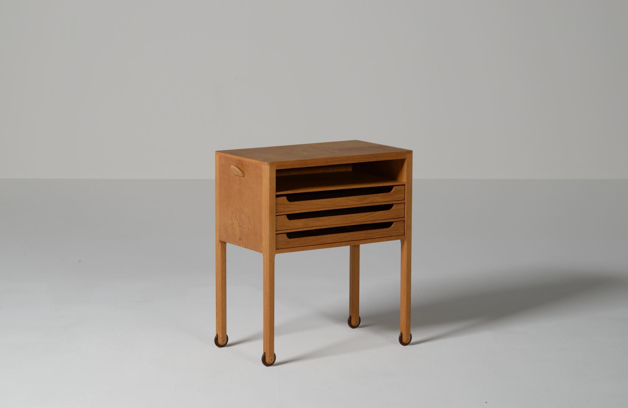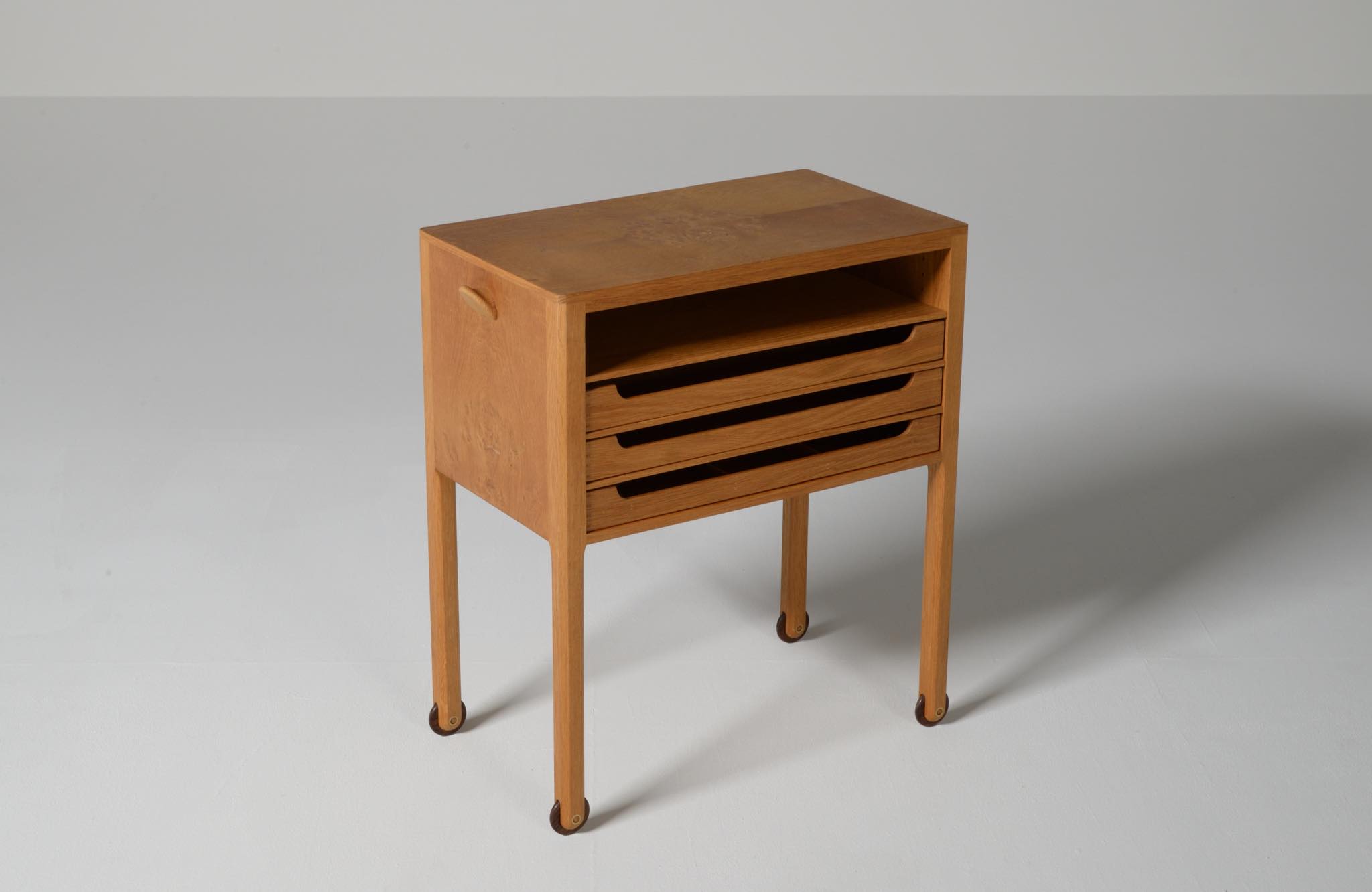 デンマークのキャビネットメーカー、Willy Beck/ウィリー・ベックによるチェストです。18世紀に活躍したデンマークの彫刻家、Bertel Thorvaldsen/ベルテル・トルバルセンのコレクションを集めたThorvaldsens museum/トルバルセン美術館のために極小ロットで作られたもので、非常に精巧に出来ています。本体には玉杢の現れたオーク材の突板を用い、ホイールはローズウッドを三層に挟み、強度を持たせて作られています。引手は片側のみに付けられており、デスクの袖机として考案されたものでしょう。棚板は取り外すことができ、抽斗の数を調整できます。コンディションは良好です。