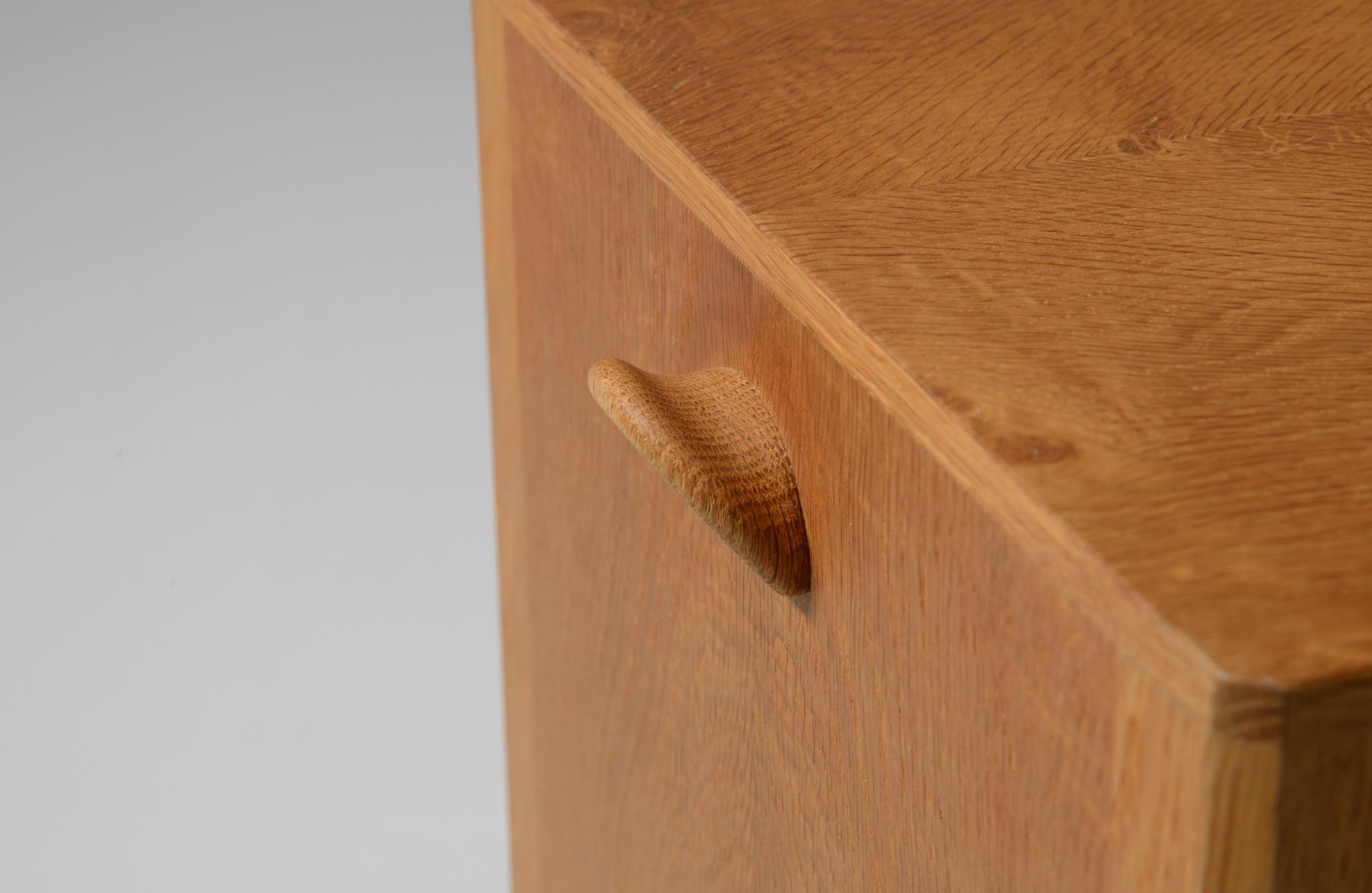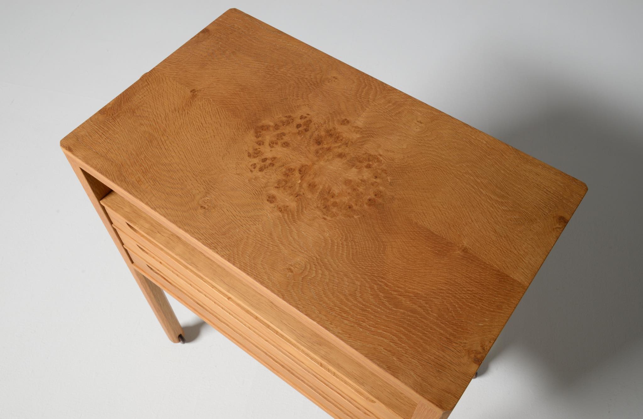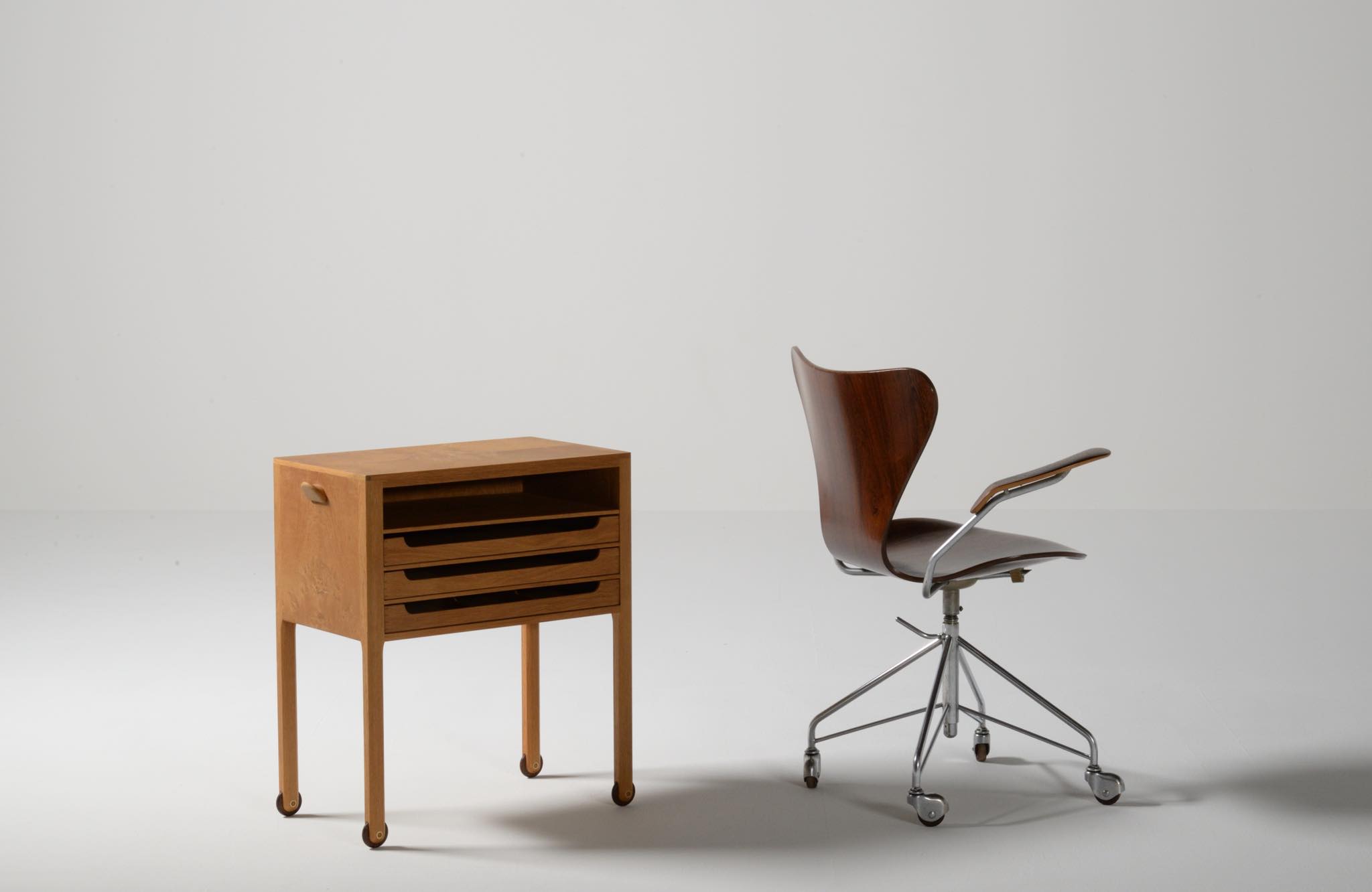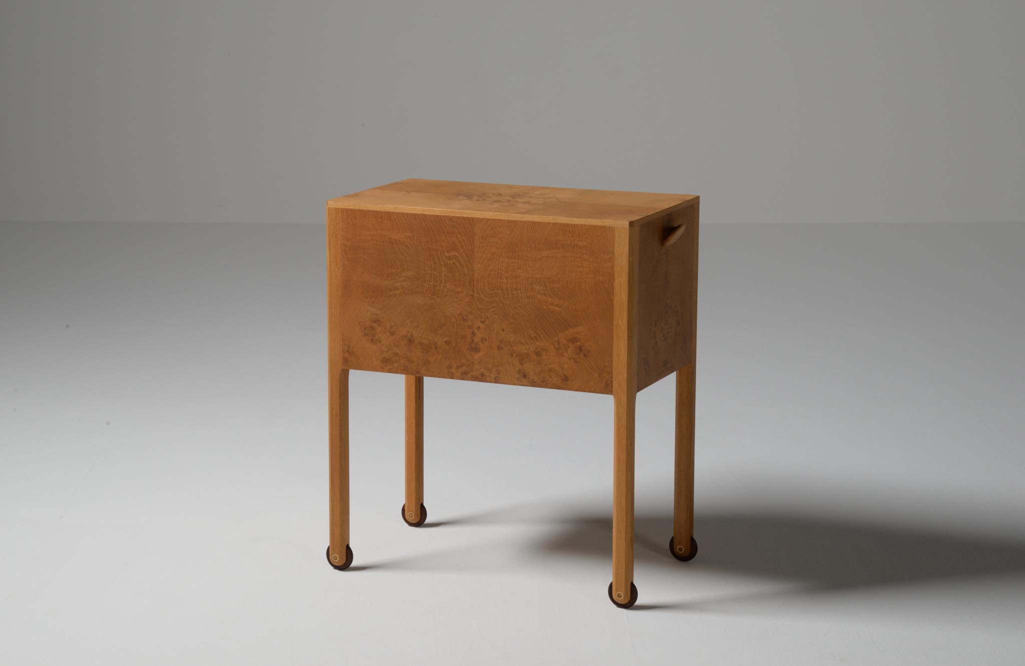 デンマークのキャビネットメーカー、Willy Beck/ウィリー・ベックによるチェストです。18世紀に活躍したデンマークの彫刻家、Bertel Thorvaldsen/ベルテル・トルバルセンのコレクションを集めたThorvaldsens museum/トルバルセン美術館のために極小ロットで作られたもので、非常に精巧に出来ています。本体には玉杢の現れたオーク材の突板を用い、ホイールはローズウッドを三層に挟み、強度を持たせて作られています。引手は片側のみに付けられており、デスクの袖机として考案されたものでしょう。棚板は取り外すことができ、抽斗の数を調整できます。コンディションは良好です。