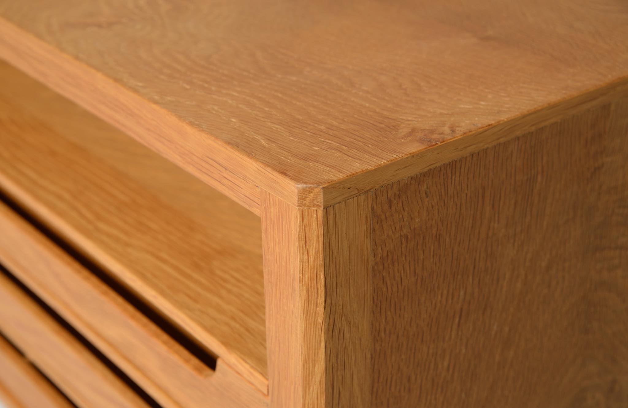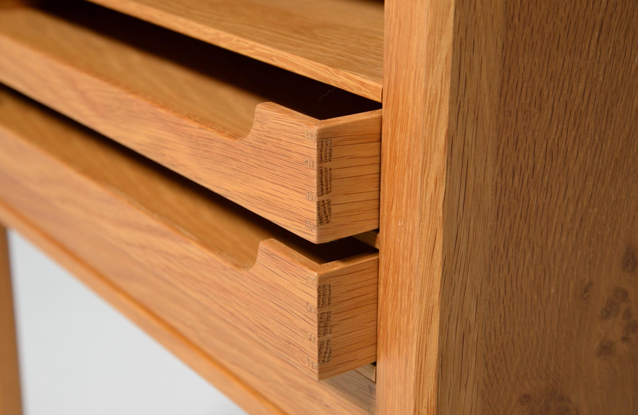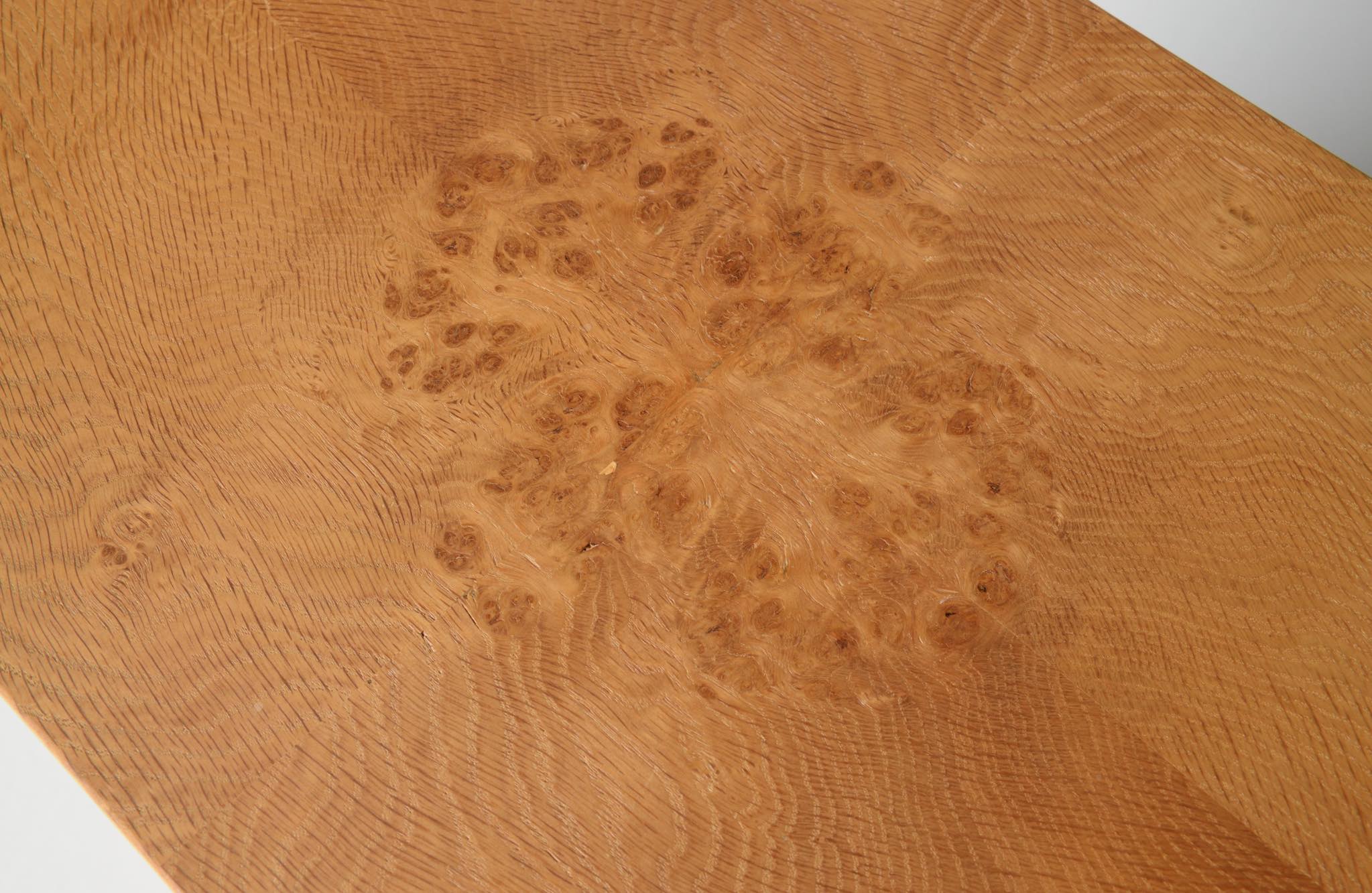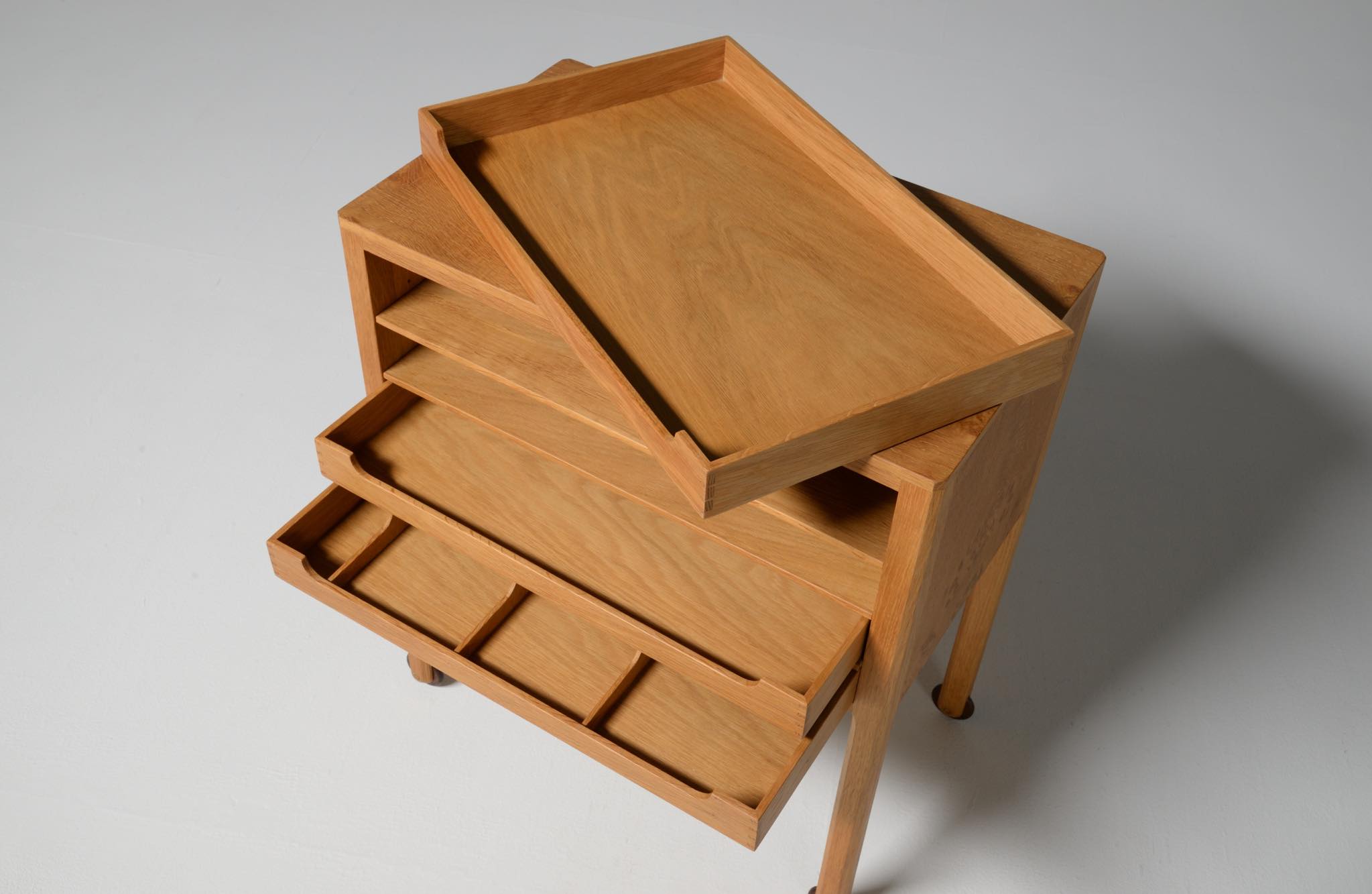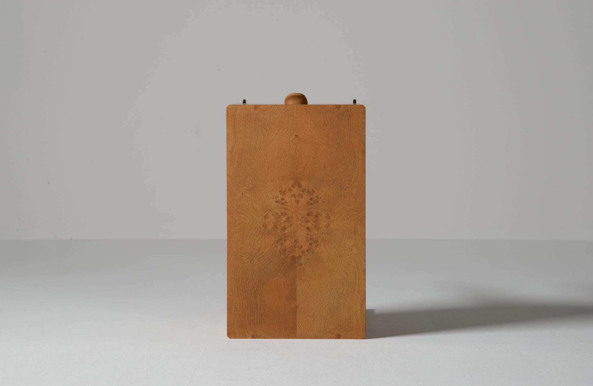 デンマークのキャビネットメーカー、Willy Beck/ウィリー・ベックによるチェストです。18世紀に活躍したデンマークの彫刻家、Bertel Thorvaldsen/ベルテル・トルバルセンのコレクションを集めたThorvaldsens museum/トルバルセン美術館のために極小ロットで作られたもので、非常に精巧に出来ています。本体には玉杢の現れたオーク材の突板を用い、ホイールはローズウッドを三層に挟み、強度を持たせて作られています。引手は片側のみに付けられており、デスクの袖机として考案されたものでしょう。棚板は取り外すことができ、抽斗の数を調整できます。コンディションは良好です。