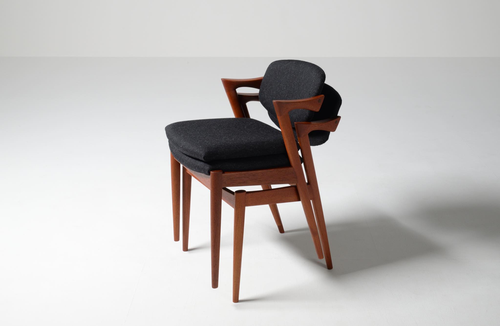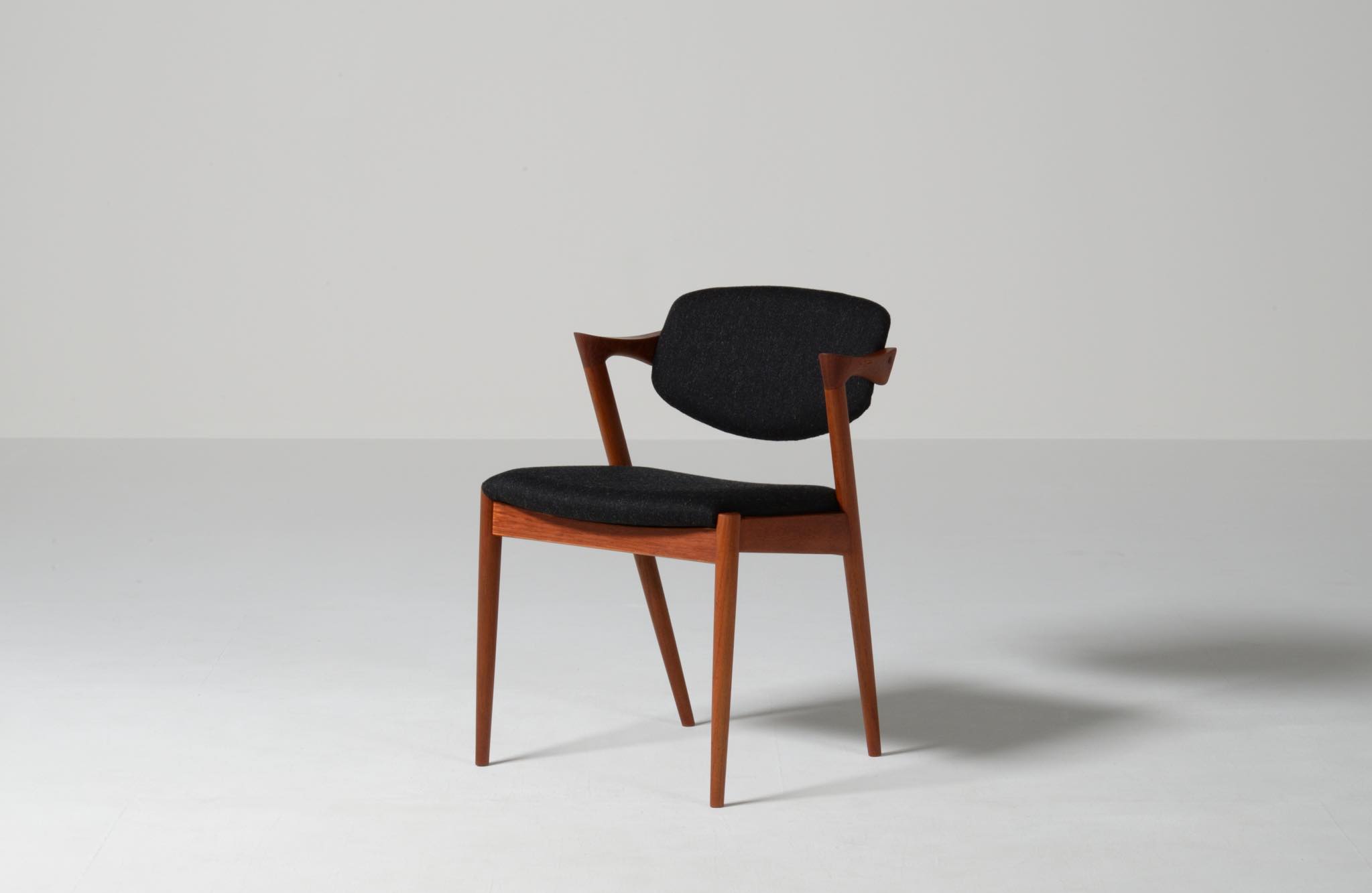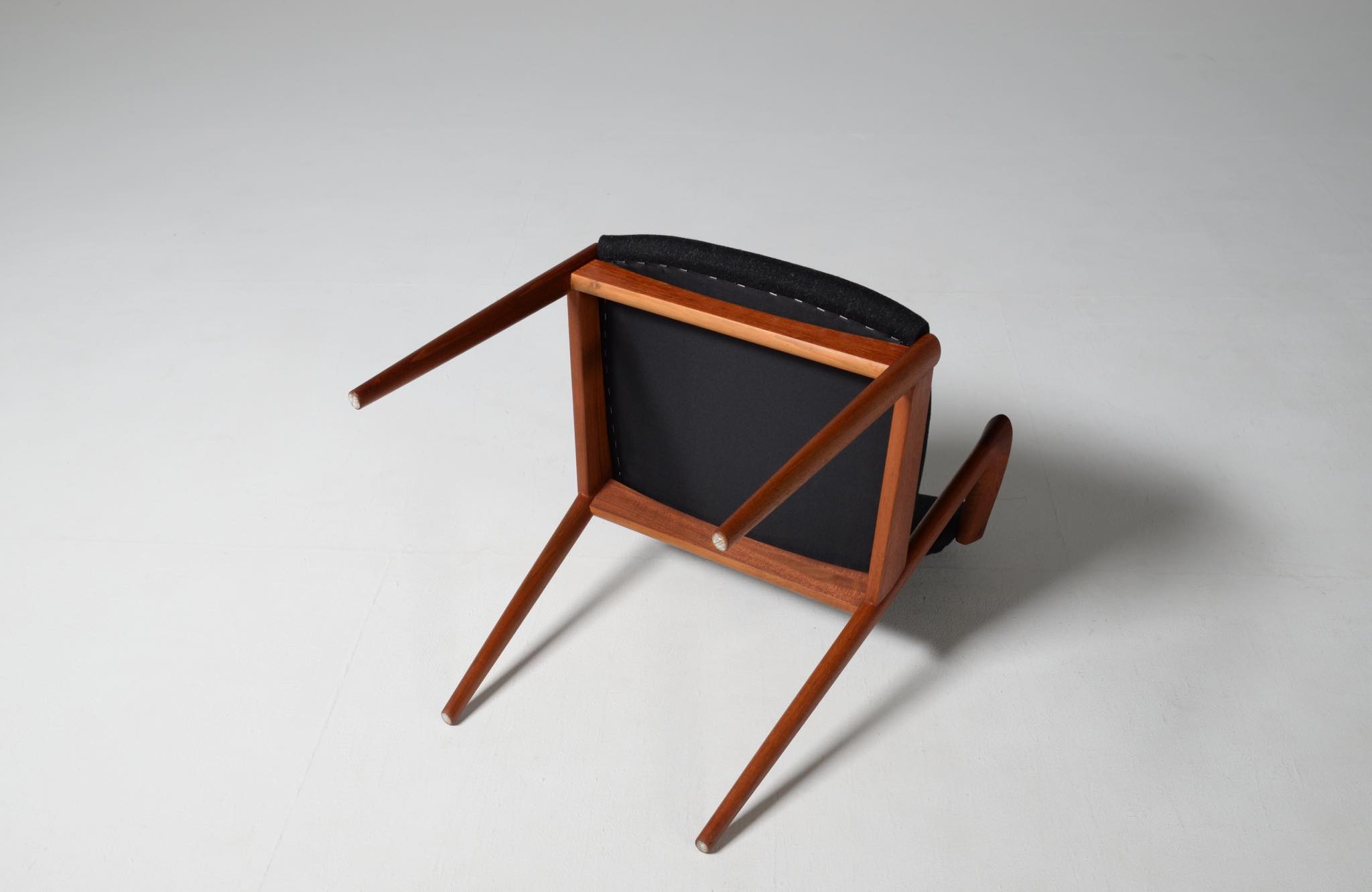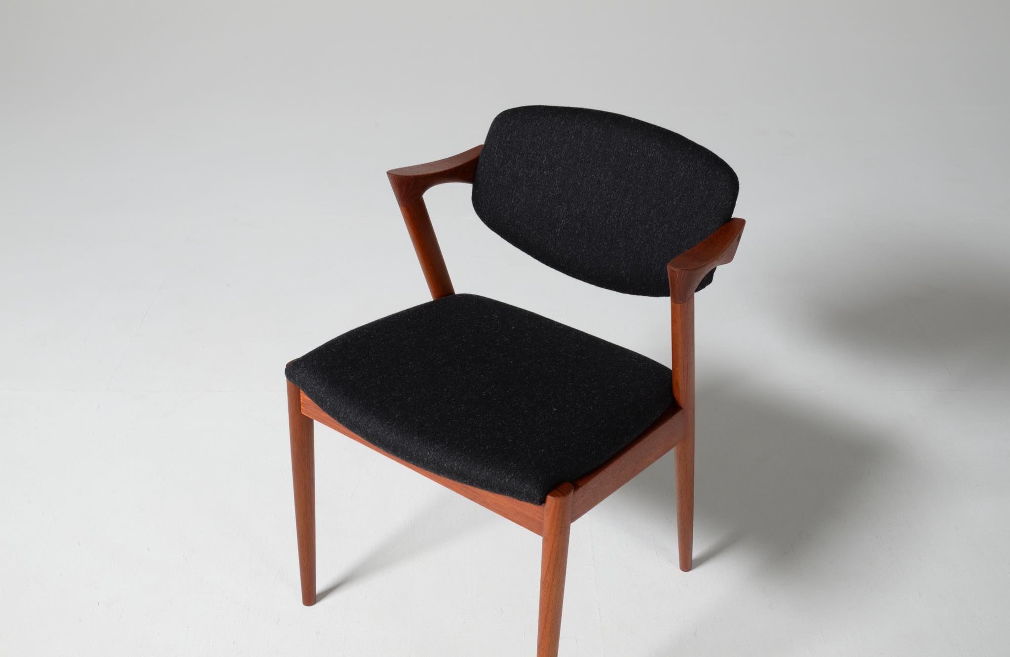 デンマークの家具デザイナー、Kai Kristiansen/カイ・クリスチャンセンによる名作椅子 ”no.42” チーク材のモデルです。着席時の身体の姿勢に合わせて可動する背もたれと、立ち上がりやすいハーフアームが特徴の椅子で、安楽性の高さと、バランスのとれたデザインで人気を博している椅子です。 ファブリックはデンマークのウール生地にて張り替えました。こちらは4脚セットでの販売です。