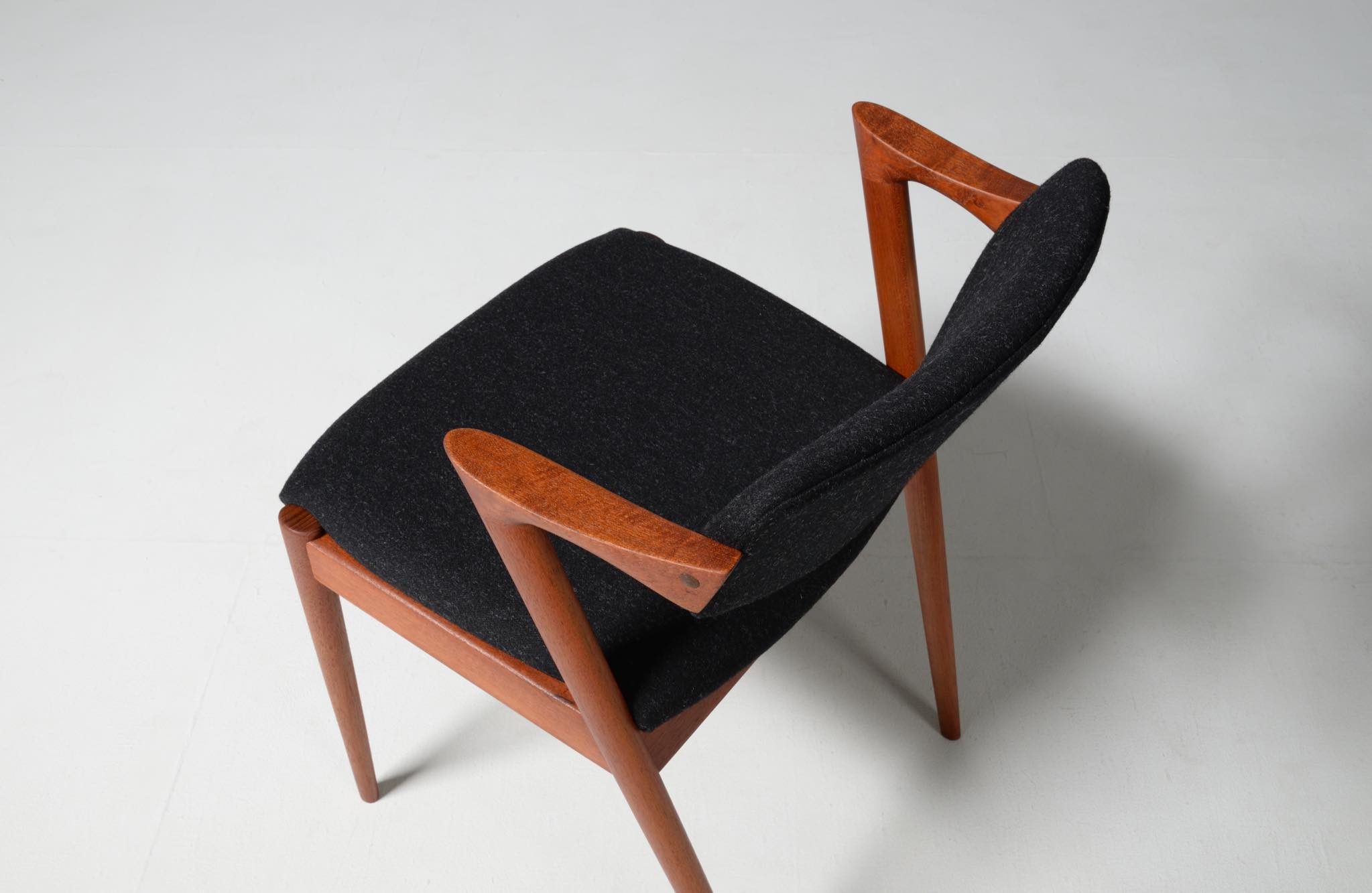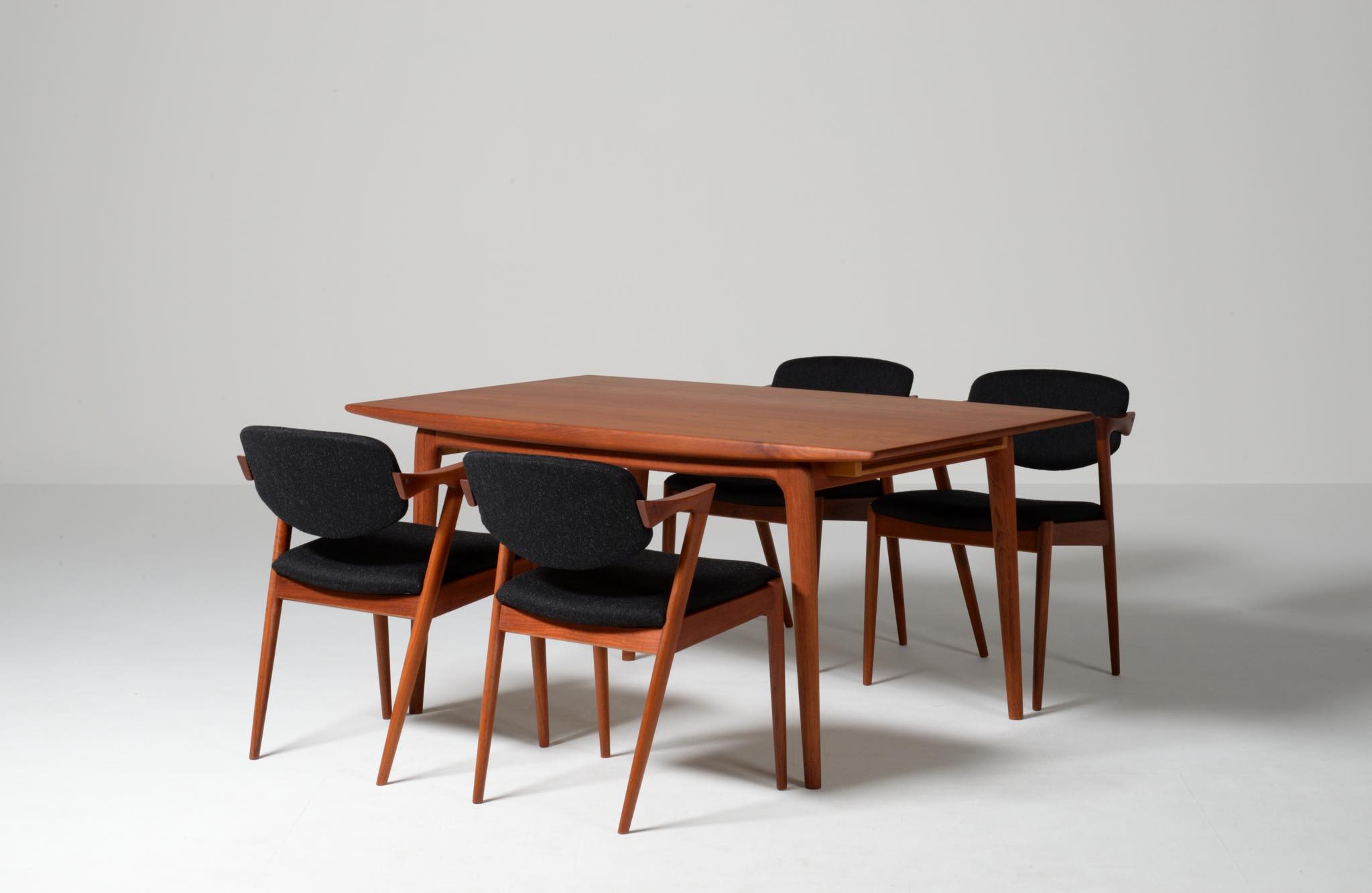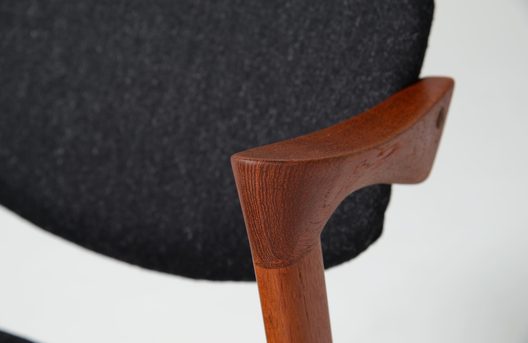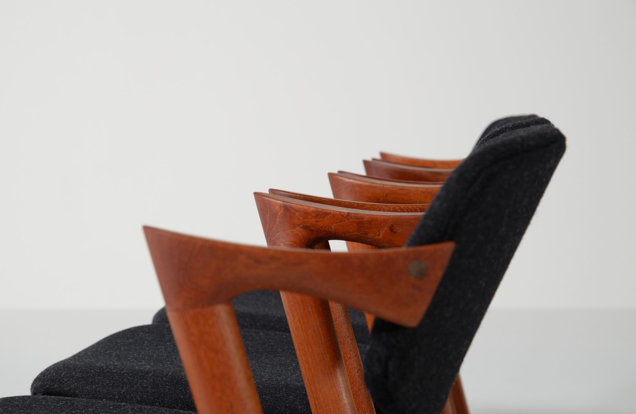 デンマークの家具デザイナー、Kai Kristiansen/カイ・クリスチャンセンによる名作椅子 ”no.42” チーク材のモデルです。着席時の身体の姿勢に合わせて可動する背もたれと、立ち上がりやすいハーフアームが特徴の椅子で、安楽性の高さと、バランスのとれたデザインで人気を博している椅子です。 ファブリックはデンマークのウール生地にて張り替えました。こちらは4脚セットでの販売です。