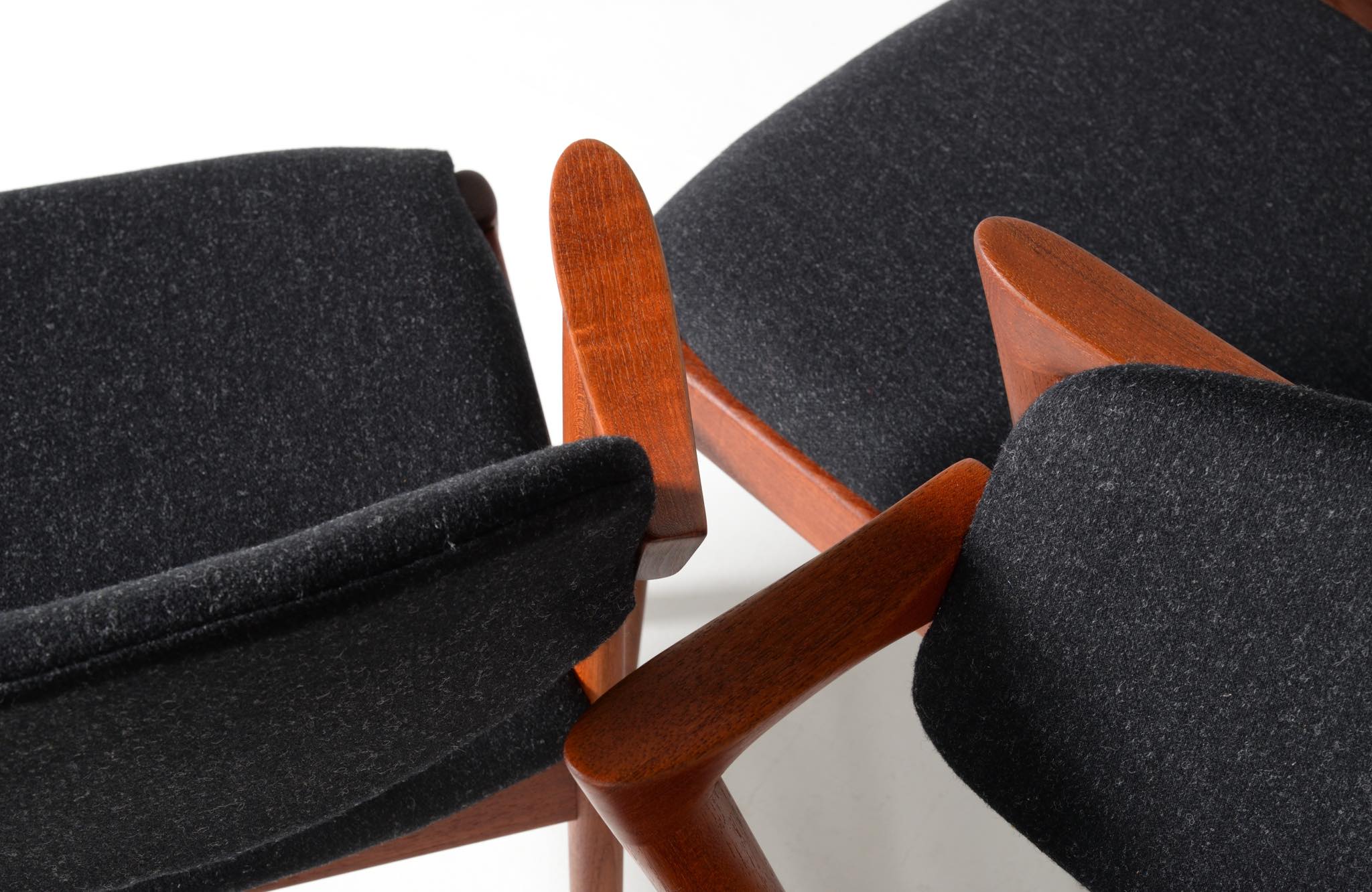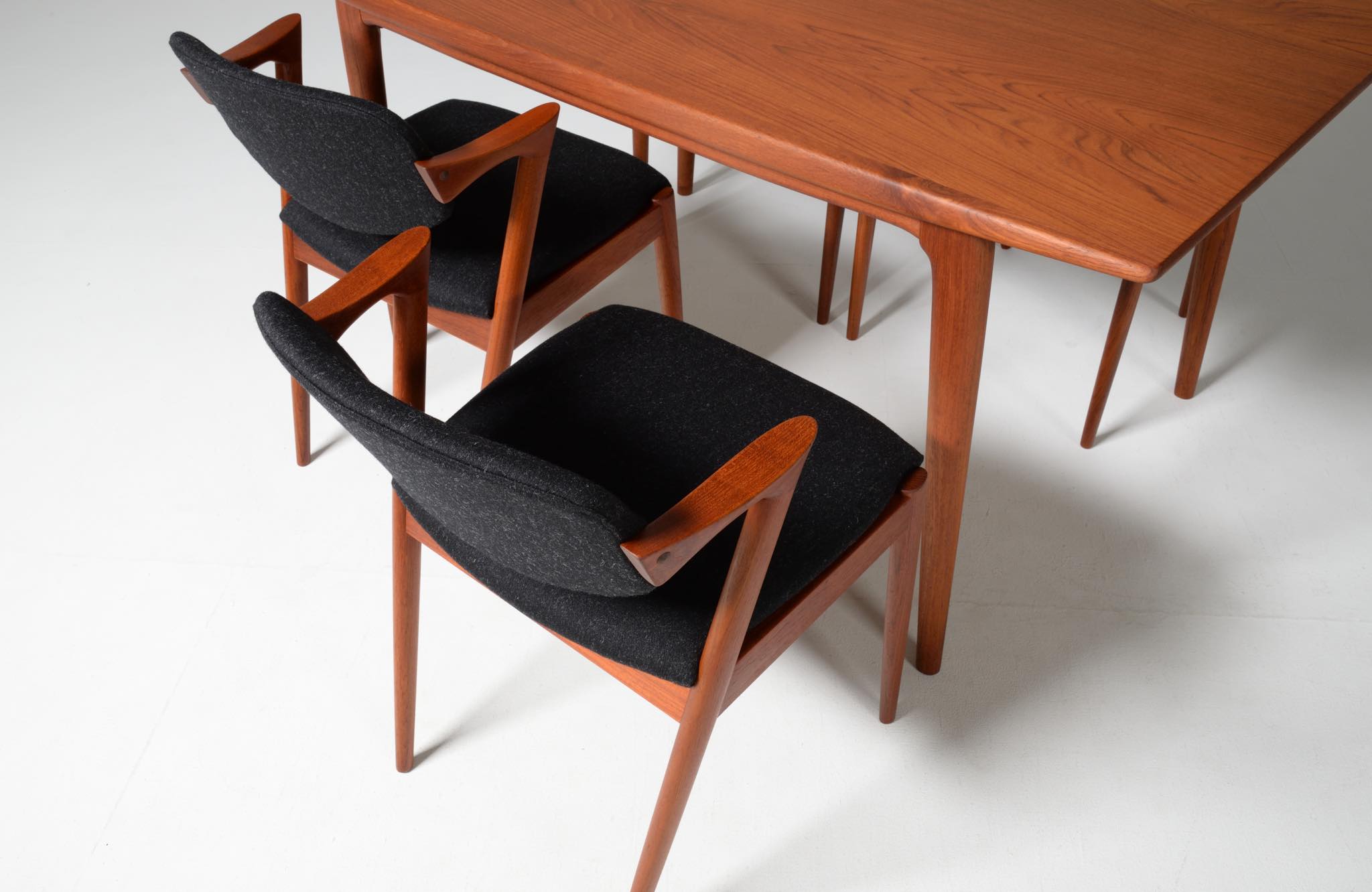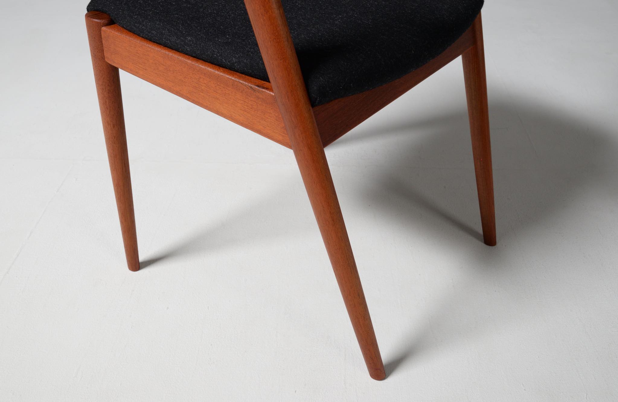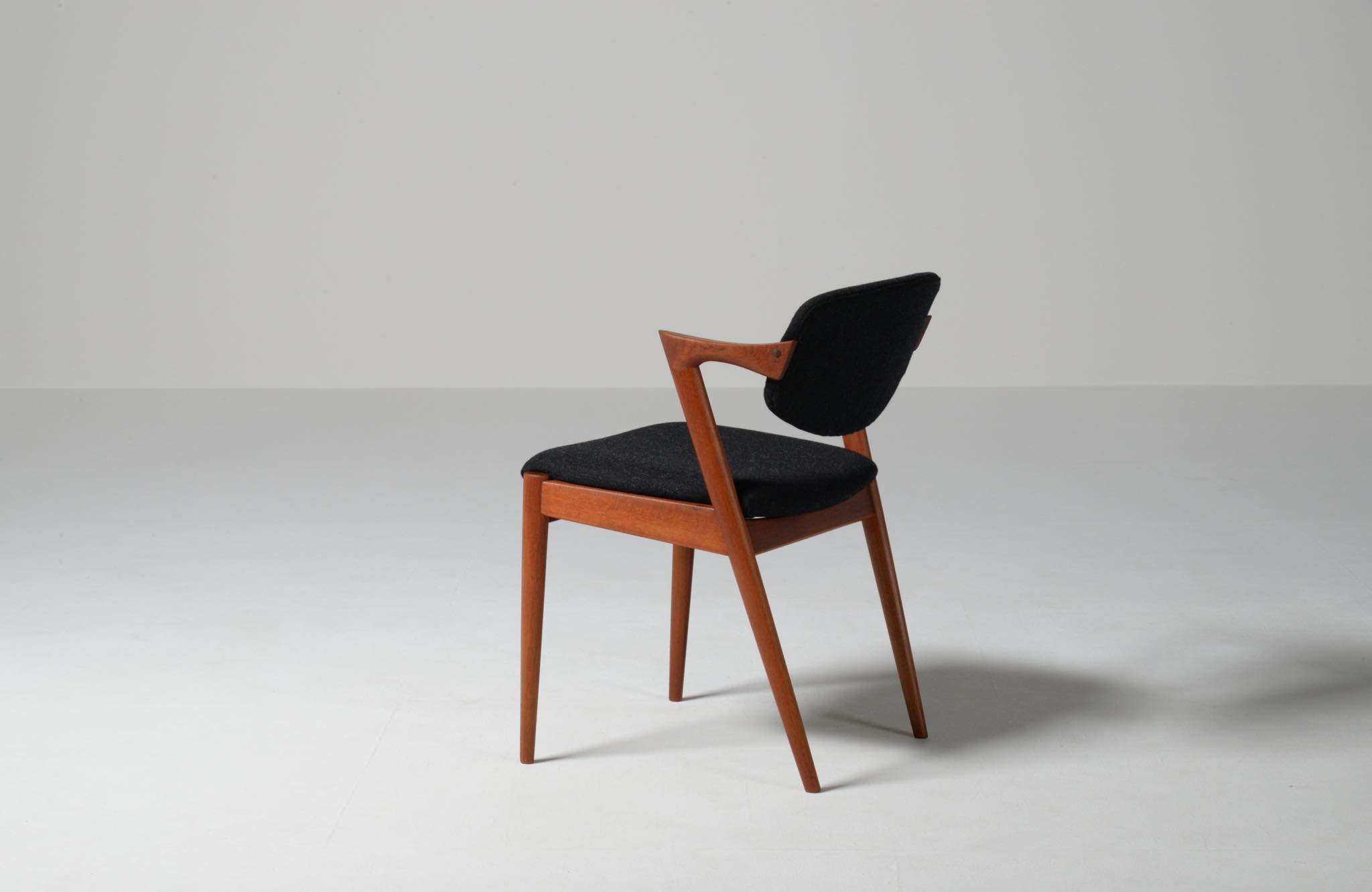 デンマークの家具デザイナー、Kai Kristiansen/カイ・クリスチャンセンによる名作椅子 ”no.42” チーク材のモデルです。着席時の身体の姿勢に合わせて可動する背もたれと、立ち上がりやすいハーフアームが特徴の椅子で、安楽性の高さと、バランスのとれたデザインで人気を博している椅子です。 ファブリックはデンマークのウール生地にて張り替えました。こちらは4脚セットでの販売です。