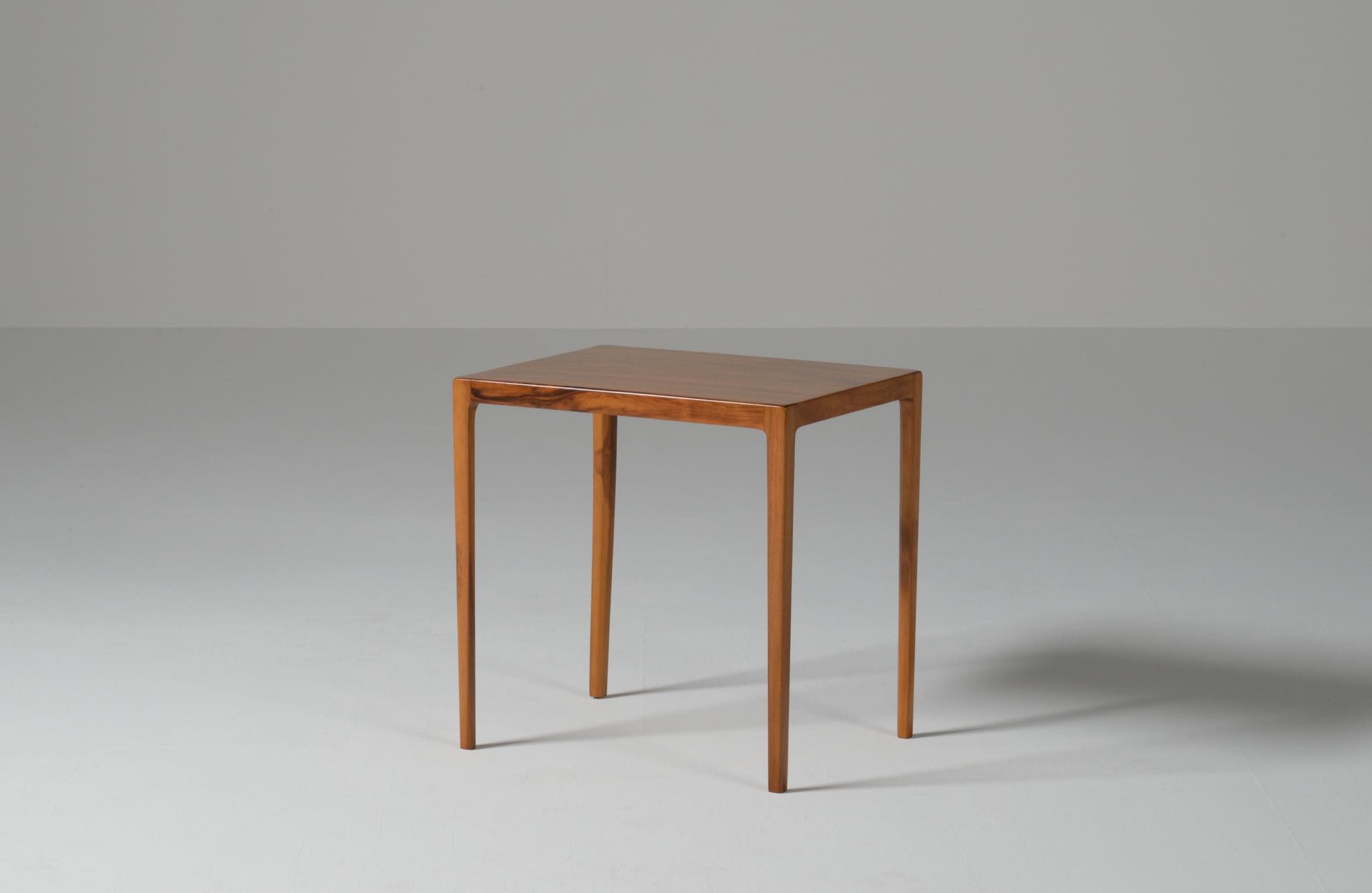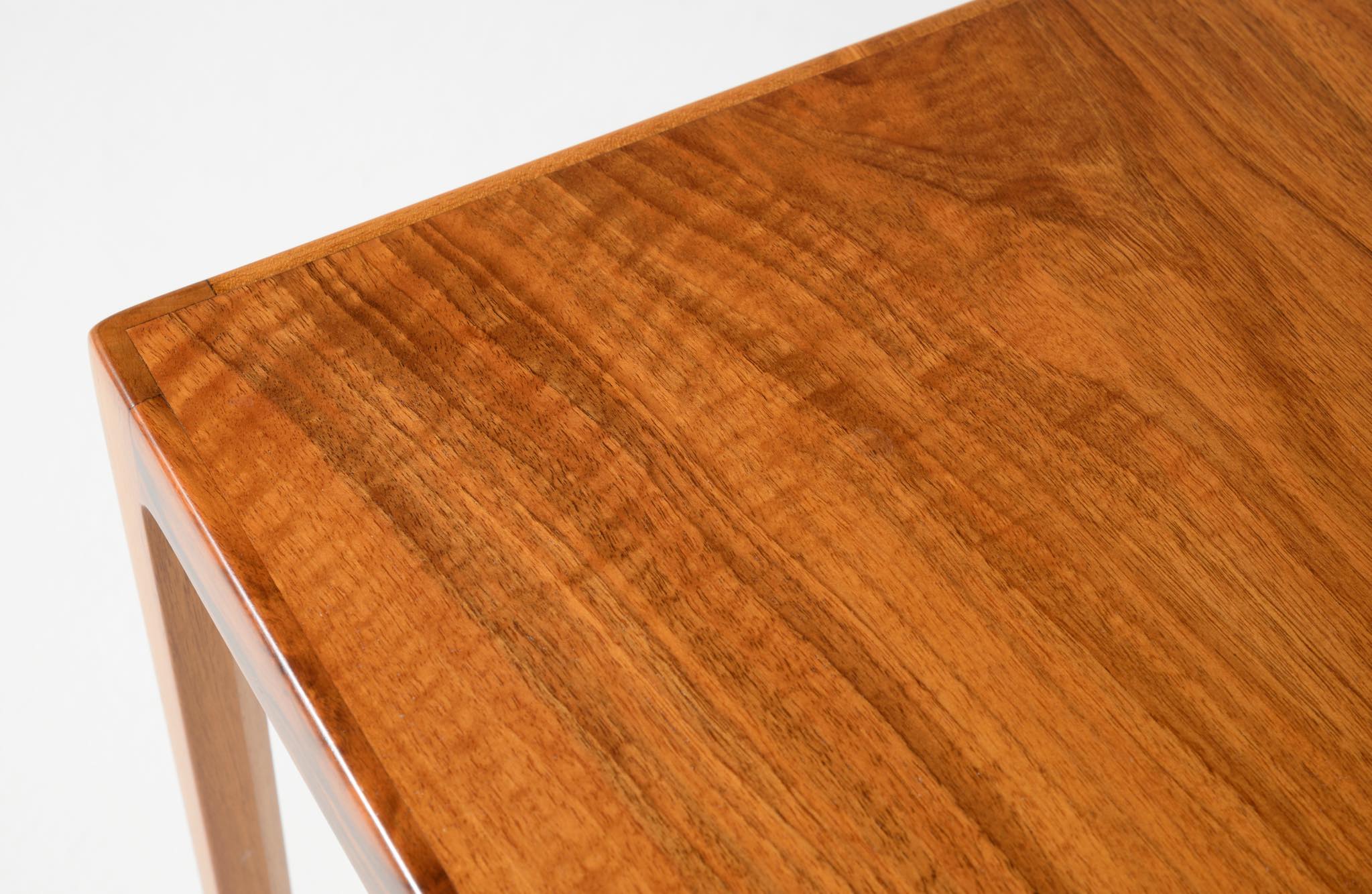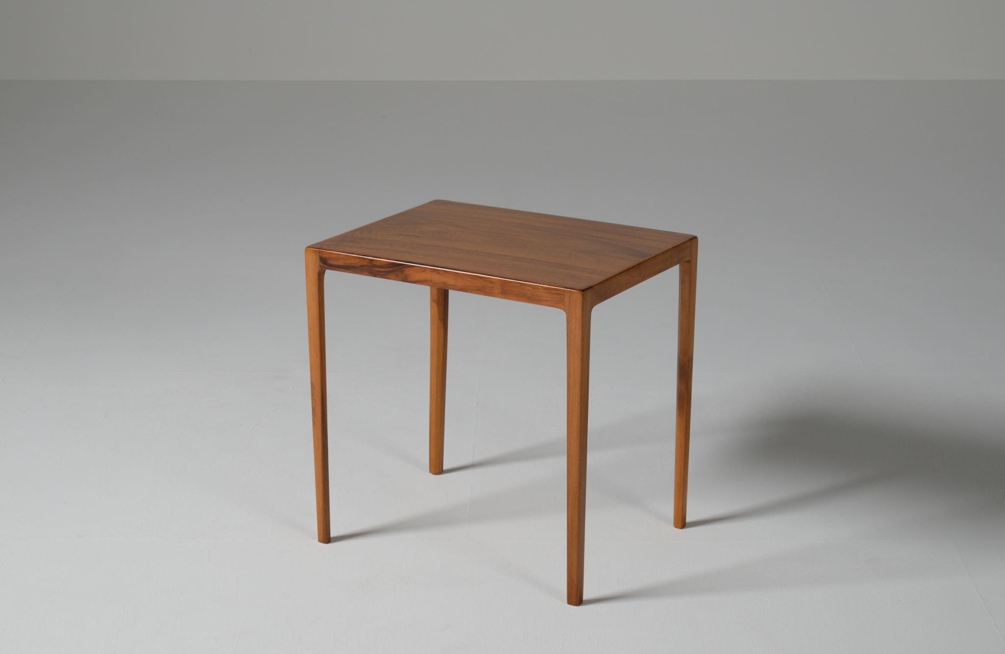 デンマークの名工、Ludvig Pontoppidan /ポントピダン工房のサイドテーブルです。1940年代頃のものと思われ、精巧な作りのものです。素材にはコーカサスウォルナット材が用いられており、特徴的な木目紋様が現れています。経年による脚部に反りが生じていますが、目立たず、脚付きに問題はありません。綺麗な状態です。