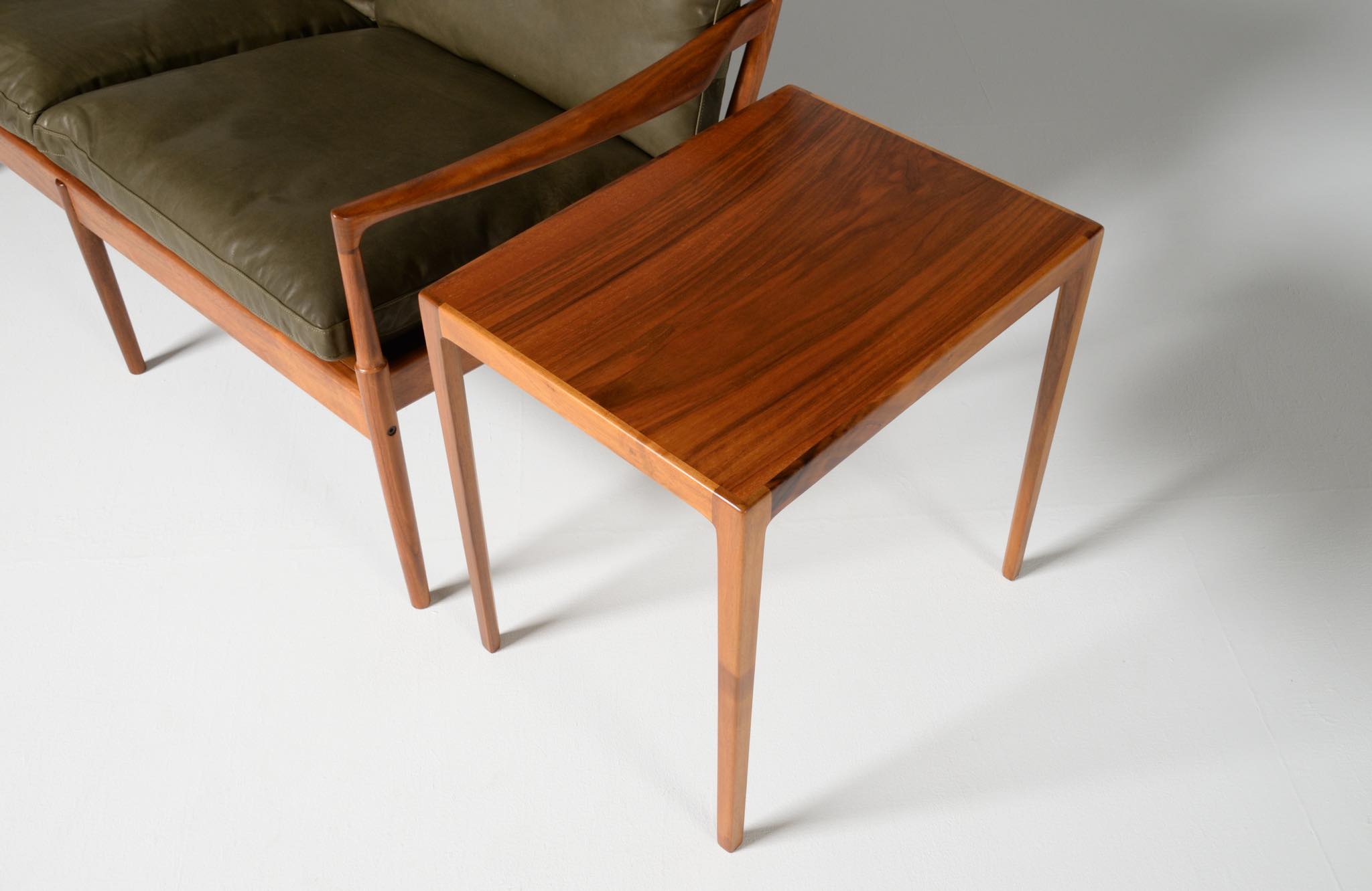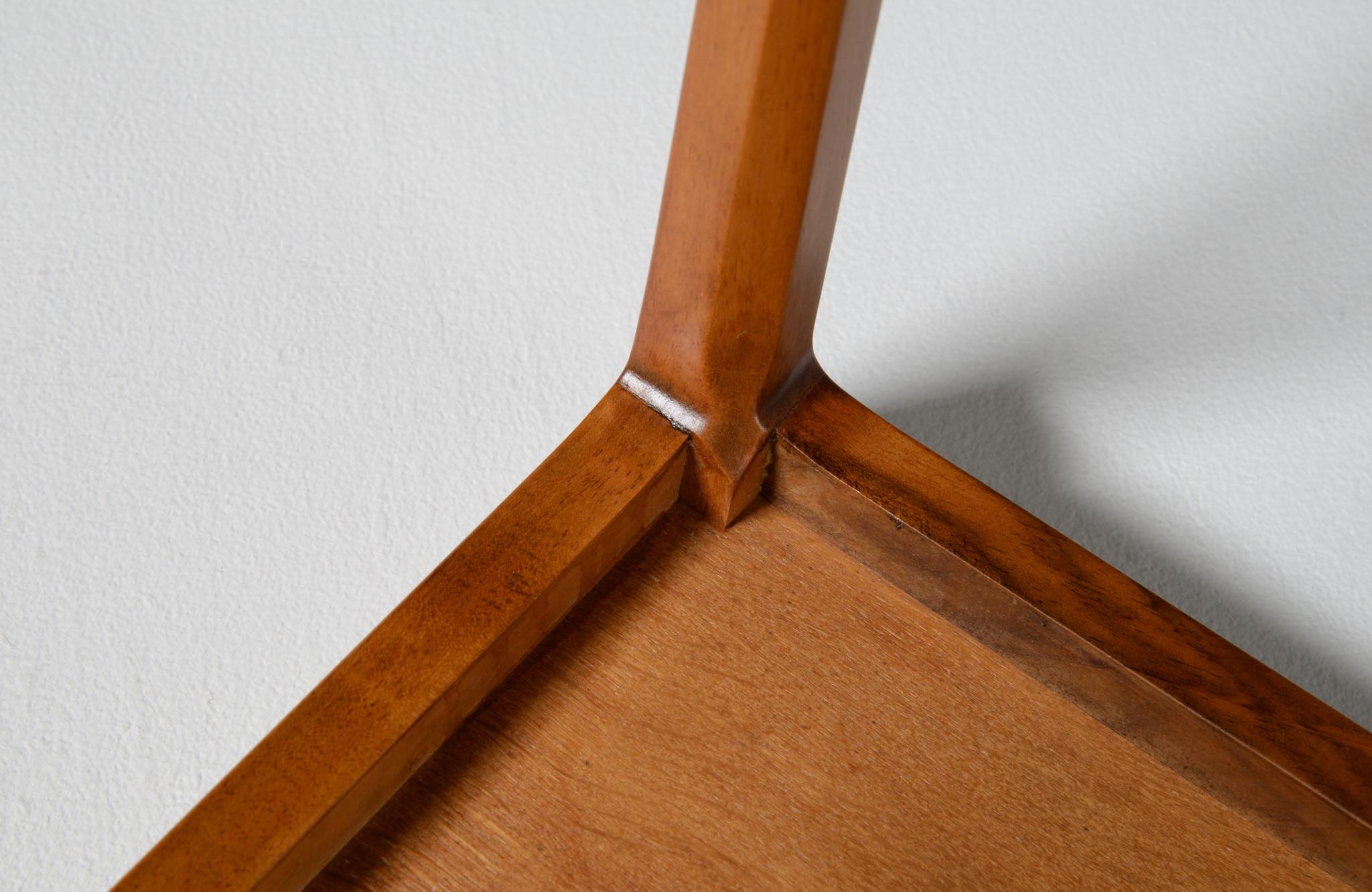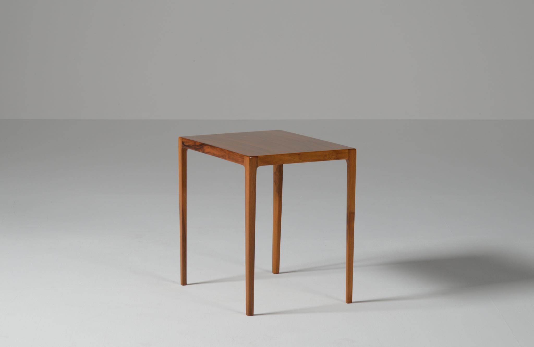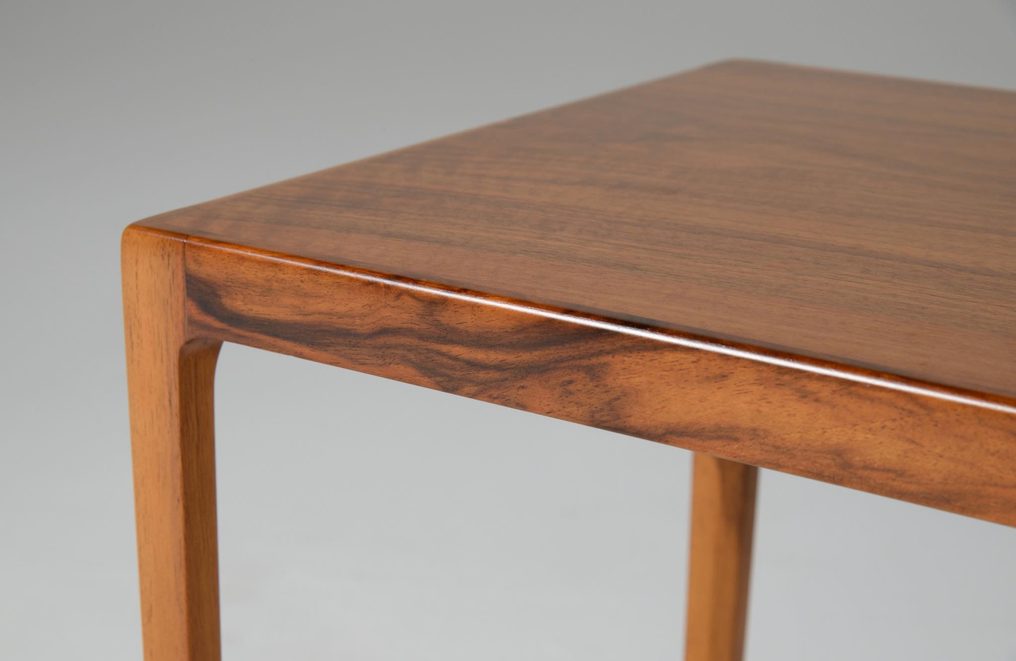 デンマークの名工、Ludvig Pontoppidan /ポントピダン工房のサイドテーブルです。1940年代頃のものと思われ、精巧な作りのものです。素材にはコーカサスウォルナット材が用いられており、特徴的な木目紋様が現れています。経年による脚部に反りが生じていますが、目立たず、脚付きに問題はありません。綺麗な状態です。