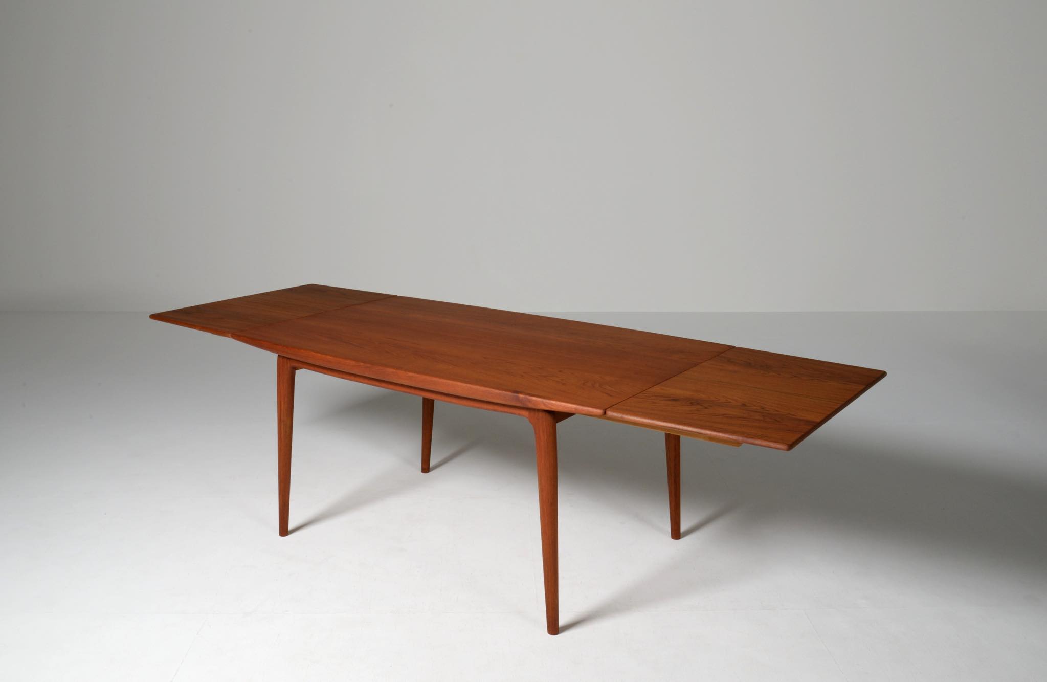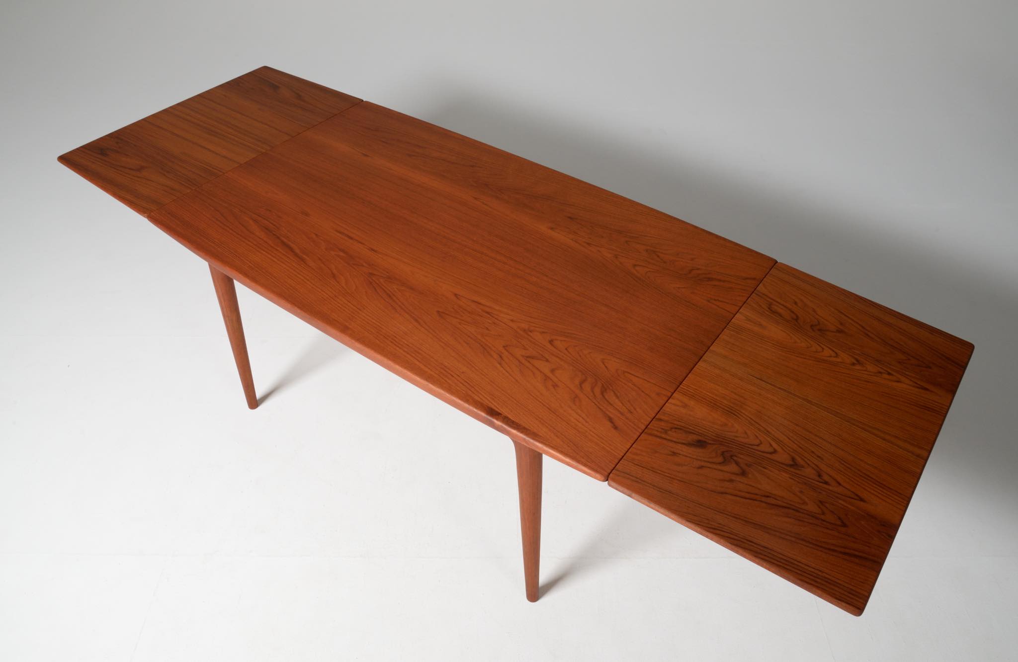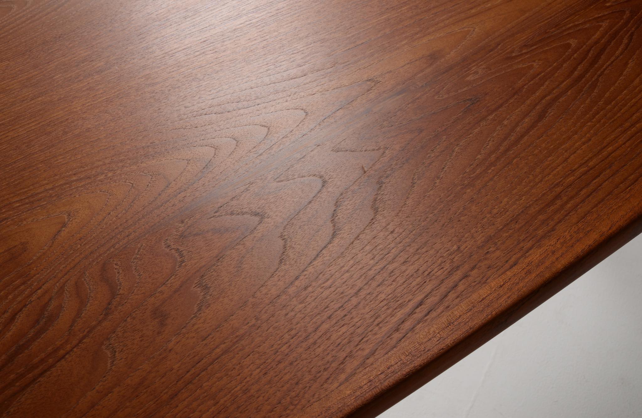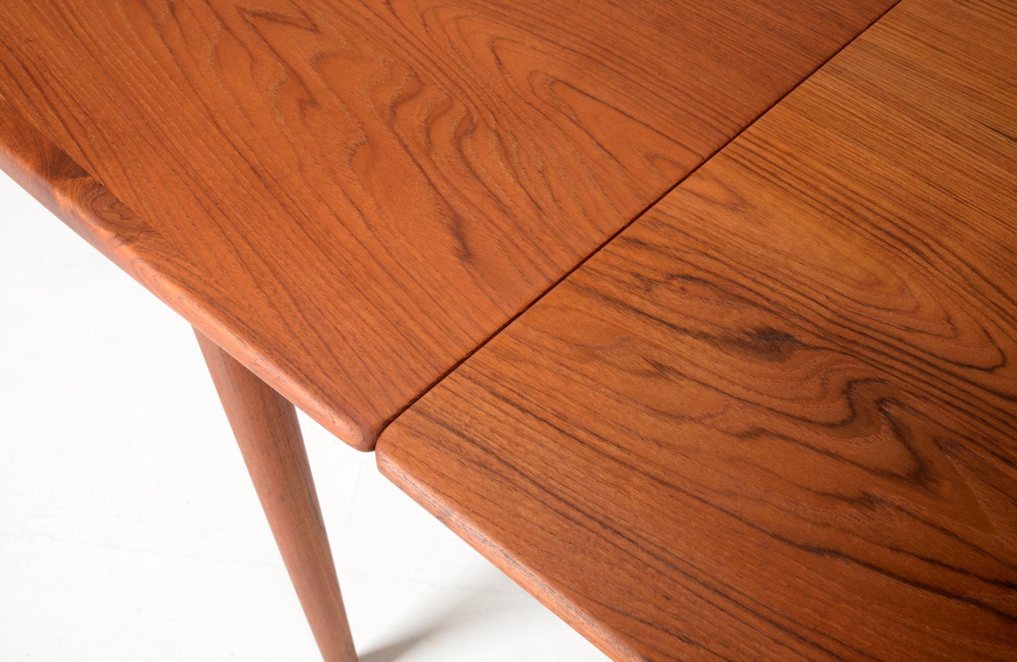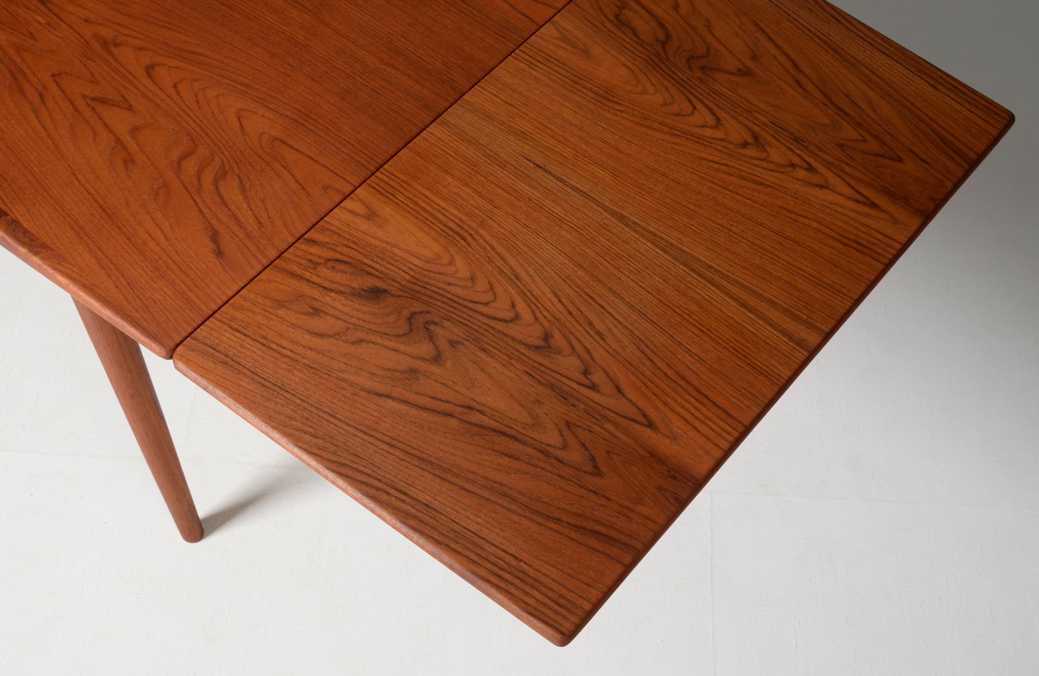 デンマークの家具デザイナー、Alfred Christensen/アルフレッド・クリステンセンによるダイニングテーブルで、1950~60年代頃に作られたものです。チーク材が用いられており、脚のデザインに特徴があります。天板面積を拡張するためのエクステンションリーフは内部に収納されており、木枠を引き出して設置する構造となります。コンディションは良好です。