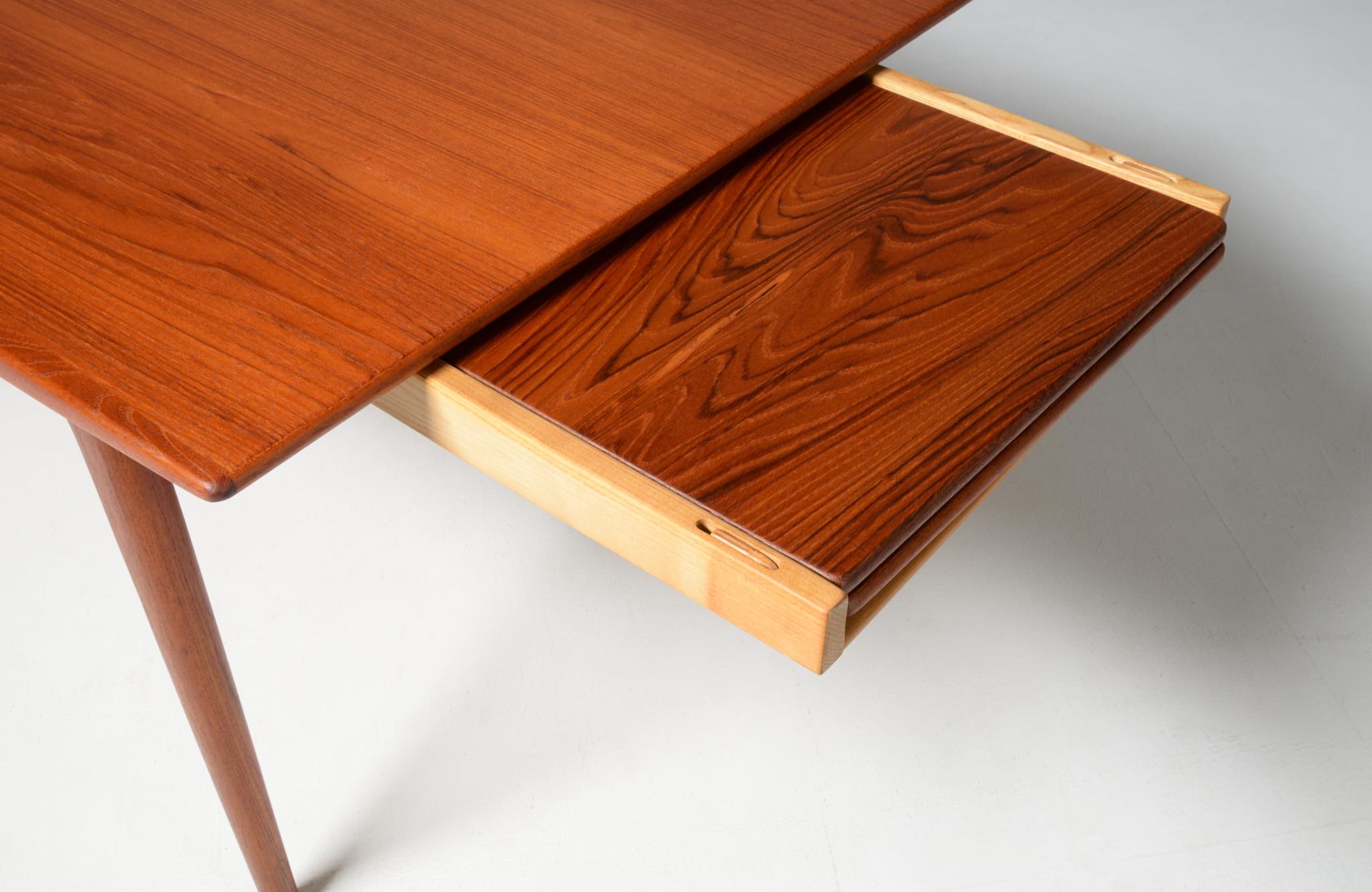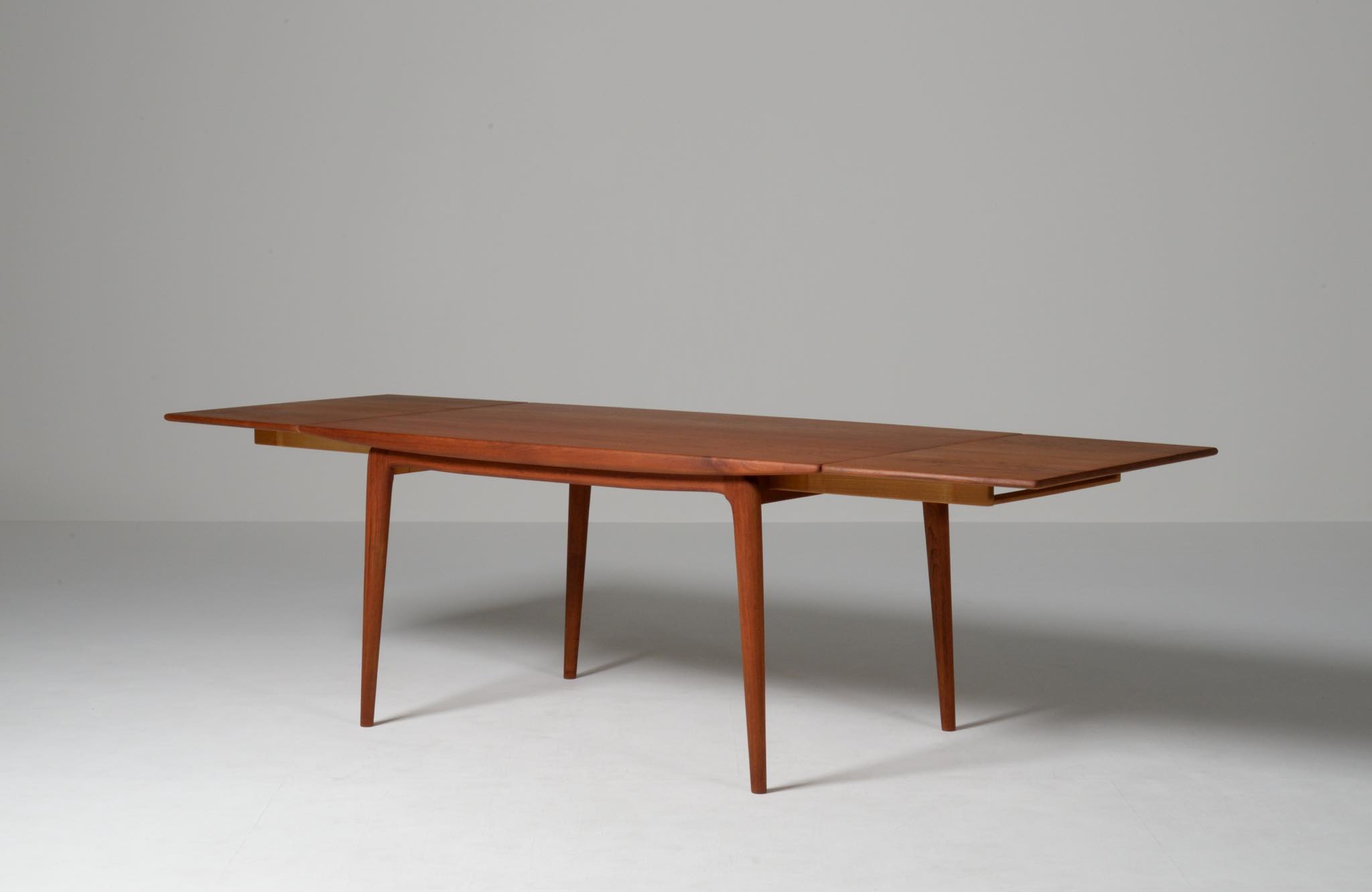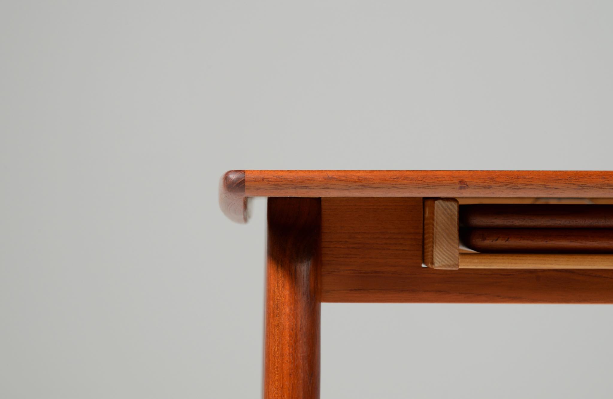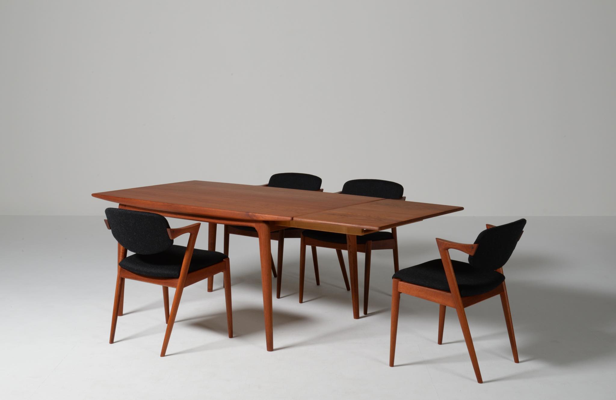 デンマークの家具デザイナー、Alfred Christensen/アルフレッド・クリステンセンによるダイニングテーブルで、1950~60年代頃に作られたものです。チーク材が用いられており、脚のデザインに特徴があります。天板面積を拡張するためのエクステンションリーフは内部に収納されており、木枠を引き出して設置する構造となります。コンディションは良好です。