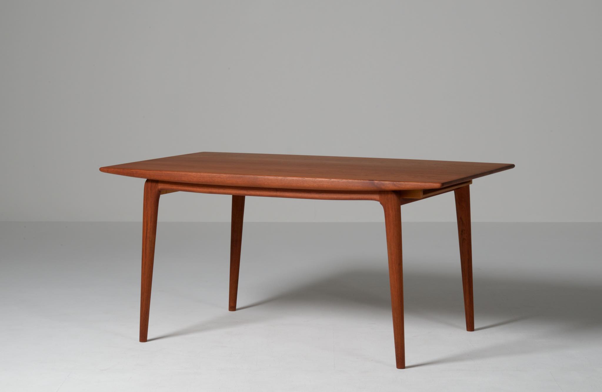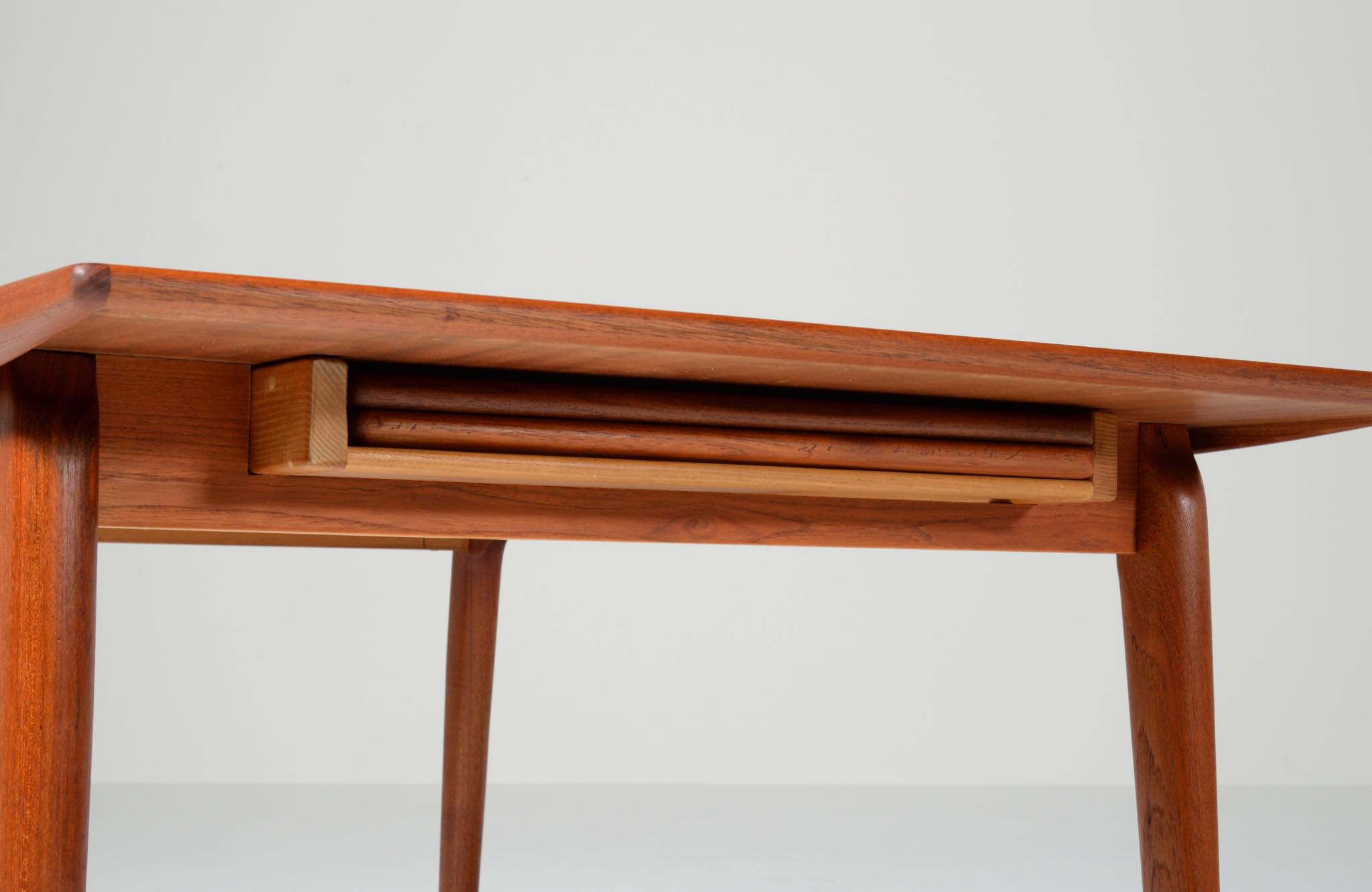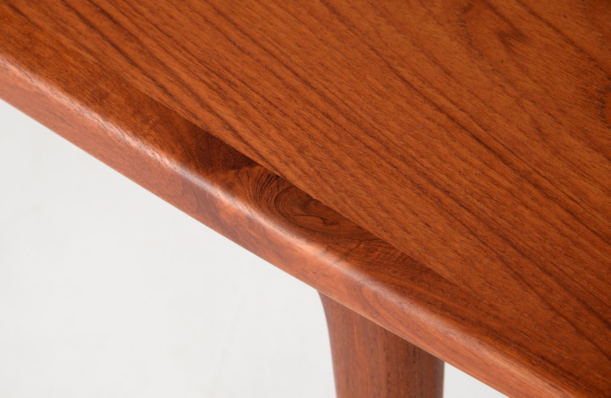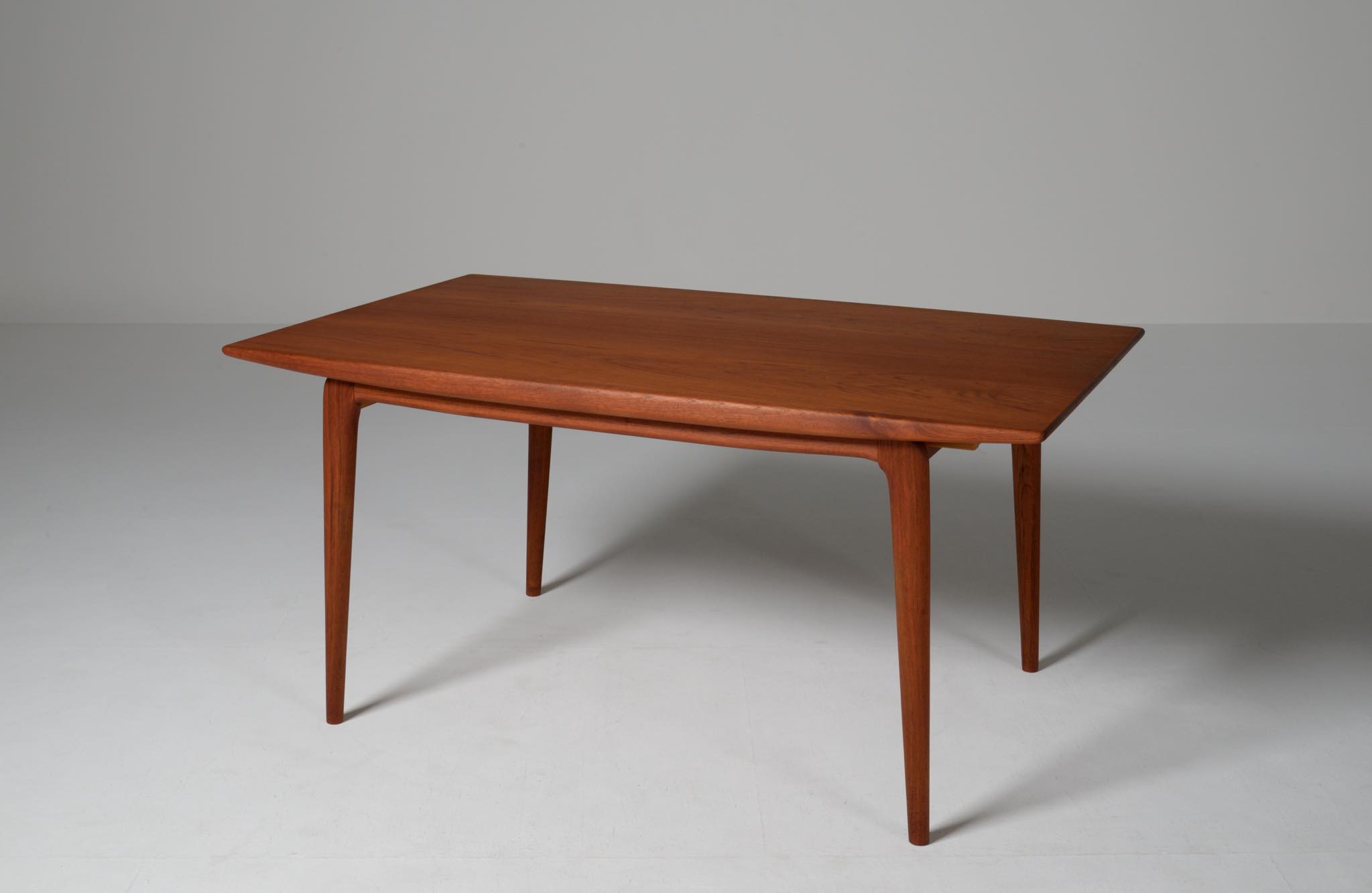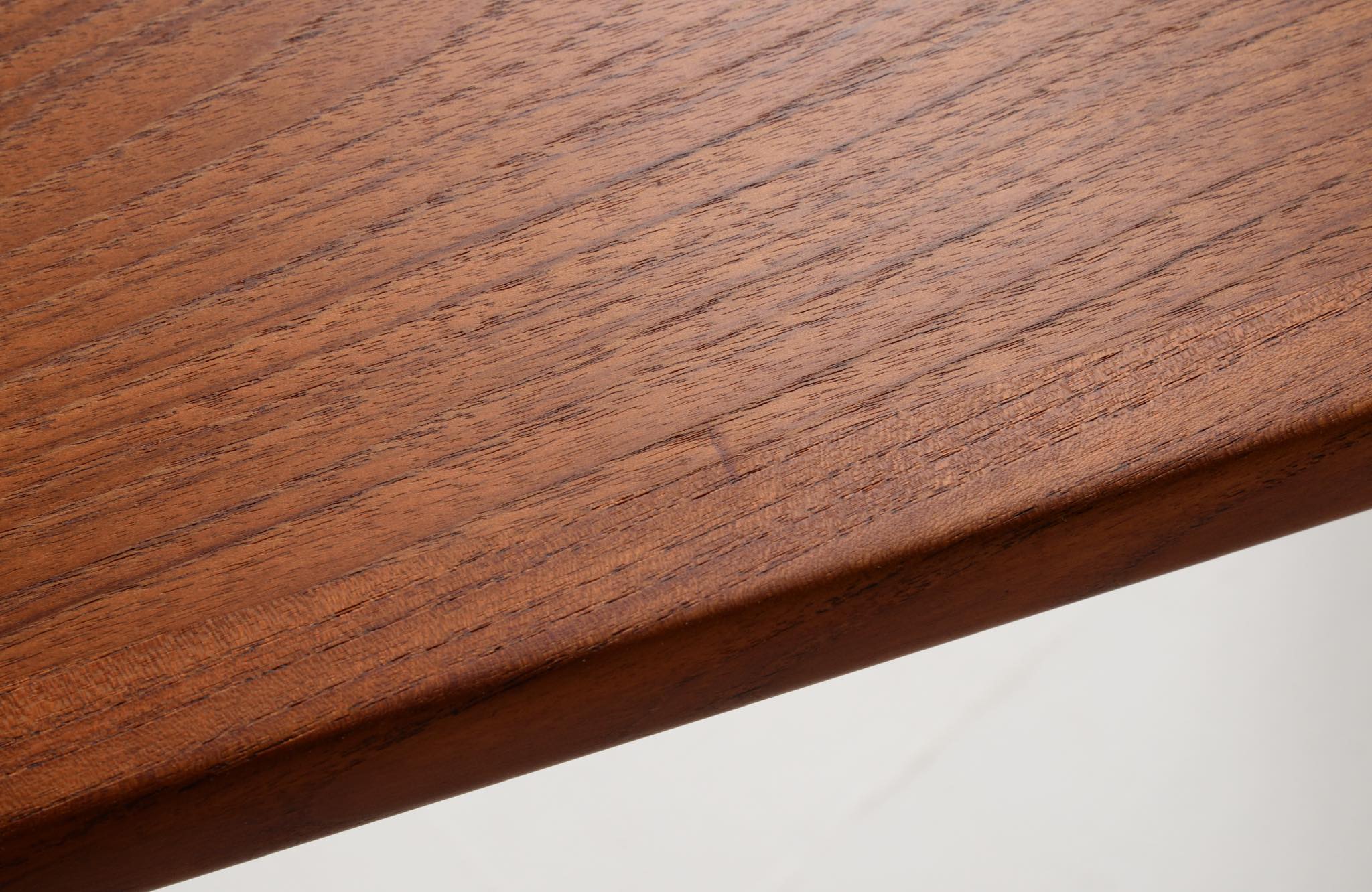 デンマークの家具デザイナー、Alfred Christensen/アルフレッド・クリステンセンによるダイニングテーブルで、1950~60年代頃に作られたものです。チーク材が用いられており、脚のデザインに特徴があります。天板面積を拡張するためのエクステンションリーフは内部に収納されており、木枠を引き出して設置する構造となります。コンディションは良好です。