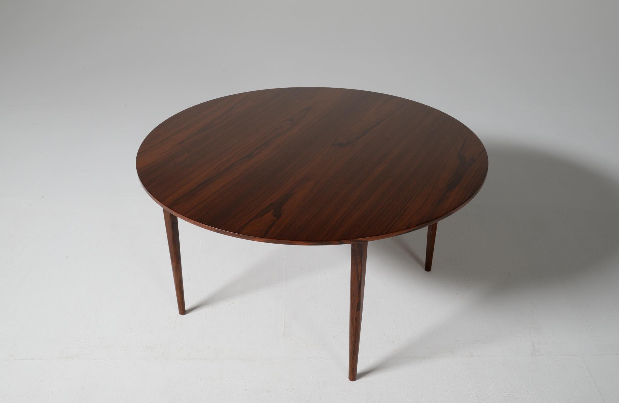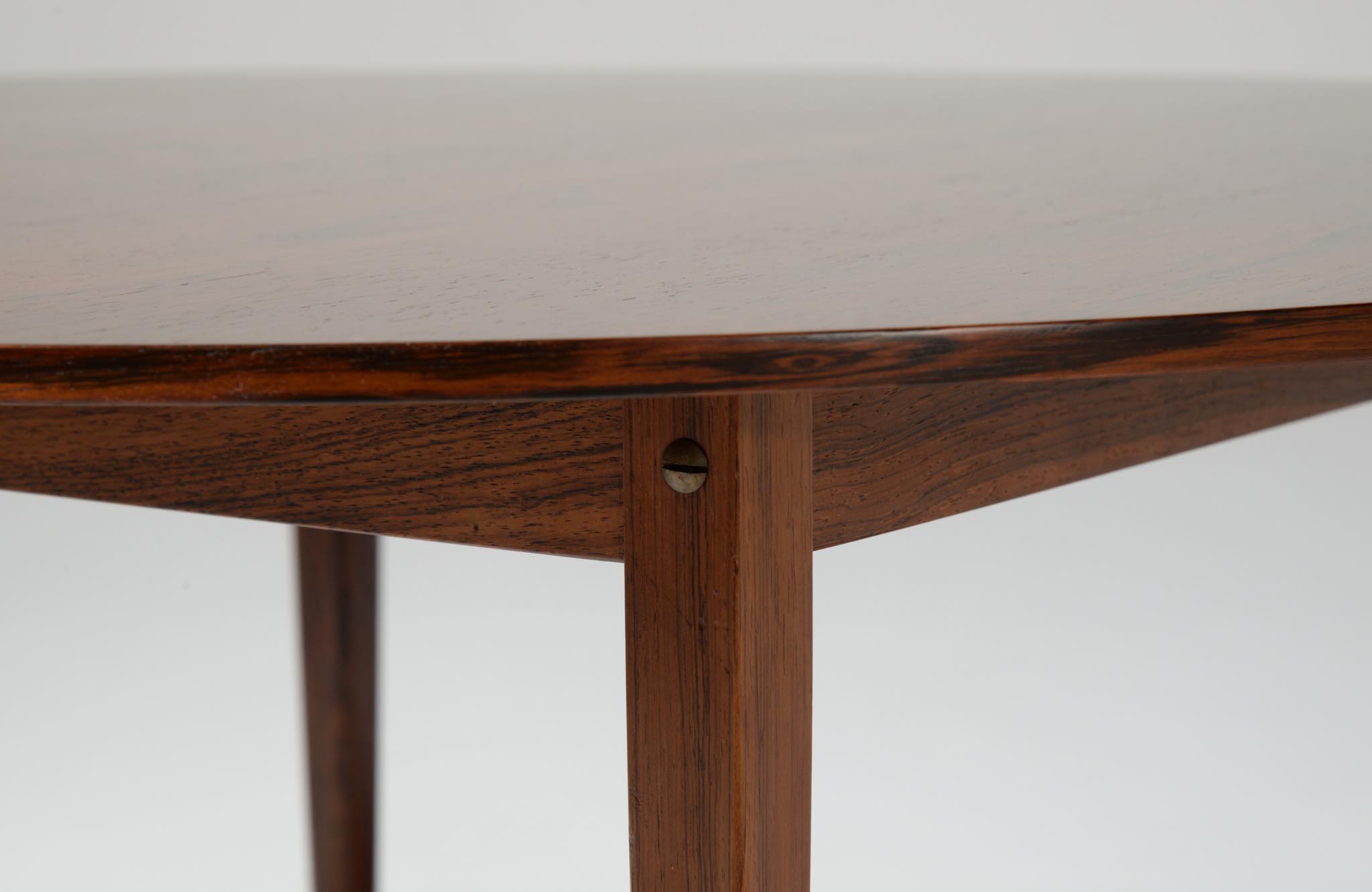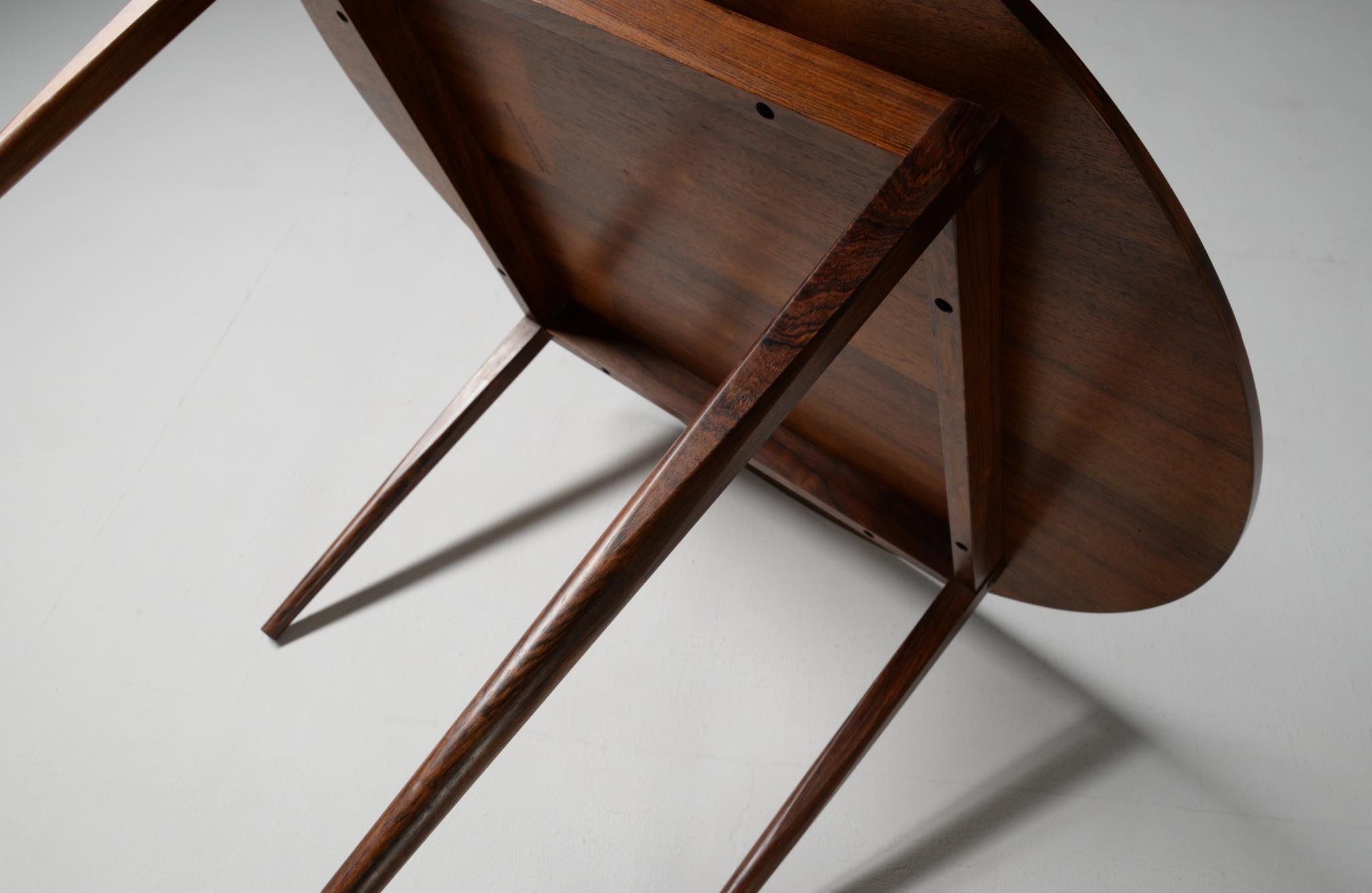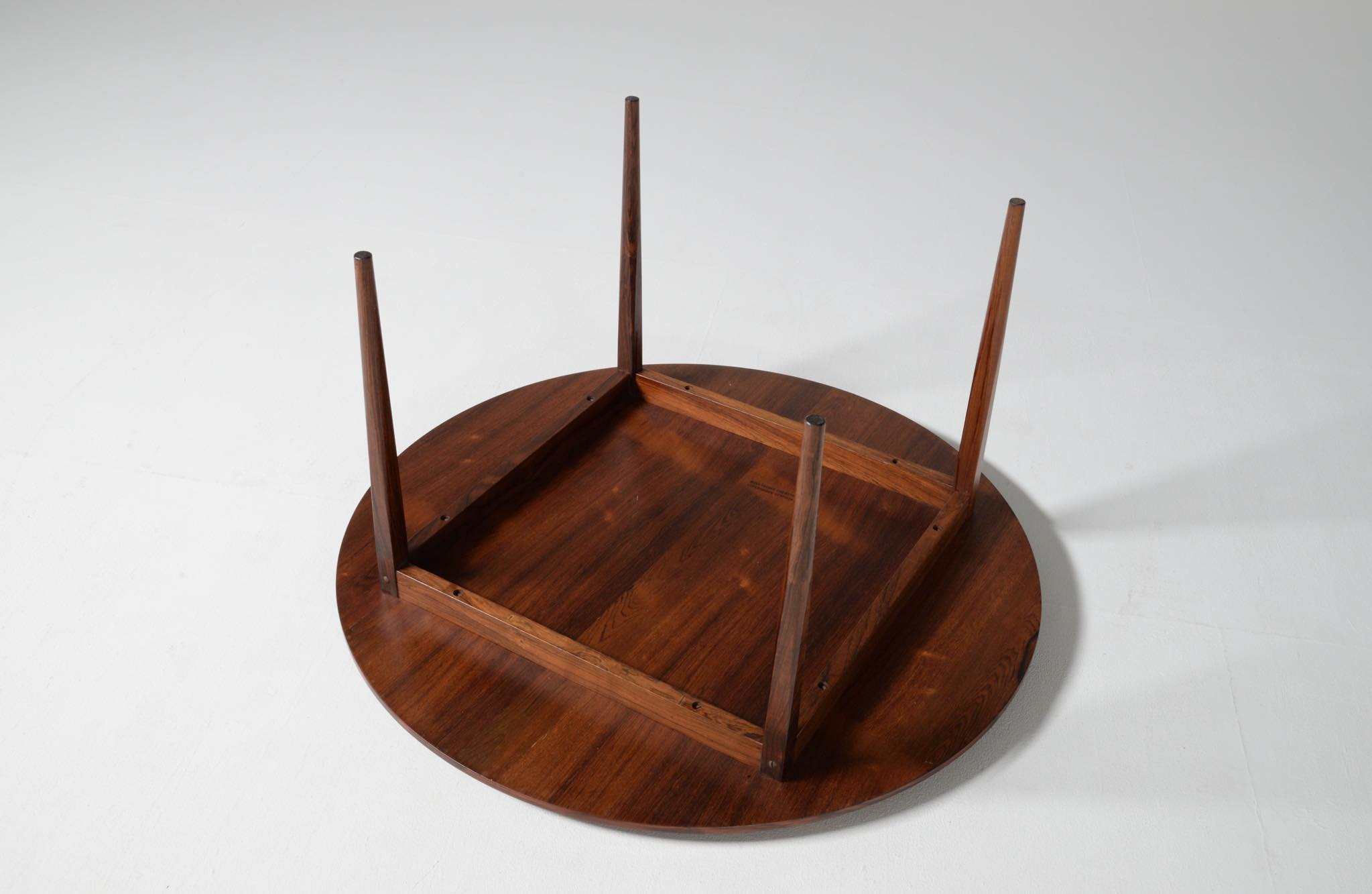 フィン・ユールの初期工房で知られるNiels Vodder/ニールス・ヴォッダーによるコーヒーテーブルです。1960年代頃に作られたものでしょう。天板は特徴的な薄造りでブラジリアンローズウッドの突板仕様、脚は上部から床へ向かって、四角から丸へとローズウッド無垢材が削り出されています。背面にはメーカーの刻印が確認できます。表面の塗膜が劣化していたためラッカーで仕上げ直しました。シンプルで佇まいの美しいテーブルです。