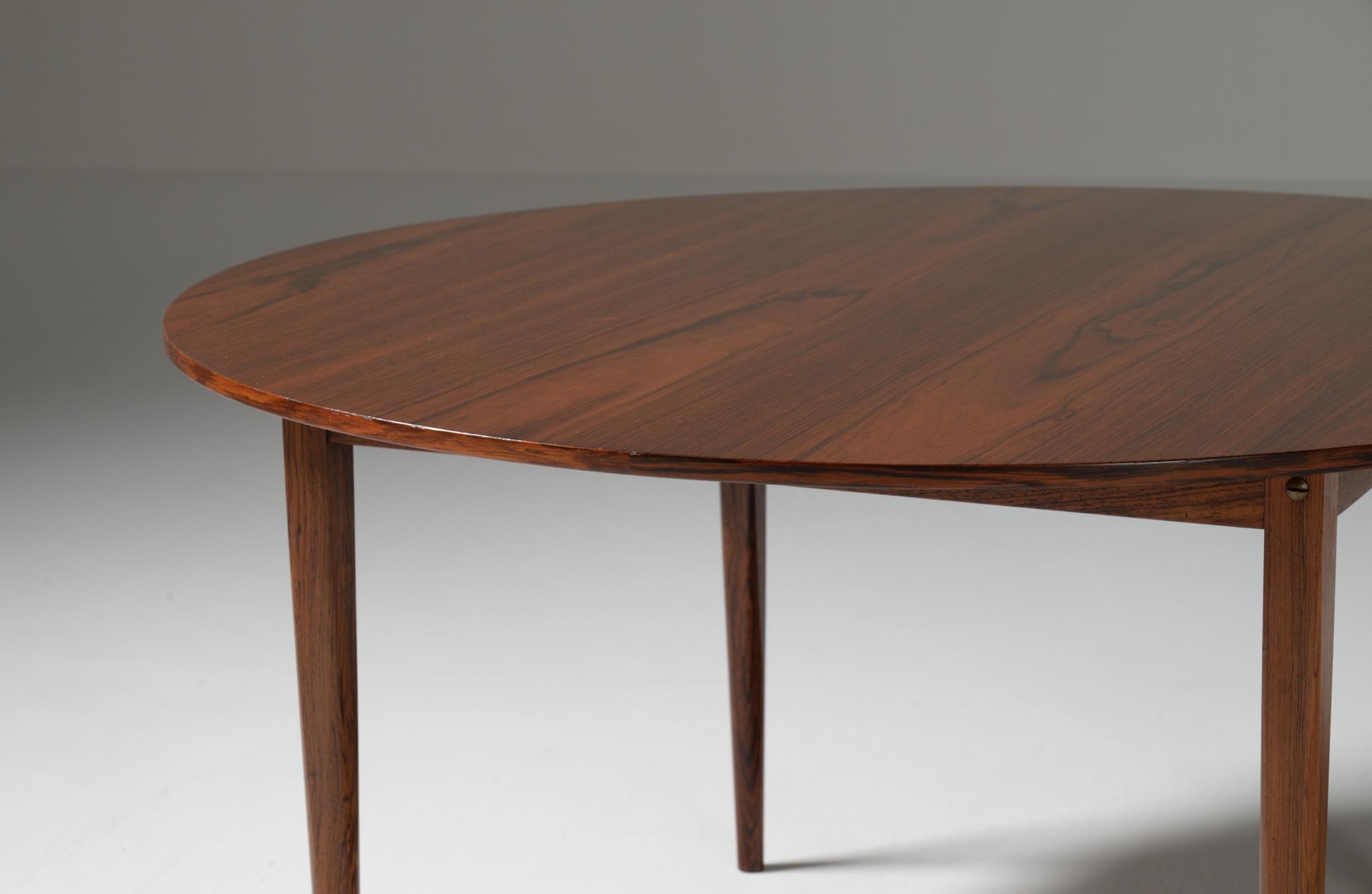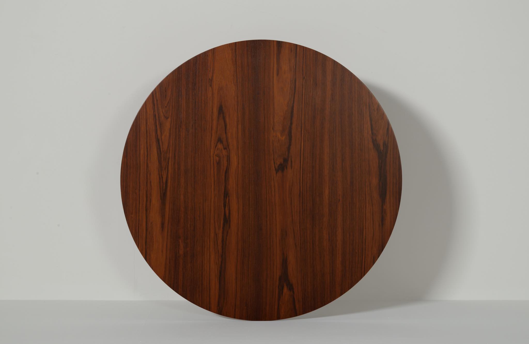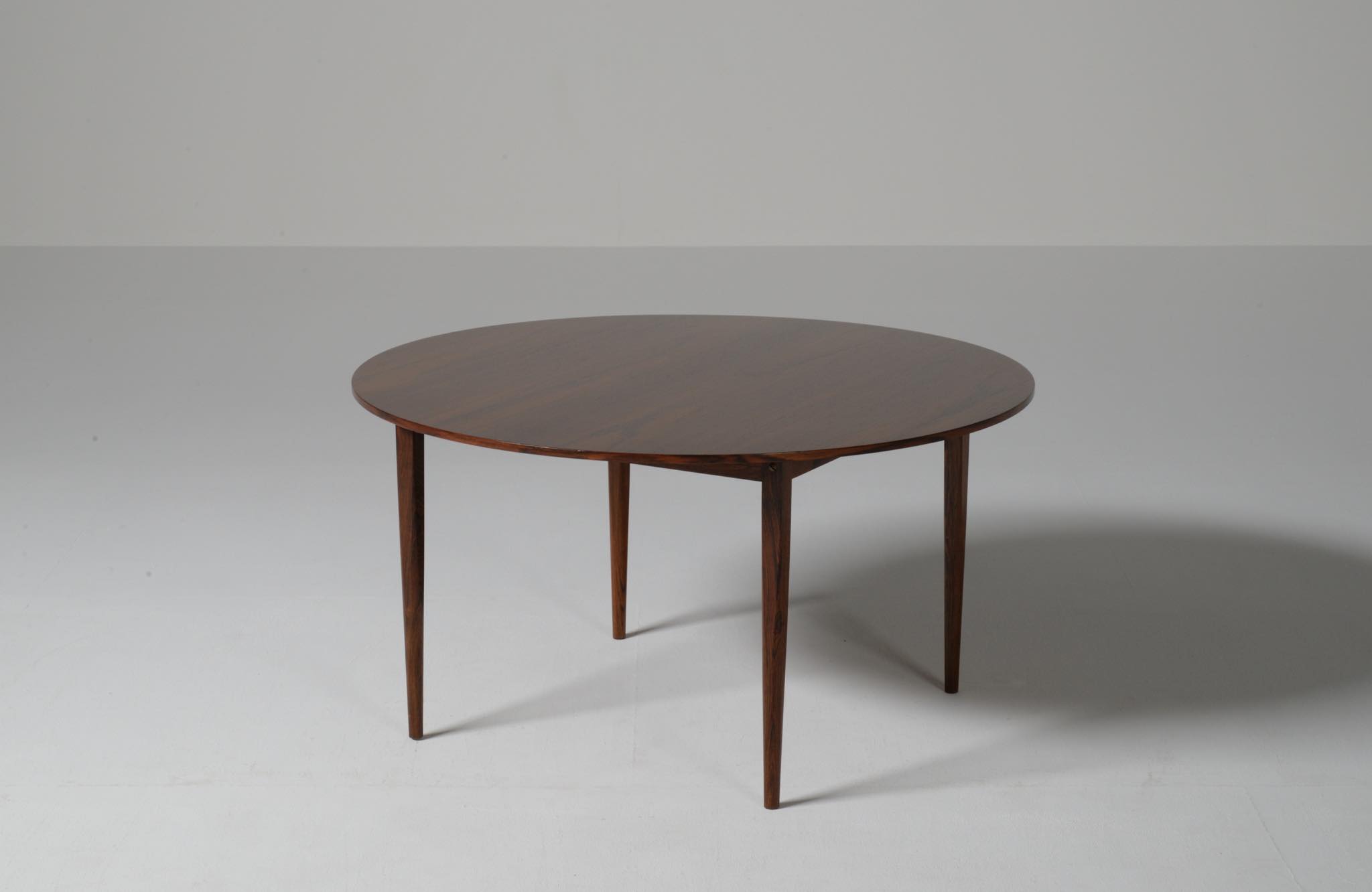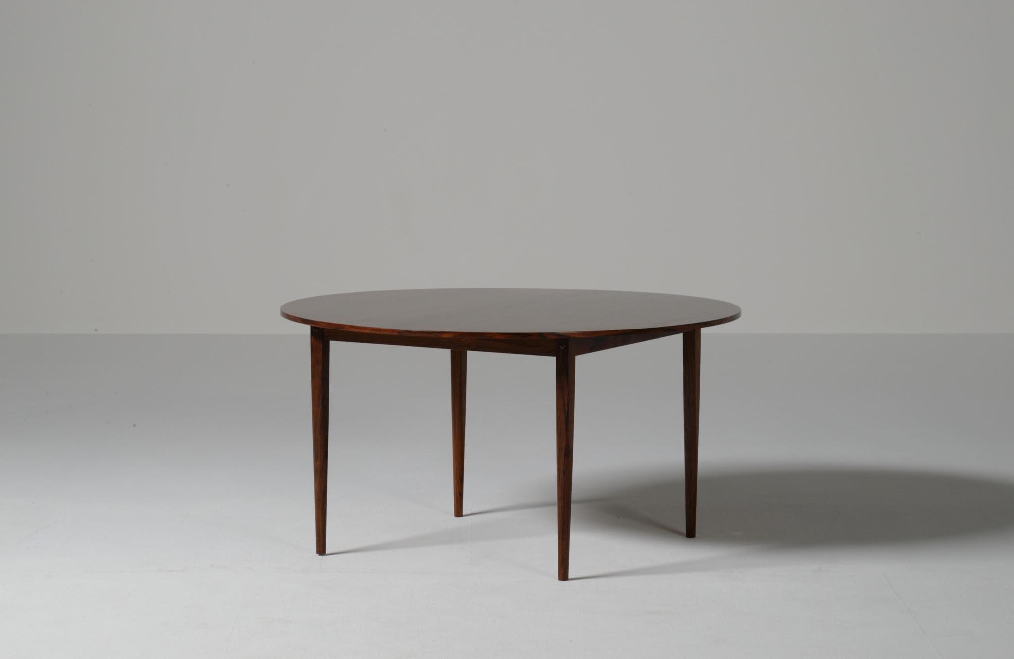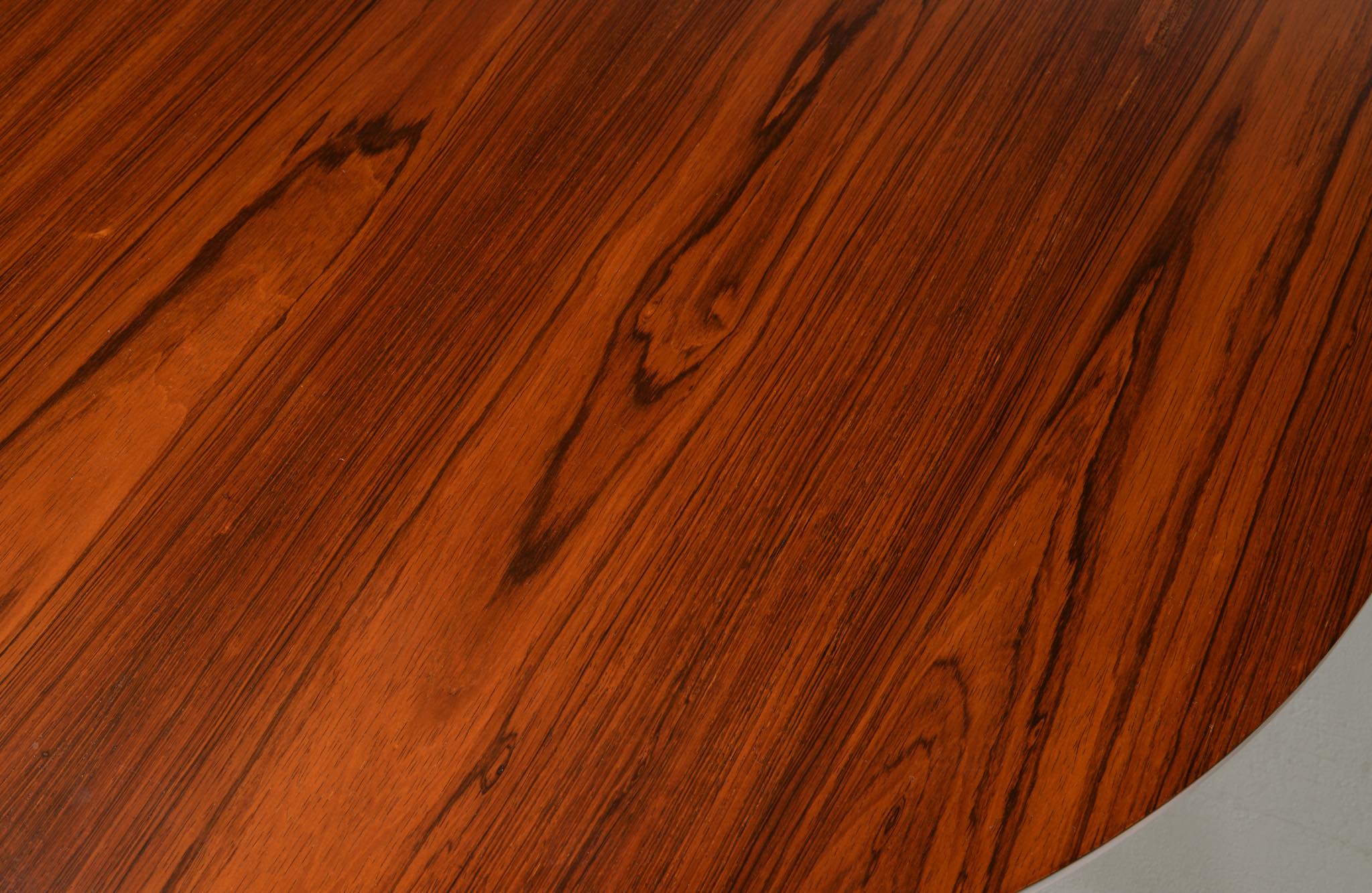 フィン・ユールの初期工房で知られるNiels Vodder/ニールス・ヴォッダーによるコーヒーテーブルです。1960年代頃に作られたものでしょう。天板は特徴的な薄造りでブラジリアンローズウッドの突板仕様、脚は上部から床へ向かって、四角から丸へとローズウッド無垢材が削り出されています。背面にはメーカーの刻印が確認できます。表面の塗膜が劣化していたためラッカーで仕上げ直しました。シンプルで佇まいの美しいテーブルです。