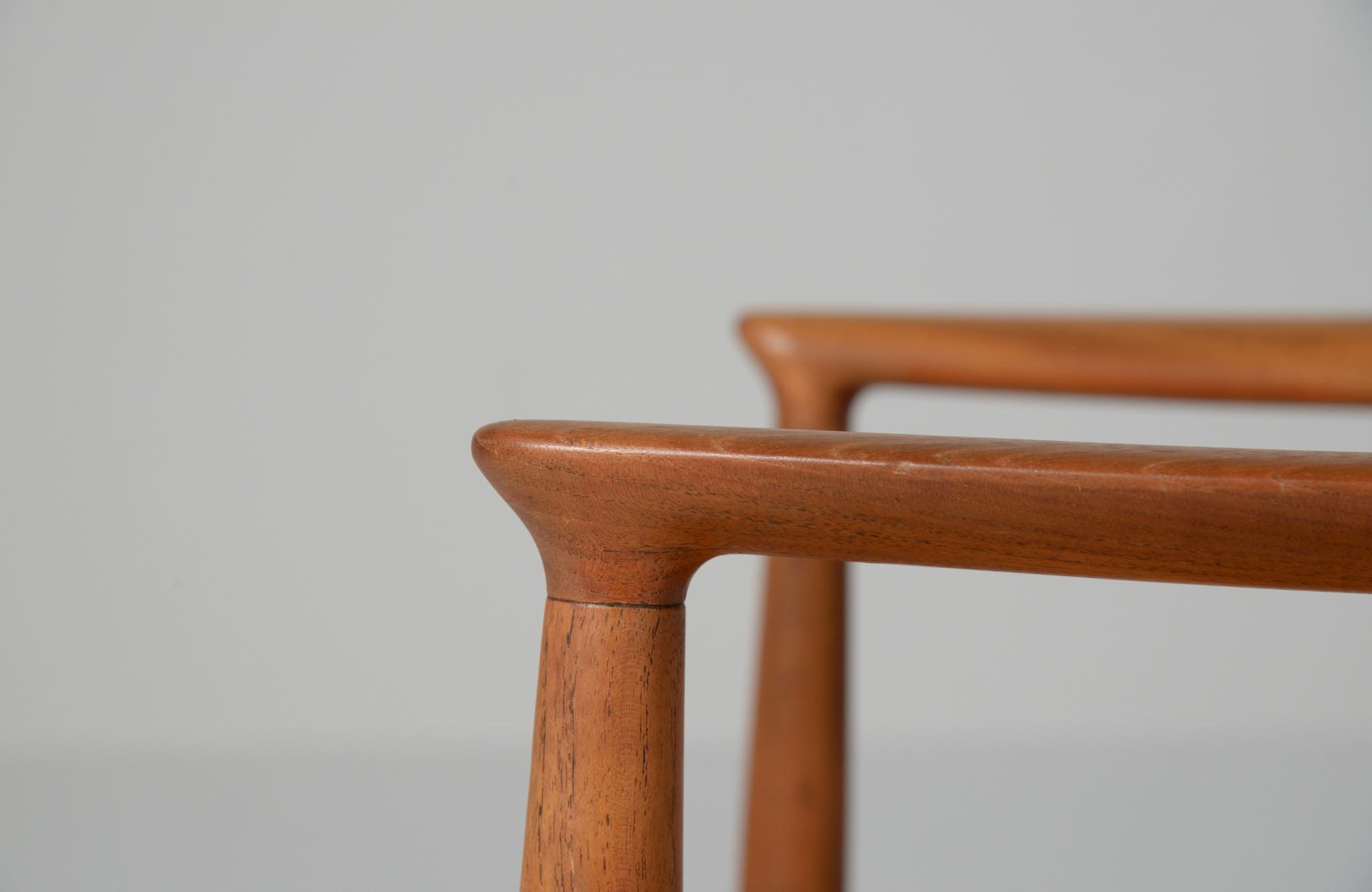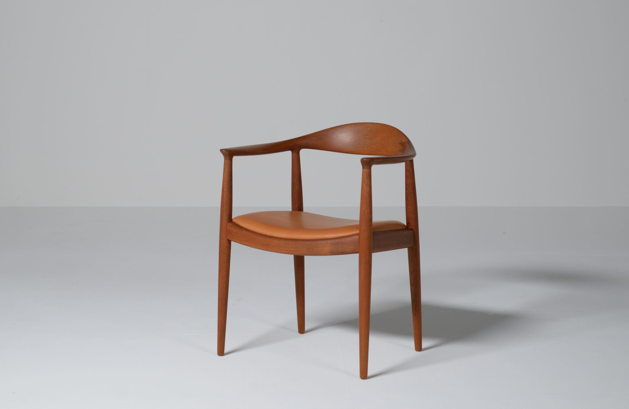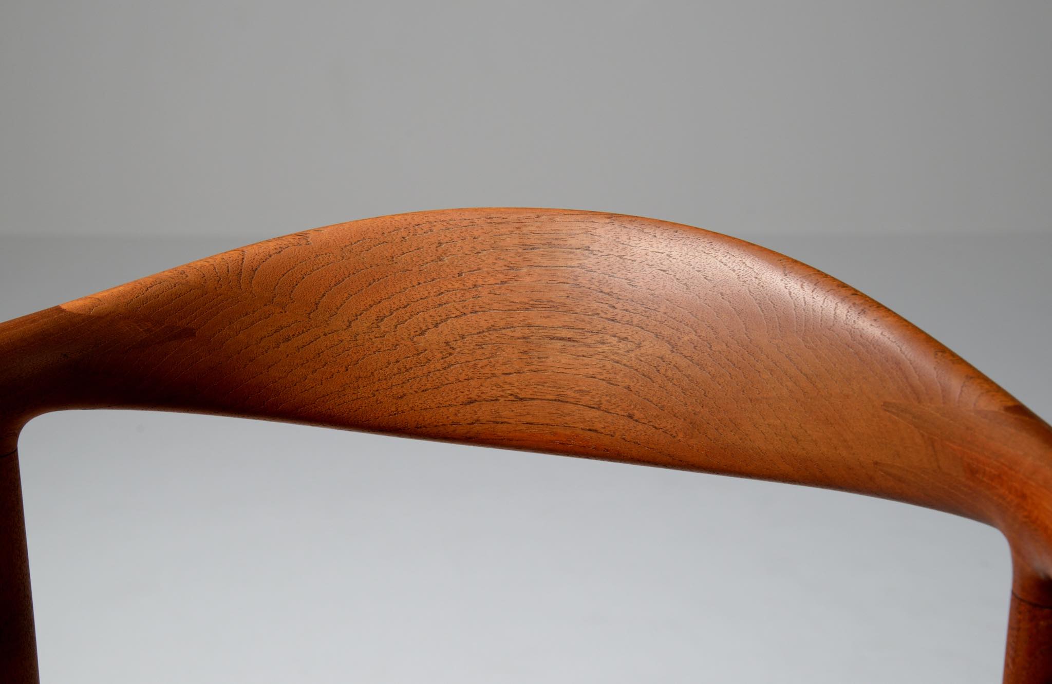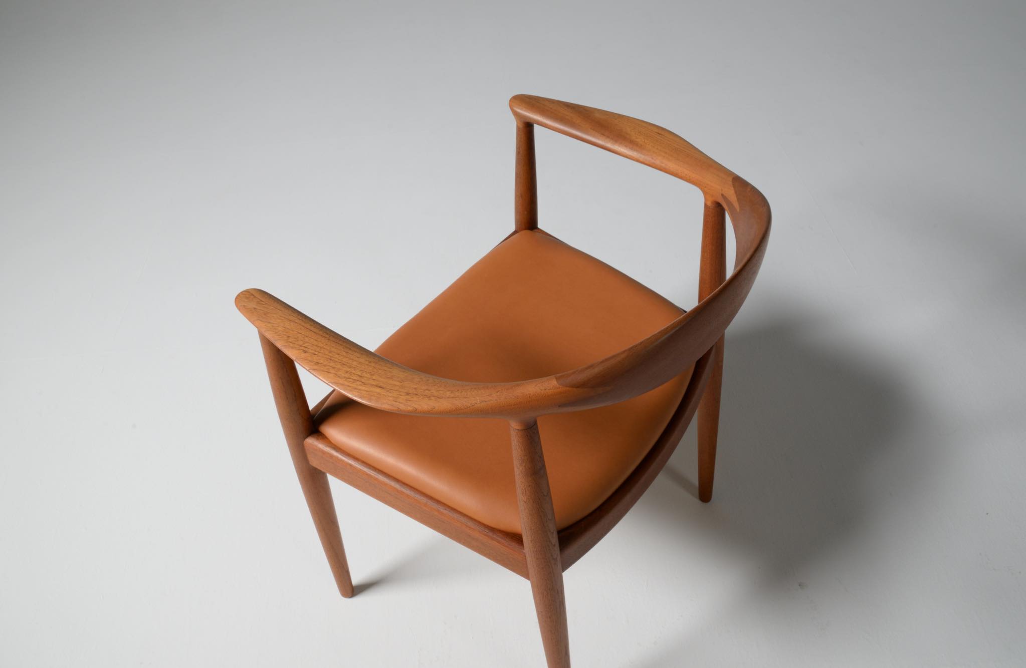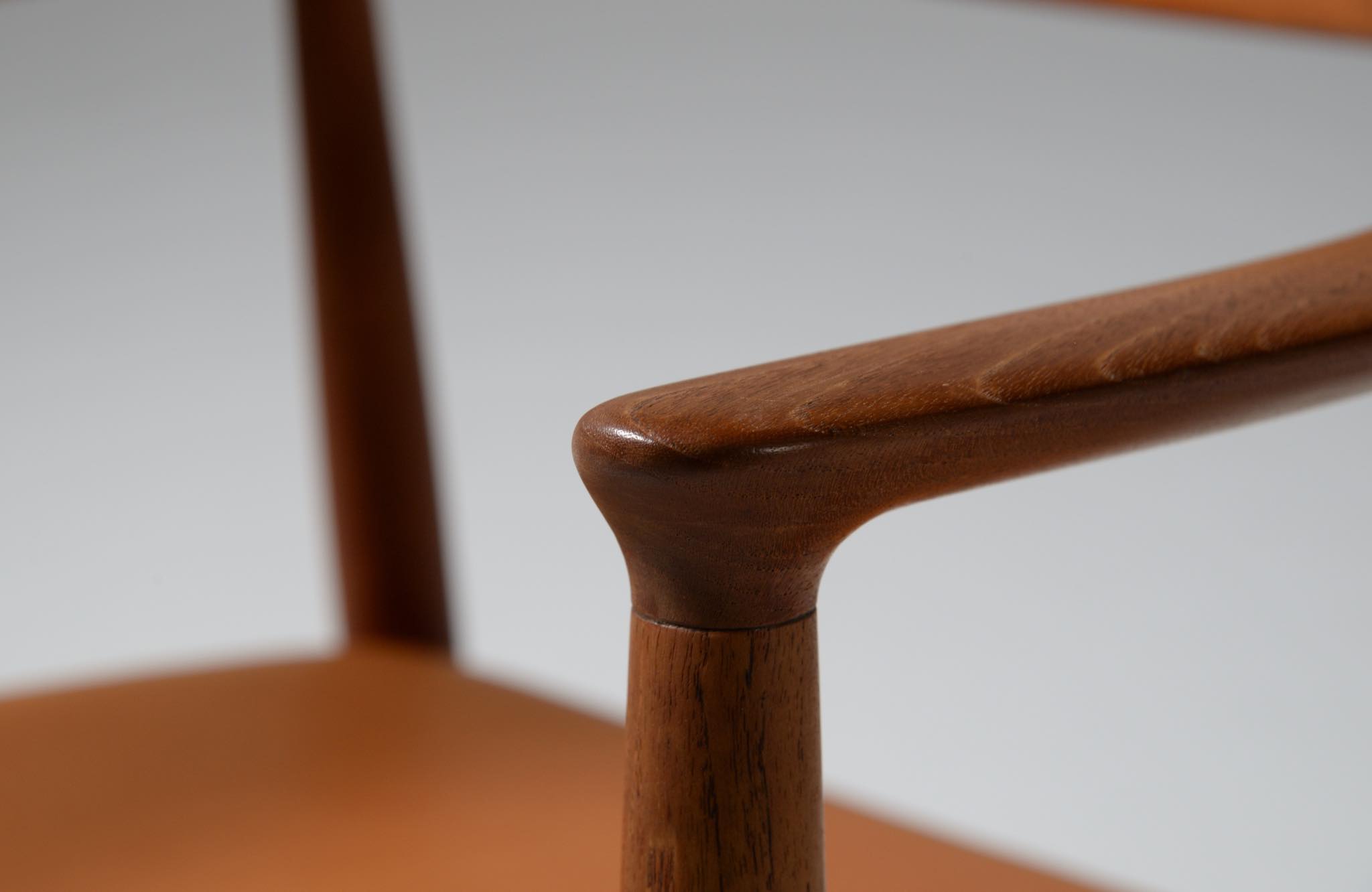 デンマークを代表する家具デザイナー、Hans J. Wegner/ハンス・ウェグナーによる代表作 “ザ・チェア"です。1960年にアメリカのCNNテレビで大統領候補のジョン・F・ケネディとリチャード・ニクソンが討論会を行った際に使われた椅子として知られています。笠木には木目に変化のある材を木取りしています。ウェグナー作品では木目に変化のある部位をあえて表に出すよう木取りすることが多いように見受けられます。こちらの椅子はチーク材のタイプで、シートの皮革は新たに張り替えております。コンディションは良好です。