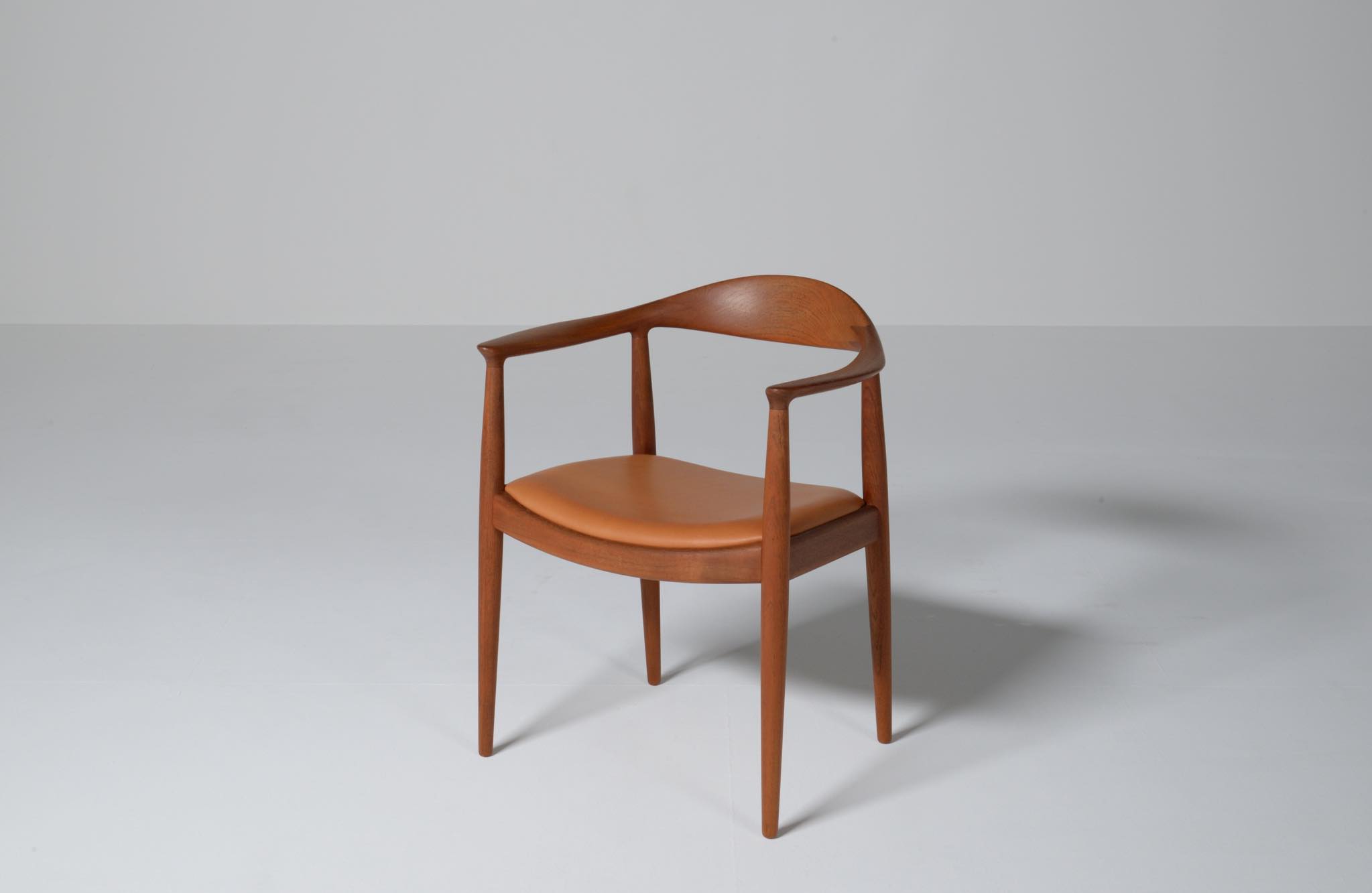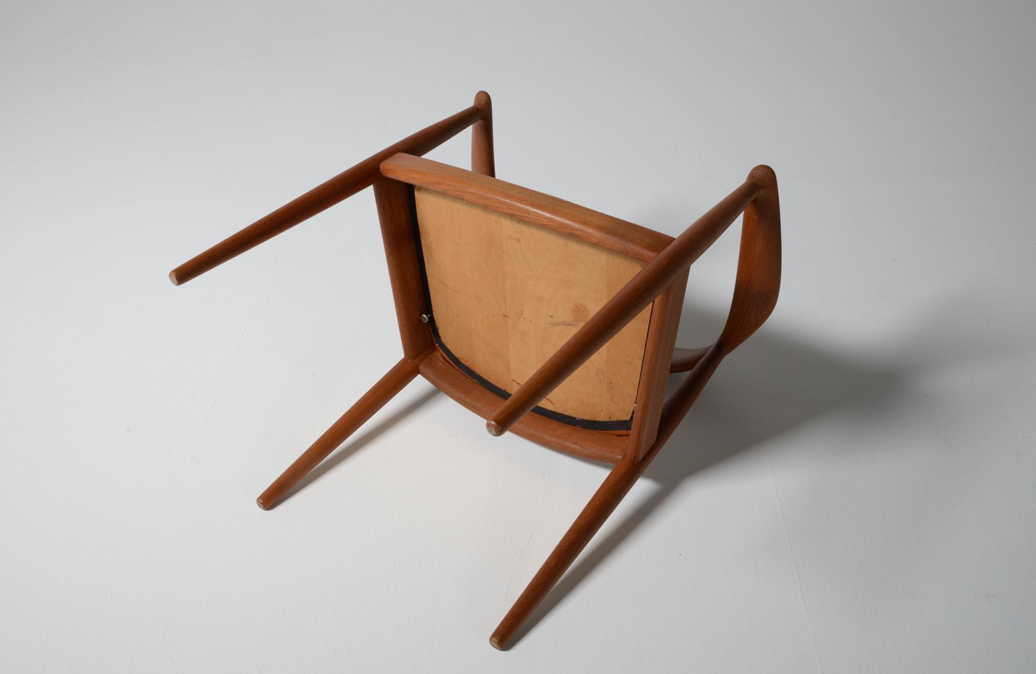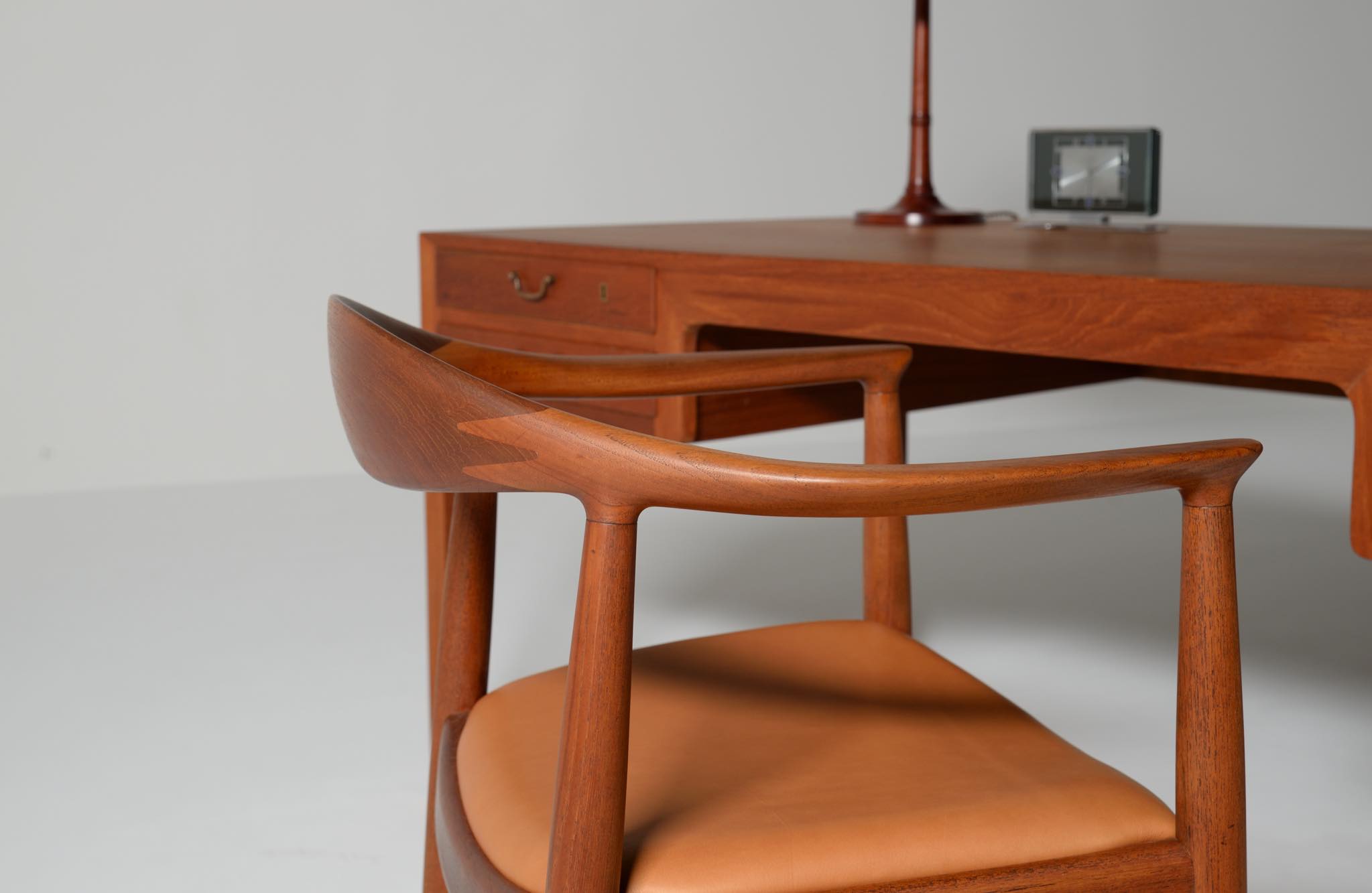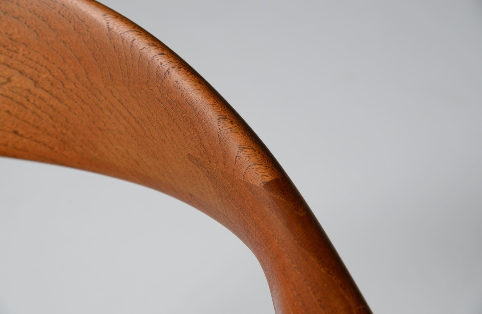 デンマークを代表する家具デザイナー、Hans J. Wegner/ハンス・ウェグナーによる代表作 “ザ・チェア"です。1960年にアメリカのCNNテレビで大統領候補のジョン・F・ケネディとリチャード・ニクソンが討論会を行った際に使われた椅子として知られています。笠木には木目に変化のある材を木取りしています。ウェグナー作品では木目に変化のある部位をあえて表に出すよう木取りすることが多いように見受けられます。こちらの椅子はチーク材のタイプで、シートの皮革は新たに張り替えております。コンディションは良好です。