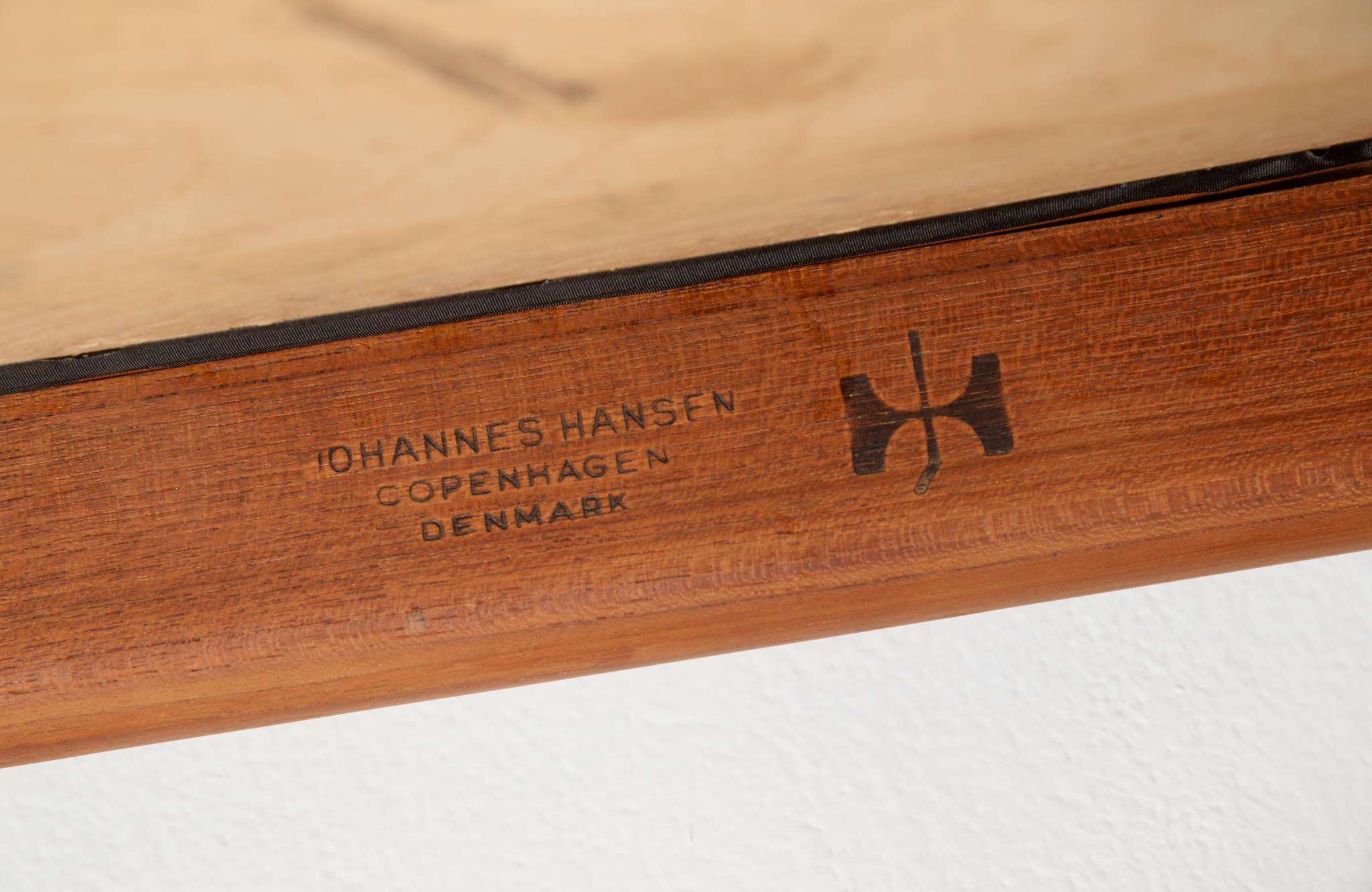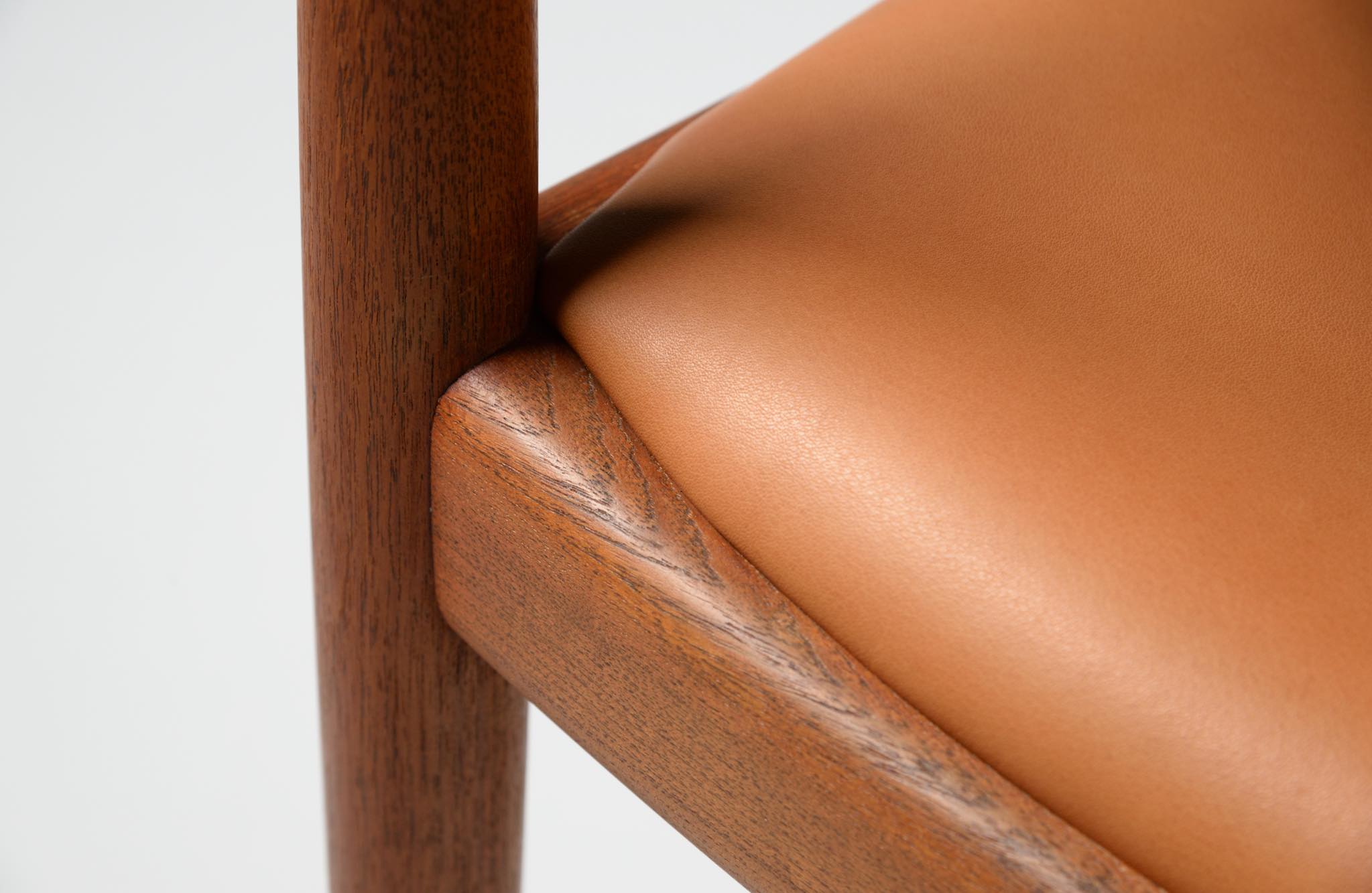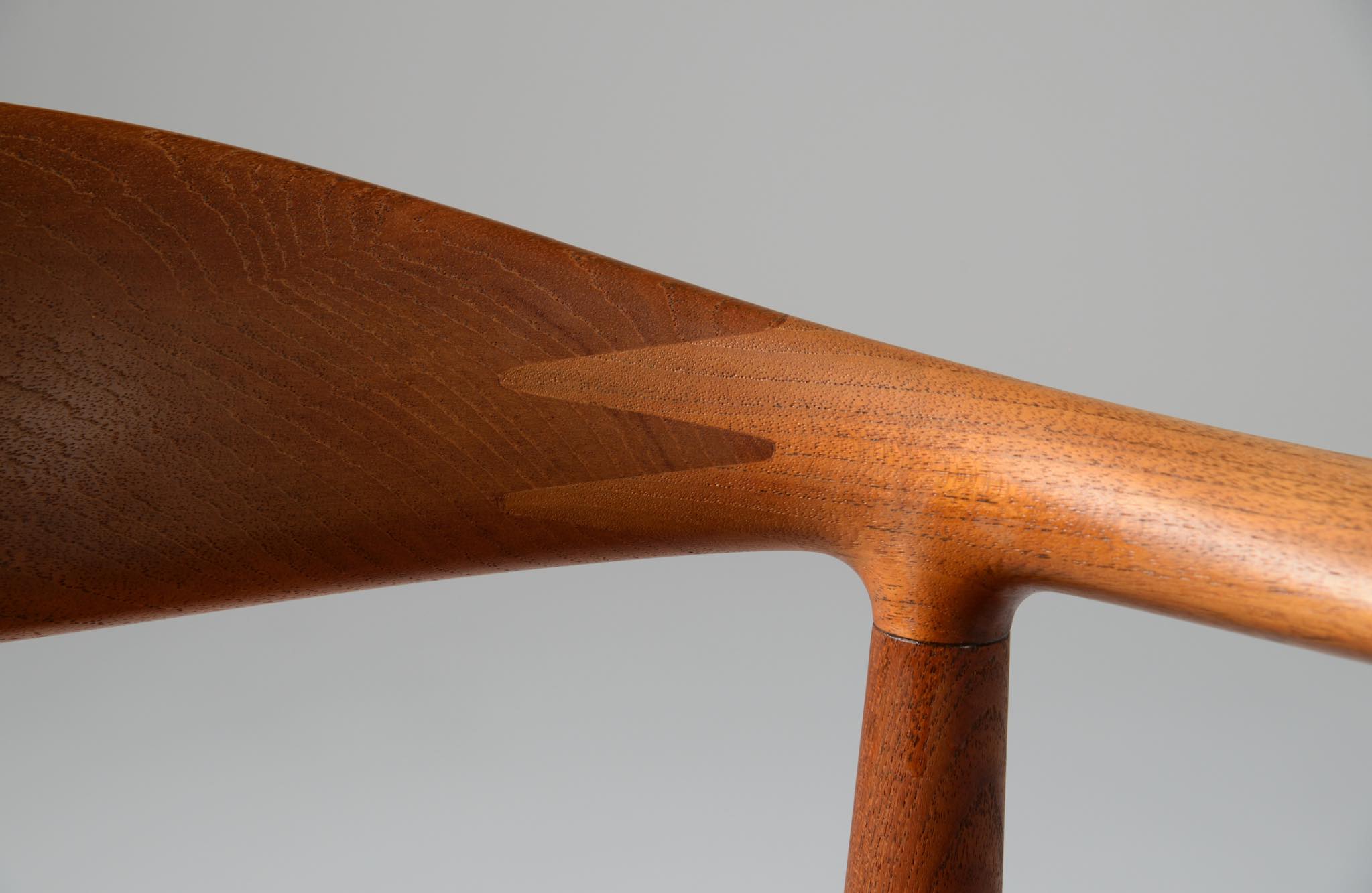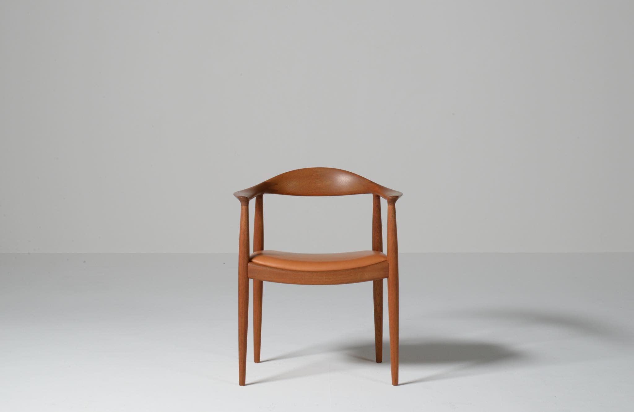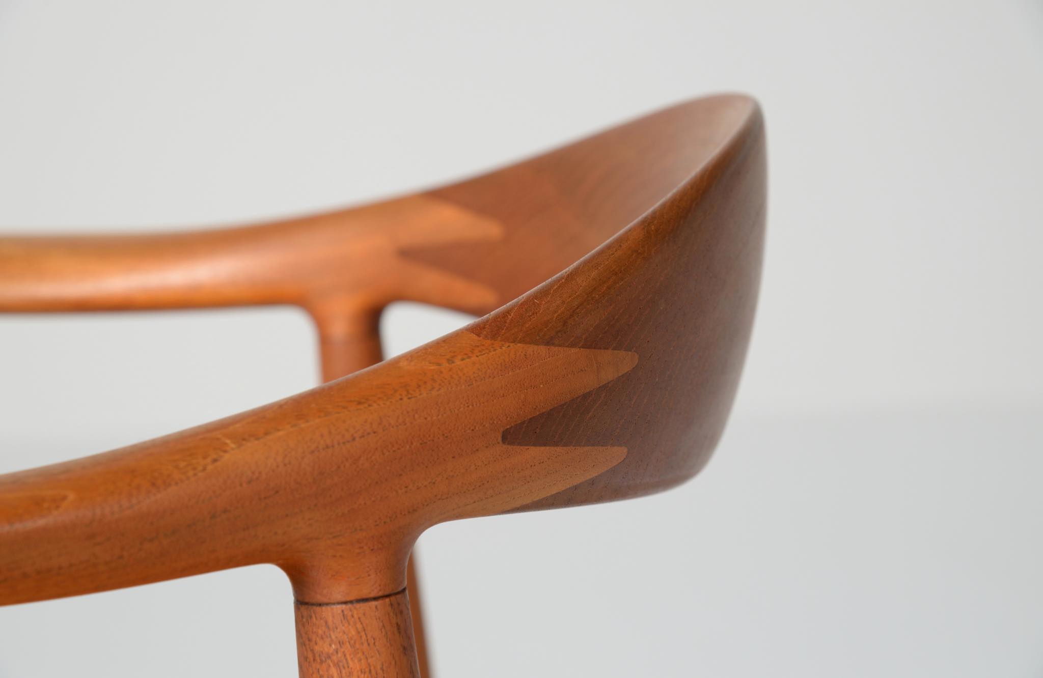 デンマークを代表する家具デザイナー、Hans J. Wegner/ハンス・ウェグナーによる代表作 “ザ・チェア"です。1960年にアメリカのCNNテレビで大統領候補のジョン・F・ケネディとリチャード・ニクソンが討論会を行った際に使われた椅子として知られています。笠木には木目に変化のある材を木取りしています。ウェグナー作品では木目に変化のある部位をあえて表に出すよう木取りすることが多いように見受けられます。こちらの椅子はチーク材のタイプで、シートの皮革は新たに張り替えております。コンディションは良好です。