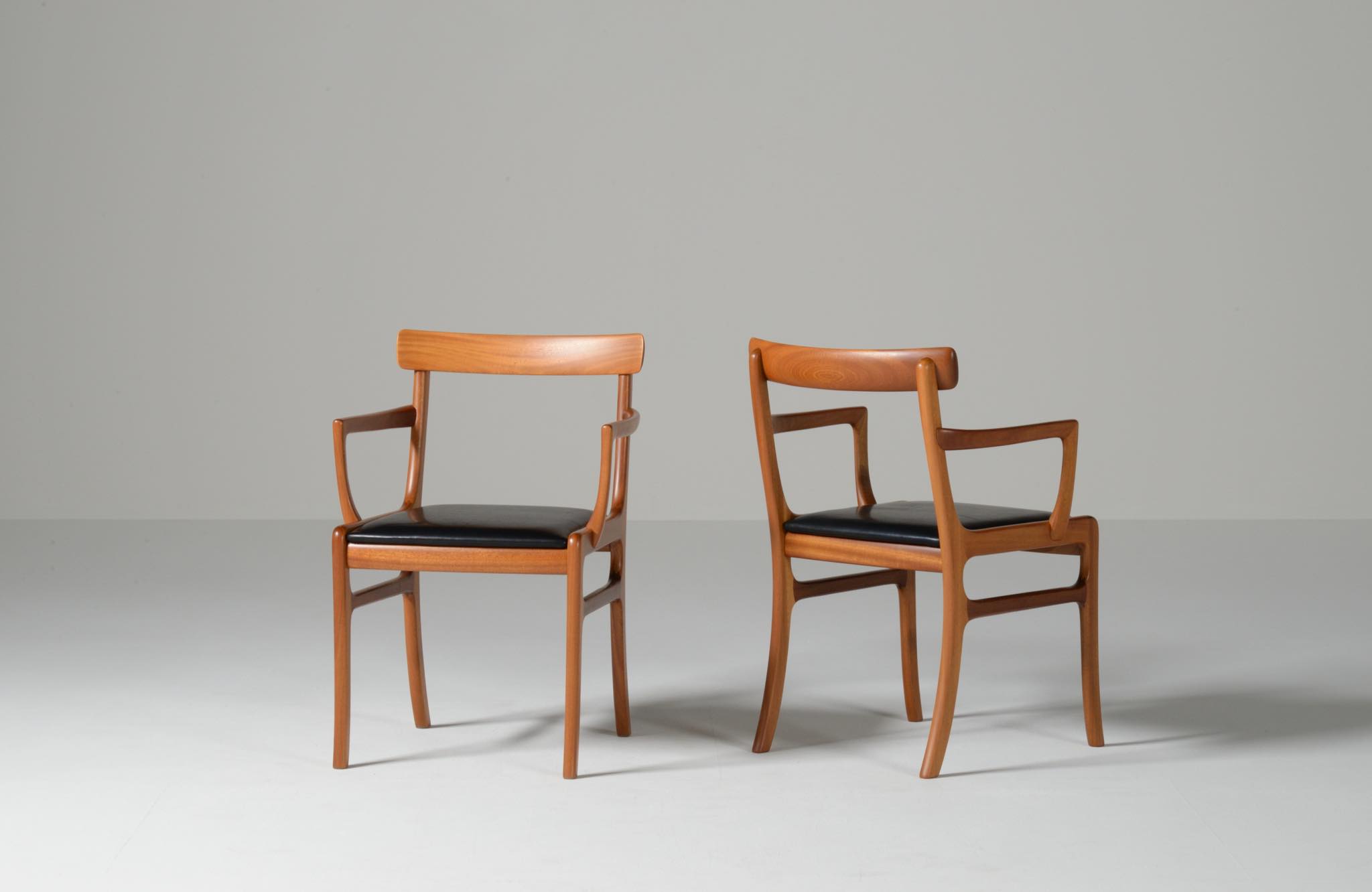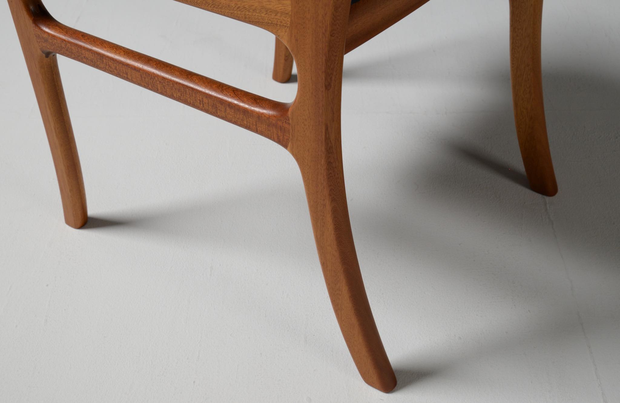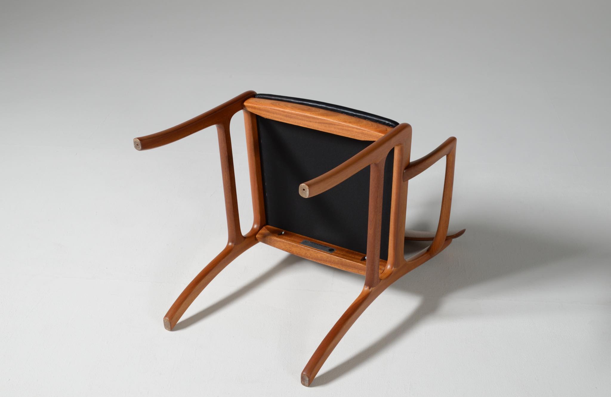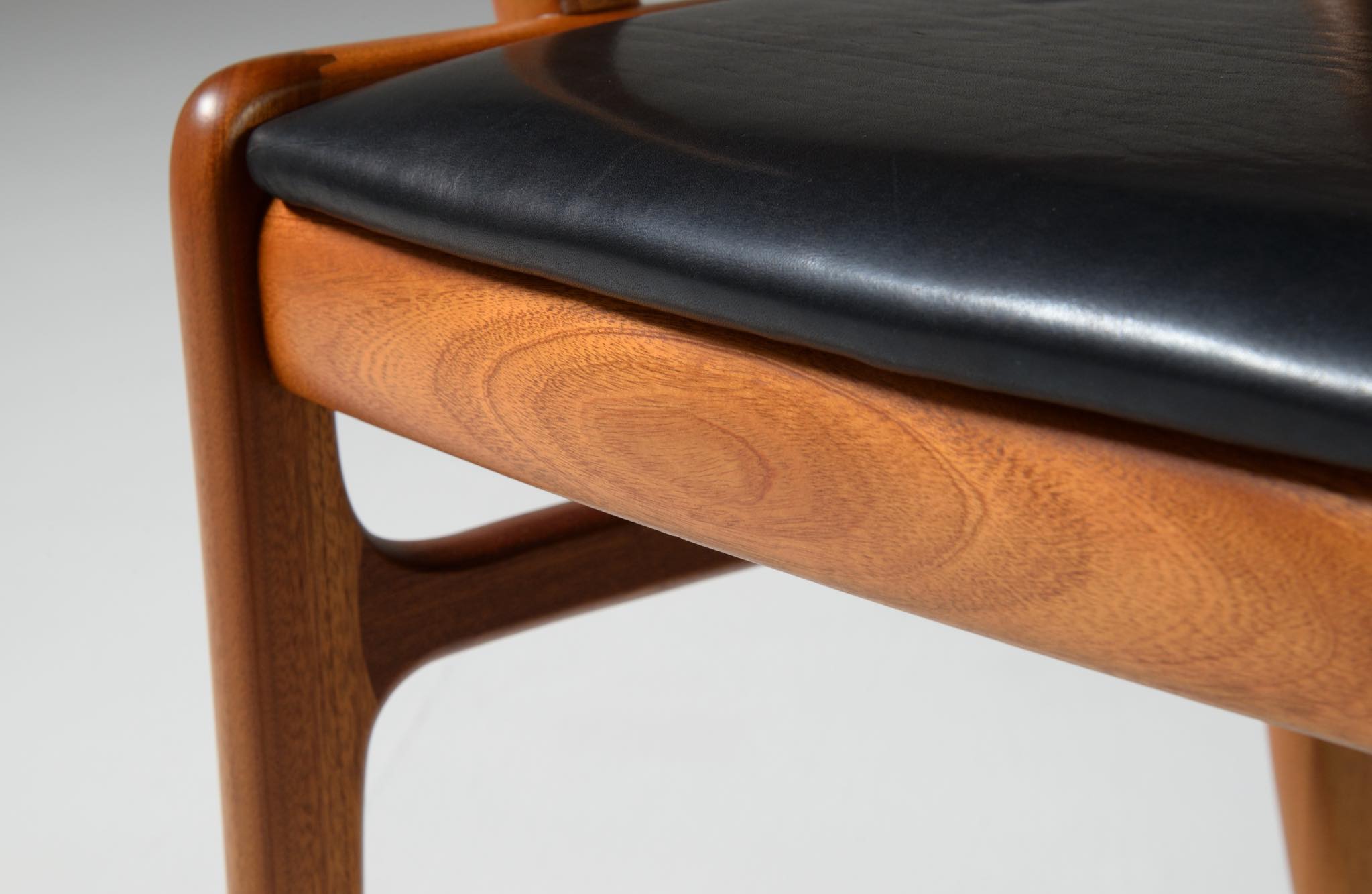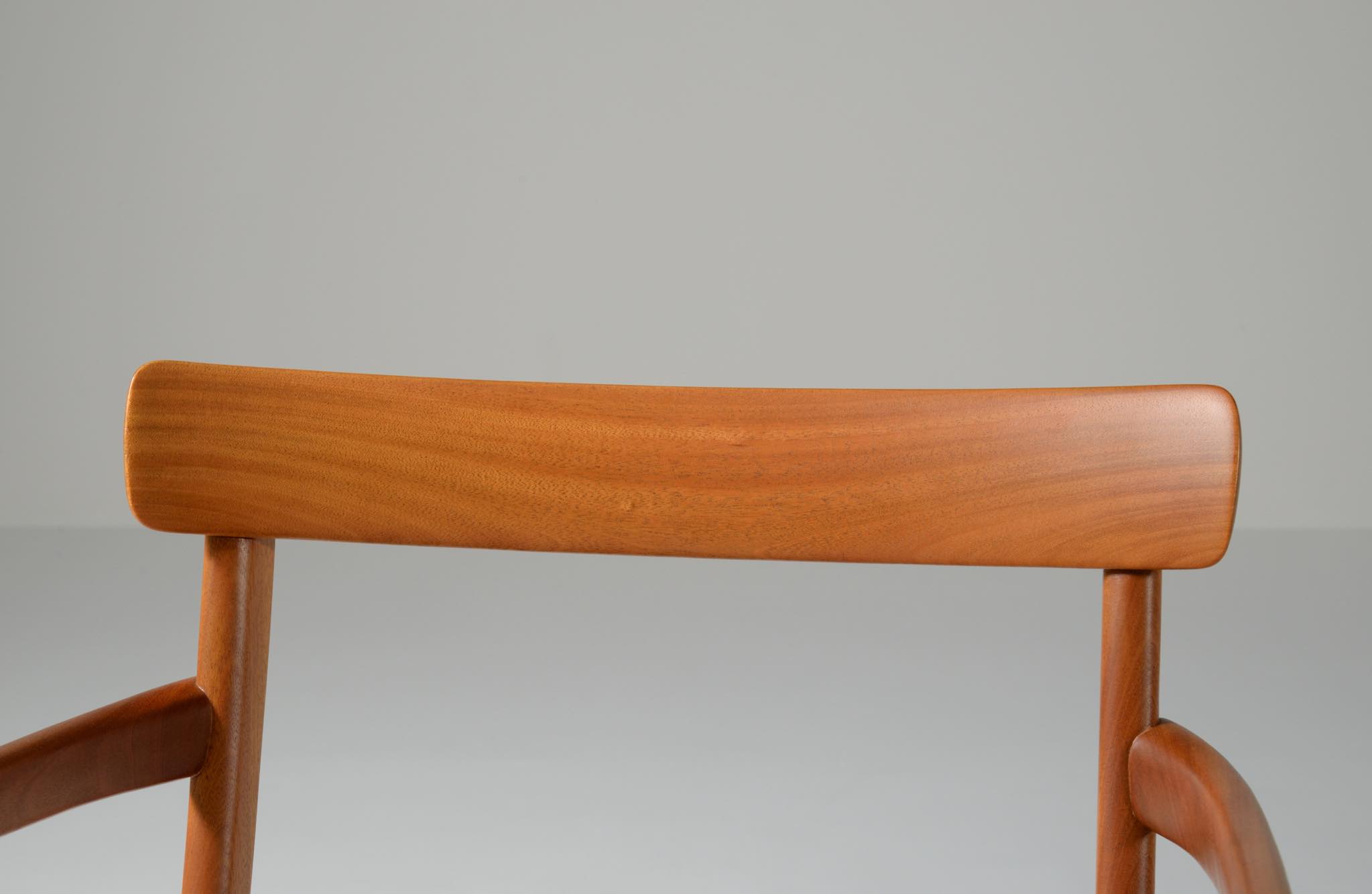 20世紀のデンマークを代表する家具デザイナーで、王立アカデミー家具科の主任教授も務めたオーレ・ヴァンシャーによるダイニングシリーズのアームチェアです。ホンジュラスマホガニーと思しき淡い木目文様の表れた材が用いられており、独特の木目文様が特徴的です。椅子のシートは黒色皮革にて張り替えました。コンディションは良好です。シリーズ名の“Rungstedlund/ルンステッドランド”とは、同じく20世紀のデンマークで活躍した文豪、Baroness Karen von Blixen-Finecke/カレン・ブリクセンの邸宅にちなんで名付けられたもので、クラシックでモダンなデザインは当時人気を博しました。ダイニングの他、サイドボードやカップボードもデザインされています。