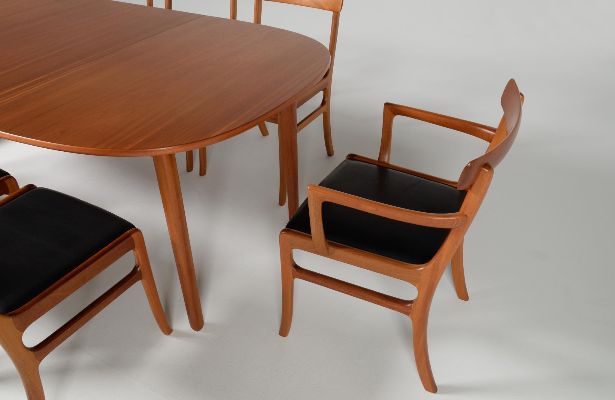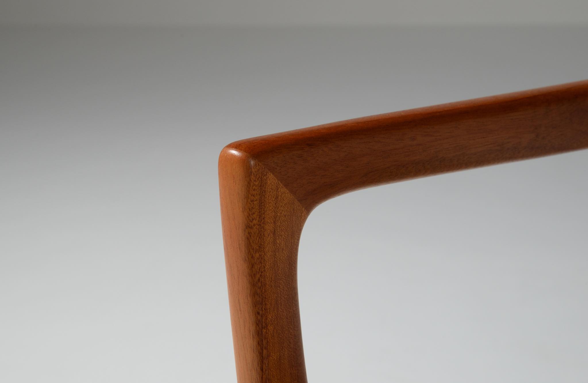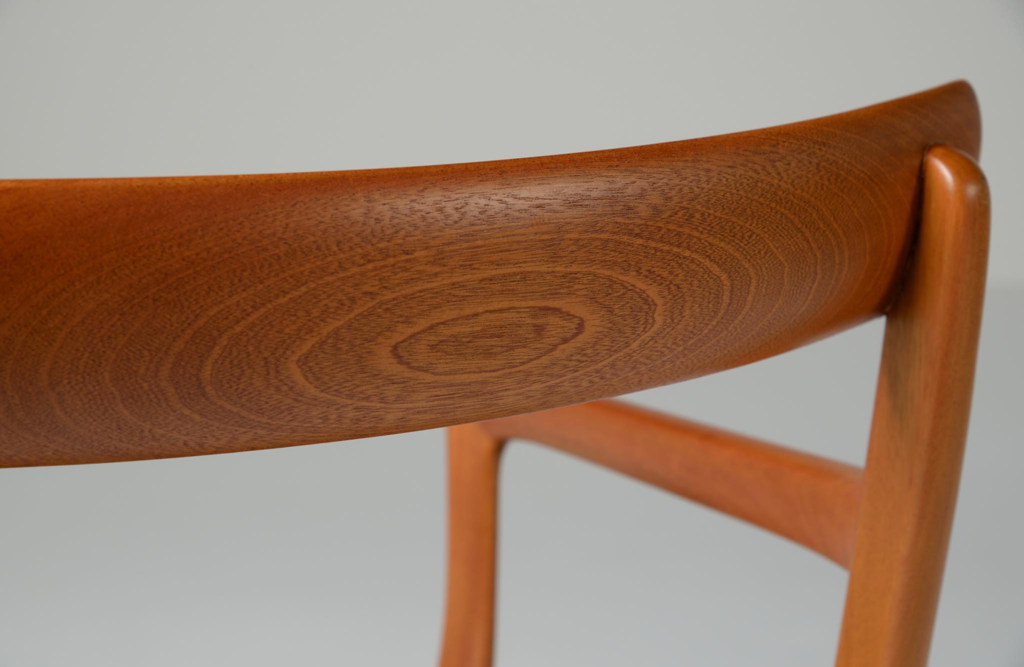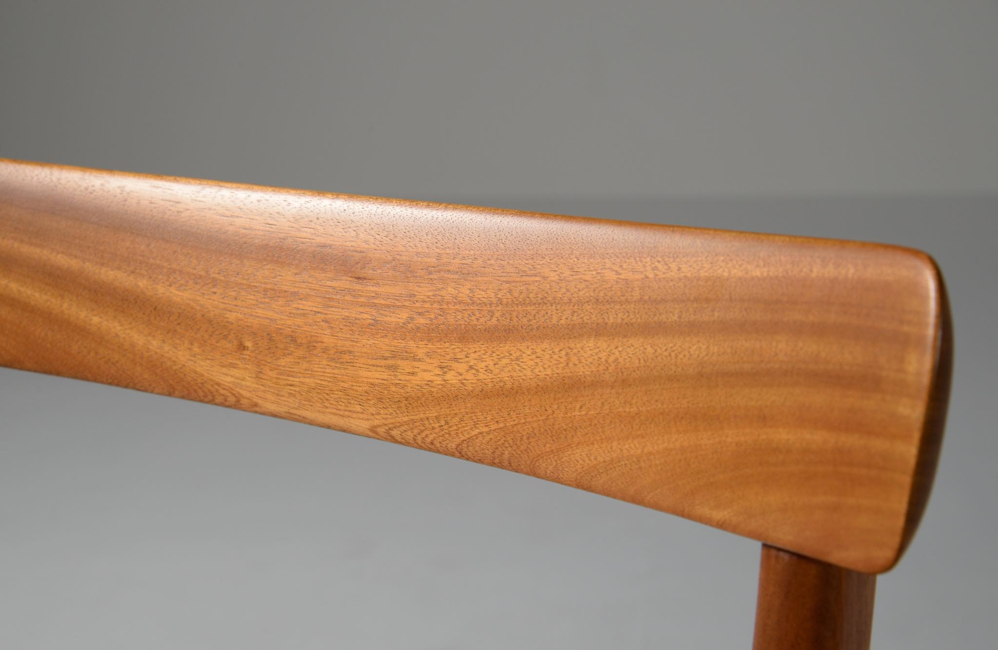 20世紀のデンマークを代表する家具デザイナーで、王立アカデミー家具科の主任教授も務めたオーレ・ヴァンシャーによるダイニングシリーズのアームチェアです。ホンジュラスマホガニーと思しき淡い木目文様の表れた材が用いられており、独特の木目文様が特徴的です。椅子のシートは黒色皮革にて張り替えました。コンディションは良好です。シリーズ名の“Rungstedlund/ルンステッドランド”とは、同じく20世紀のデンマークで活躍した文豪、Baroness Karen von Blixen-Finecke/カレン・ブリクセンの邸宅にちなんで名付けられたもので、クラシックでモダンなデザインは当時人気を博しました。ダイニングの他、サイドボードやカップボードもデザインされています。