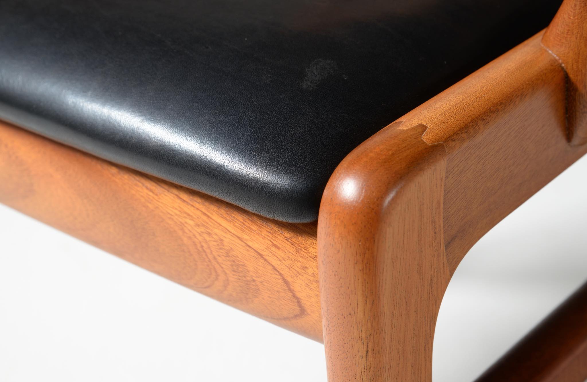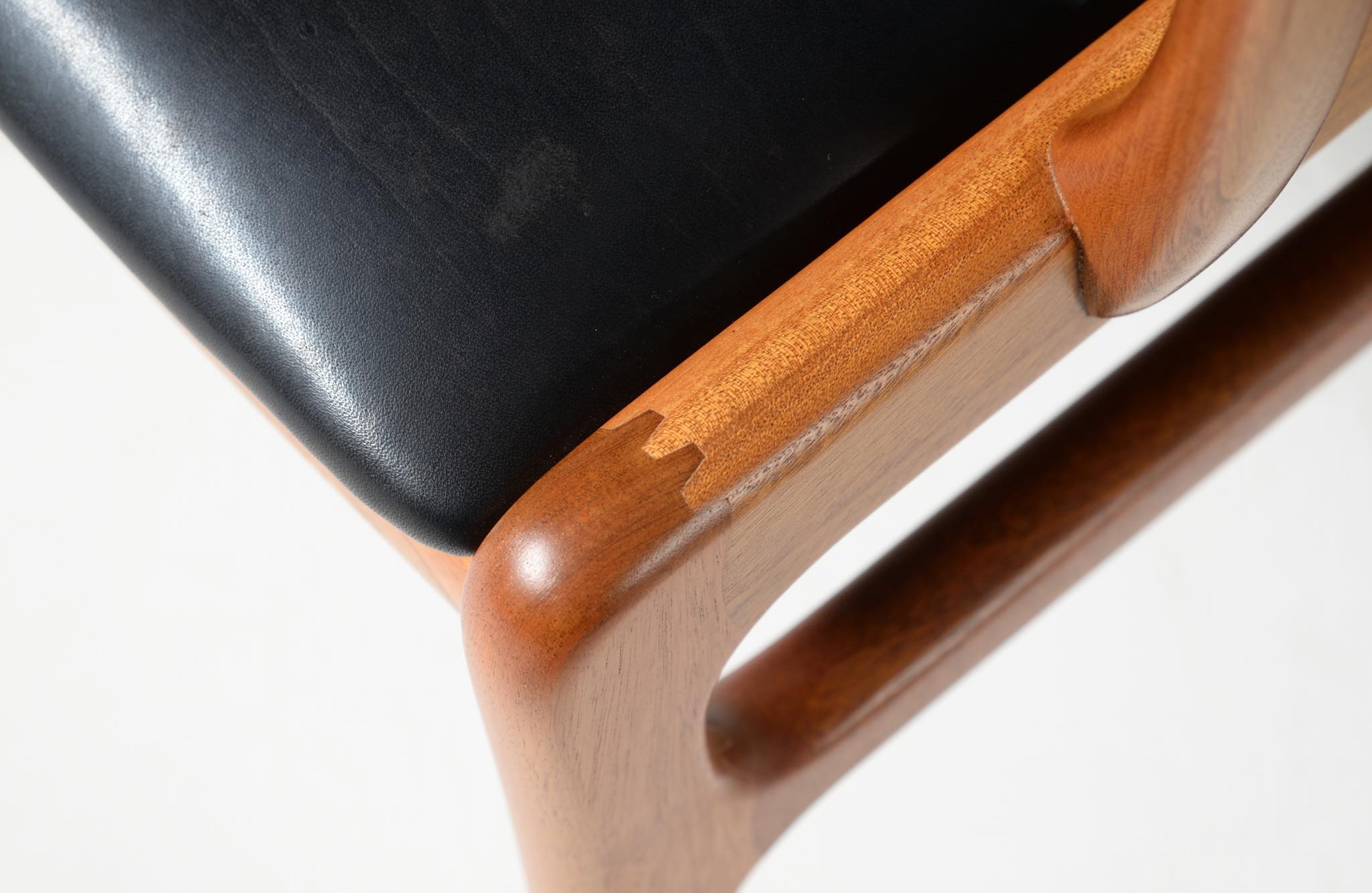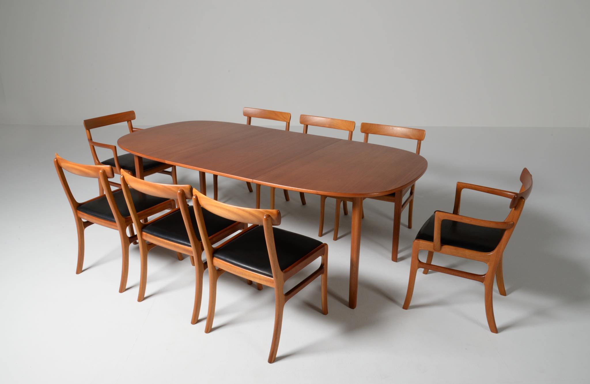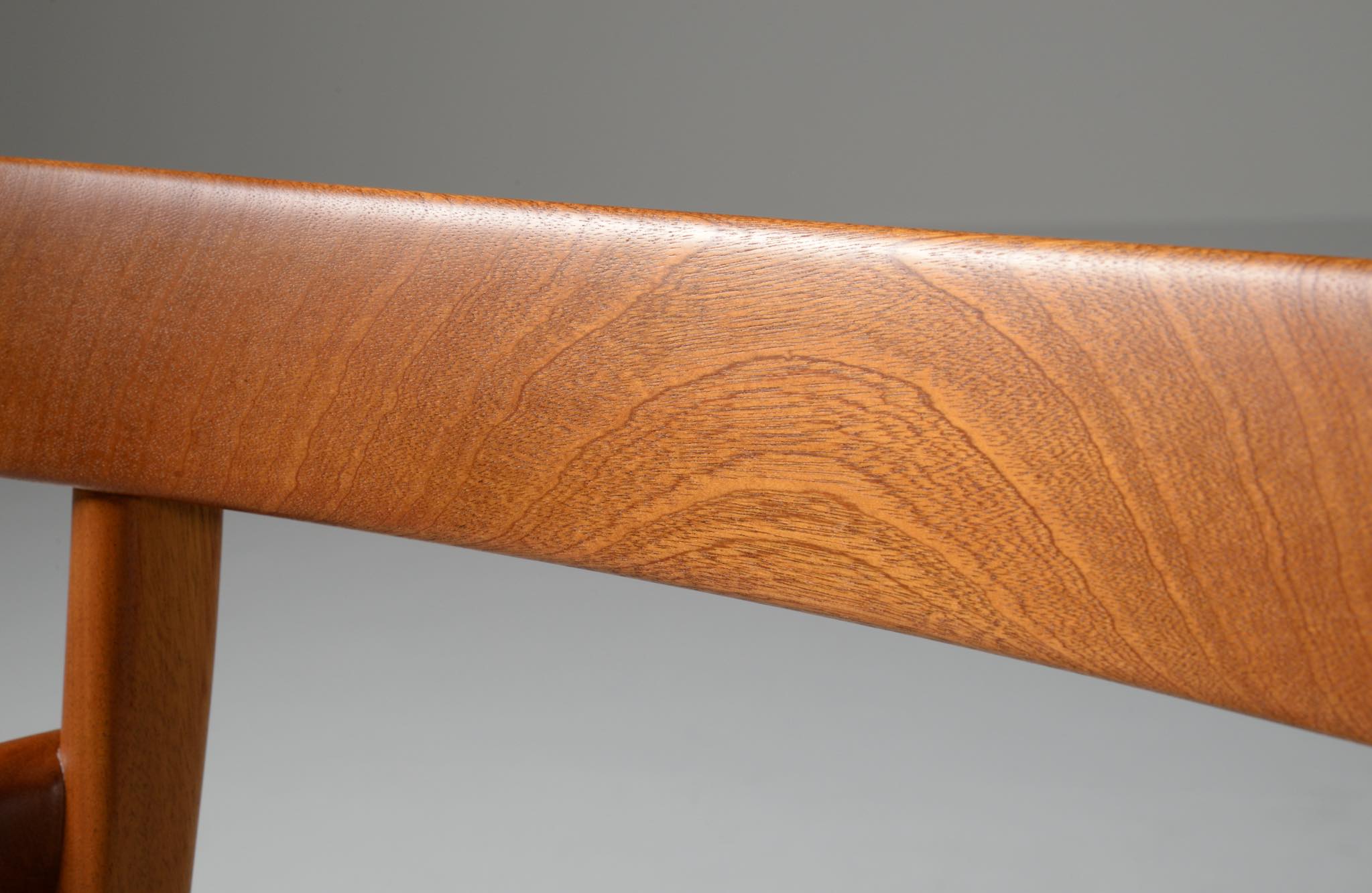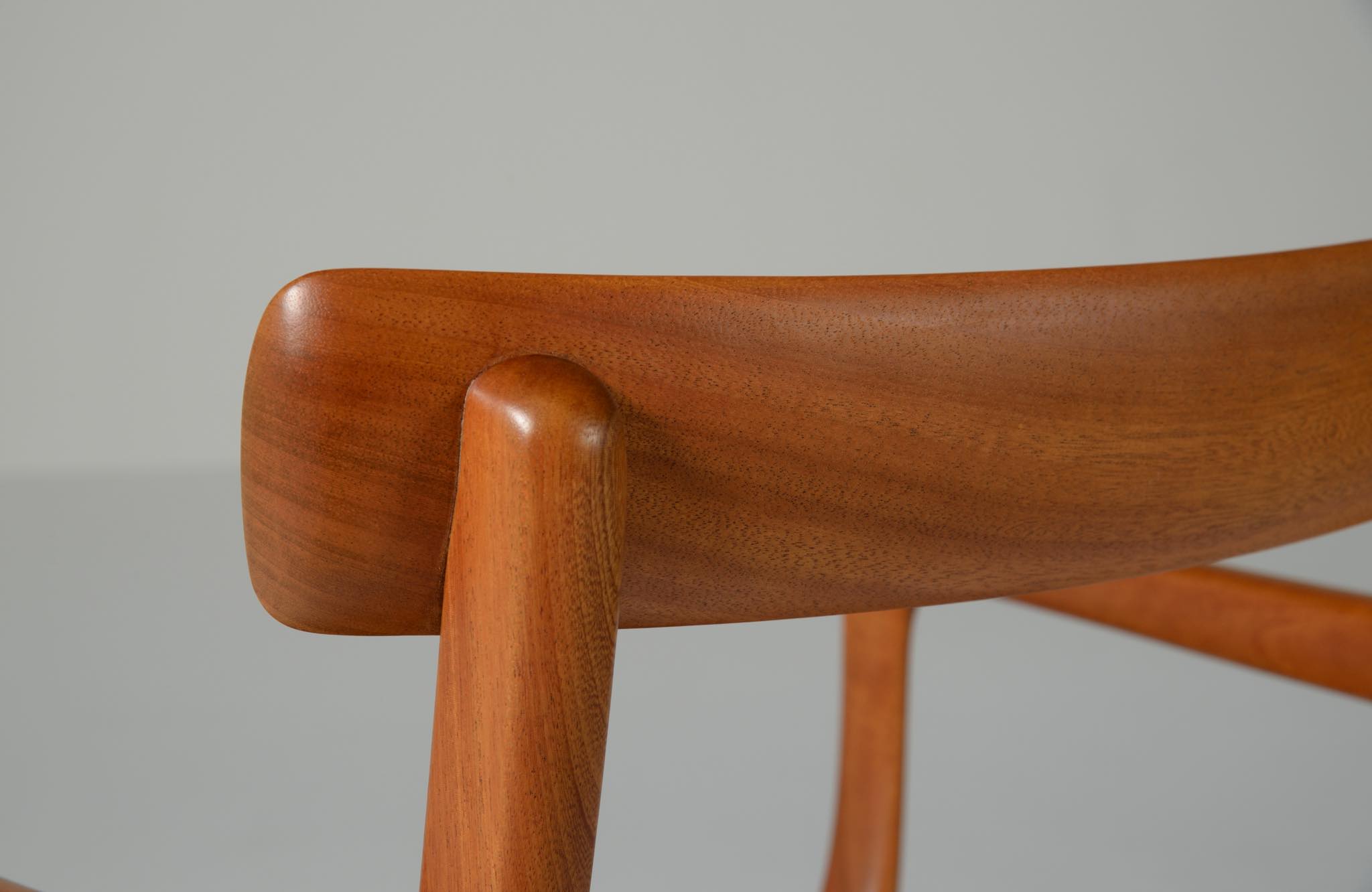 20世紀のデンマークを代表する家具デザイナーで、王立アカデミー家具科の主任教授も務めたオーレ・ヴァンシャーによるダイニングシリーズのアームチェアです。ホンジュラスマホガニーと思しき淡い木目文様の表れた材が用いられており、独特の木目文様が特徴的です。椅子のシートは黒色皮革にて張り替えました。コンディションは良好です。シリーズ名の“Rungstedlund/ルンステッドランド”とは、同じく20世紀のデンマークで活躍した文豪、Baroness Karen von Blixen-Finecke/カレン・ブリクセンの邸宅にちなんで名付けられたもので、クラシックでモダンなデザインは当時人気を博しました。ダイニングの他、サイドボードやカップボードもデザインされています。