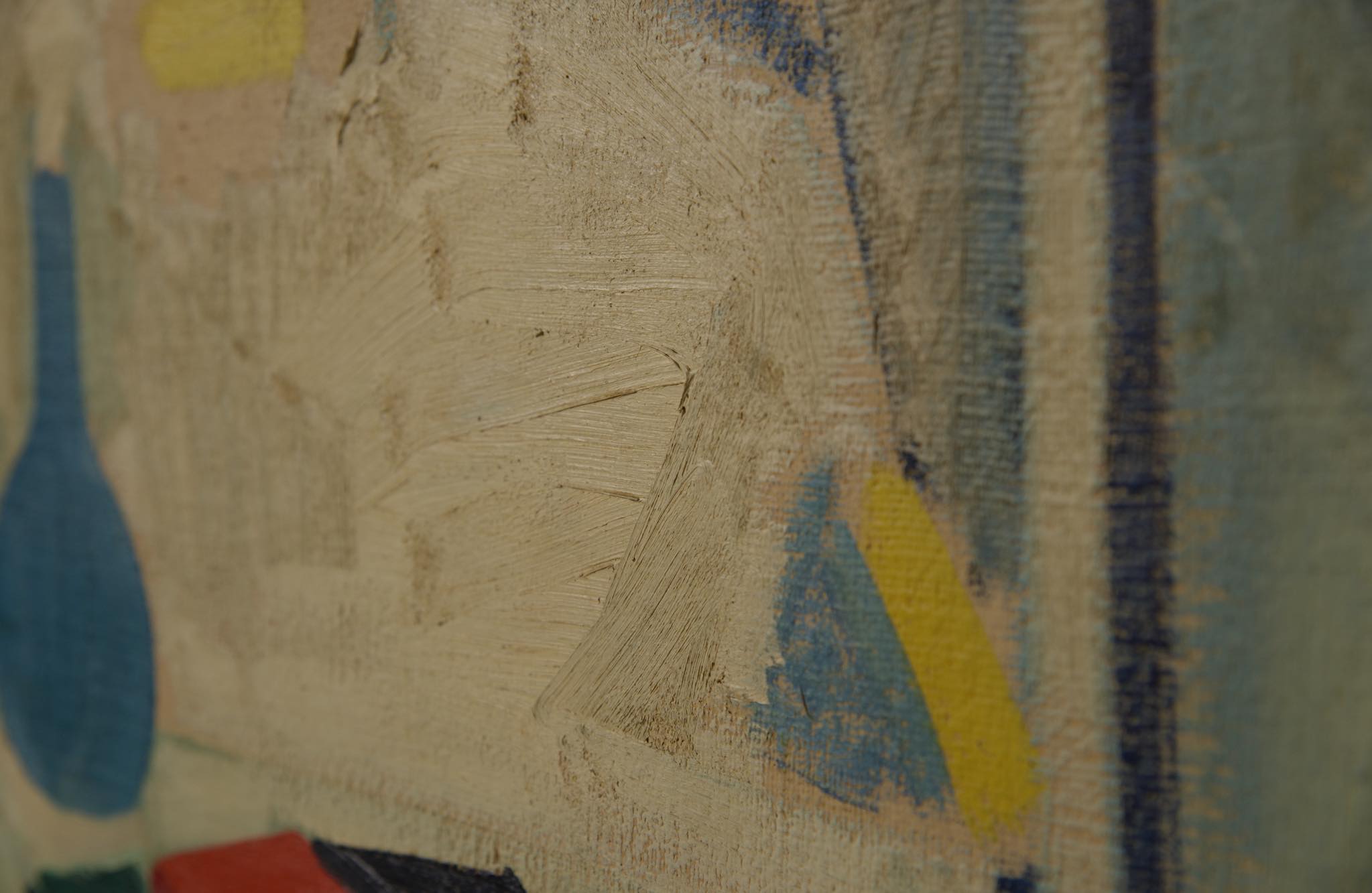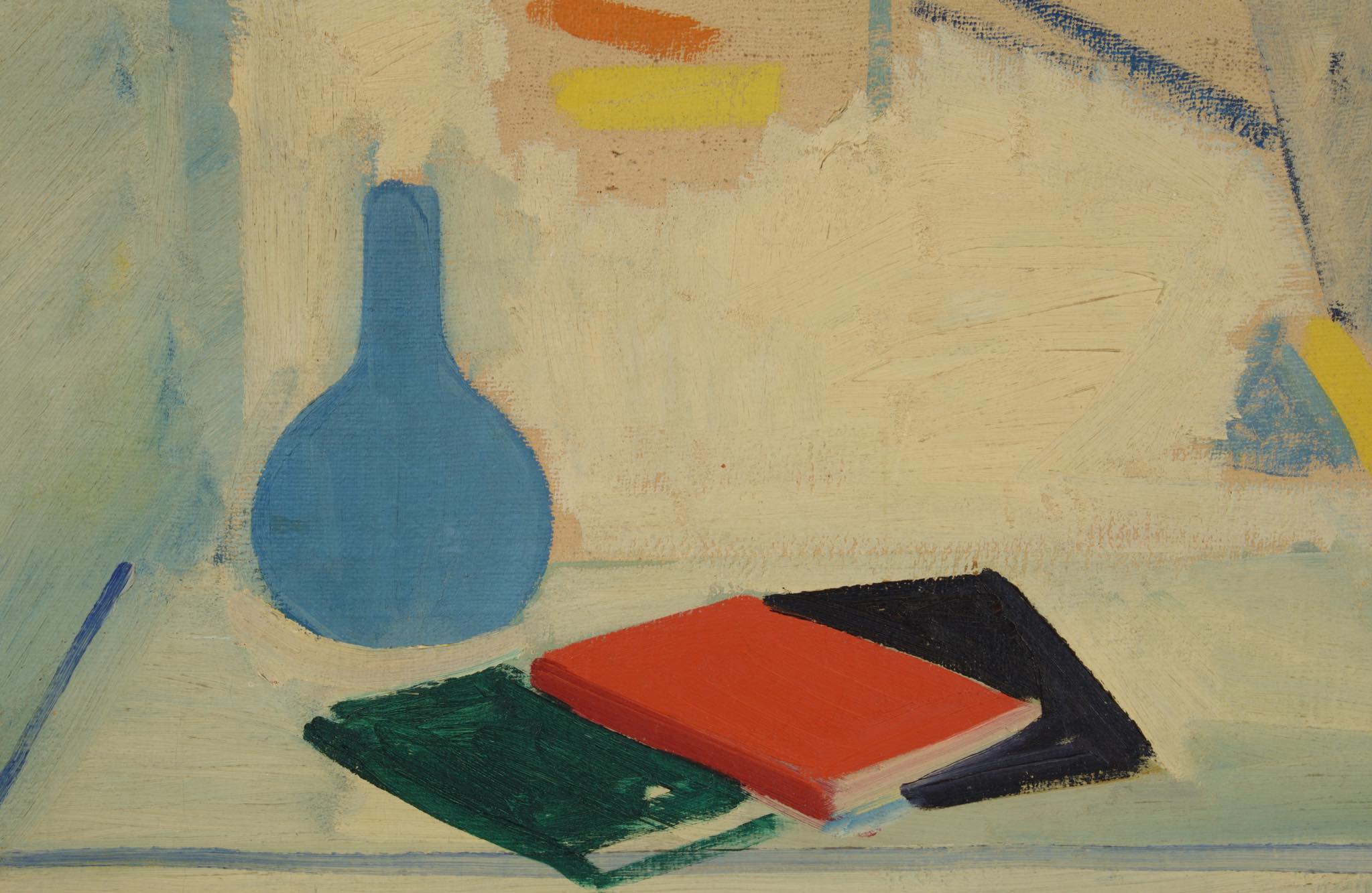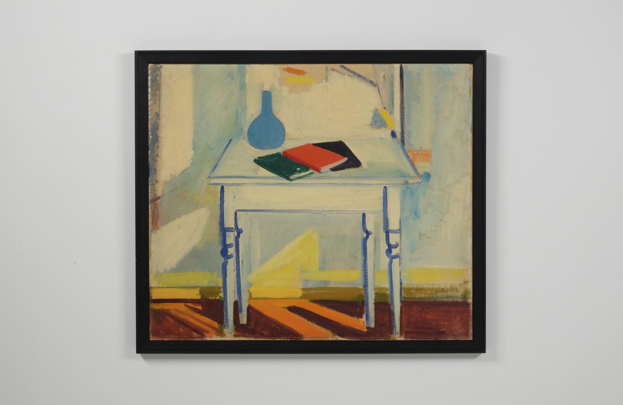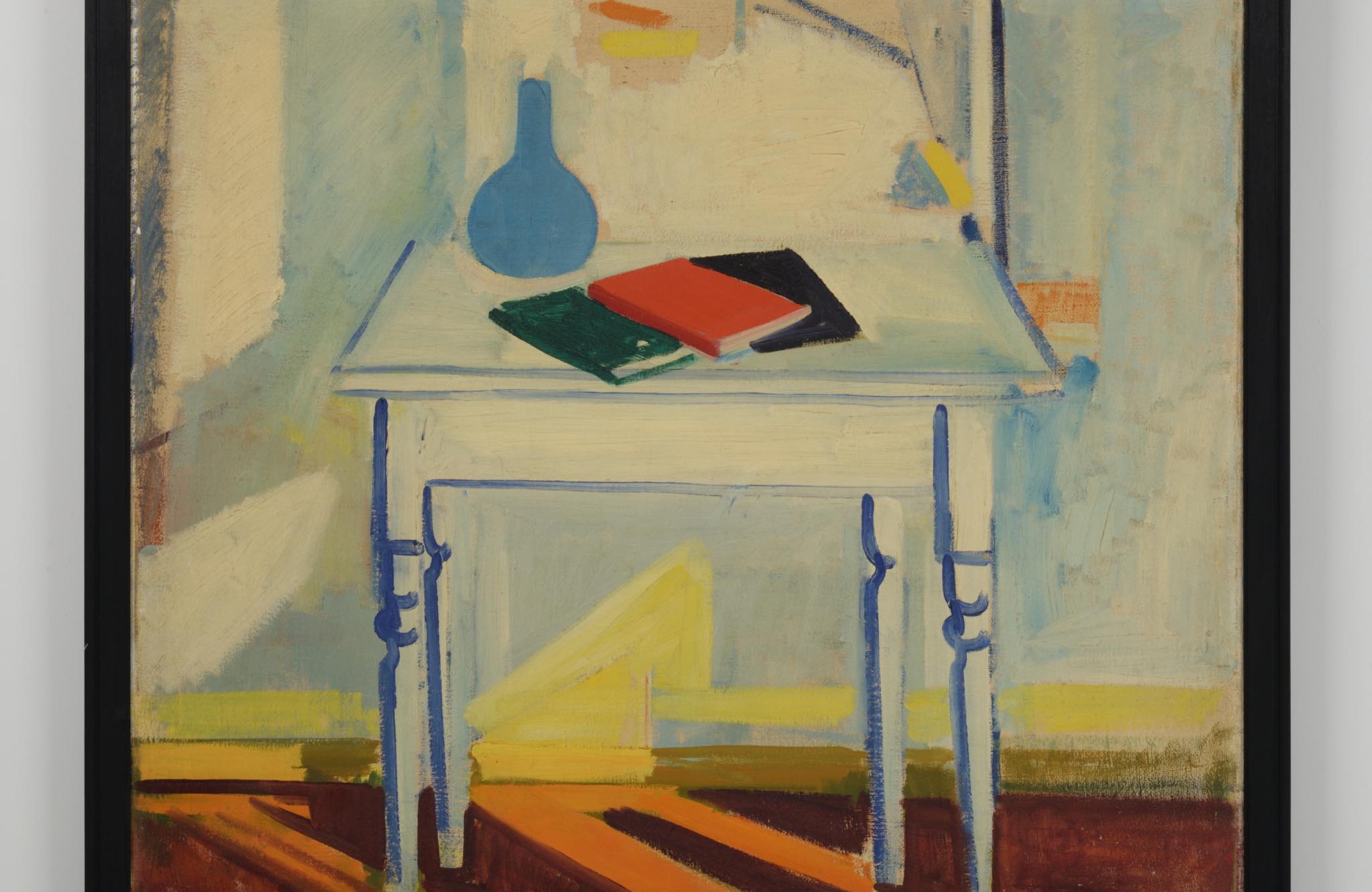 20世紀前葉に活躍したデンマークの画家、Axel Bentzen/アクセル・ベンツェンによる大振りな油彩静物画作品です。1944年に描かれたもので、西陽の差し込む室内に置かれたテーブルと、その卓上の静物が独自の筆致で描かれています。濃紺色で染めた木製フレームにて整えました。コンディションは良好です。