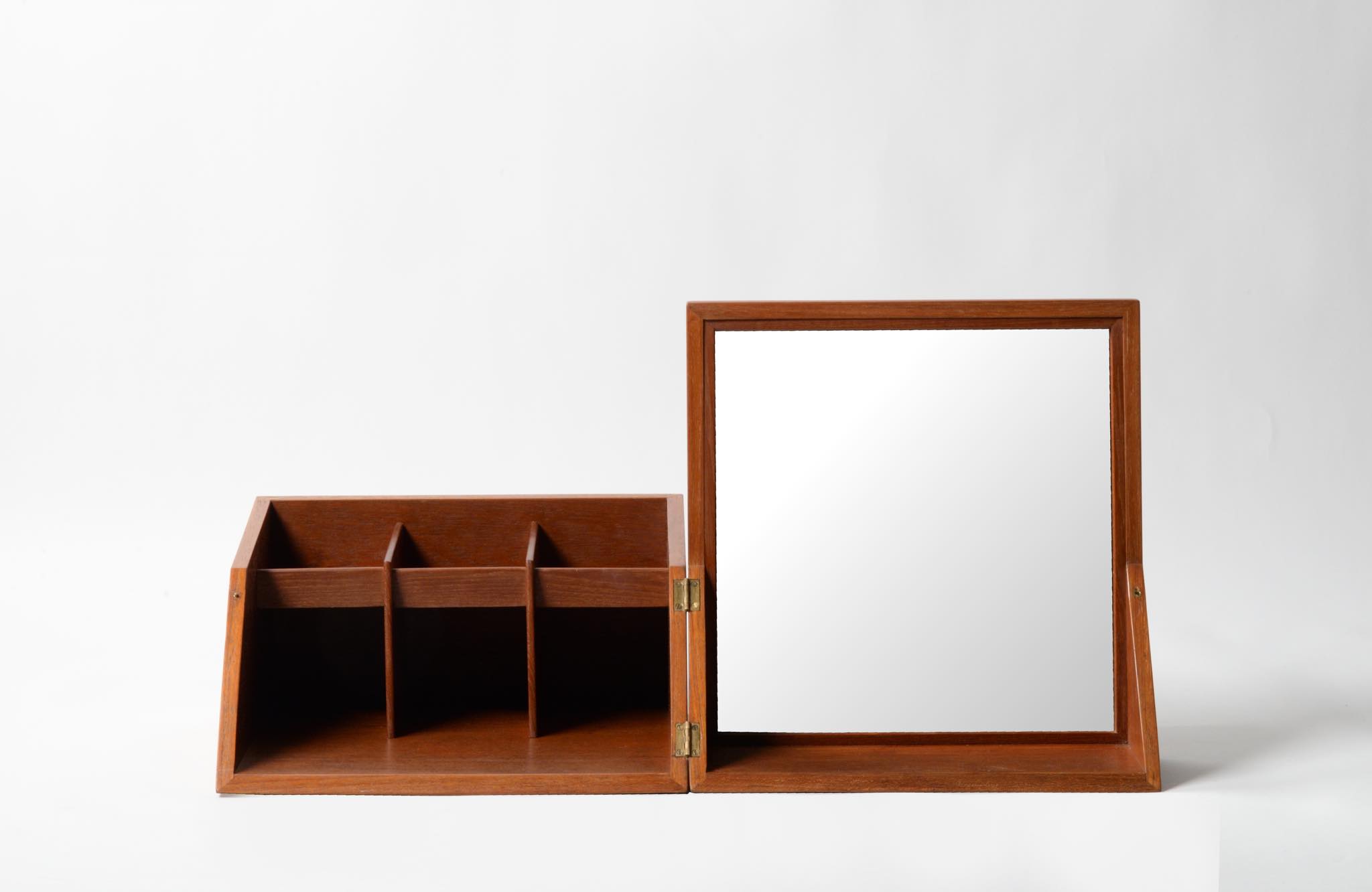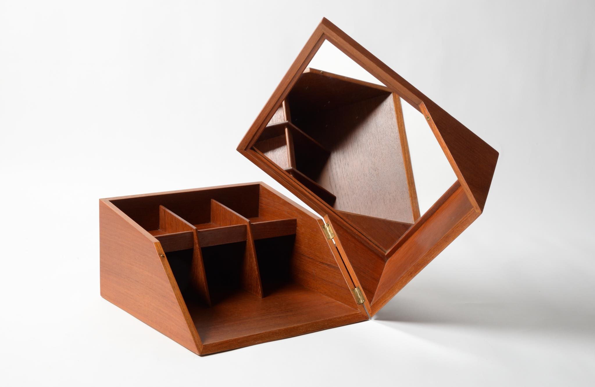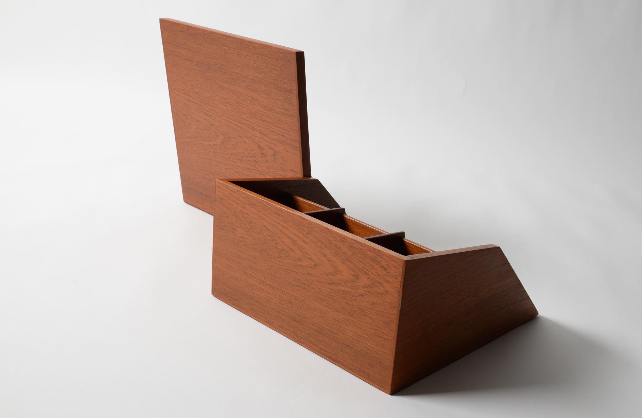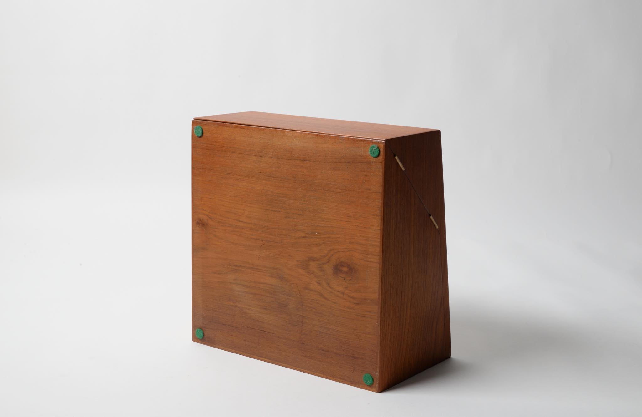 デンマークのデザイナーユニット、Andreasen & Ingemann Hansen/アンドレアセン & インゲマン・ハンセンによってデザインされたヴァニティーボックスです。1955年にコペンハーゲンで開催された家具の展示会「Dansk Møbelkunst gennem」へ出品され、展示会を訪問したイングリッド王女がローズウッドのタイプを購入した記録があります。こちらはチーク材で作られたもので、指物工芸と云える精巧な作りのものです。コンディションは良好です。