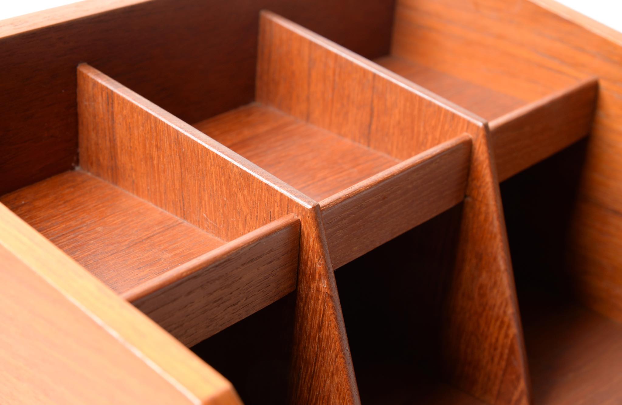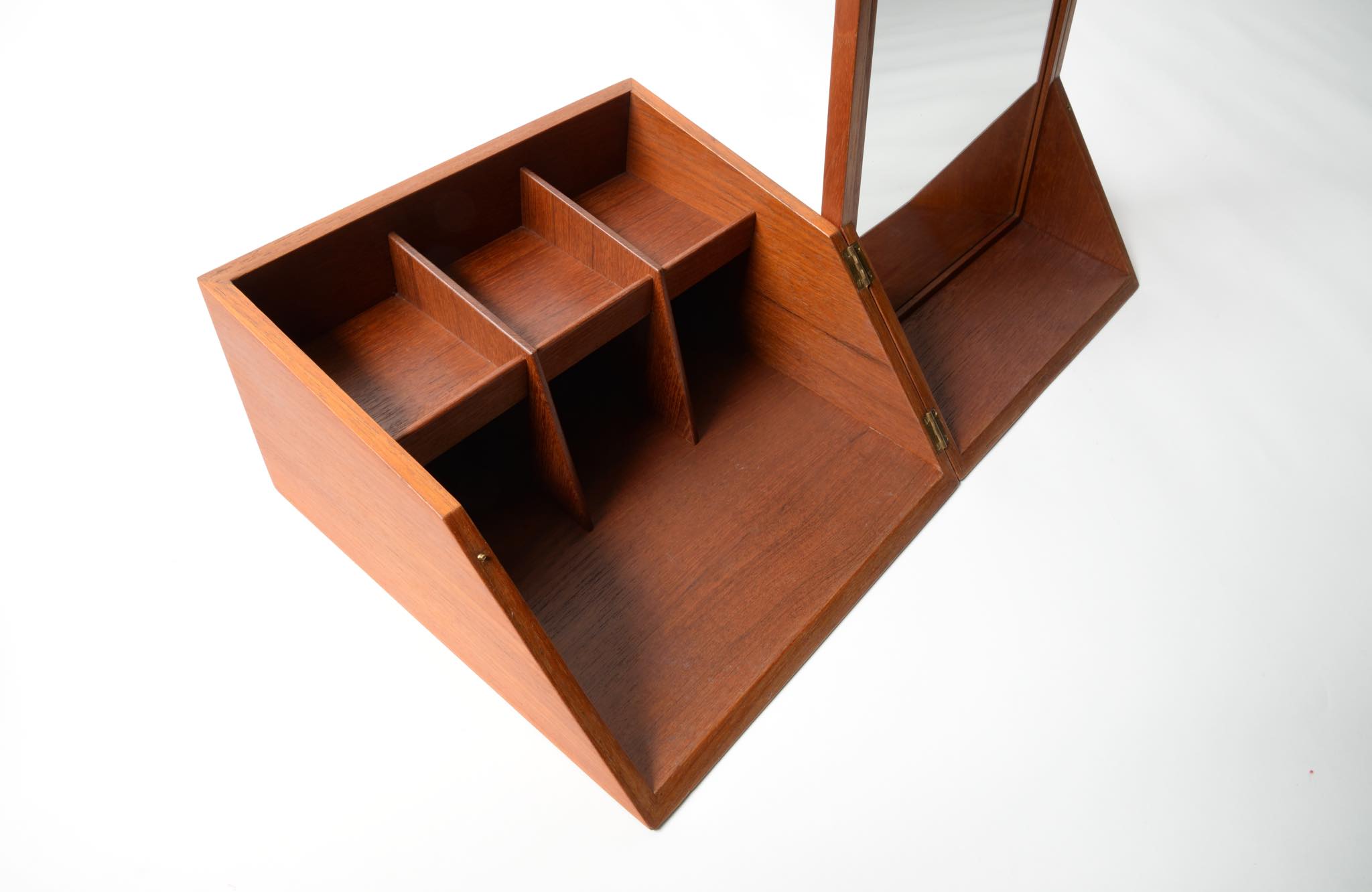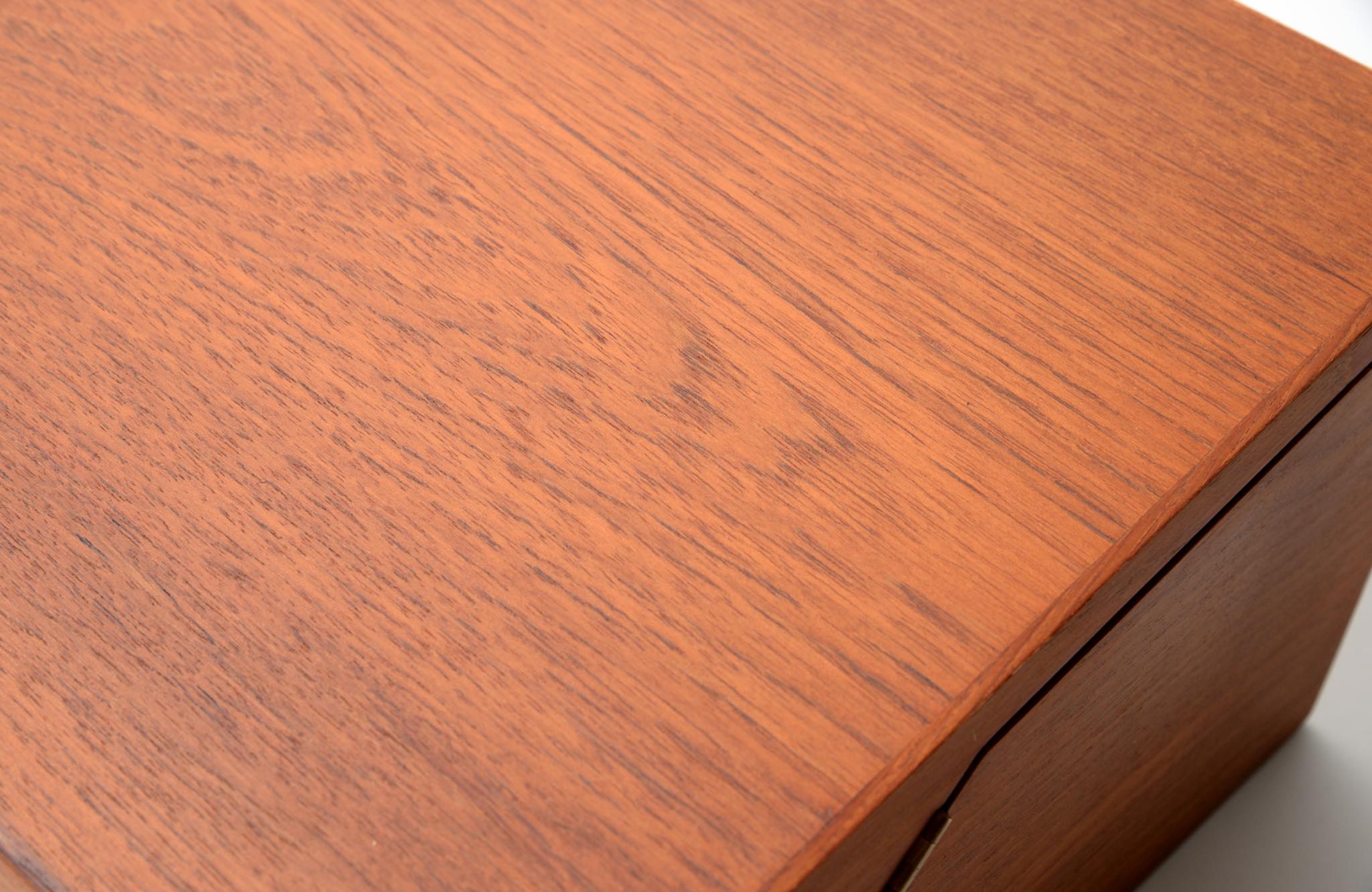 デンマークのデザイナーユニット、Andreasen & Ingemann Hansen/アンドレアセン & インゲマン・ハンセンによってデザインされたヴァニティーボックスです。1955年にコペンハーゲンで開催された家具の展示会「Dansk Møbelkunst gennem」へ出品され、展示会を訪問したイングリッド王女がローズウッドのタイプを購入した記録があります。こちらはチーク材で作られたもので、指物工芸と云える精巧な作りのものです。コンディションは良好です。