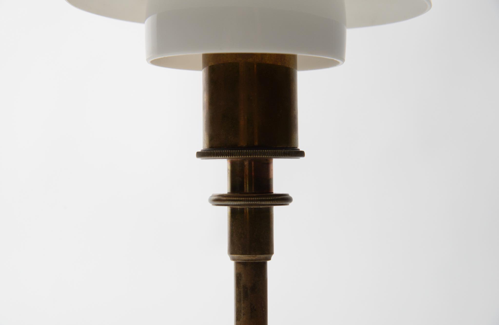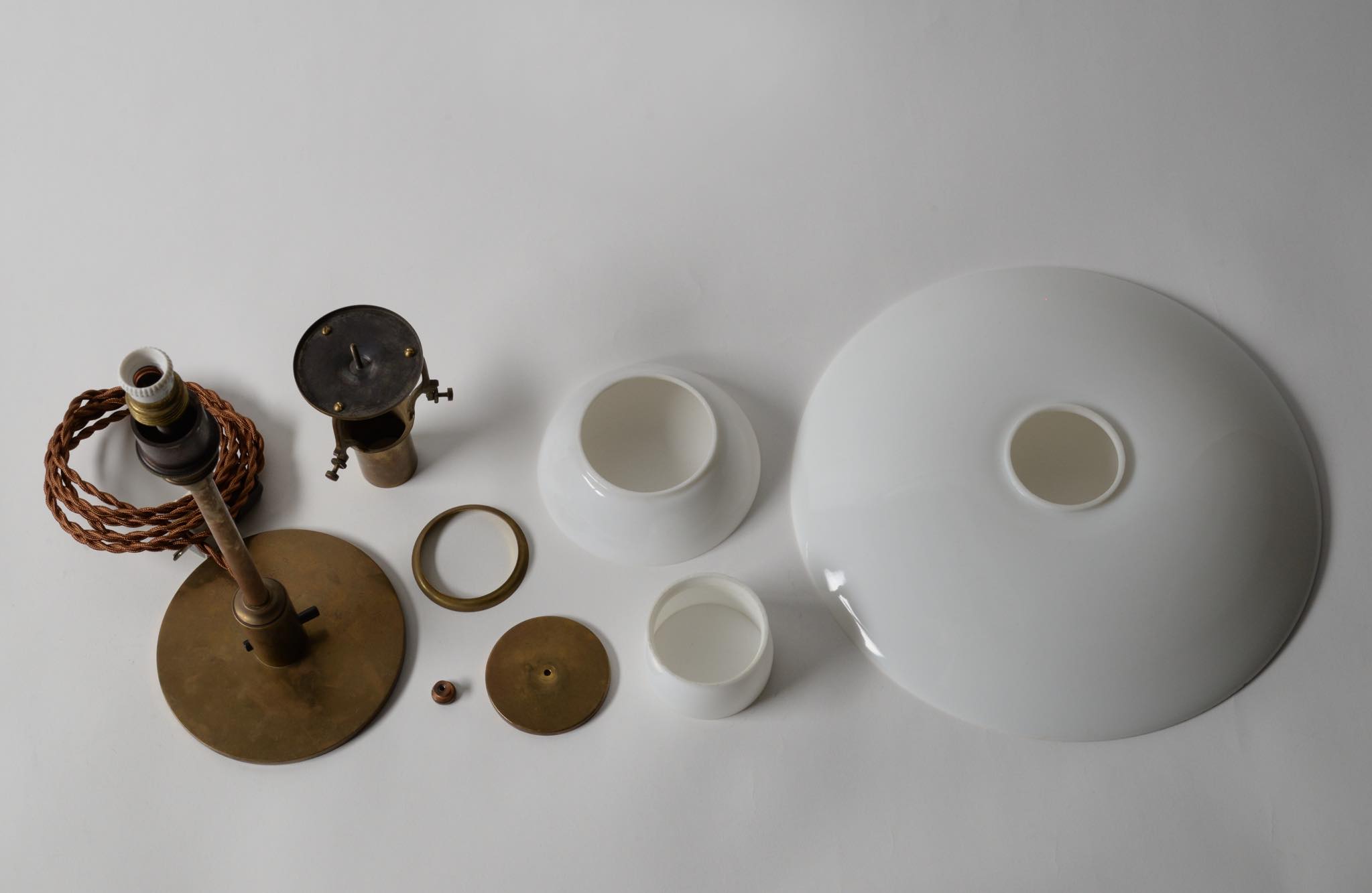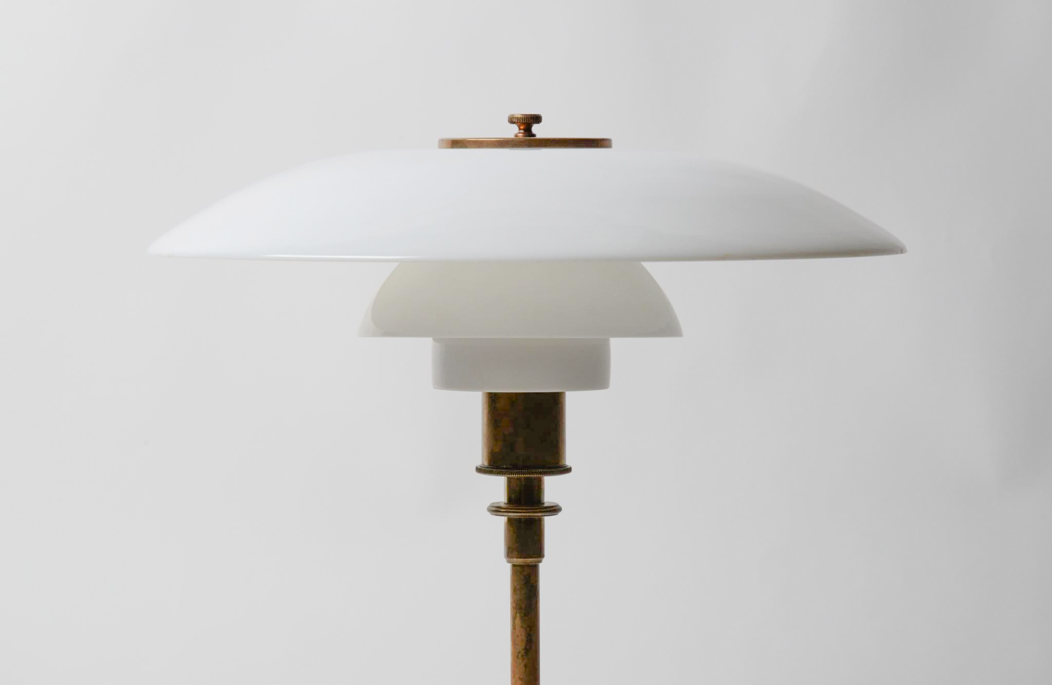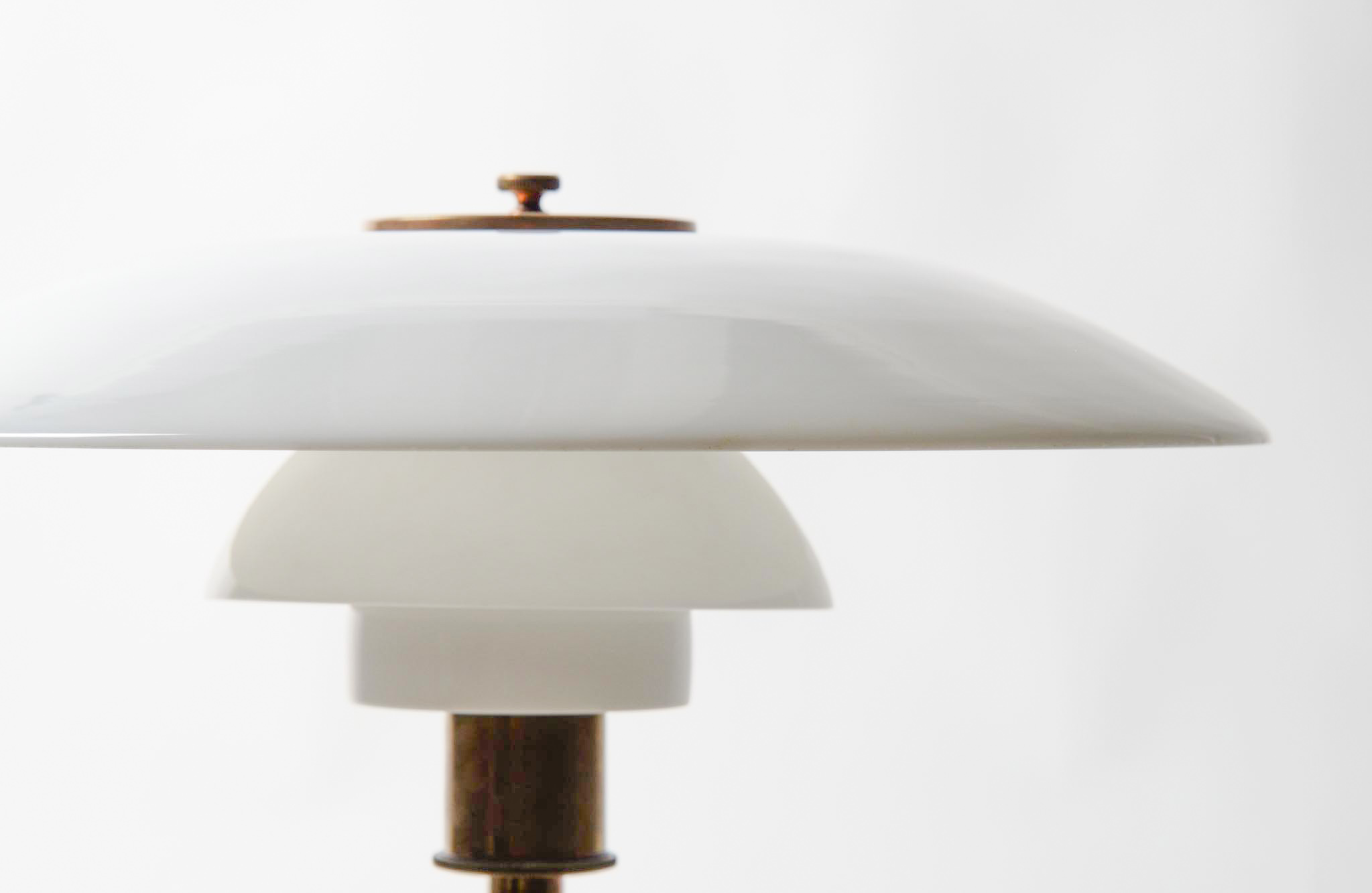 デンマークを代表するデザイナーのPoul Henningsen/ポール・ヘニングセンによるPH3/2テーブルランプです。真鍮のフレームに単層オパールガラスシェードの組み合わせで、1930年代に作られたものです。オパールガラスとはオパールセントガラスとも呼ばれ、ガラス原料に豚などの動物の骨灰を混ぜて成型、急冷と再加熱によってできる半透明な乳白ガラスの総称で、光を通すとくすんだ赤色を呈します。オパールガラスは19世紀にティファニーが開発したという説もあり、20世紀初頭にはルネ・ラリックらの作家が多用、1930年代には世界的に流行しました。また、フレームは真鍮で作られたもので、経年変色は取り除いておりません。コンディションは良好です。