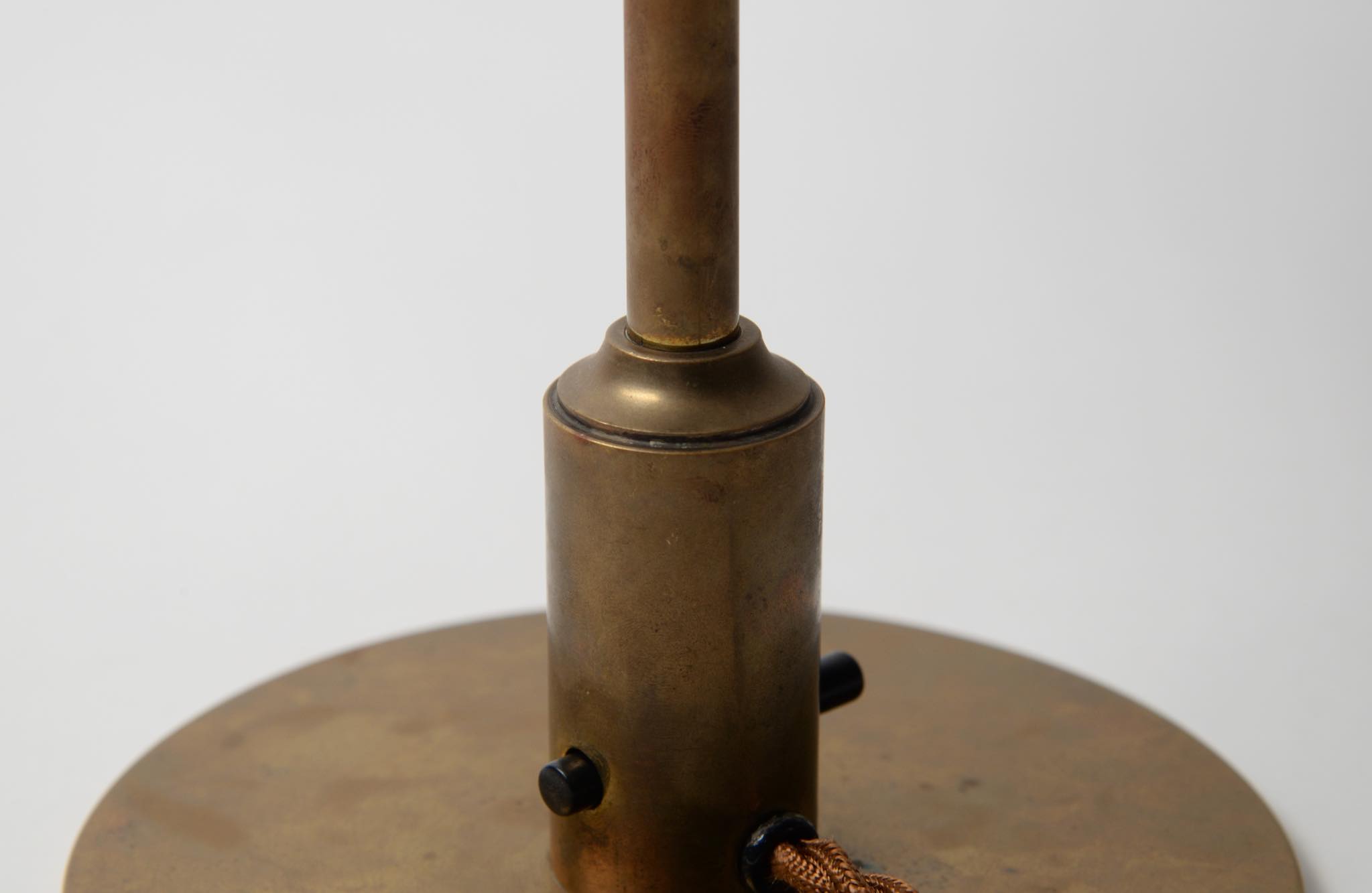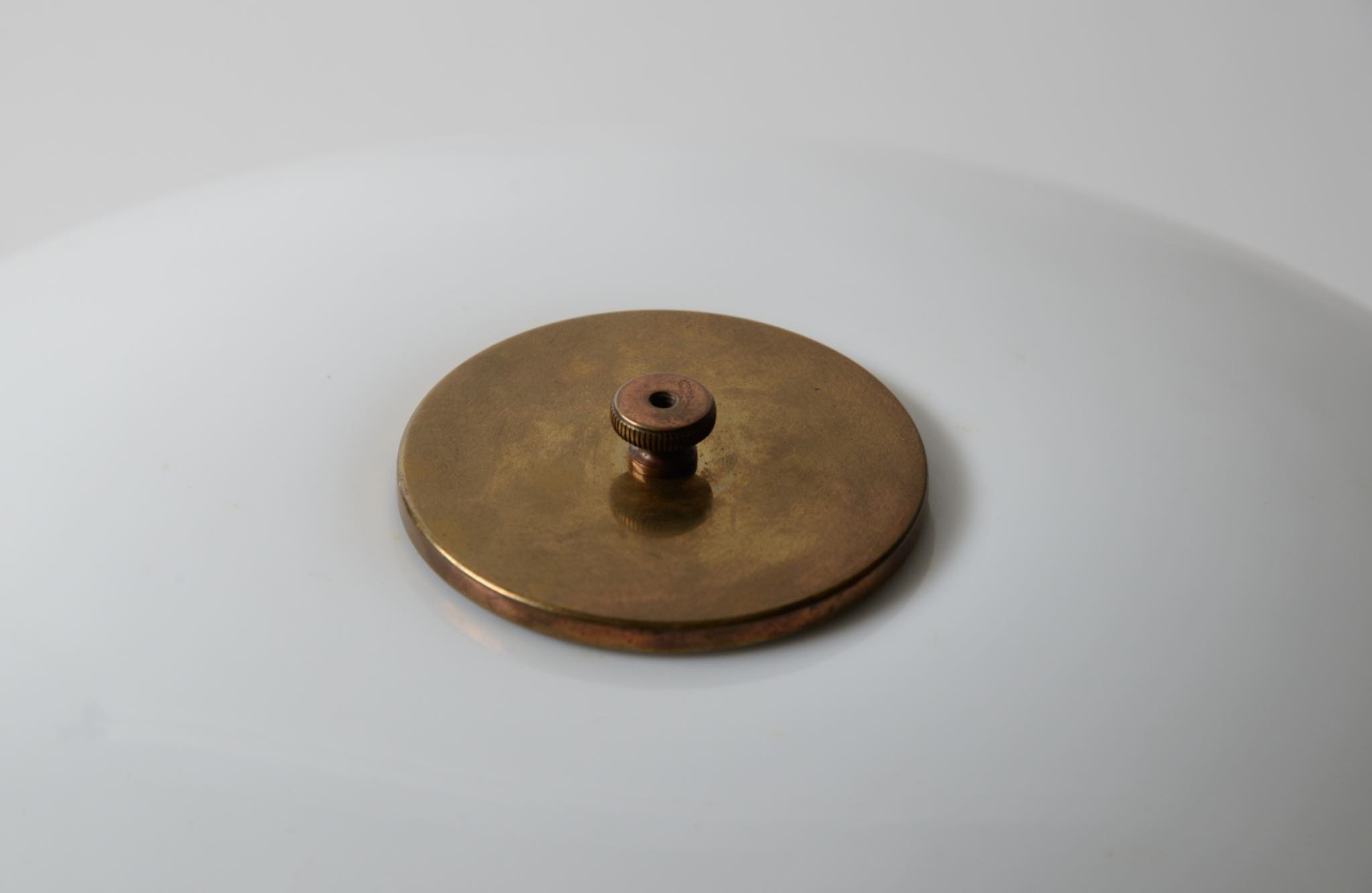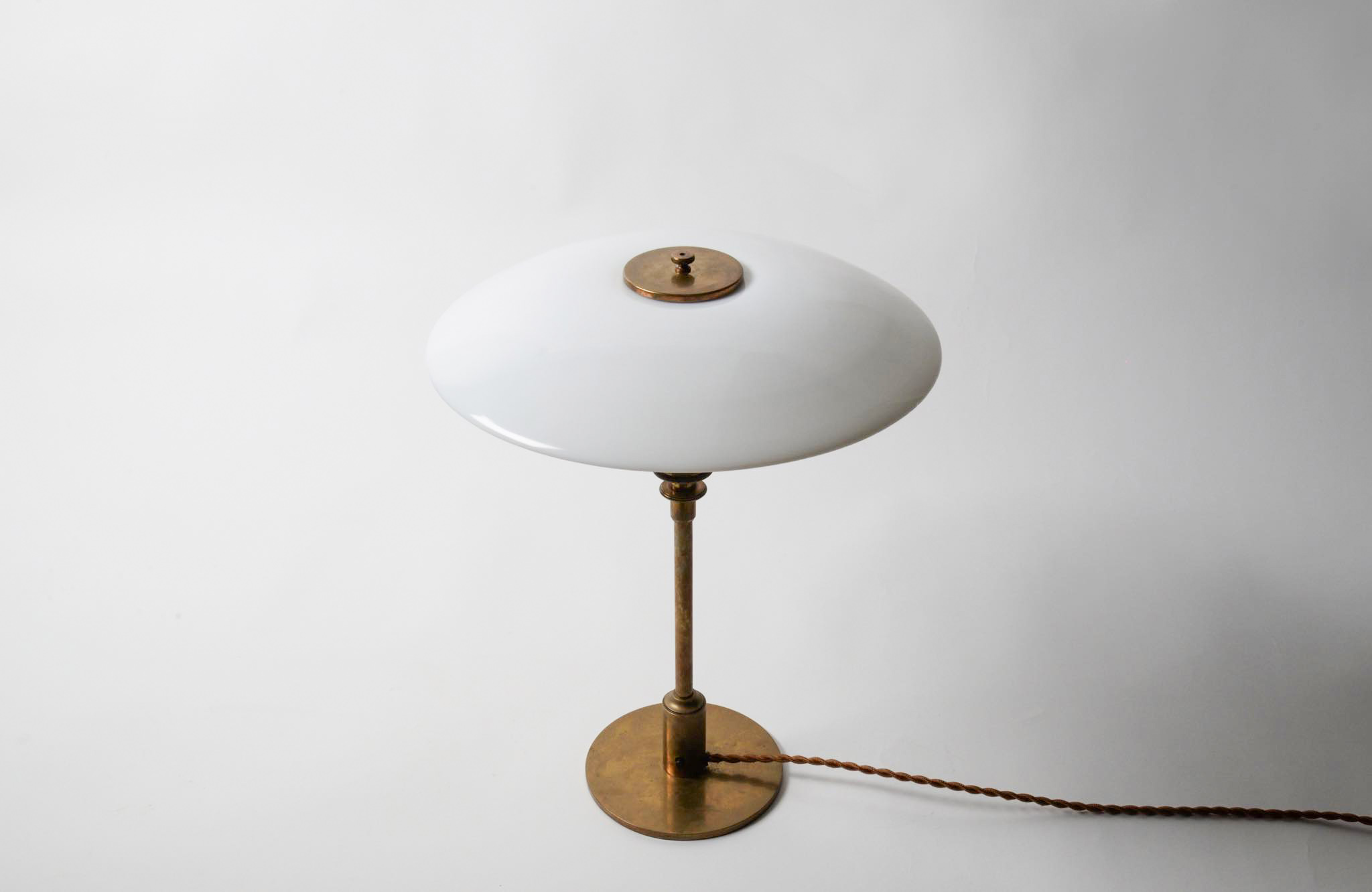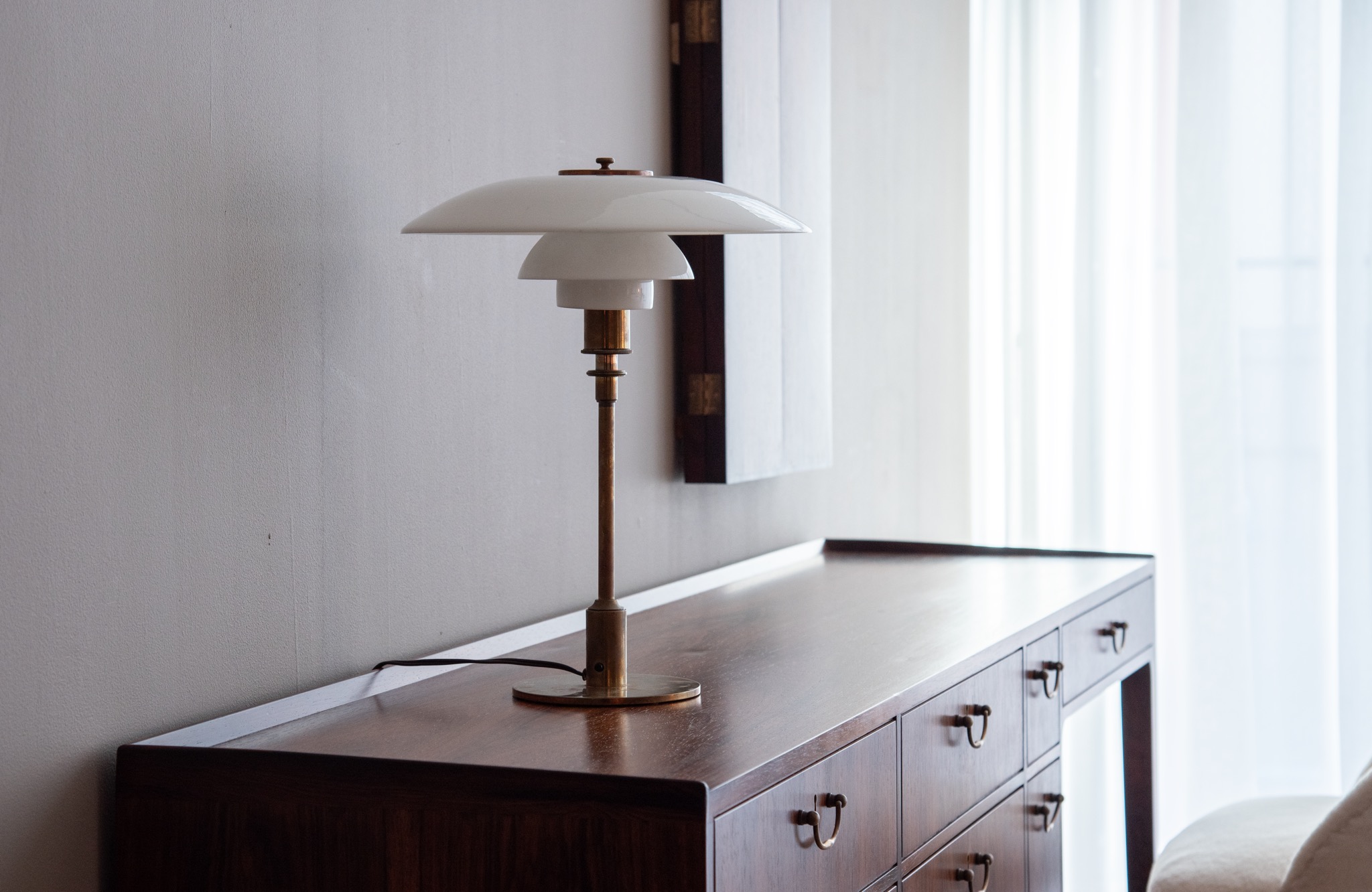 デンマークを代表するデザイナーのPoul Henningsen/ポール・ヘニングセンによるPH3/2テーブルランプです。真鍮のフレームに単層オパールガラスシェードの組み合わせで、1930年代に作られたものです。オパールガラスとはオパールセントガラスとも呼ばれ、ガラス原料に豚などの動物の骨灰を混ぜて成型、急冷と再加熱によってできる半透明な乳白ガラスの総称で、光を通すとくすんだ赤色を呈します。オパールガラスは19世紀にティファニーが開発したという説もあり、20世紀初頭にはルネ・ラリックらの作家が多用、1930年代には世界的に流行しました。また、フレームは真鍮で作られたもので、経年変色は取り除いておりません。コンディションは良好です。