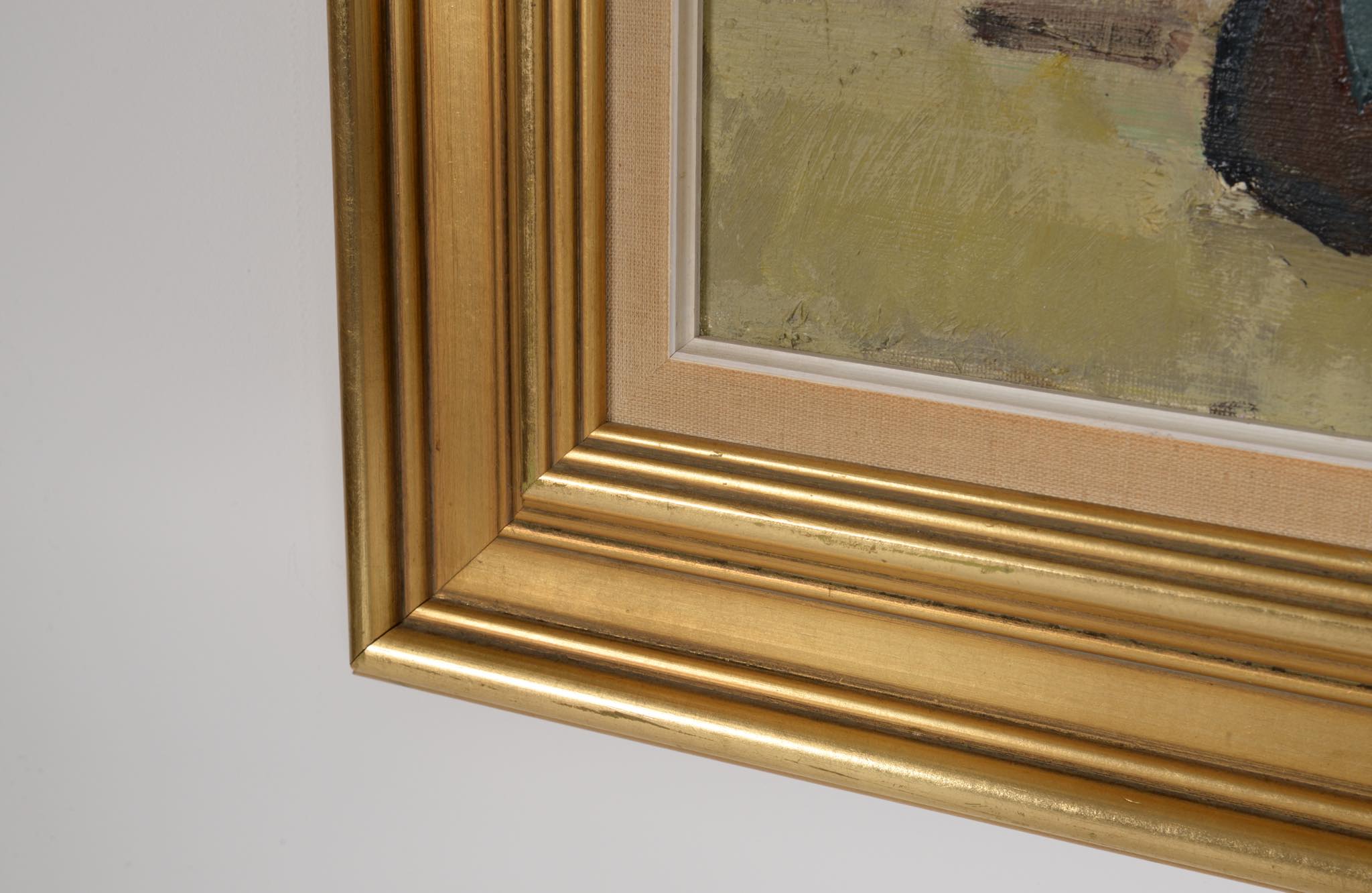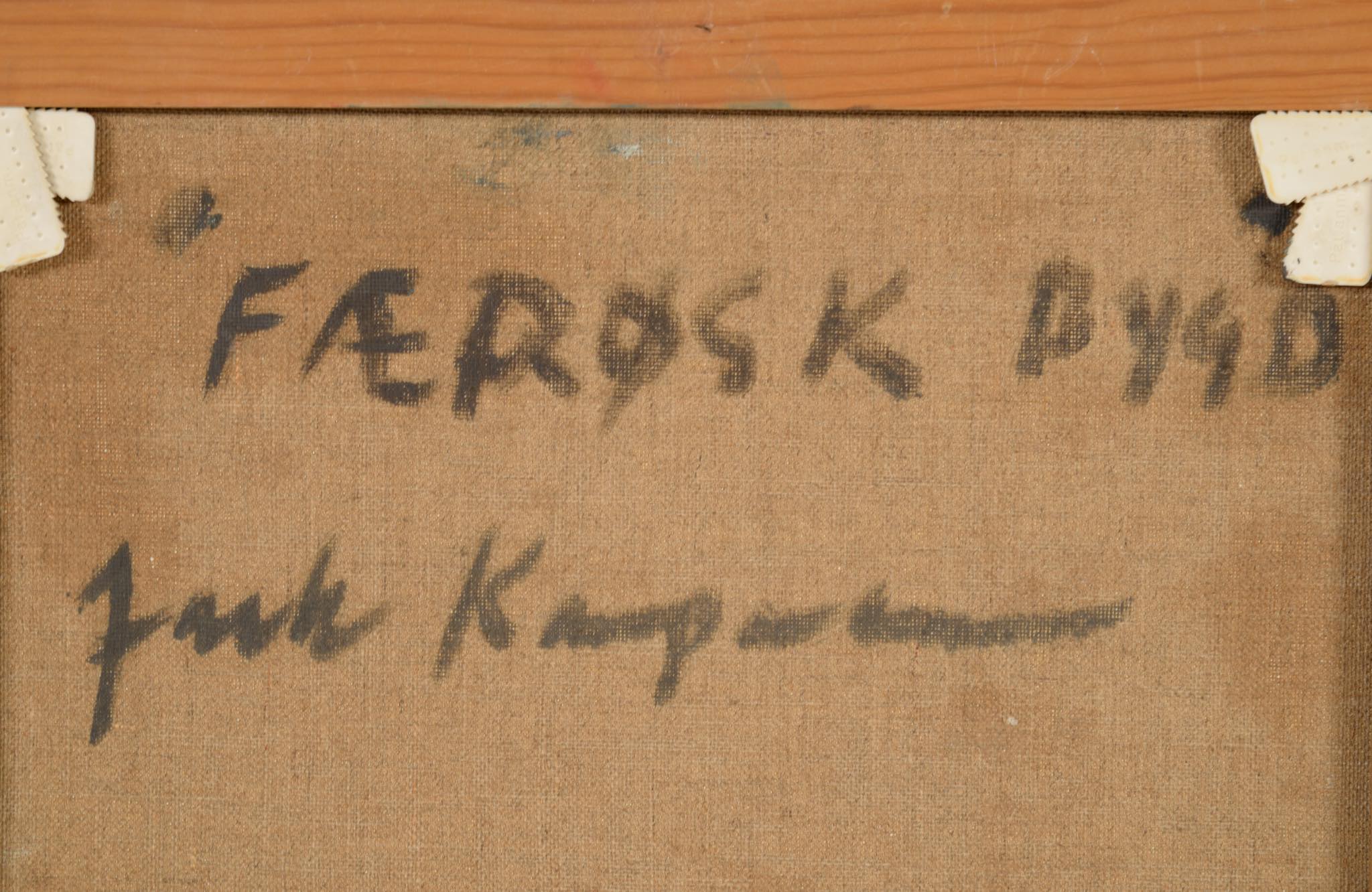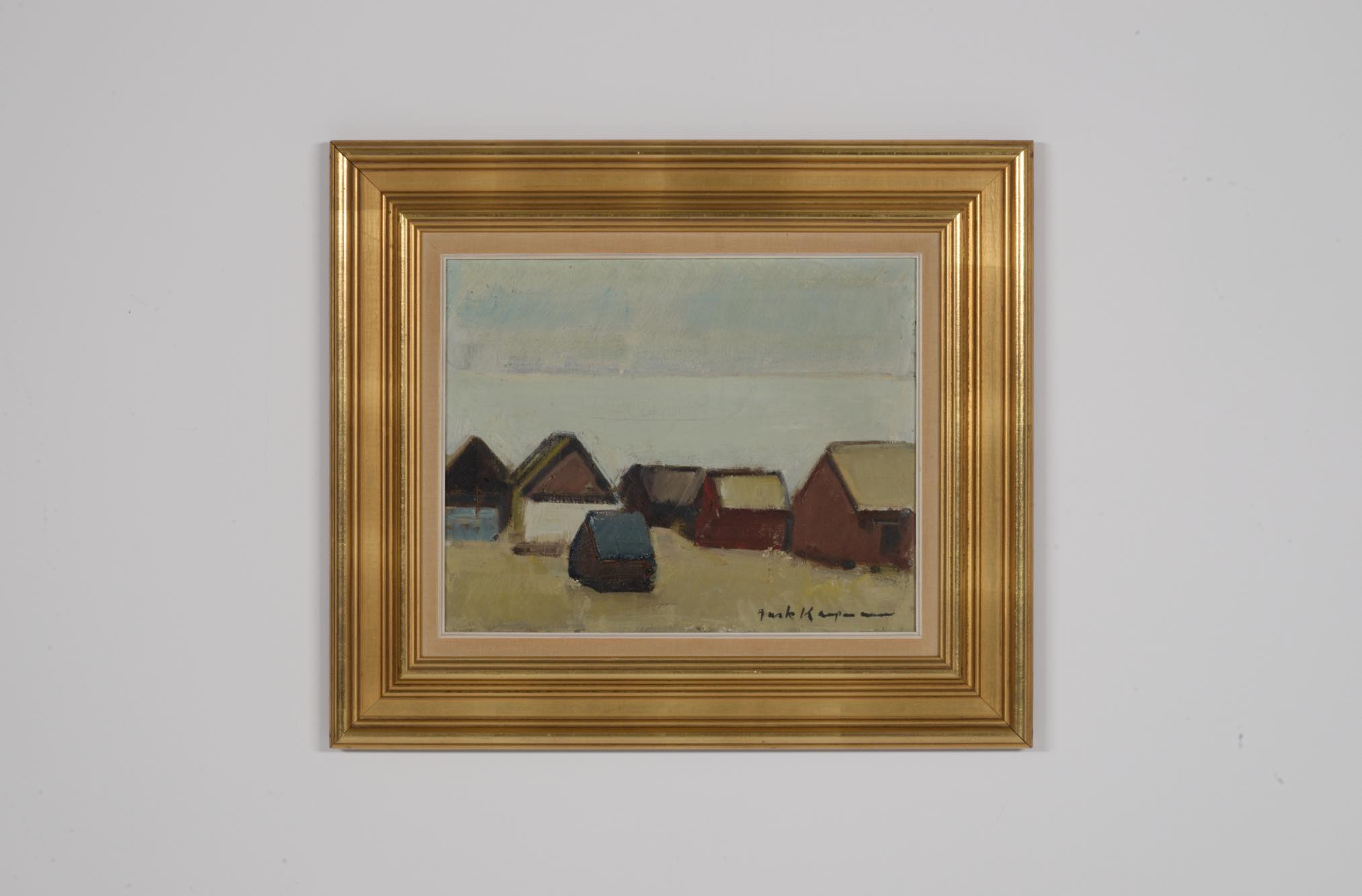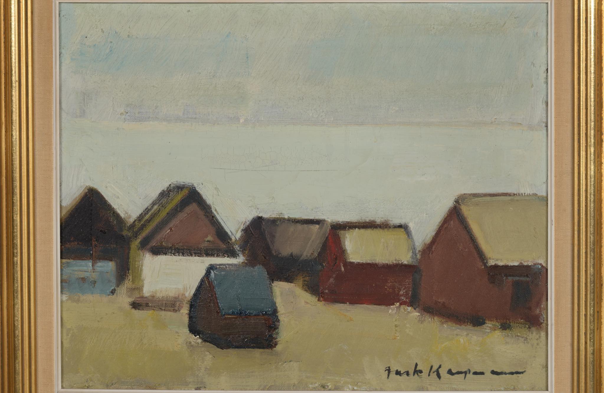 20世紀中葉にフェロー諸島で活躍したデンマーク人画家のJack Kampmann/ジャック・カンプマンによる風景画油彩作品です。フェロー諸島沿岸部に建ち並ぶ家々の、穏やかな日の情景が描かれています。金箔のフレームはオリジナルで、コンディションは良好です。