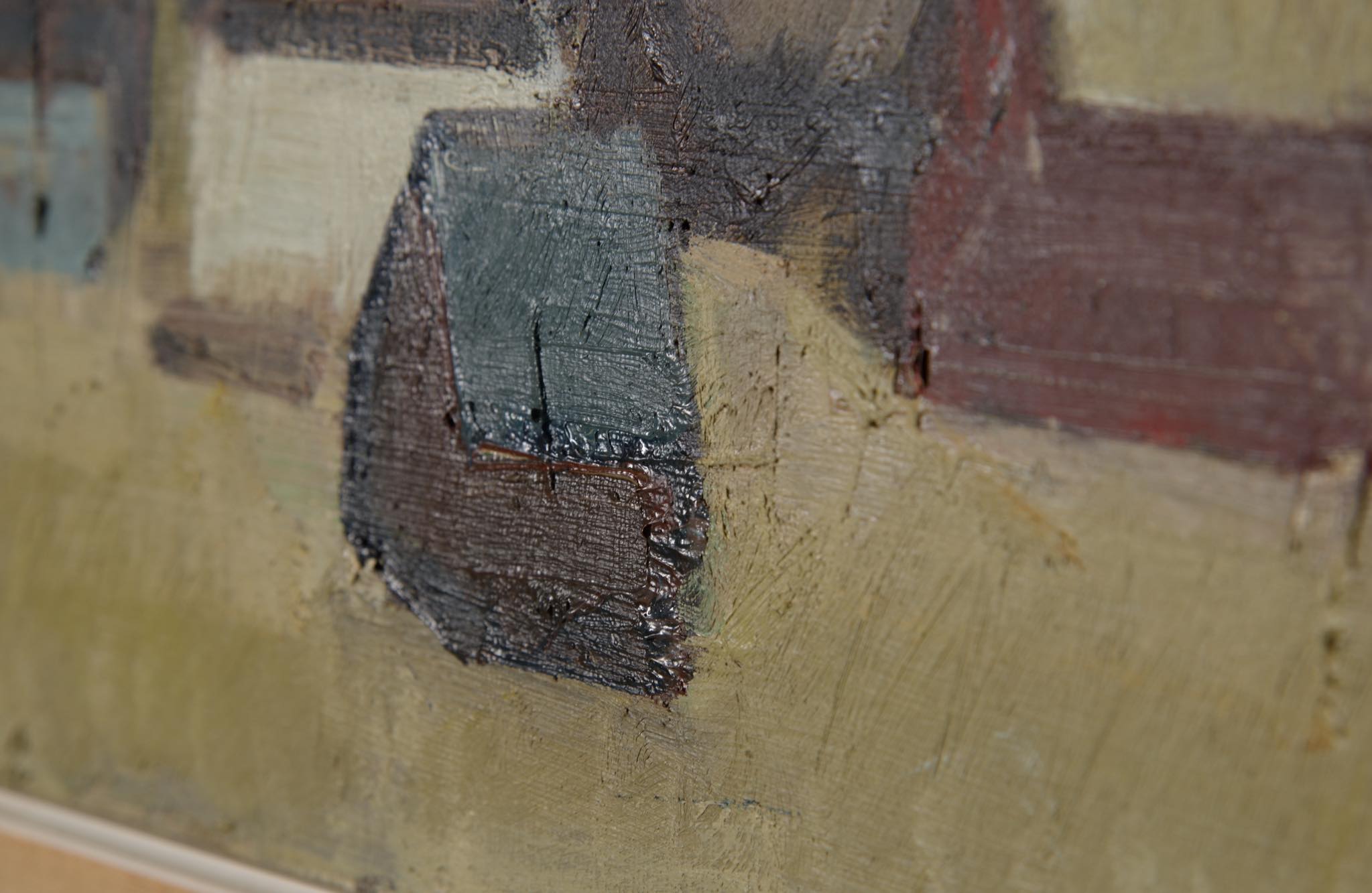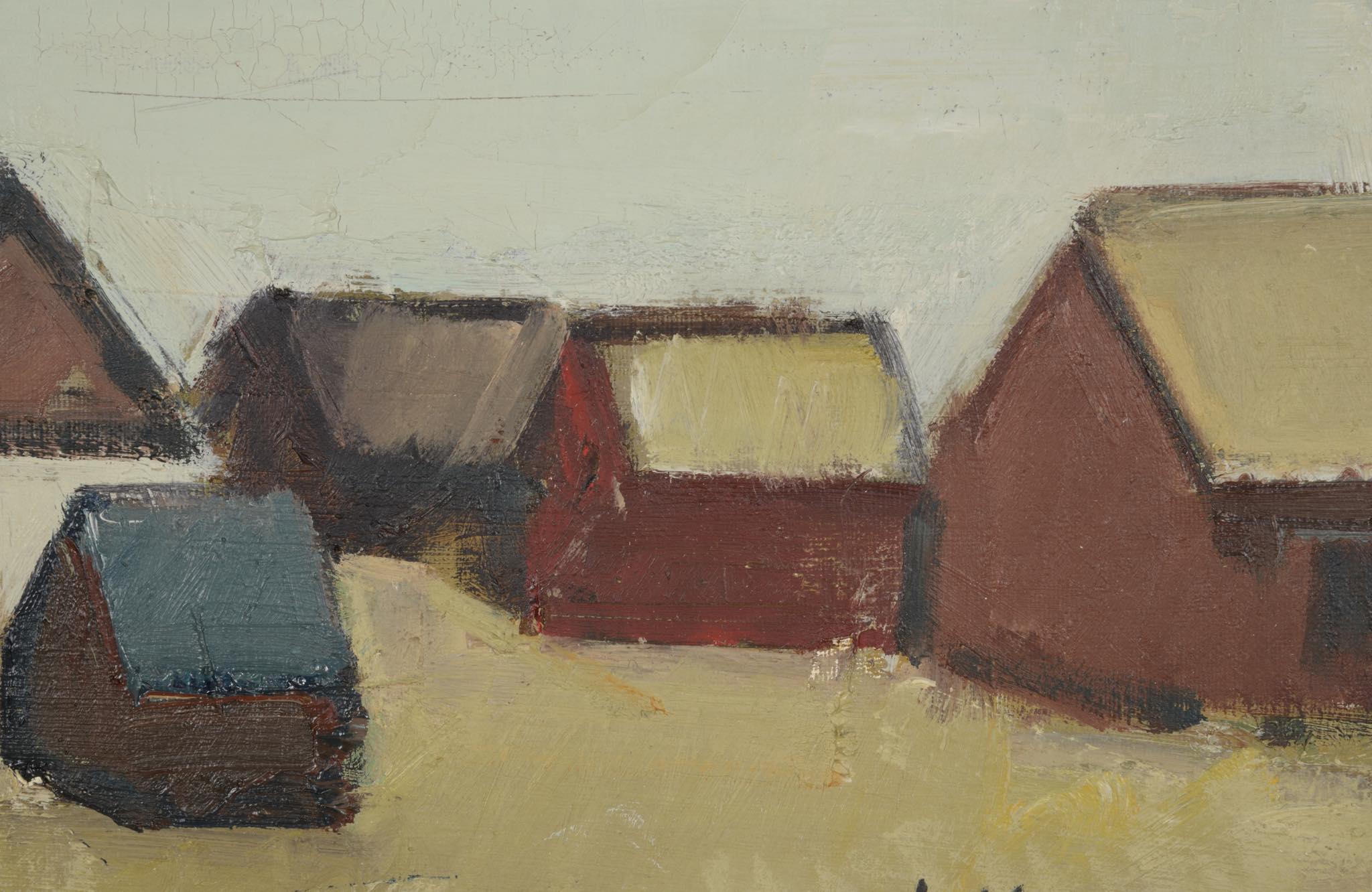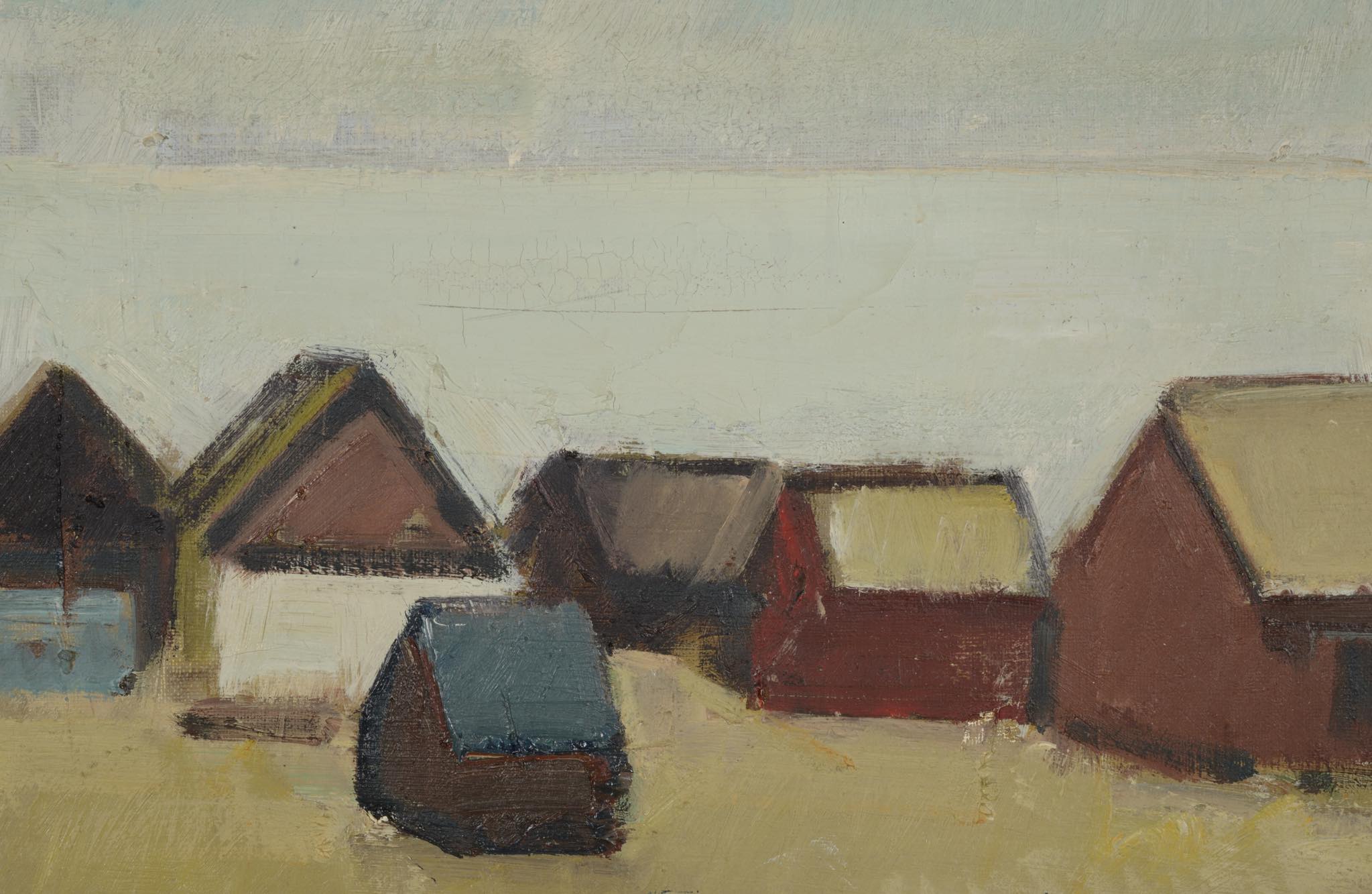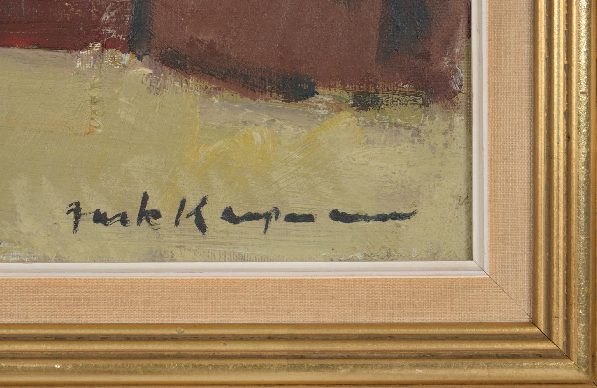 20世紀中葉にフェロー諸島で活躍したデンマーク人画家のJack Kampmann/ジャック・カンプマンによる風景画油彩作品です。フェロー諸島沿岸部に建ち並ぶ家々の、穏やかな日の情景が描かれています。金箔のフレームはオリジナルで、コンディションは良好です。