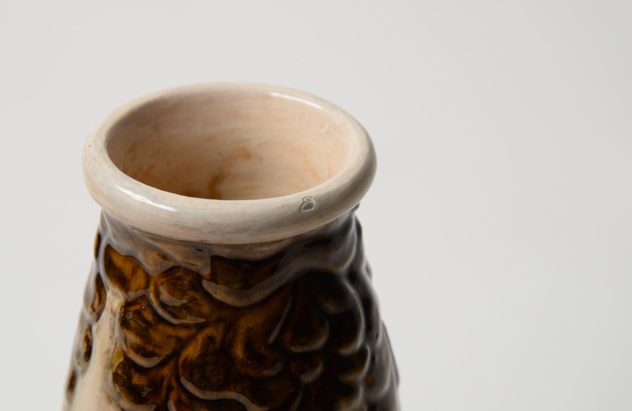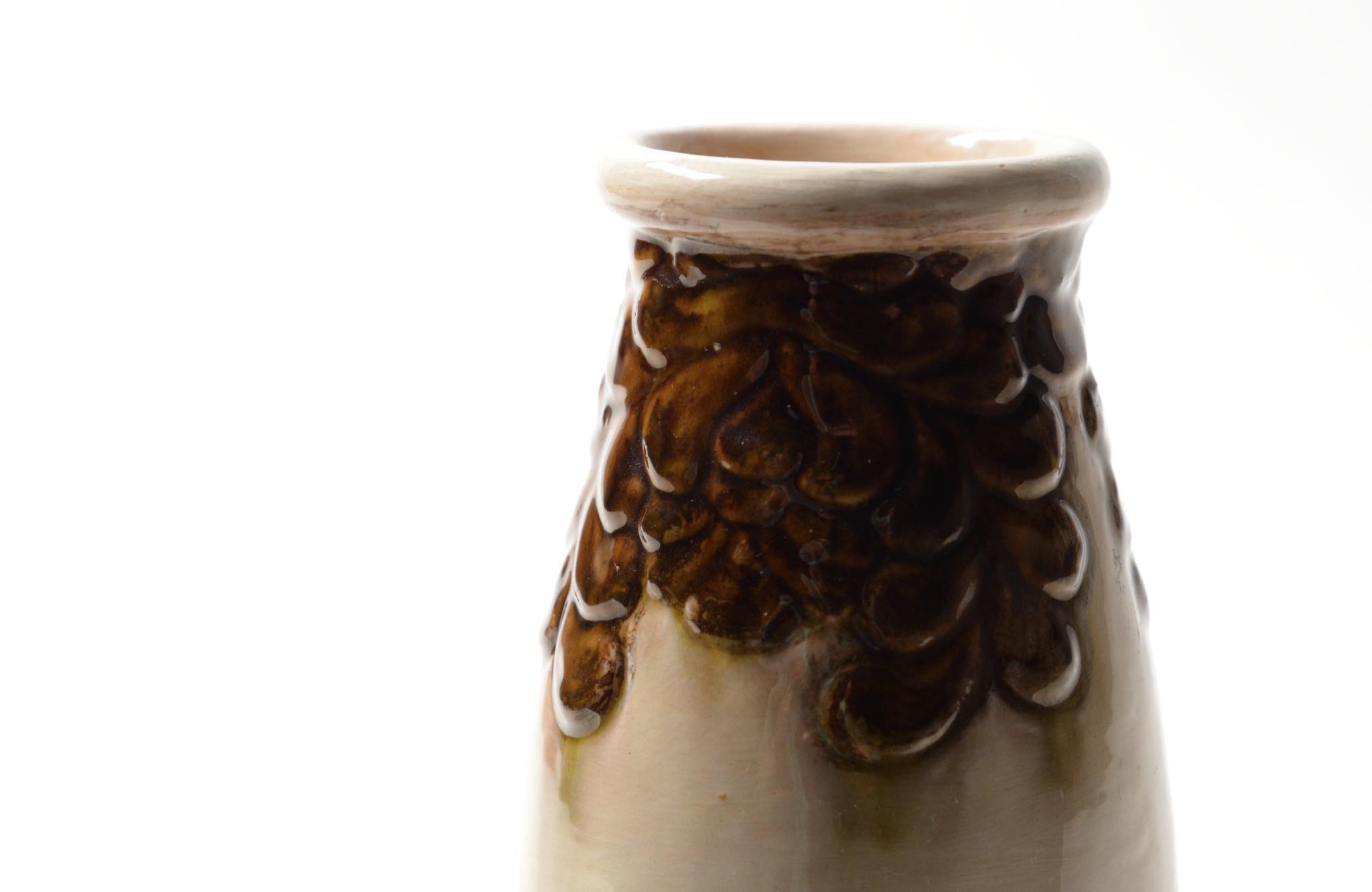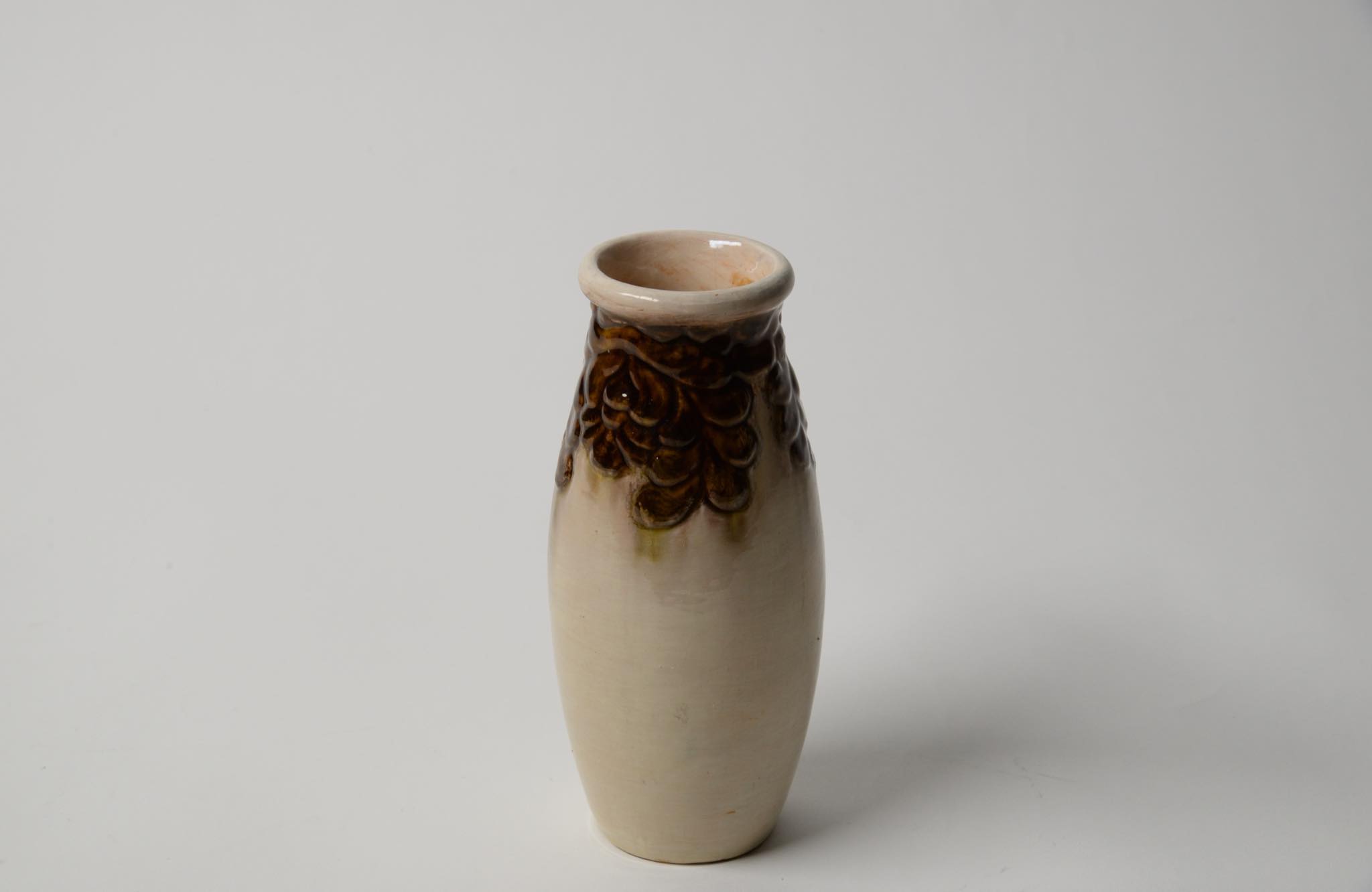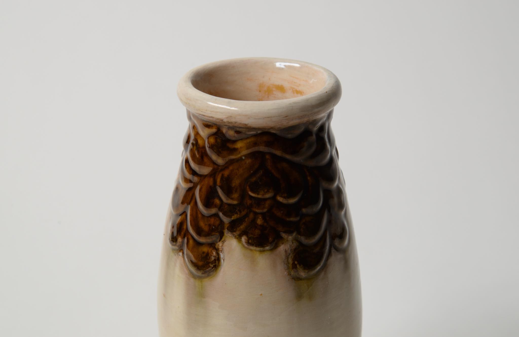 デンマークの製陶所、Kähler/ケーラーによって作られたベースです。1900年前後に焼成されたものでしょう。高名な画家ヴィルヘルム・ハマスホイを兄に持つ陶芸家のSvend Hammershøi/スヴェン・ハマスホイによる初期作品と云われていますが、情報に乏しく確証は得られておりません。白褐色の釉でエンゴーベされた陶体に、19世紀末頃にデンマークで流行したロマン主義様式 Skønvirke/スクンヴィアケと呼ばれる装飾が陽刻と鉄釉によって施されています。口縁部から内側にクラックが見えますが、釉薬のみの表面に留まり本体への影響はなさそうです。軟陶故の僅かなチップが見られます。コンディションは良好です。