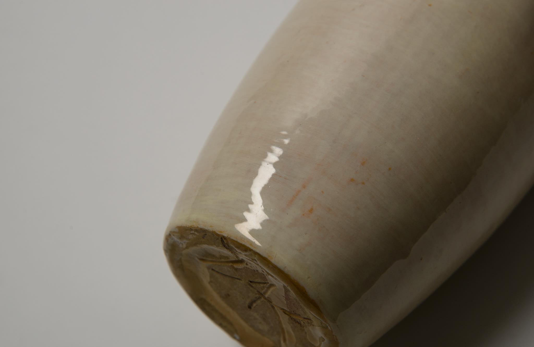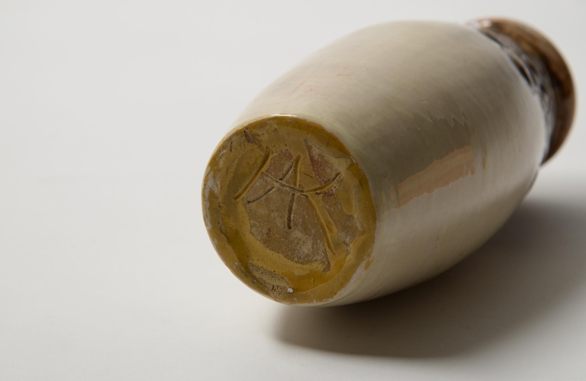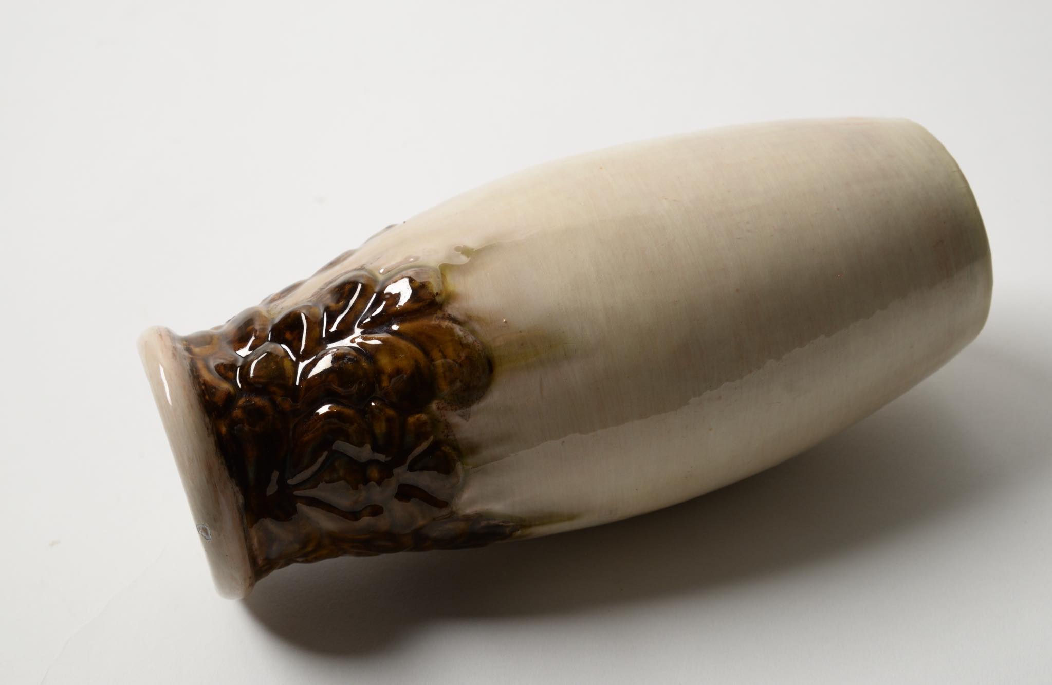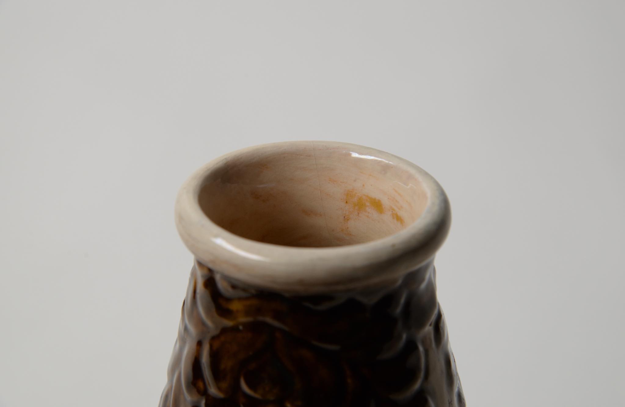 デンマークの製陶所、Kähler/ケーラーによって作られたベースです。1900年前後に焼成されたものでしょう。高名な画家ヴィルヘルム・ハマスホイを兄に持つ陶芸家のSvend Hammershøi/スヴェン・ハマスホイによる初期作品と云われていますが、情報に乏しく確証は得られておりません。白褐色の釉でエンゴーベされた陶体に、19世紀末頃にデンマークで流行したロマン主義様式 Skønvirke/スクンヴィアケと呼ばれる装飾が陽刻と鉄釉によって施されています。口縁部から内側にクラックが見えますが、釉薬のみの表面に留まり本体への影響はなさそうです。軟陶故の僅かなチップが見られます。コンディションは良好です。