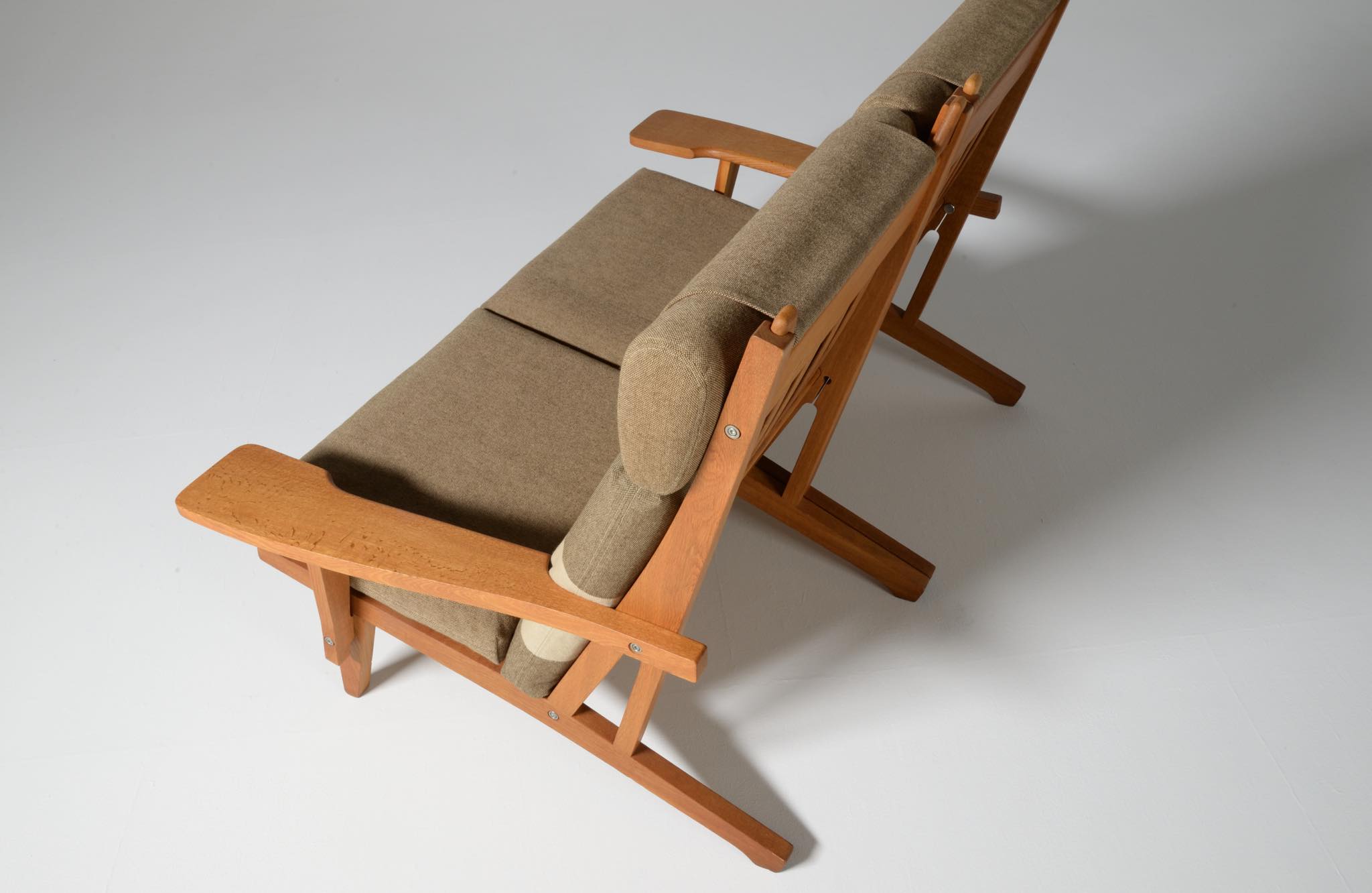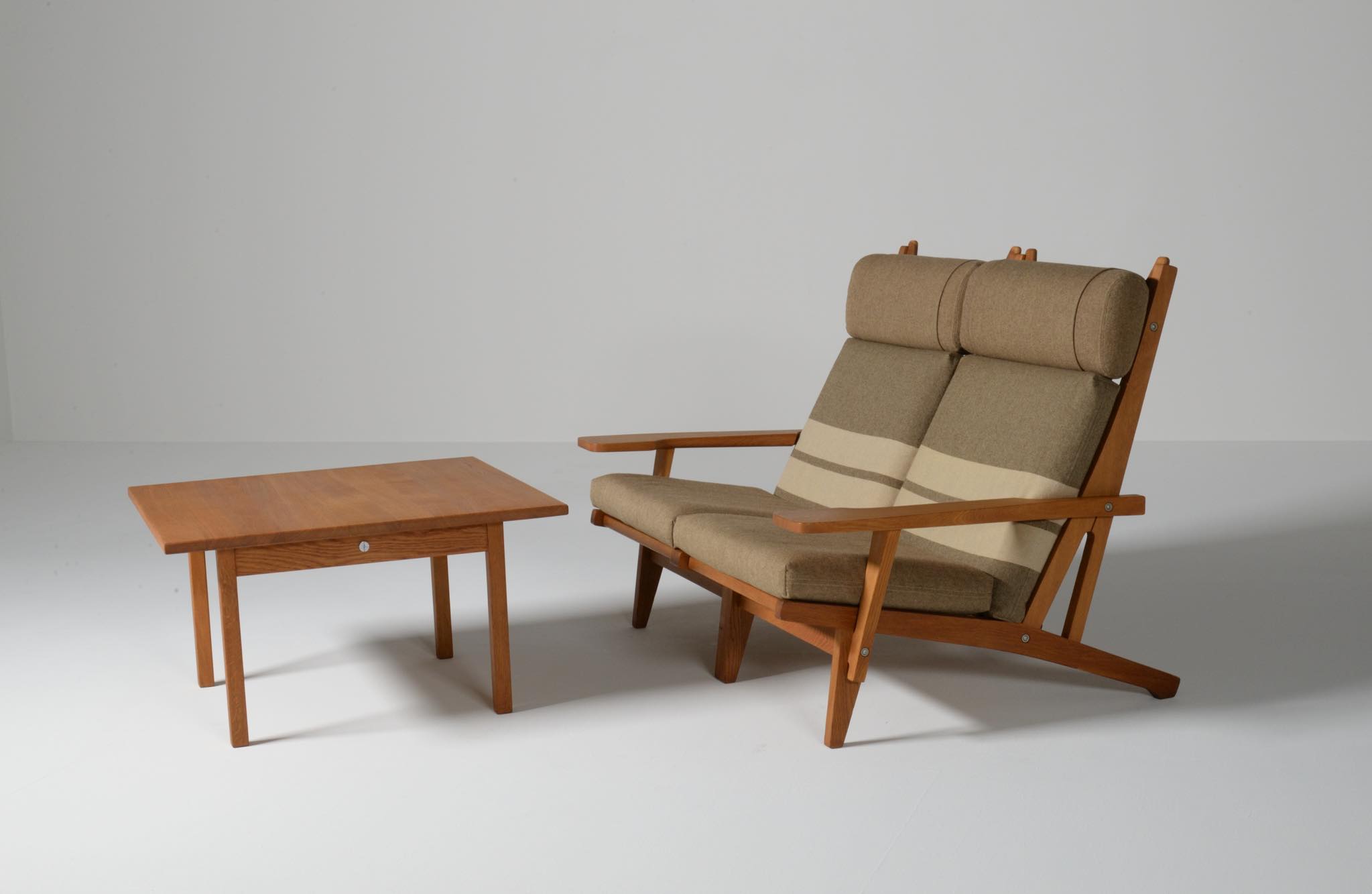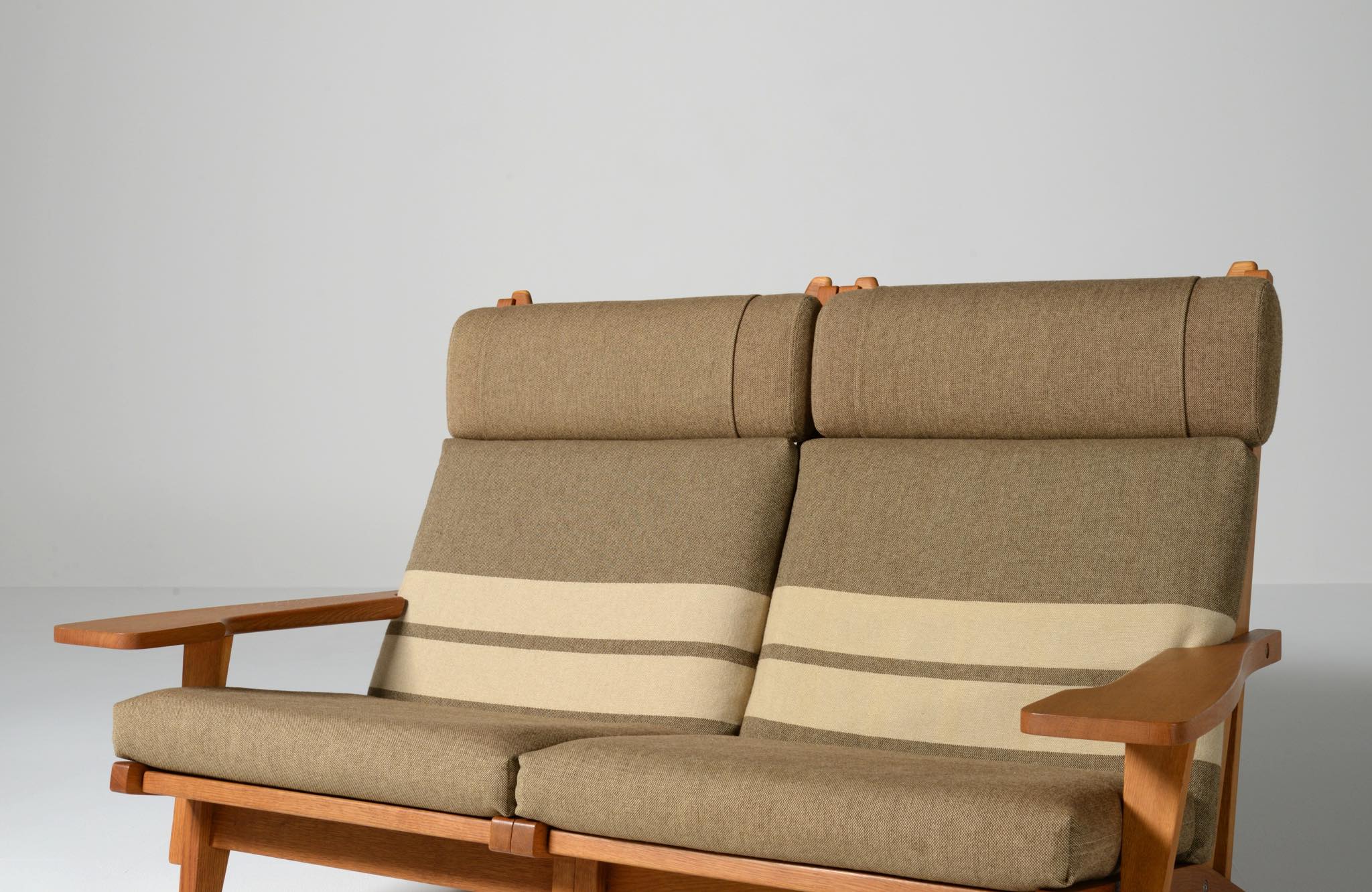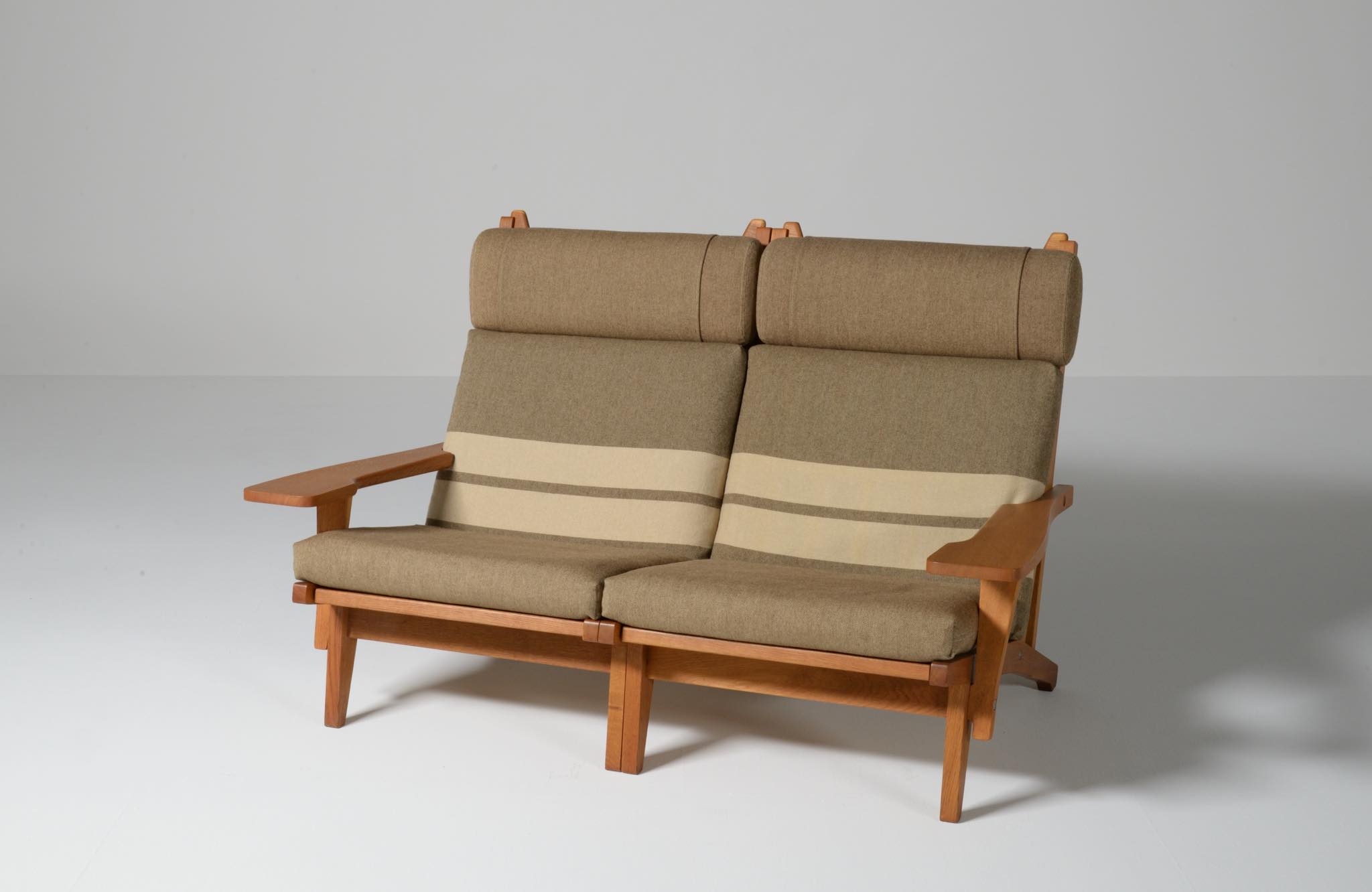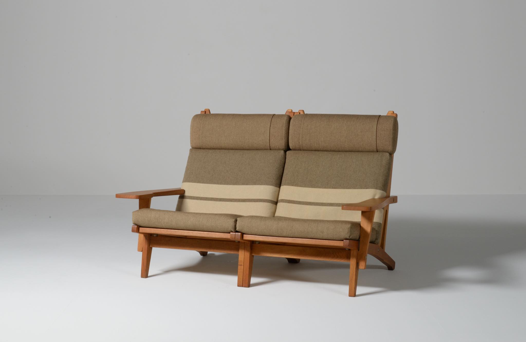 デンマークを代表する家具デザイナーのハンス・J・ウェグナーによる "GE375" 2人掛けソファです。大きく水平に近いアームレストはコーヒーカップを置けるテーブルとしても使え、頭部まで預けられるハイバックタイプは当時人気を博したようです。フレームは無垢のオーク材、クッションはオリジナルで僅かに褪色がありますがきれいな状態です。ファブリックの張り替えのご相談も承ります。