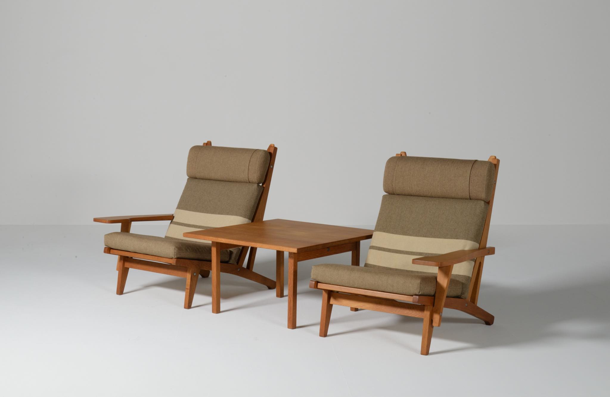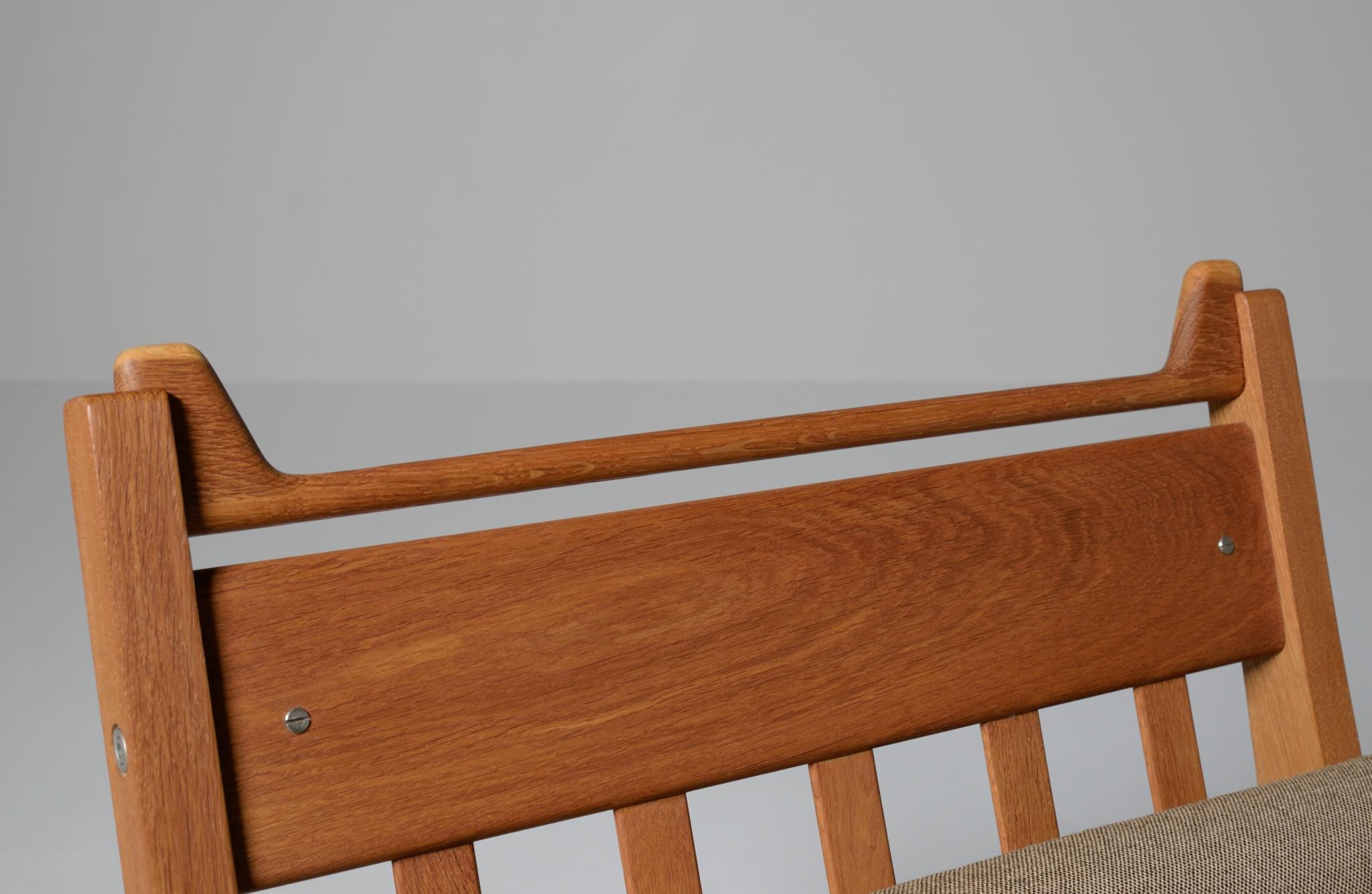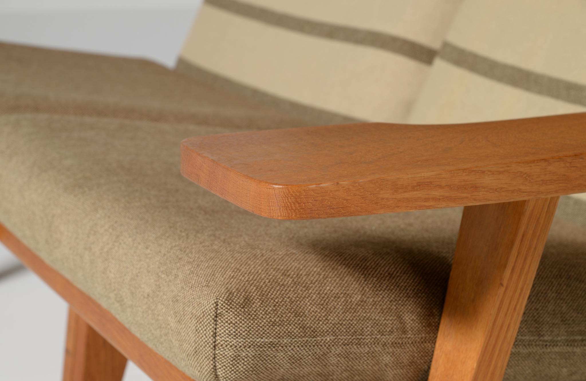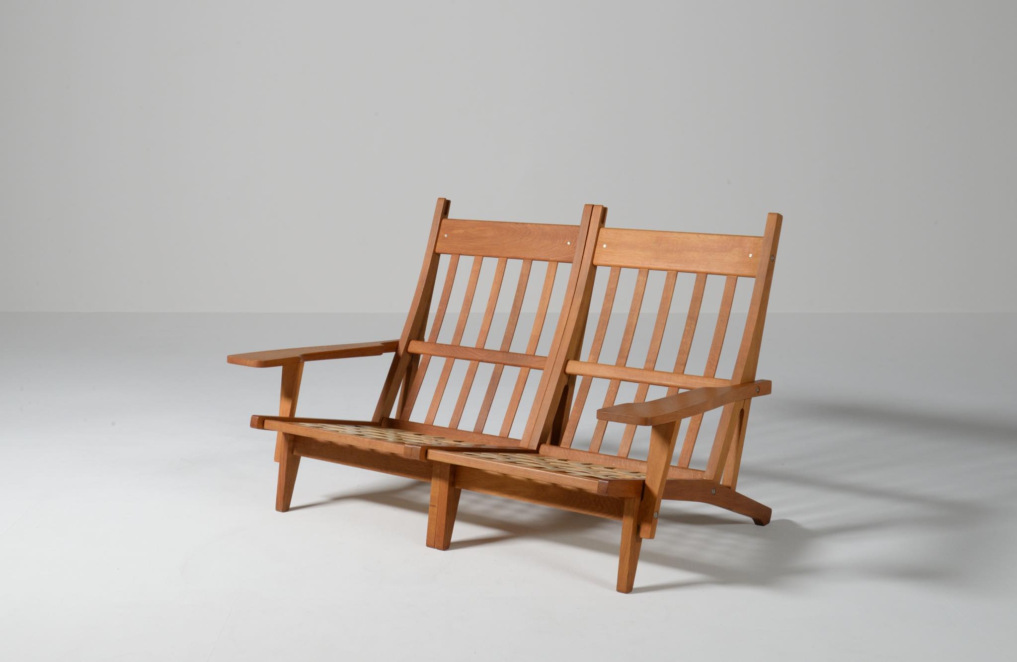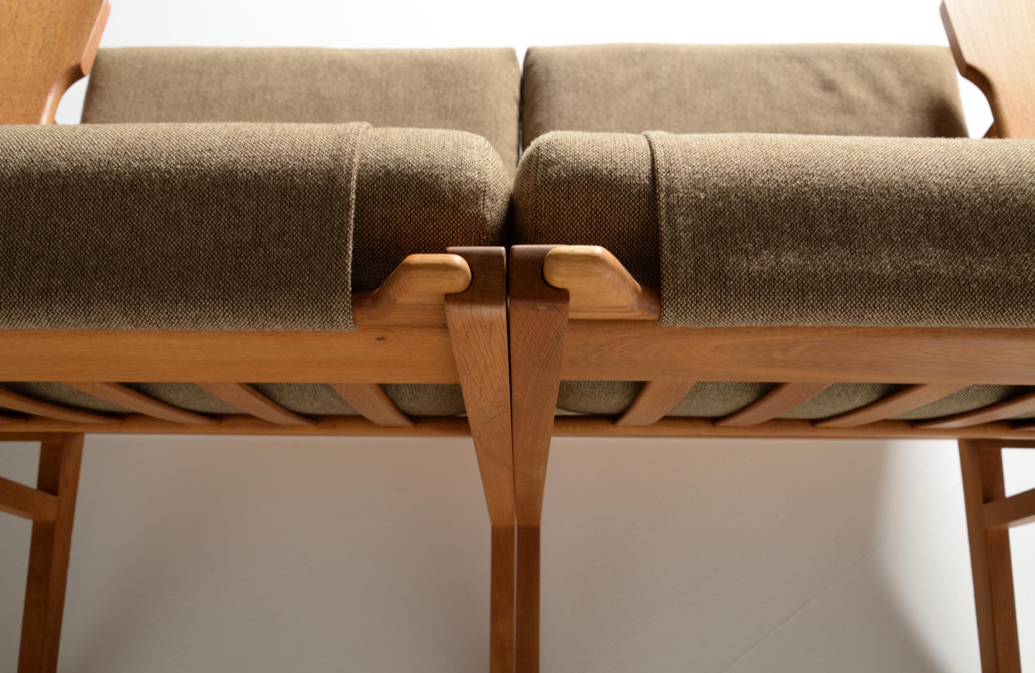 デンマークを代表する家具デザイナーのハンス・J・ウェグナーによる "GE375" 2人掛けソファです。大きく水平に近いアームレストはコーヒーカップを置けるテーブルとしても使え、頭部まで預けられるハイバックタイプは当時人気を博したようです。フレームは無垢のオーク材、クッションはオリジナルで僅かに褪色がありますがきれいな状態です。ファブリックの張り替えのご相談も承ります。