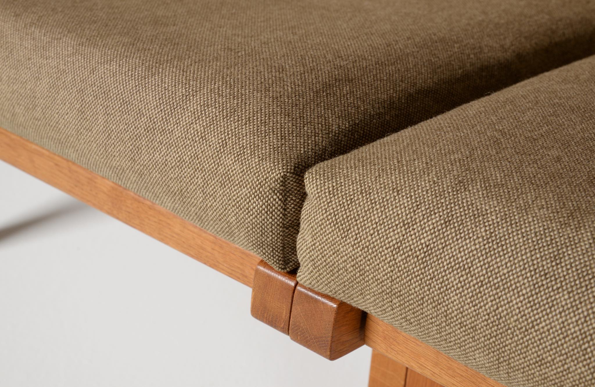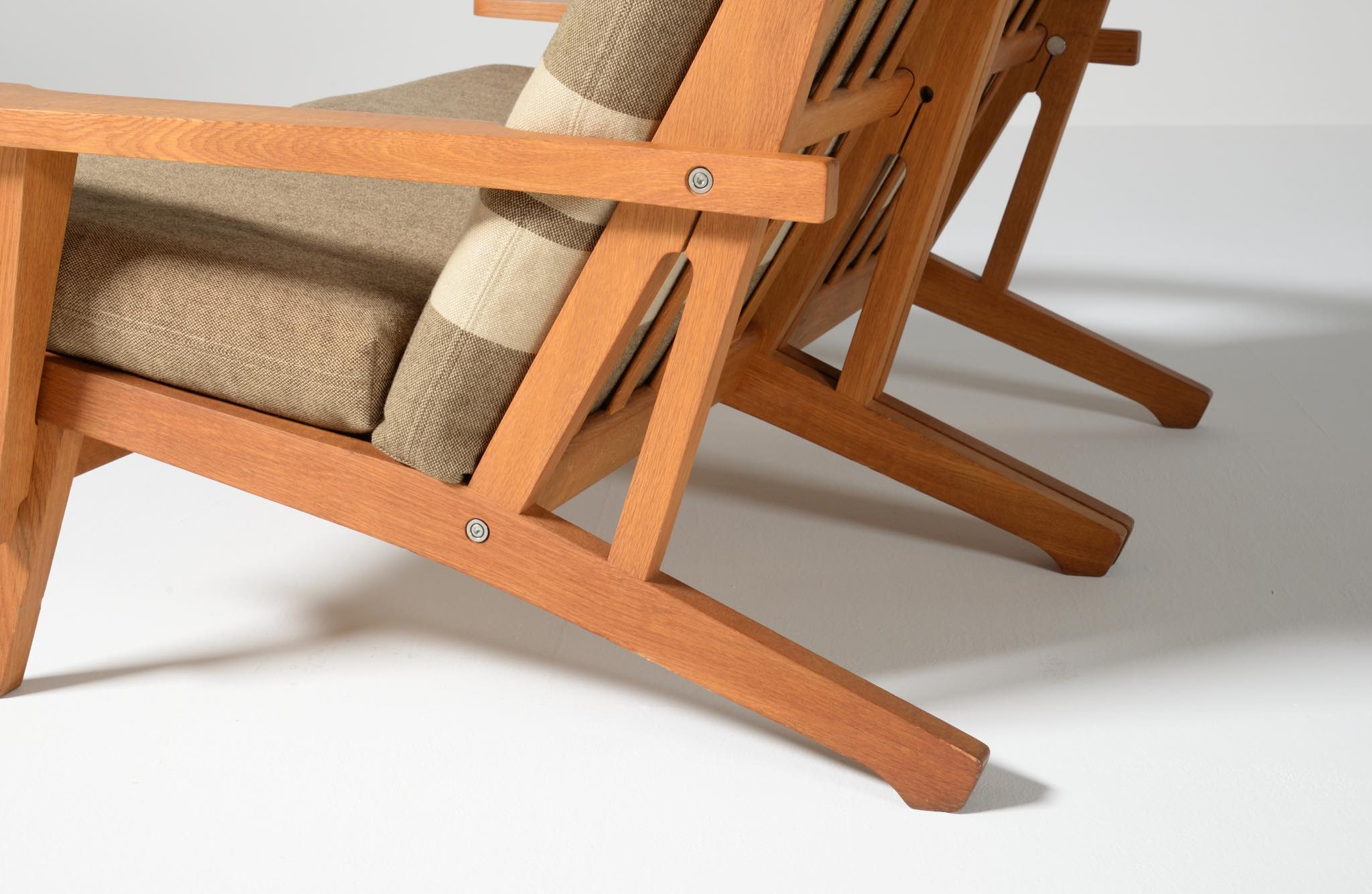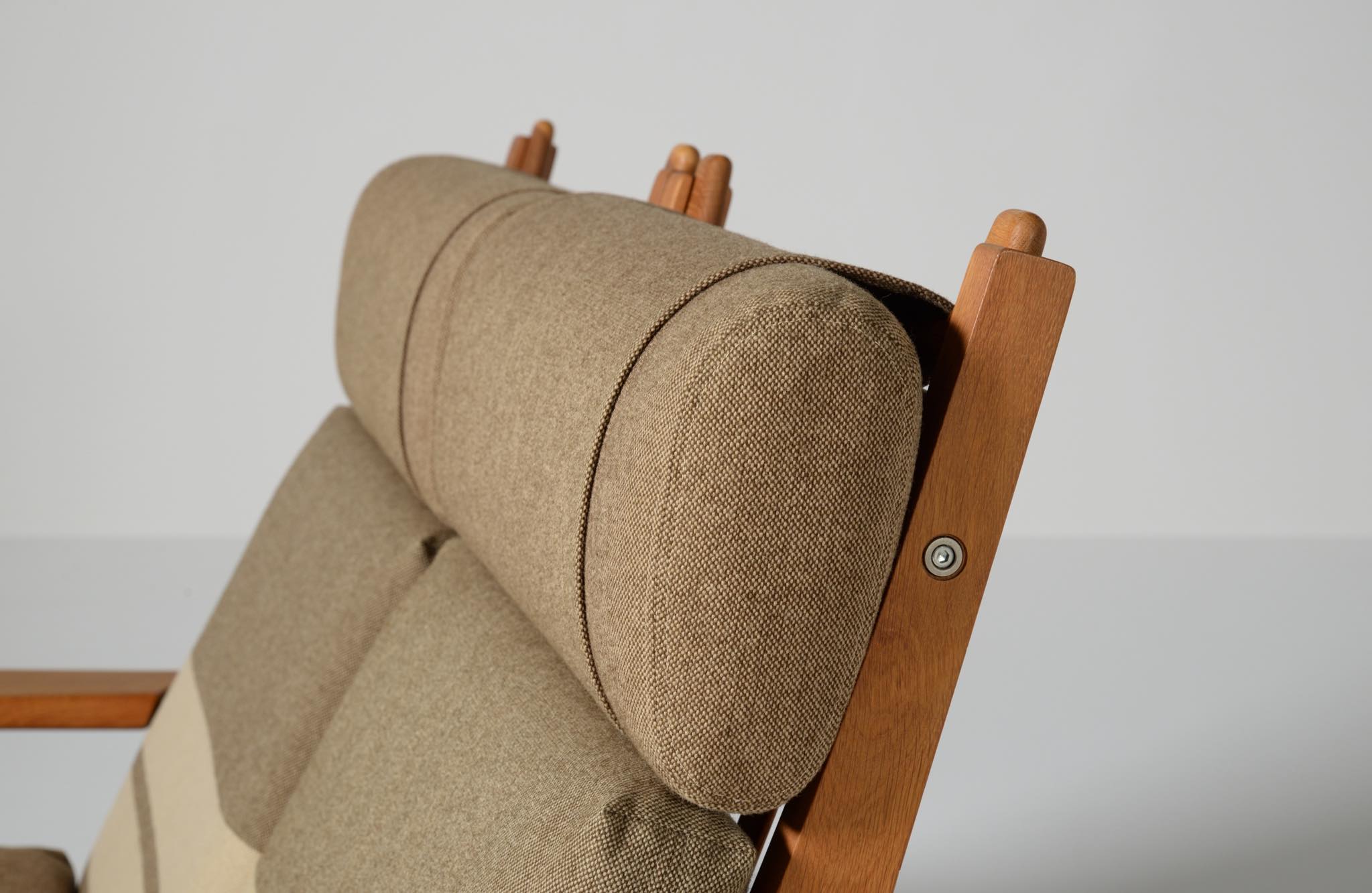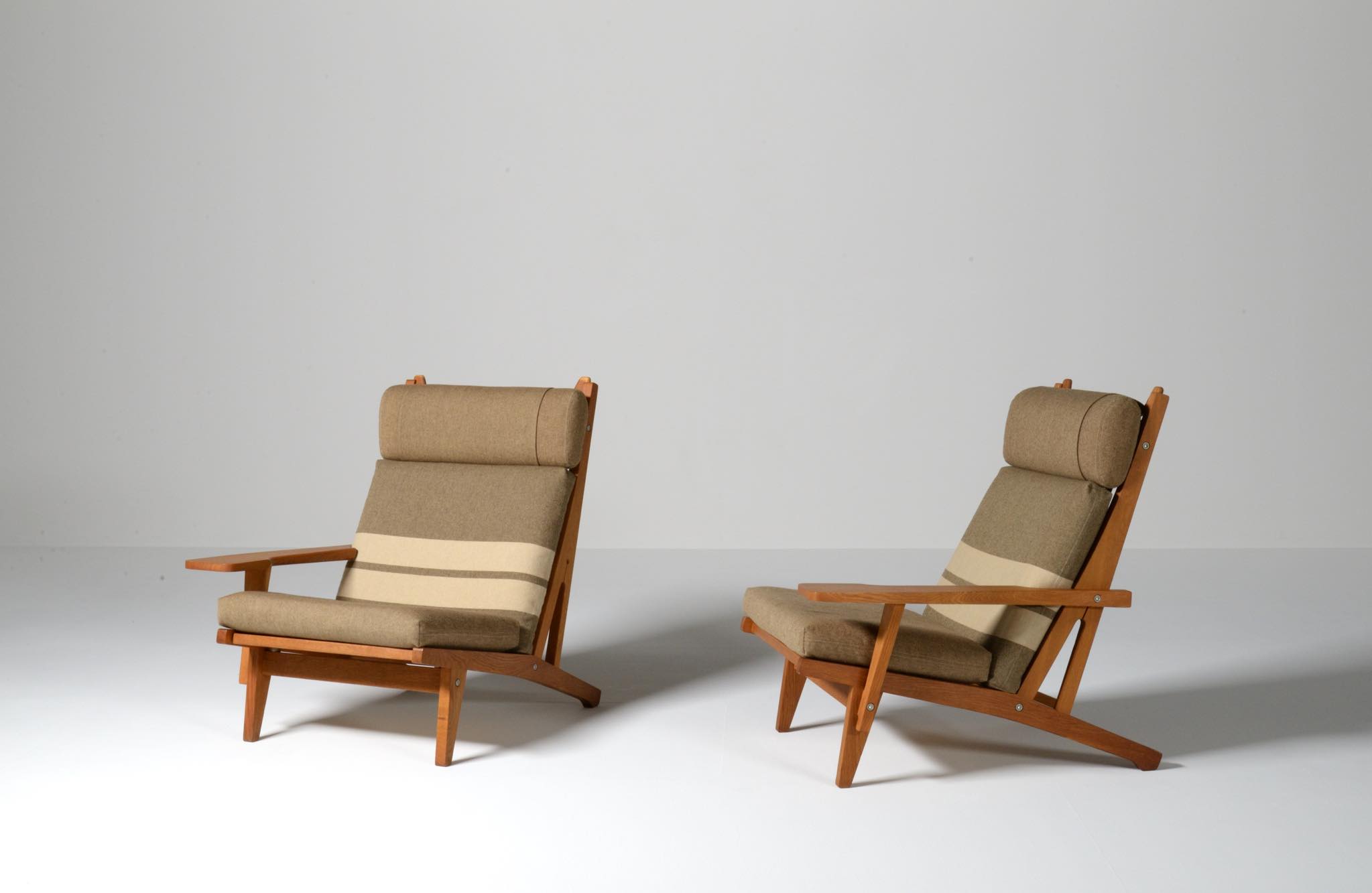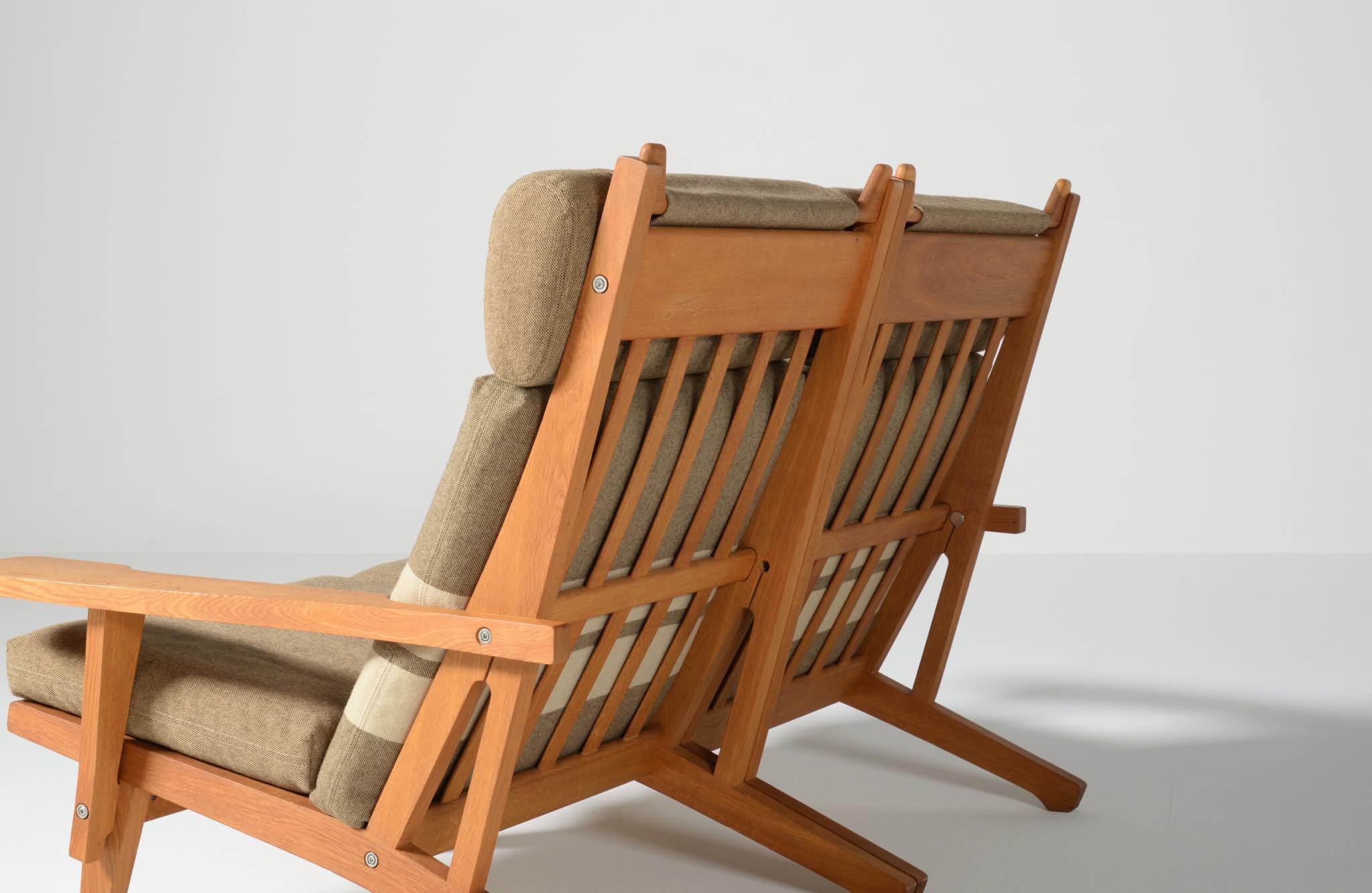 デンマークを代表する家具デザイナーのハンス・J・ウェグナーによる "GE375" 2人掛けソファです。大きく水平に近いアームレストはコーヒーカップを置けるテーブルとしても使え、頭部まで預けられるハイバックタイプは当時人気を博したようです。フレームは無垢のオーク材、クッションはオリジナルで僅かに褪色がありますがきれいな状態です。ファブリックの張り替えのご相談も承ります。