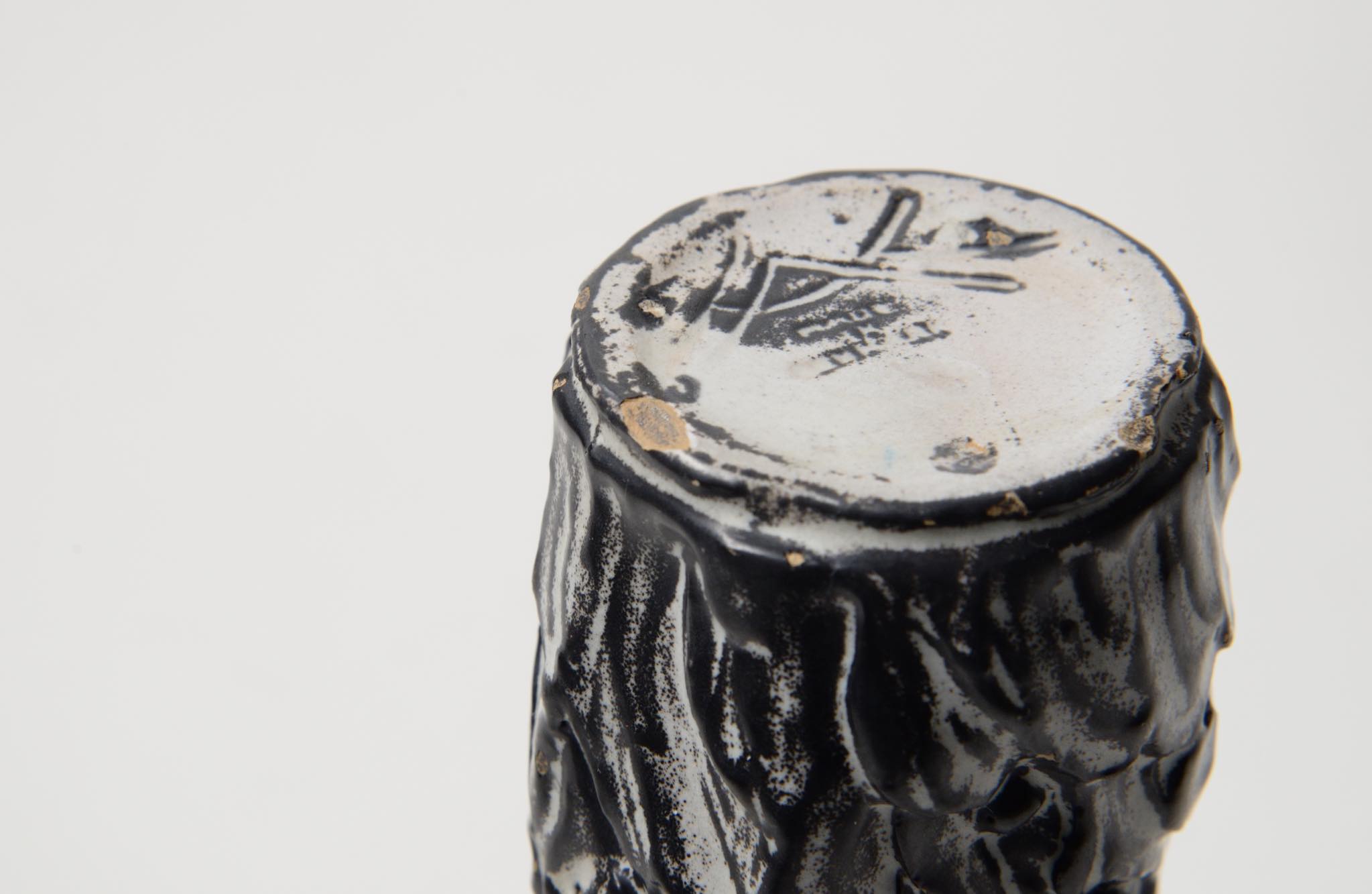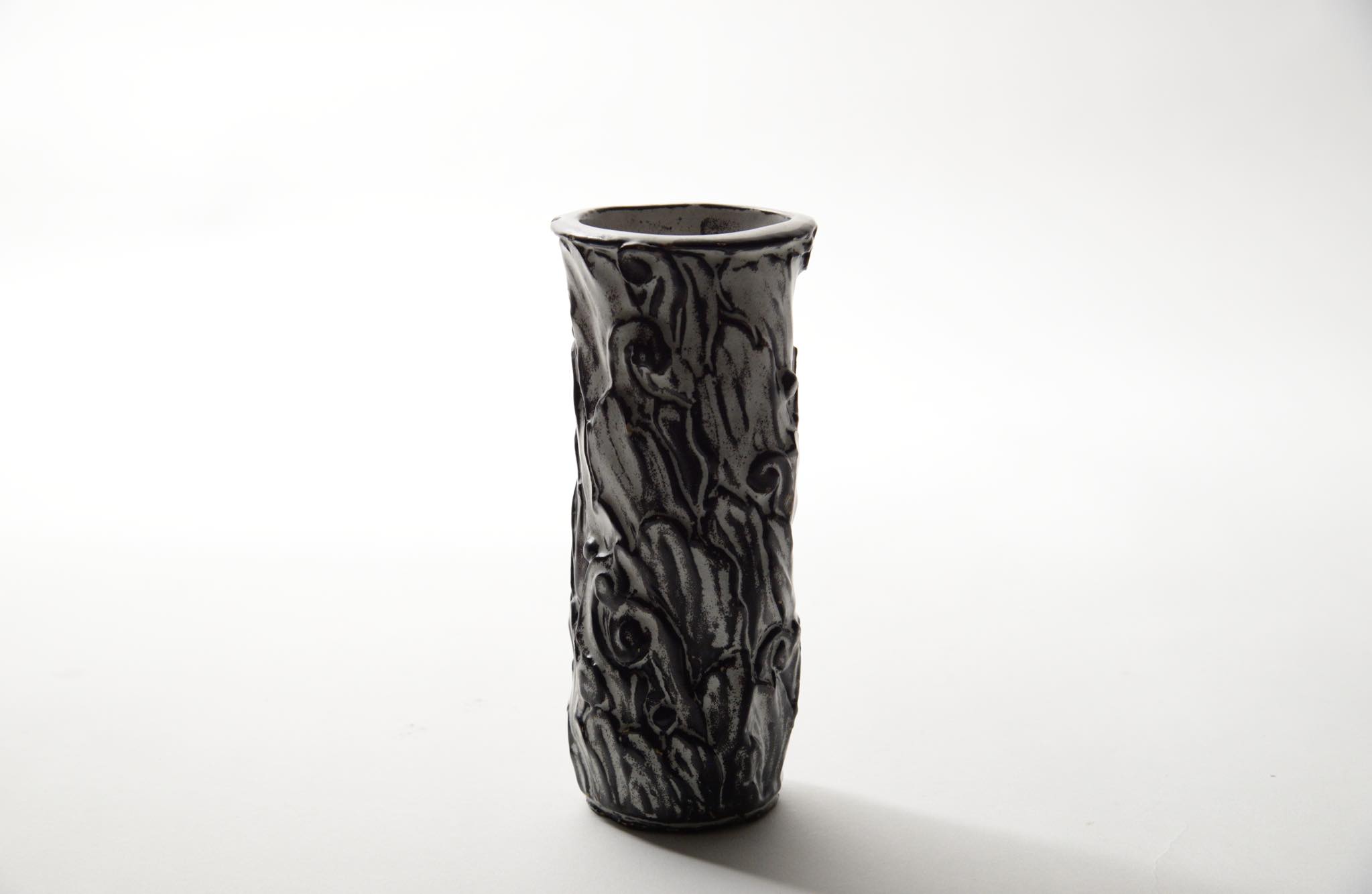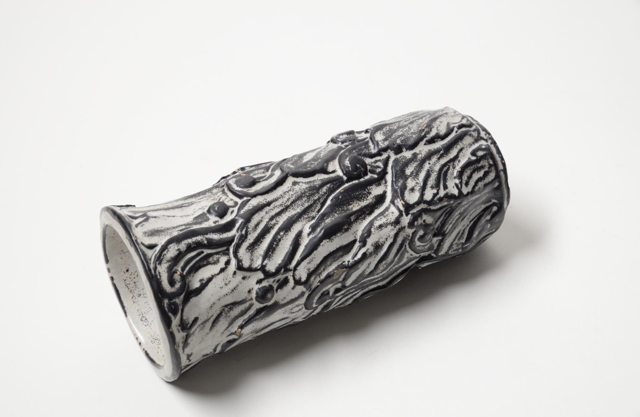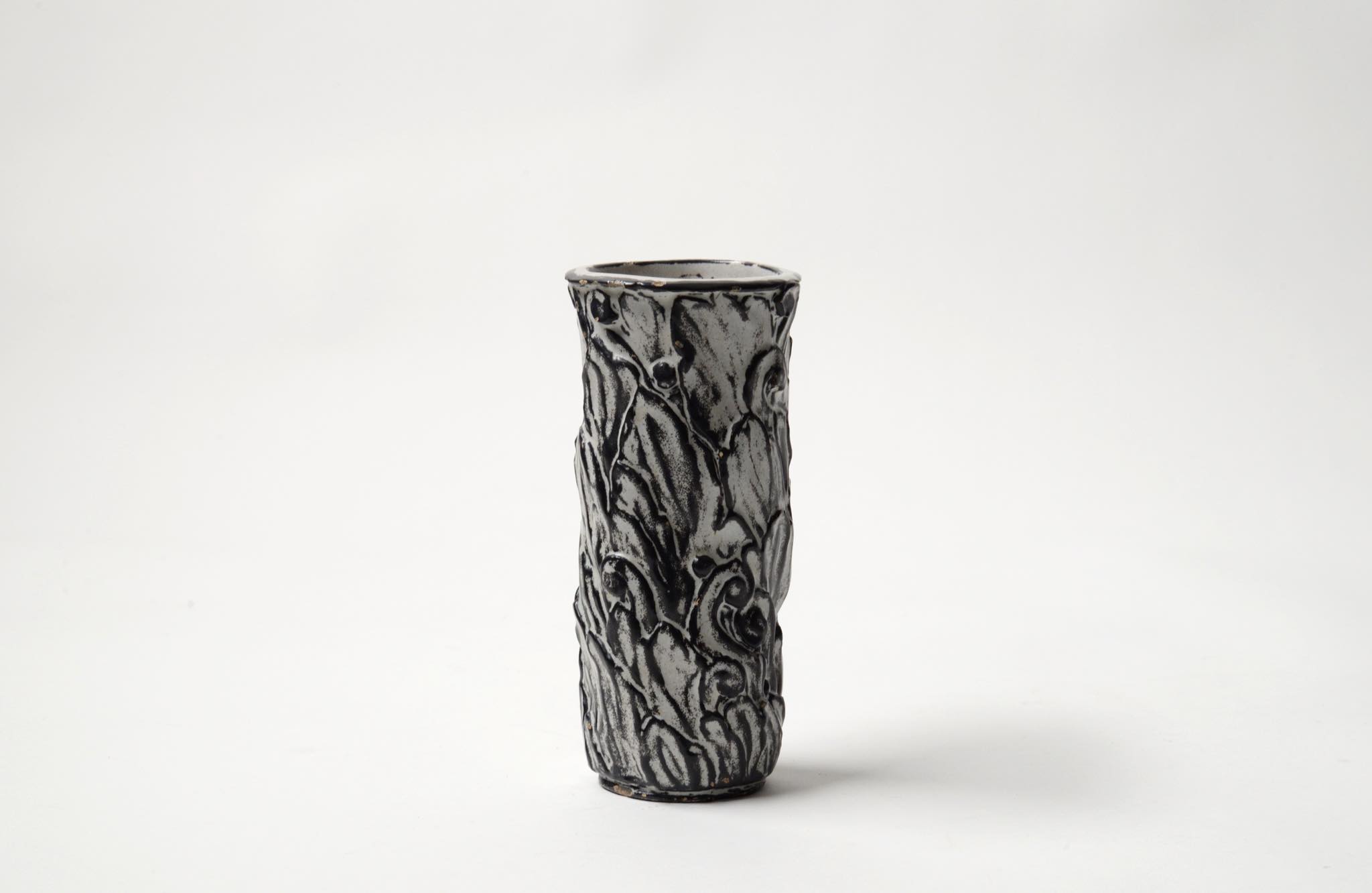筒形の本体にレリーフ状の装飾が施された、Kähler keramik/ケーラー製陶所のベース作品です。黒色釉の上から灰色釉を施釉したもので、デンマークの陶芸家、Svend Hammershøi/スヴェン・ハマスホイによる1930年代のベース作品として求めましたが、1960年代に焼成されたニルス・ケーラーの可能性もあると思われます。チップが多数見られますが、クラックはありません。