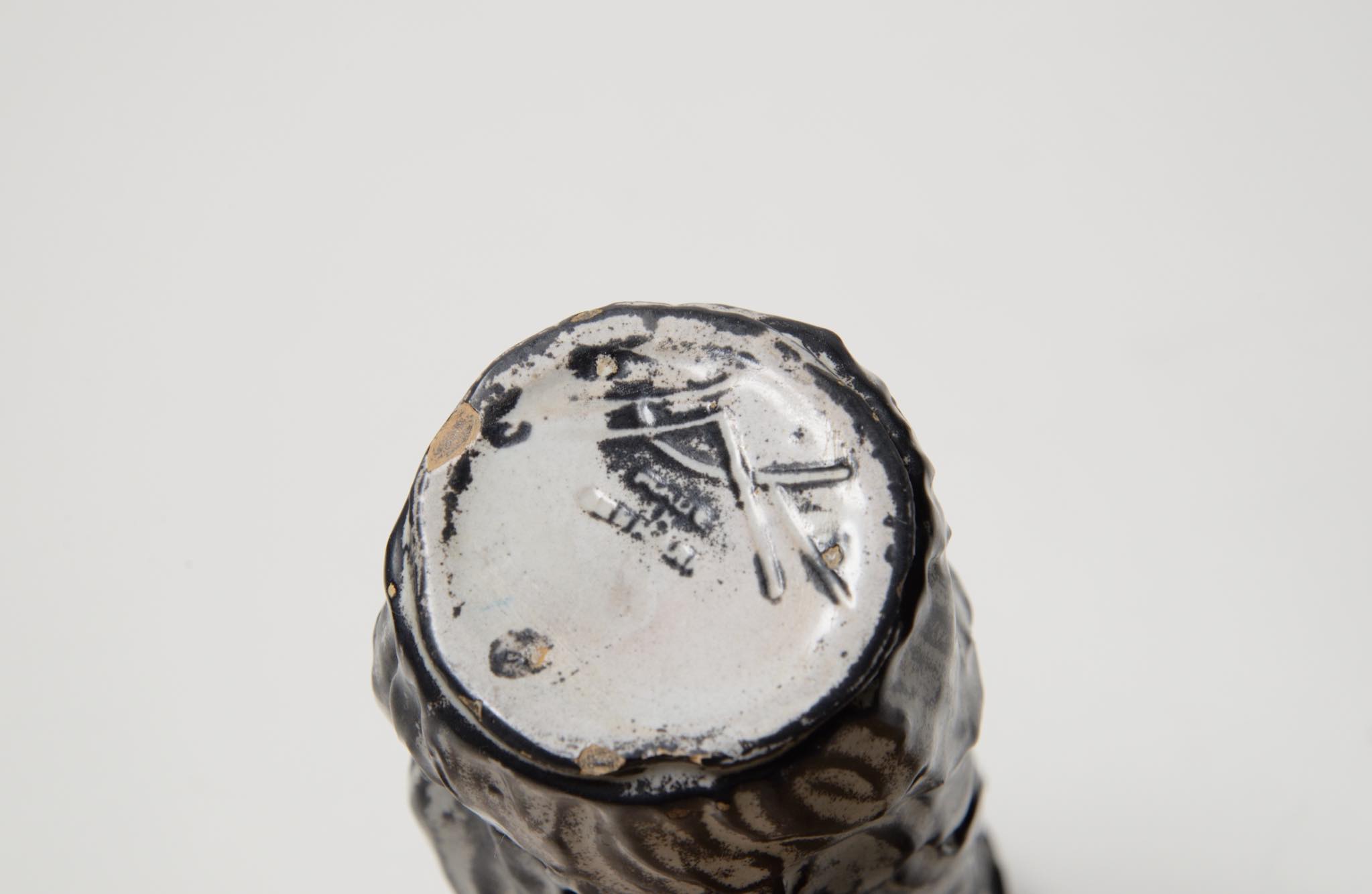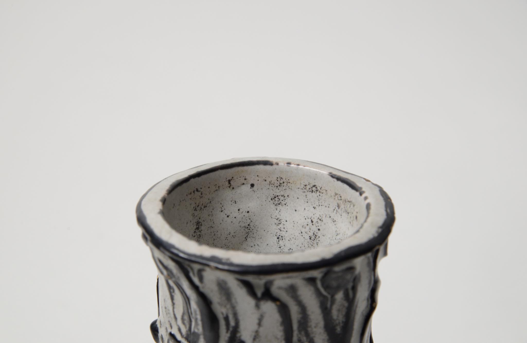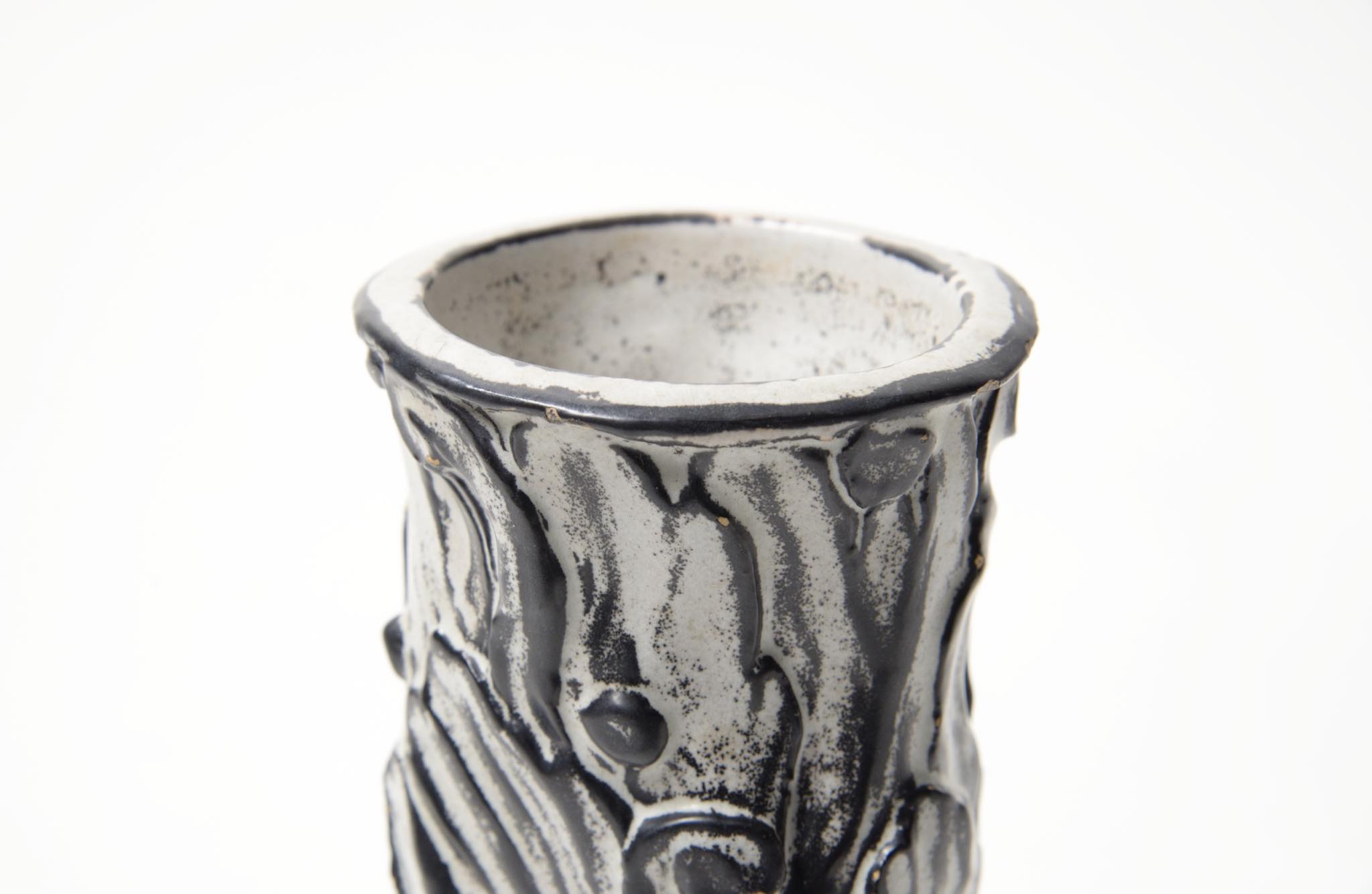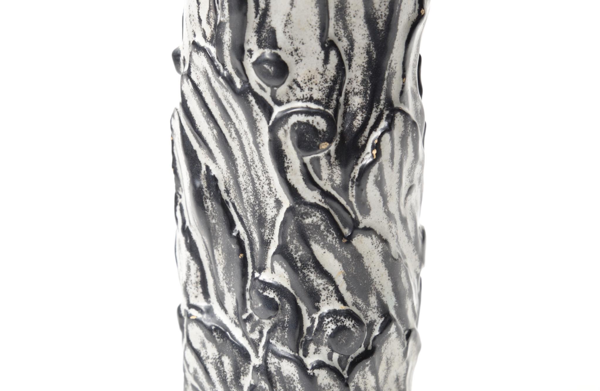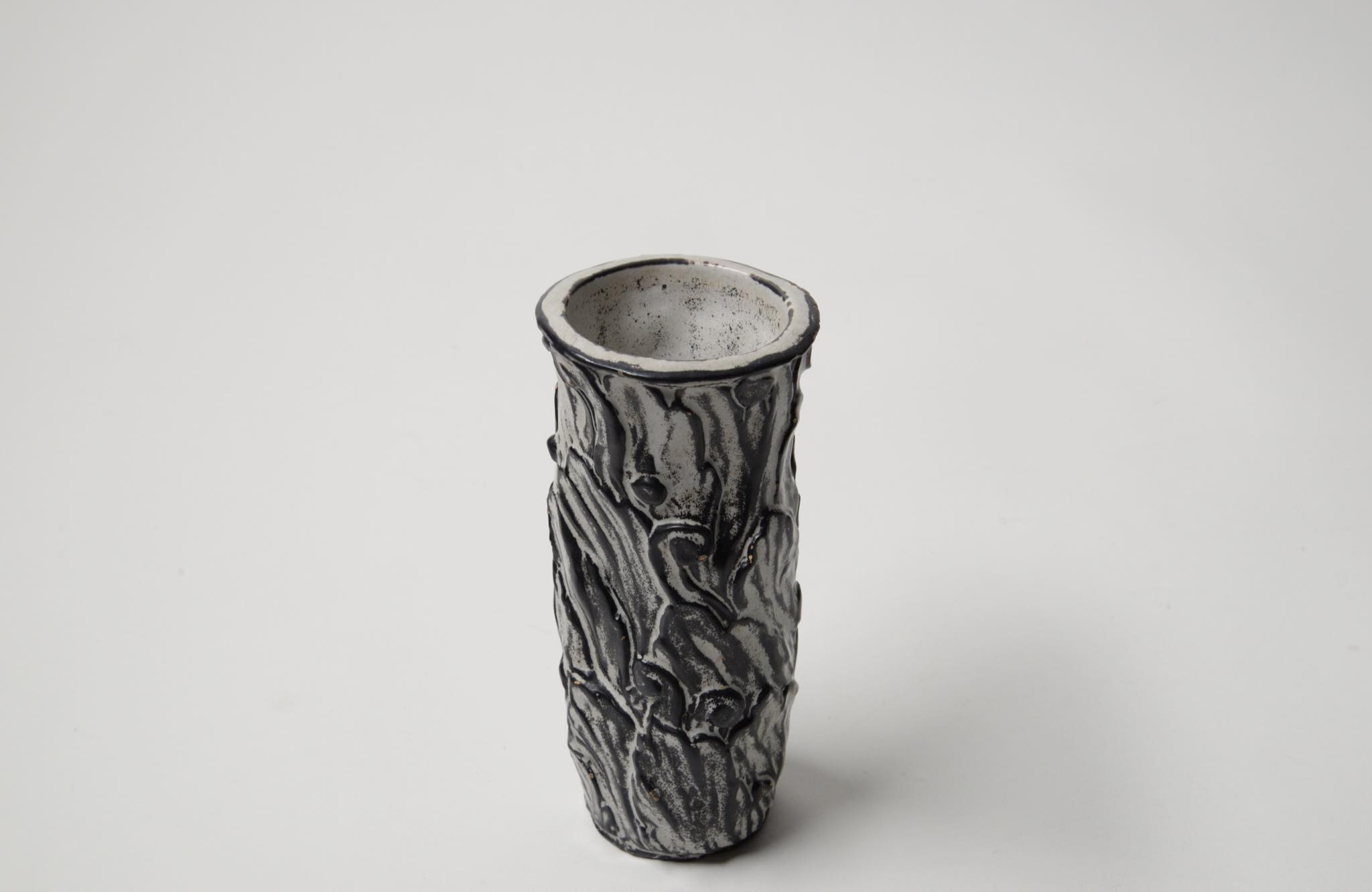 筒形の本体にレリーフ状の装飾が施された、Kähler keramik/ケーラー製陶所のベース作品です。黒色釉の上から灰色釉を施釉したもので、デンマークの陶芸家、Svend Hammershøi/スヴェン・ハマスホイによる1930年代のベース作品として求めましたが、1960年代に焼成されたニルス・ケーラーの可能性もあると思われます。チップが多数見られますが、クラックはありません。